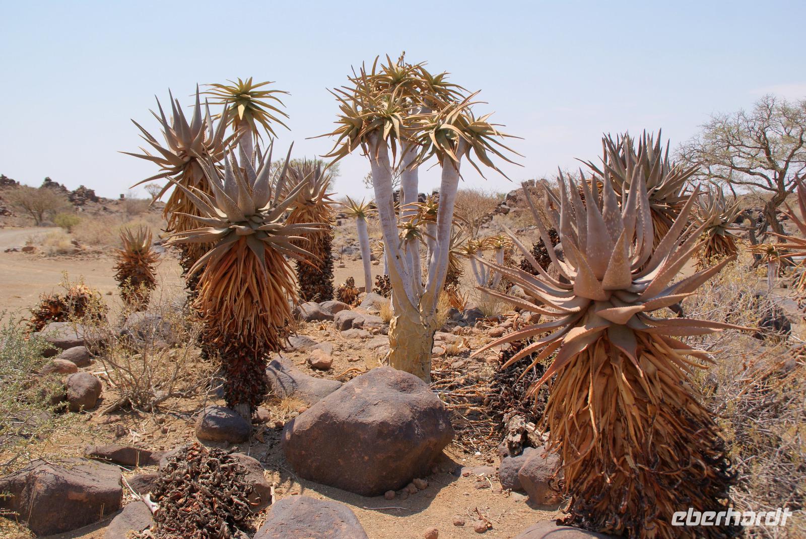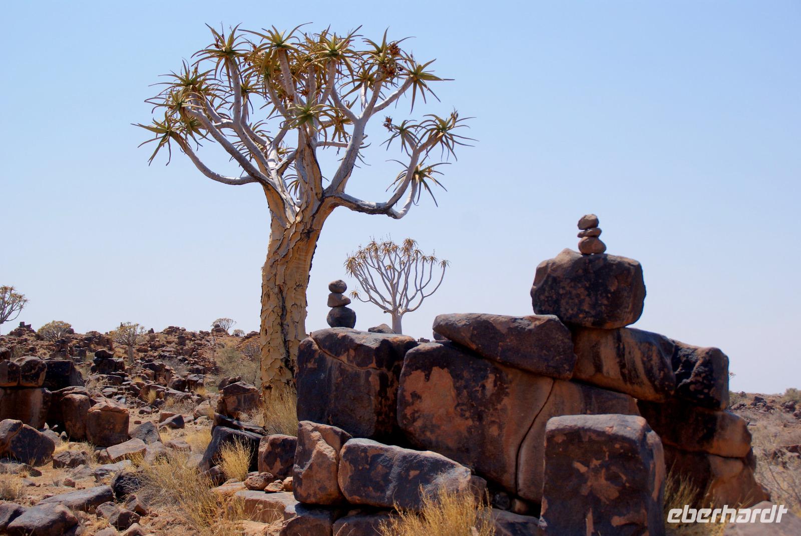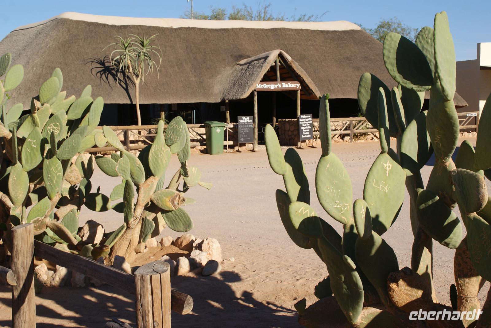 Wir erwachen durch ein „Weckklopfen" und mit einem herrlichen Sonnenaufgang in der Kalahari. Ein schönes Frühstücksbuffet mit Blick in die Natur lässt uns gut gestärkt den Tag beginnen. Unsere Reise führt uns heute von Mariental zu dem bekannten Köcherbaumwald (Quiver Tree Forest) und dem „Spielplatz der Riesen"(Giants playround). Auf dem Weg dorthin sehen wir einen stattlichen Sekretärvogel, den größten flugfähigen Vogel Afrikas, für den wir gerne für eine schöne Aufnahme anhalten. Auf der Weiterfahrt erfahren wir von Dagmar, dass im 16. Jahrhundert die Besiedlung durch die ersten Europäer erfolgte. Zuerst kamen die Portugiesen, dann die Hölländer und im Jahre 1840 die ersten Deutschen Missionare. Wir lernen die 11 verschiedenen Bevölkerungsgruppen kennen. Hierzu zählen die Himbas und Hereros im Norden, die Ovambos und Kavangos im Osten, die Caprivianer im Caprivistreifen, die San (Buschmänner) und Tswana im Osten, die Rehobotablasta und Namas im Süden bis hin zu den Damaras, Mischlingen und den Weißen.. Gegen Mittag erreichen wir den Köcherbaumwald, der sich auf dem Gelände des „Spielplatz der Riesen" befindet, wo wir in Ruhe fotografieren und ein Stück spazieren können. Der Köcherbaum ist der Nationalbaum Namibias, gehört zu den Spargelgewächsen und kann bis zu 400 Jahre alt werden. Während wir uns die Beine vertreten, wird unser heutiges Picknick vorbereitet. Genüsslich lassen wir es uns in dieser herrlichen Umgebung schmecken. Am Nachmittag erreichen wir Keetmanshoop und erfahren, dass der Ort nach Johann Keetmann benannt wurde, sich auf 1002 m Höhe befindet und 22.000 Einwohner hat. Wir besuchen die alte Steinkirche aus vergangenen Tagen, die 1895 erbaut wurde, spazieren durch den staubigen Ort und kehren gemütlich in einer Oase in der Stadt zu Bier, Rockshandy und Co. gemeinsam ein. Auch heute rundet ein leckeres Drei-Gang-Menü den Abend ab und ein erneut erlebnisreicher Tag geht dem Ende entgegen. Lala Salama!