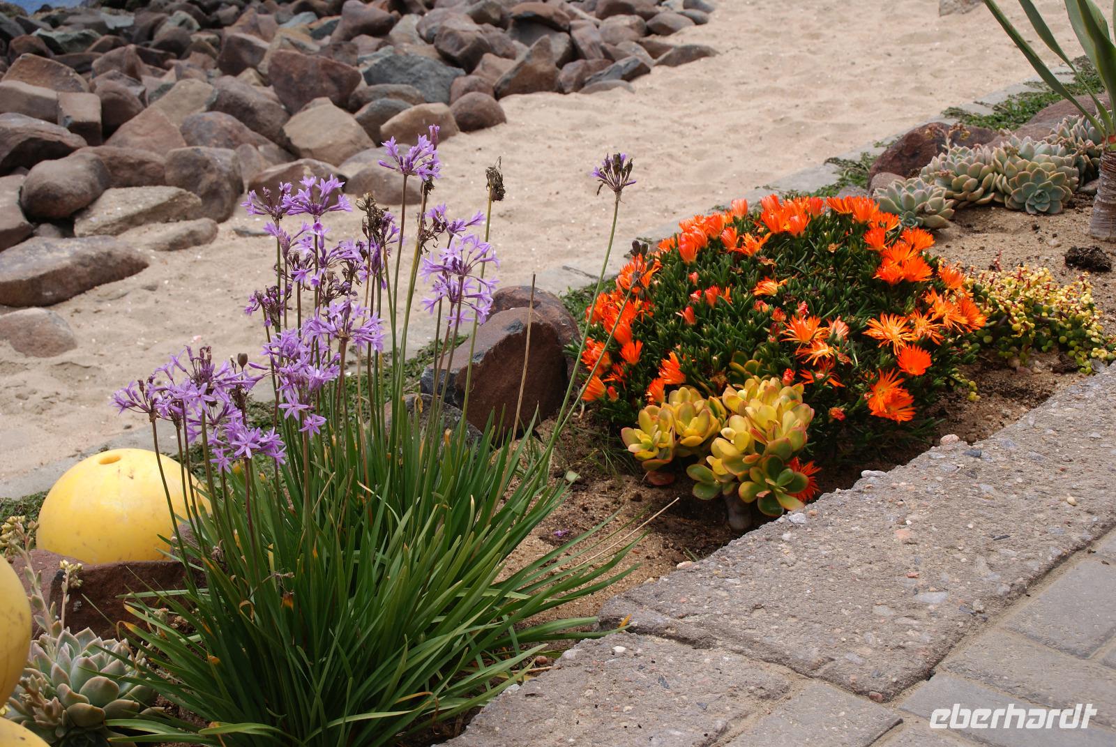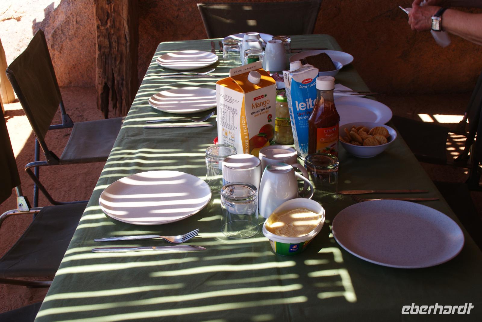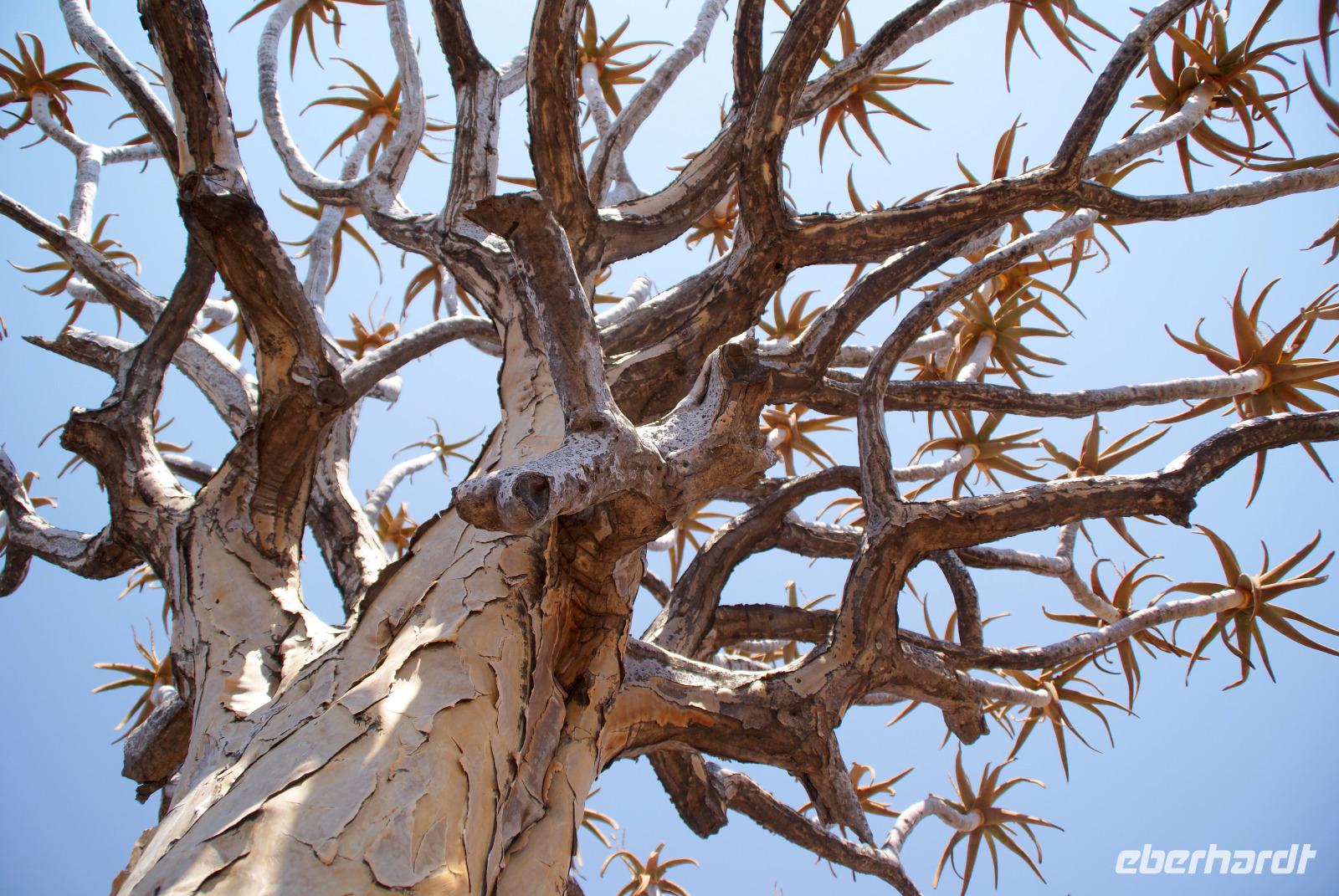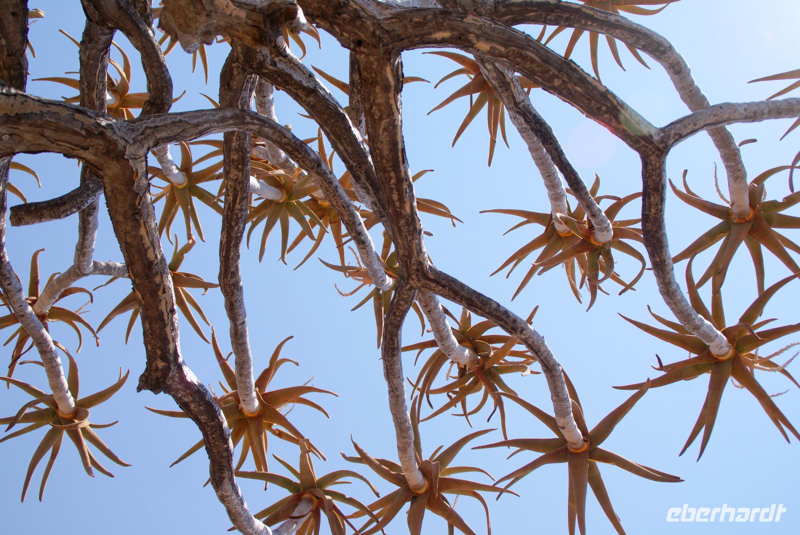 Wir erwachen durch ein „Weckklopfen" und mit einem herrlichen Sonnenaufgang in der Kalahari. Ein schönes Frühstücksbuffet mit Blick in die Natur lässt uns gut gestärkt den Tag beginnen. Unsere Reise führt uns heute von Mariental zu dem bekannten Köcherbaumwald (Quiver Tree Forest) und dem „Spielplatz der Riesen"(Giants playround). Auf dem Weg dorthin sehen wir einen stattlichen Sekretärvogel, den größten flugfähigen Vogel Afrikas, für den wir gerne für eine schöne Aufnahme anhalten. Auf der Weiterfahrt erfahren wir von Dagmar, dass im 16. Jahrhundert die Besiedlung durch die ersten Europäer erfolgte. Zuerst kamen die Portugiesen, dann die Hölländer und im Jahre 1840 die ersten Deutschen Missionare. Wir lernen die 11 verschiedenen Bevölkerungsgruppen kennen. Hierzu zählen die Himbas und Hereros im Norden, die Ovambos und Kavangos im Osten, die Caprivianer im Caprivistreifen, die San (Buschmänner) und Tswana im Osten, die Rehobotablasta und Namas im Süden bis hin zu den Damaras, Mischlingen und den Weißen.. Gegen Mittag erreichen wir den Köcherbaumwald, der sich auf dem Gelände des „Spielplatz der Riesen" befindet, wo wir in Ruhe fotografieren und ein Stück spazieren können. Der Köcherbaum ist der Nationalbaum Namibias, gehört zu den Spargelgewächsen und kann bis zu 400 Jahre alt werden. Während wir uns die Beine vertreten, wird unser heutiges Picknick vorbereitet. Genüsslich lassen wir es uns in dieser herrlichen Umgebung schmecken. Am Nachmittag erreichen wir Keetmanshoop und erfahren, dass der Ort nach Johann Keetmann benannt wurde, sich auf 1002 m Höhe befindet und 22.000 Einwohner hat. Wir besuchen die alte Steinkirche aus vergangenen Tagen, die 1895 erbaut wurde, spazieren durch den staubigen Ort und kehren gemütlich in einer Oase in der Stadt zu Bier, Rockshandy und Co. gemeinsam ein. Auch heute rundet ein leckeres Drei-Gang-Menü den Abend ab und ein erneut erlebnisreicher Tag geht dem Ende entgegen. Lala Salama!