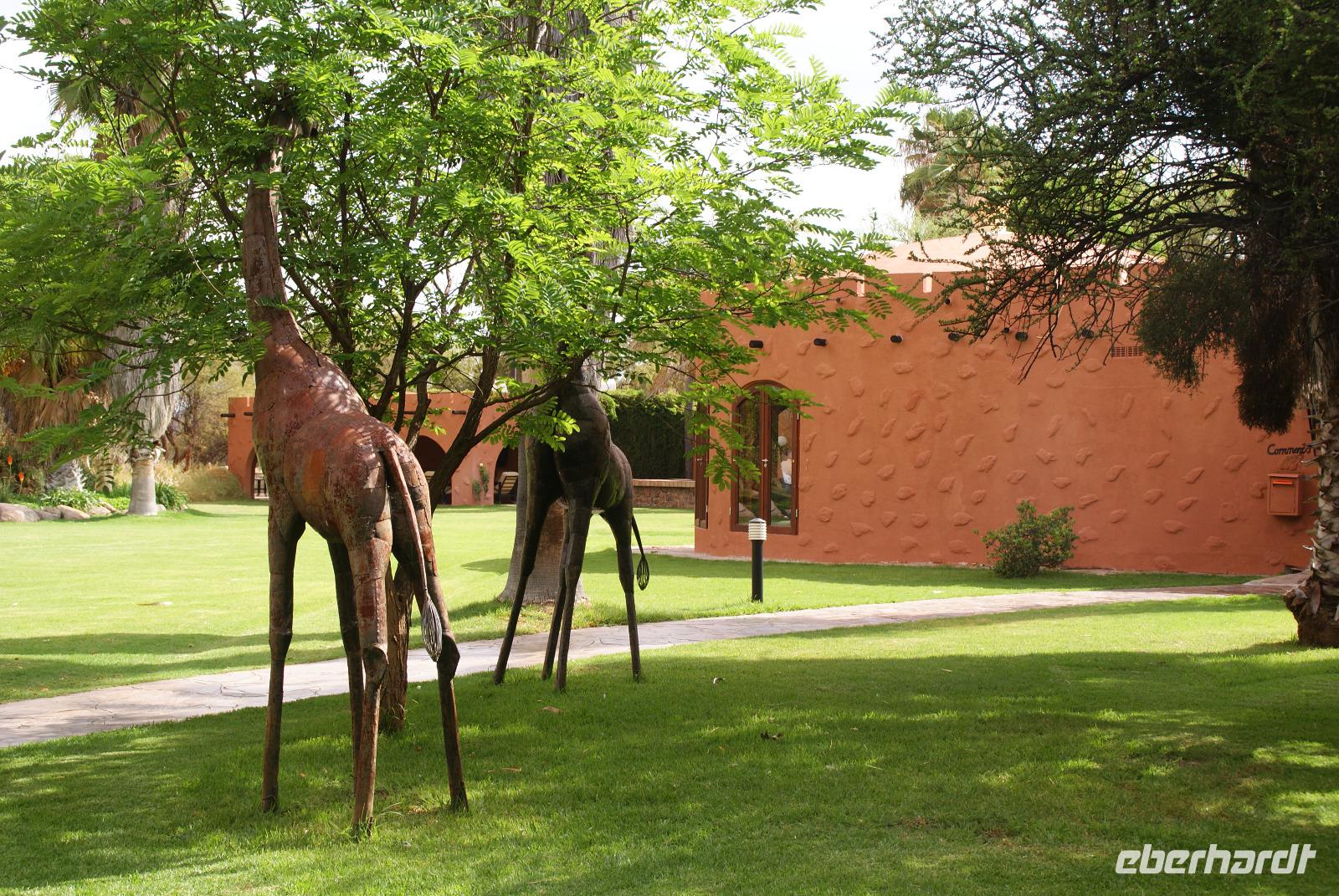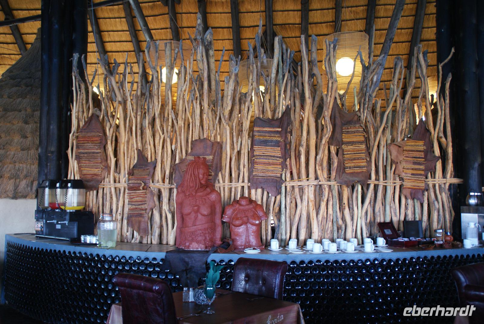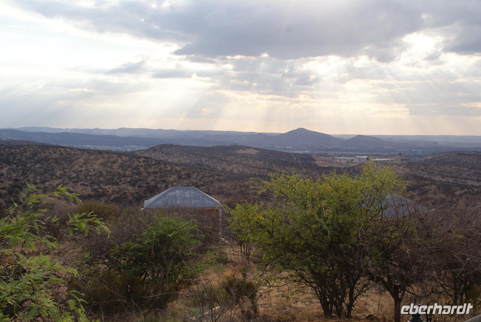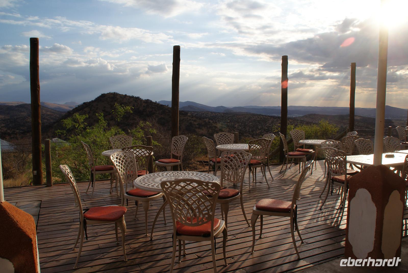 Wie würde Jonas sagen? Wir haben geschlafen „WIE EIN DACHS", trotz anhaltendem Gewitter und Regen, genossen wir die Kühle der Nacht. Nach einem gemütlichen Frühstück zur christlichen Zeit verlassen wir die besondere Mount Etjo Lodge und machen uns auf den Weg nach Okahandja. Der Name steht für „große sandige Fläche", befindet sich auf 1400m Höhe und wurde im Jahr 1872 von der Rheinische Mission gegründet. Wir statten dieser mit den deutschen Gräbern und denen der Hereros einen Besuch ab. Direkt daneben steht die Friedenskirche der deutsch-evangelisch-lutheranischen Gemeinde. Bald darauf halten wir am Holzschnitzermarkt und feilschen kräftig mit den verkaufstüchtigen Händlern um Giraffen, Hippos, Big Five und Co. Nach so viel Einsatz gönnen wir uns erst mal einen Stopp im Café gegenüber und genießen einen sehr schmackhaften Kaffee. Zurück in Windhoek fahren wir zum Aussichtspunkt des Stadtteils Eros (in dem auch unser zu Reisebeginn besuchtes Hotel Thule liegt) und stoßen hier bei prickelndem Sekt und Saft auf die tolle, erlebnisreiche Reise an und freuen uns, dass alles so gut geklappt hat. Ein letzter Check-in in der River Crossing Lodge und wir genießen die atemberaubende Aussicht auf das hügelige Umland und beenden die Namibia Rundreise mit einem leckeren Abendessen, welches uns heute in Menüform serviert wird.