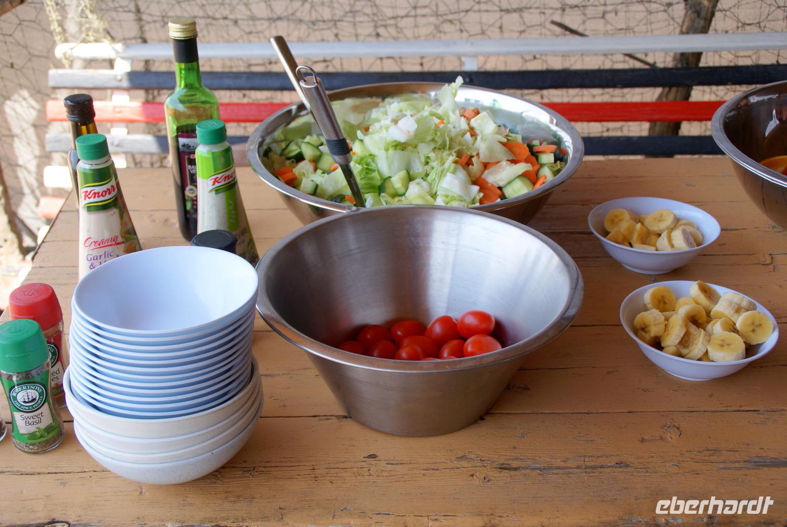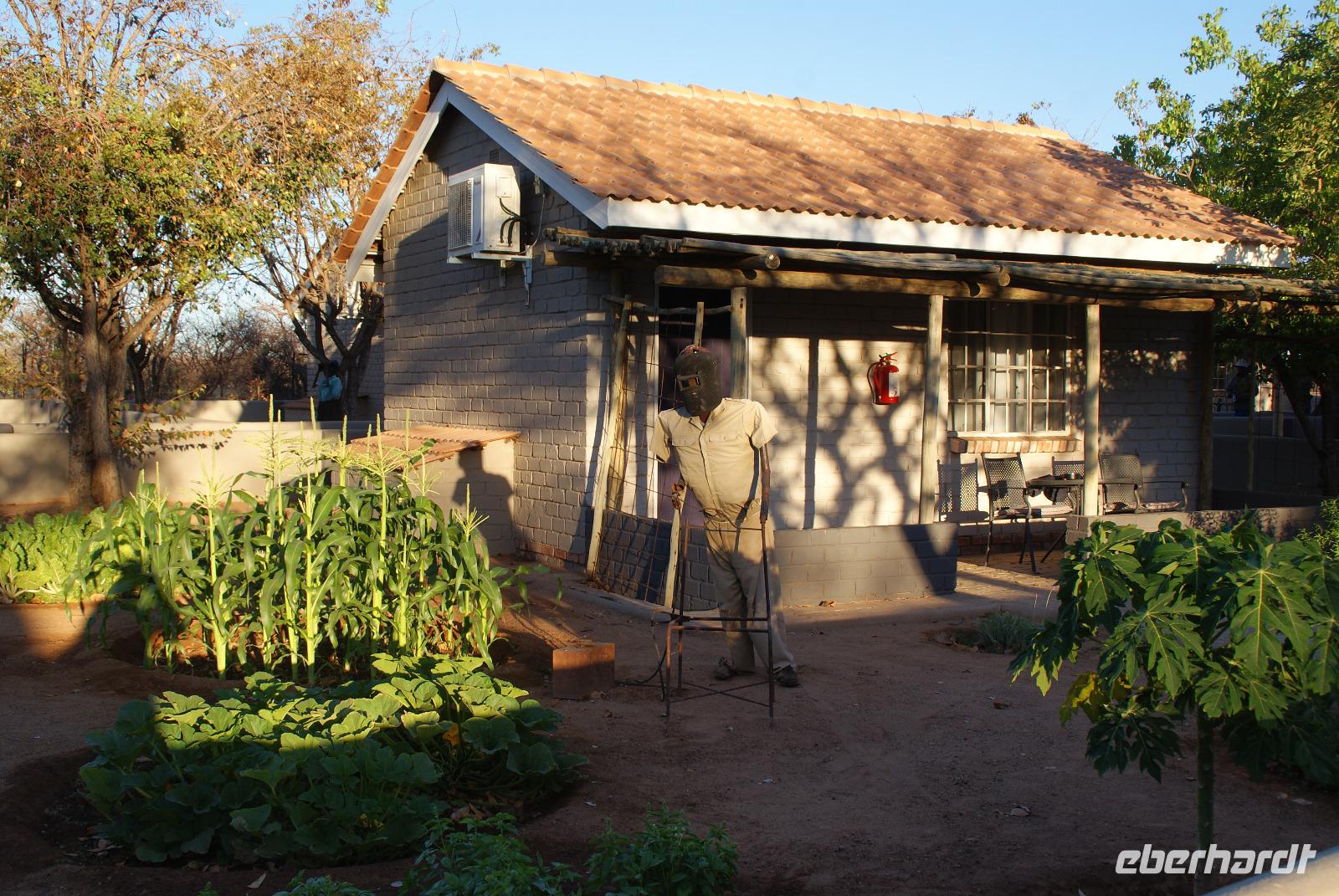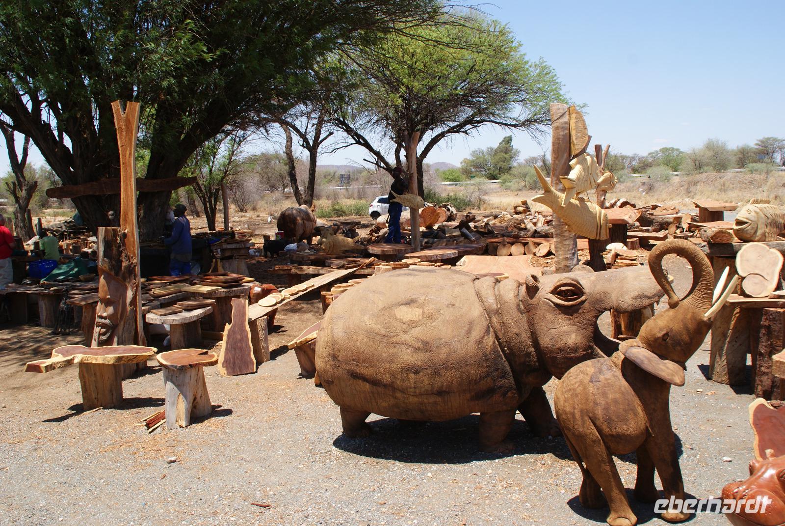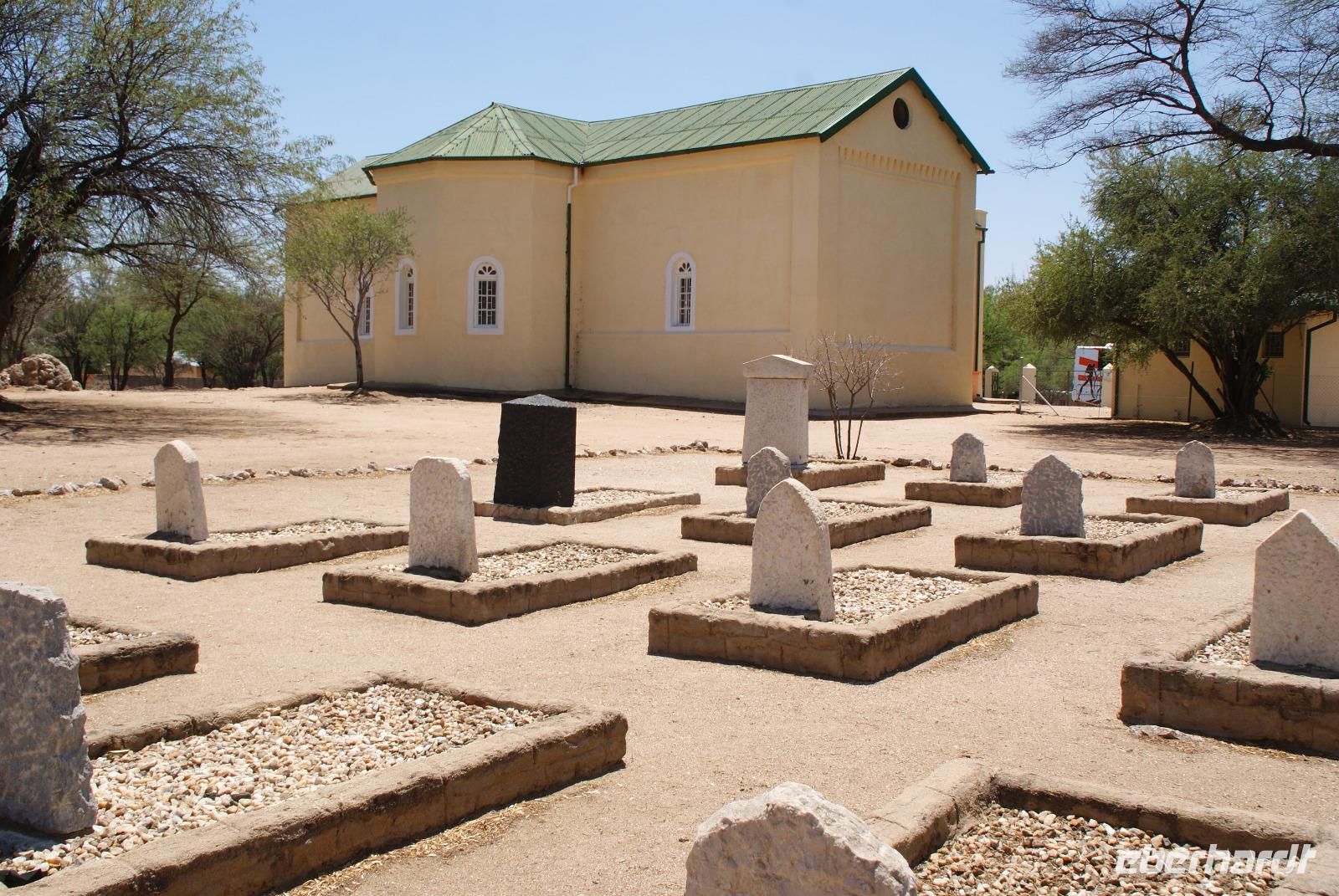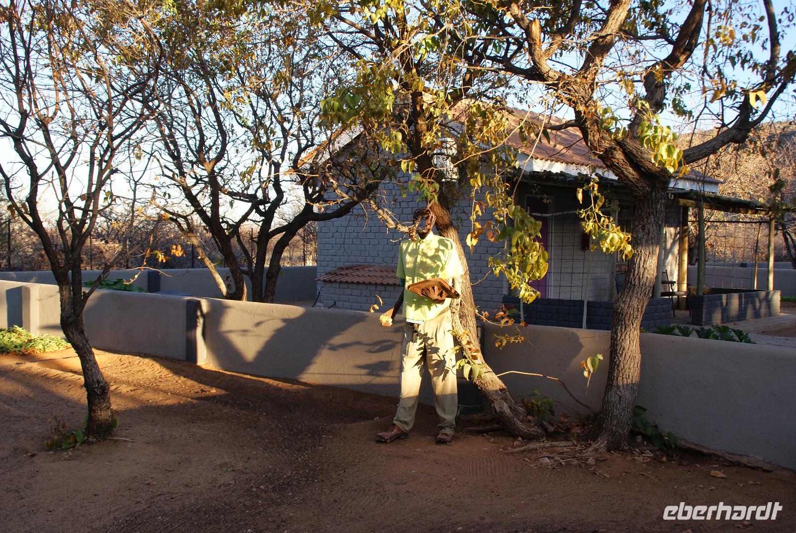 Wie würde Jonas sagen? Wir haben geschlafen „WIE EIN DACHS", trotz anhaltendem Gewitter und Regen, genossen wir die Kühle der Nacht. Nach einem gemütlichen Frühstück zur christlichen Zeit verlassen wir die besondere Mount Etjo Lodge und machen uns auf den Weg nach Okahandja. Der Name steht für „große sandige Fläche", befindet sich auf 1400m Höhe und wurde im Jahr 1872 von der Rheinische Mission gegründet. Wir statten dieser mit den deutschen Gräbern und denen der Hereros einen Besuch ab. Direkt daneben steht die Friedenskirche der deutsch-evangelisch-lutheranischen Gemeinde. Bald darauf halten wir am Holzschnitzermarkt und feilschen kräftig mit den verkaufstüchtigen Händlern um Giraffen, Hippos, Big Five und Co. Nach so viel Einsatz gönnen wir uns erst mal einen Stopp im Café gegenüber und genießen einen sehr schmackhaften Kaffee. Zurück in Windhoek fahren wir zum Aussichtspunkt des Stadtteils Eros (in dem auch unser zu Reisebeginn besuchtes Hotel Thule liegt) und stoßen hier bei prickelndem Sekt und Saft auf die tolle, erlebnisreiche Reise an und freuen uns, dass alles so gut geklappt hat. Ein letzter Check-in in der River Crossing Lodge und wir genießen die atemberaubende Aussicht auf das hügelige Umland und beenden die Namibia Rundreise mit einem leckeren Abendessen, welches uns heute in Menüform serviert wird.