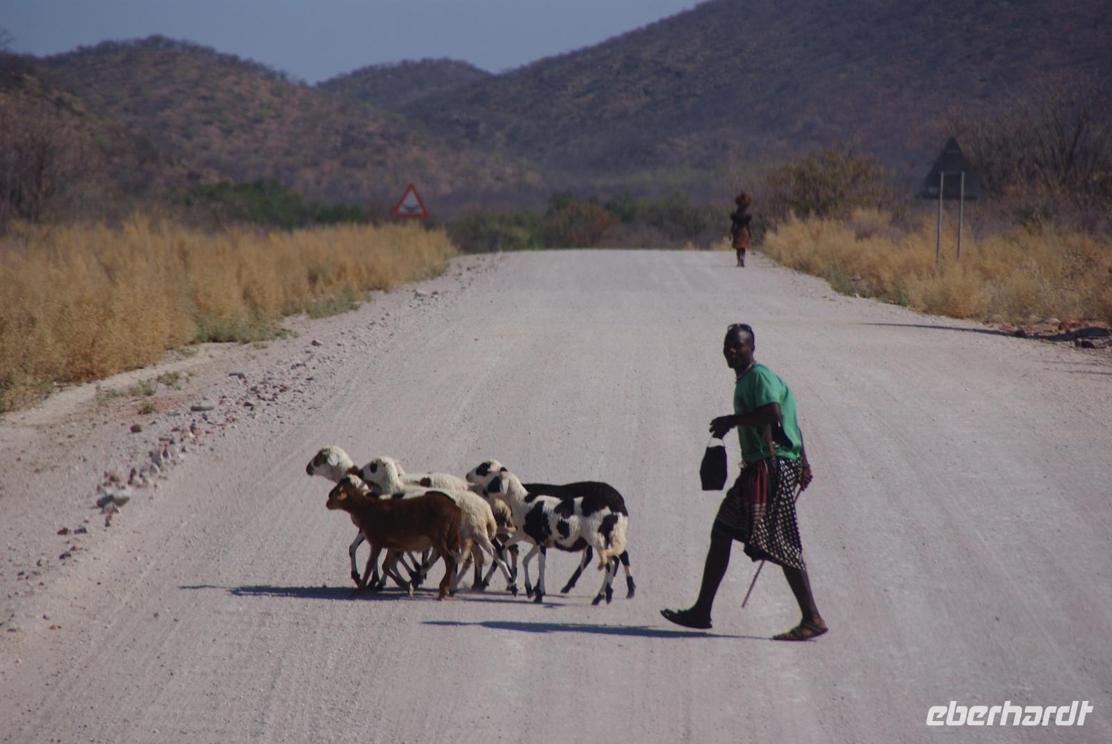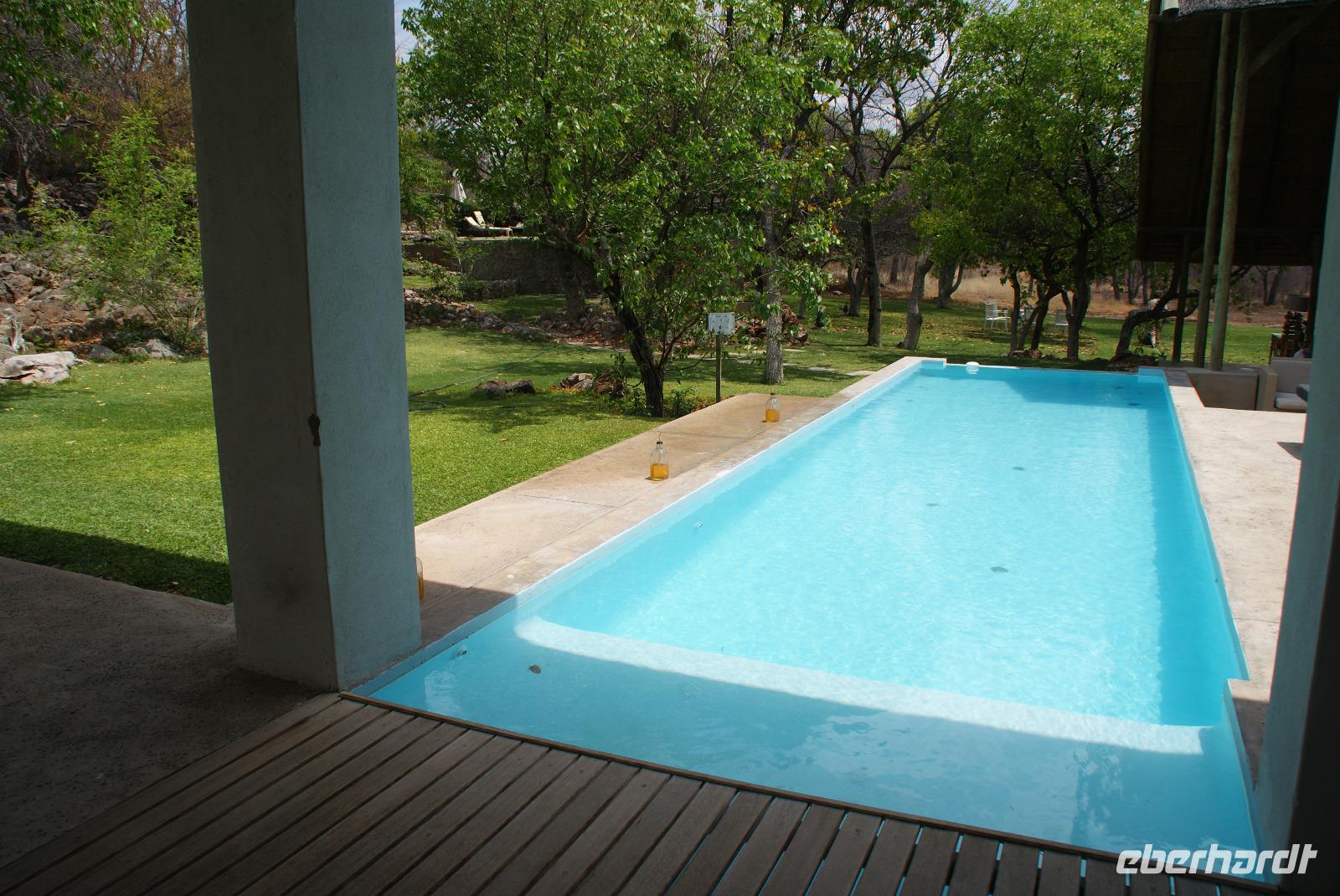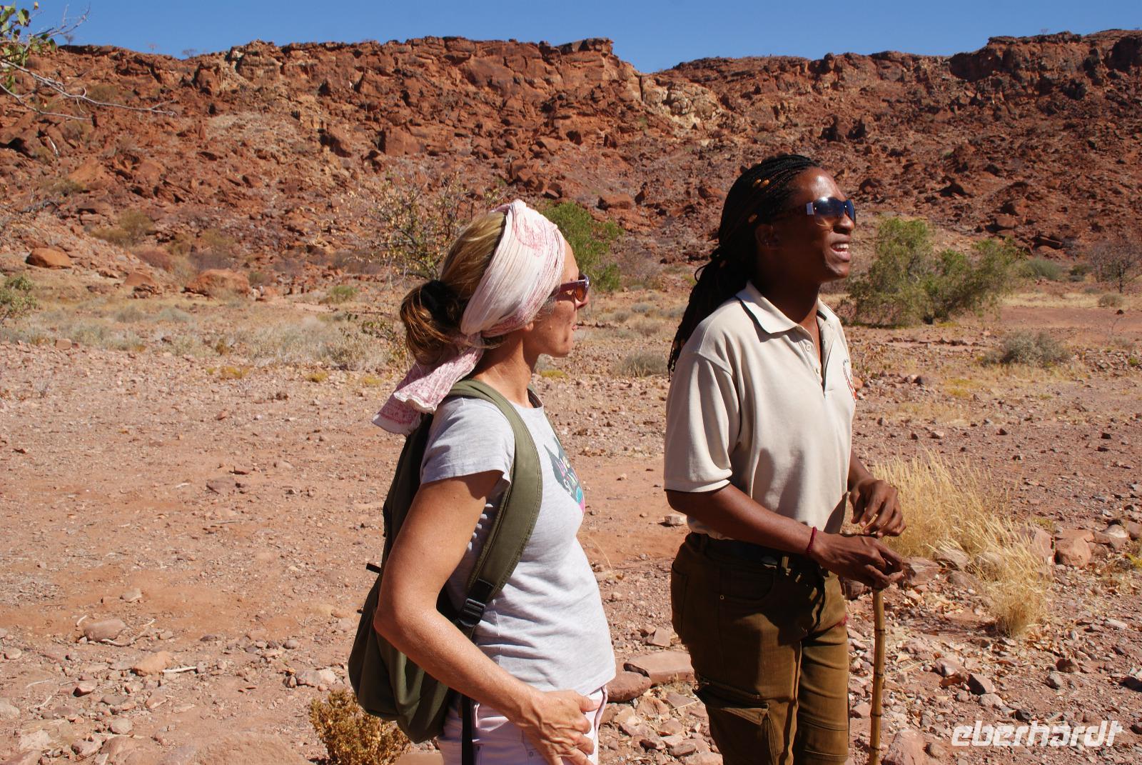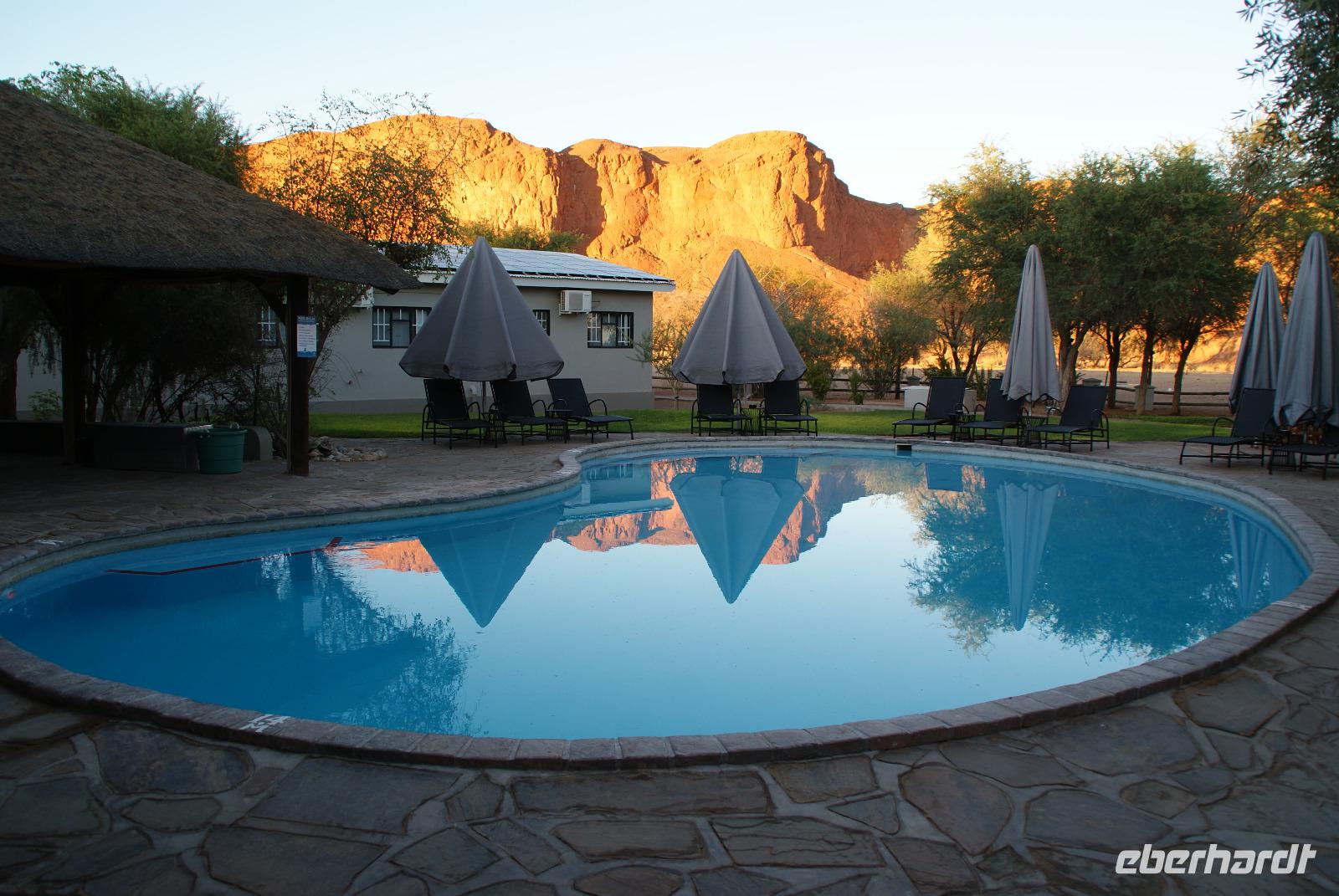 Nach einer erholsamen Nacht in unseren schönen Häuschen mit eigenem Garten frühstücken wir bei milden Temperaturen im Außenbereich der Lodge. Frisch gebackenes Brot und ein reichhaltiges Buffet erwarten uns bereits. So gut versorgt verlassen wir die wunderschöne Lodge und machen uns auf die Fahrt durch das Kaokoland um unser heutiges Tagesziel Opuwo und die Opuwo Country Lodge zu erreichen. Da wir morgen ein Himbadorf besuchen werden, möchten wir ein nützliches Gastgeschenk organisieren und kaufen aus unseren gesammelten Geldern Maismehl, Zucker, Salz, Öl, Kaffee und ein paar Süßigkeiten für die Kinder ein. Der Weg nach Opuwo führt uns über endlos lange Asphaltstraßen, deren einziges Hindernis gelegentlich auf der Straße stehende Ziegen, Schafe, Esel und Rinder bieten. Jonas überzeugt diese mit kräftigem Hupen und Geduld, so dass alle unbeschadet von dannen ziehen können. Am frühen Nachmittag erreichen wir Opuwo und bei der Durchfahrt staunen wir über die vielen verschiedenen Menschen, die hier zusammen leben. So sehen wir stolze Herero Damen in Ihrer speziellen Tracht mit den sieben Unterröcken und Hörnerkopfschmuck. Daneben die ebenso stolzen Himbadamen, eher spärlich bekleidet mit rotem Farbschutz auf den unbedeckten Stellen. Gleichzeitig sehen wir junge Männer, sehr modern und westlich gekleidet, alle gemeinsam in einer Stadt, die Tradition und Moderne vereint. Angekommen in unserer Opuwo Country Lodge wohnen wir hingegen wie in einer Oase mit grünem Rasen und blauem Pool, von dem aus wir schwimmend in die weite Hügellandschaft des Kaokolands schauen können. Welch Gegensatz sich hier uns bietet. Abends erwartet uns ein schmackhaftes 3-Gang Menü und in wie stets geselliger Runde genießen wir auch diesen Tagesabschluss in vollen Zügen.