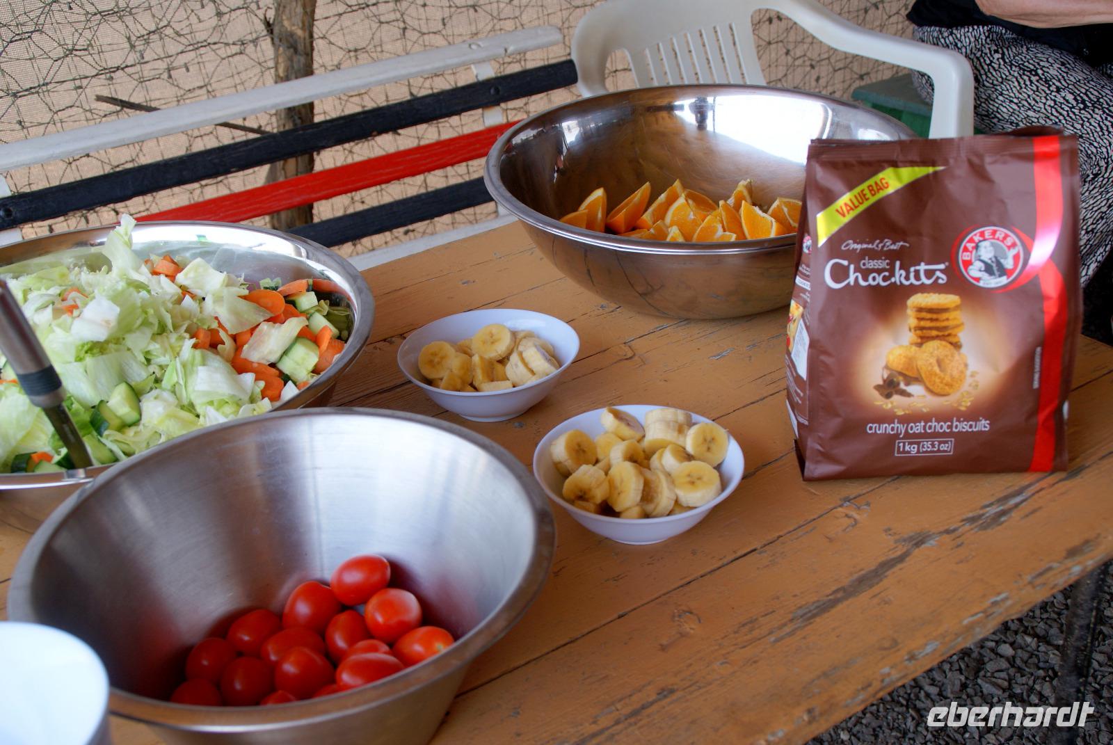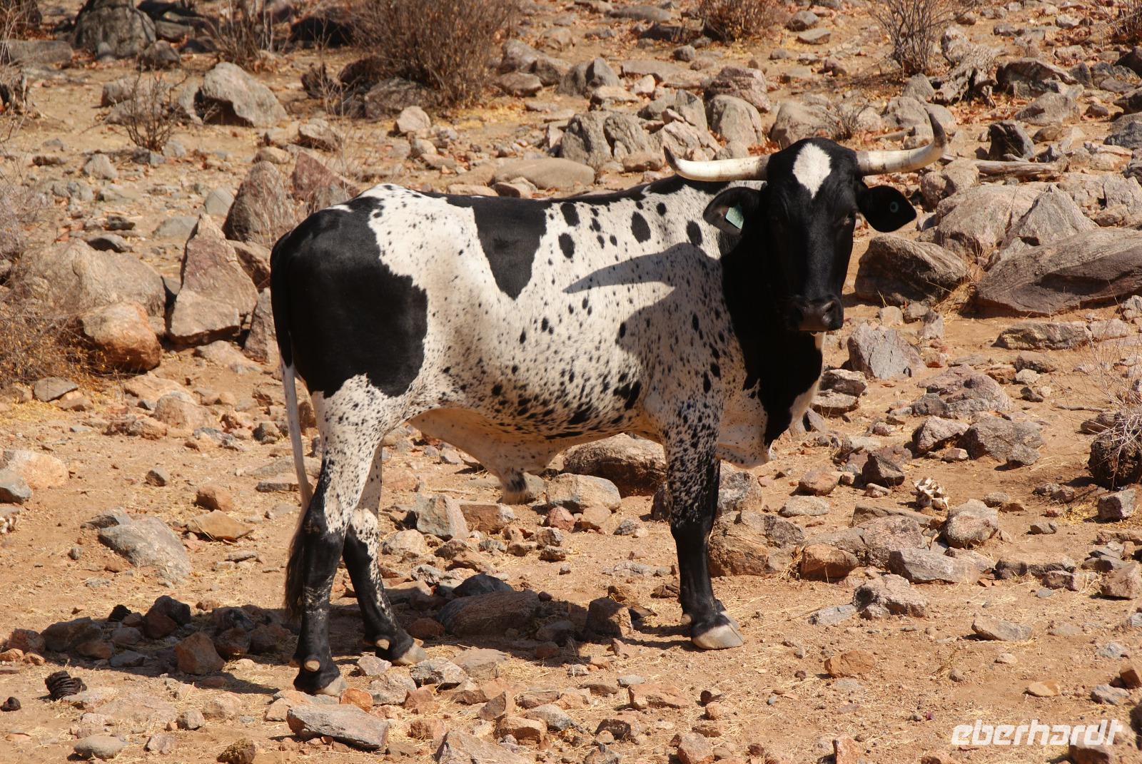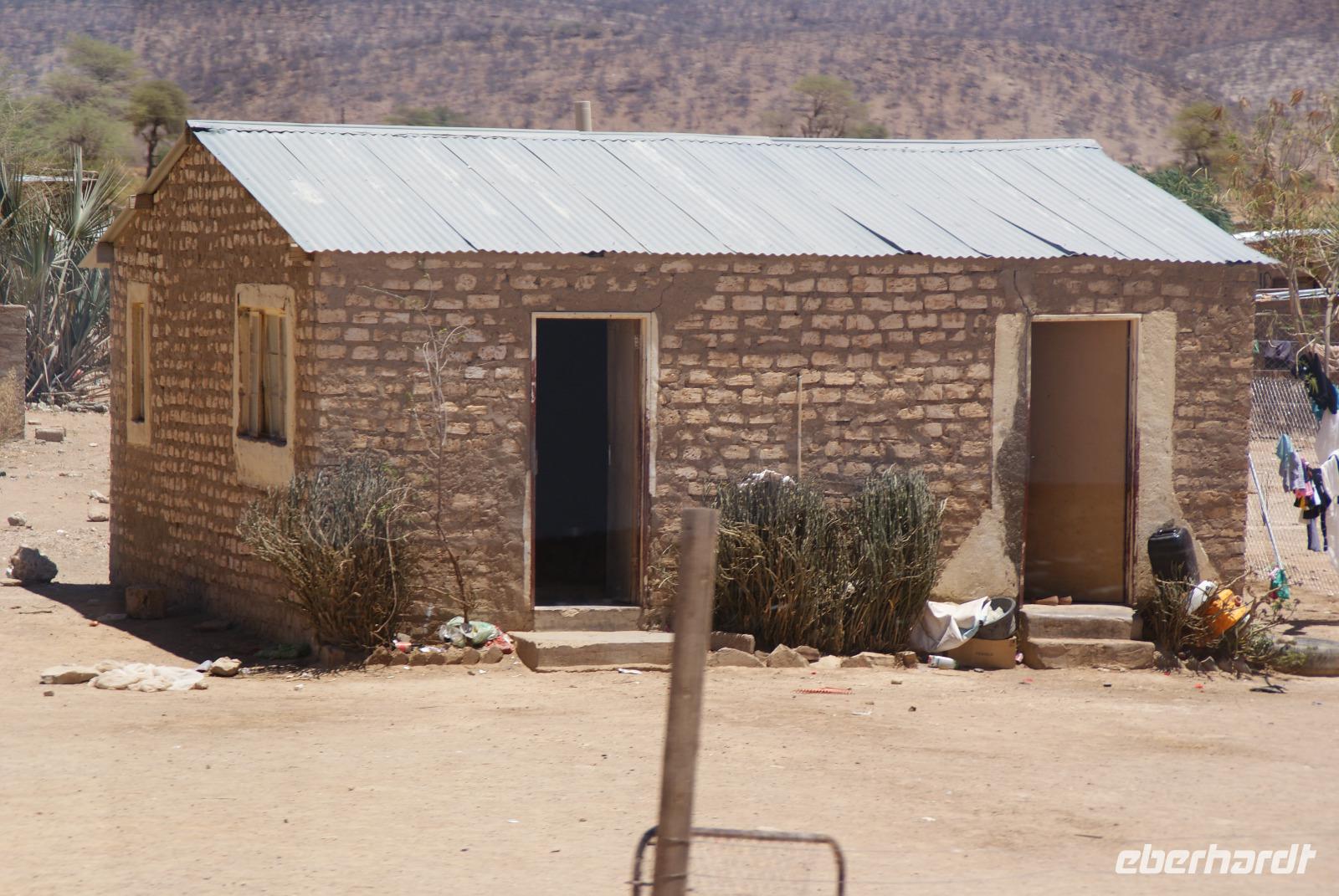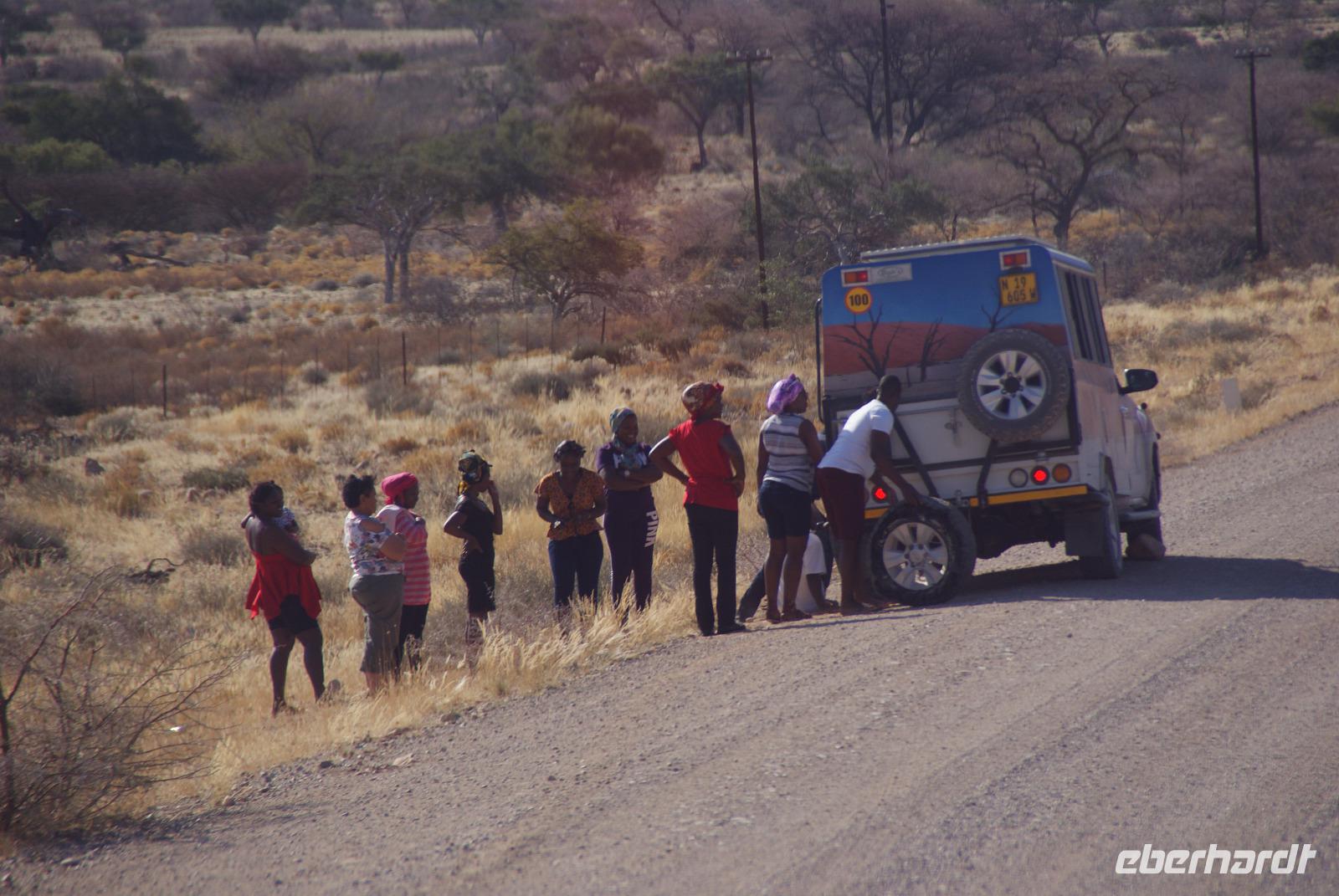 Nach einer erholsamen Nacht in unseren schönen Häuschen mit eigenem Garten frühstücken wir bei milden Temperaturen im Außenbereich der Lodge. Frisch gebackenes Brot und ein reichhaltiges Buffet erwarten uns bereits. So gut versorgt verlassen wir die wunderschöne Lodge und machen uns auf die Fahrt durch das Kaokoland um unser heutiges Tagesziel Opuwo und die Opuwo Country Lodge zu erreichen. Da wir morgen ein Himbadorf besuchen werden, möchten wir ein nützliches Gastgeschenk organisieren und kaufen aus unseren gesammelten Geldern Maismehl, Zucker, Salz, Öl, Kaffee und ein paar Süßigkeiten für die Kinder ein. Der Weg nach Opuwo führt uns über endlos lange Asphaltstraßen, deren einziges Hindernis gelegentlich auf der Straße stehende Ziegen, Schafe, Esel und Rinder bieten. Jonas überzeugt diese mit kräftigem Hupen und Geduld, so dass alle unbeschadet von dannen ziehen können. Am frühen Nachmittag erreichen wir Opuwo und bei der Durchfahrt staunen wir über die vielen verschiedenen Menschen, die hier zusammen leben. So sehen wir stolze Herero Damen in Ihrer speziellen Tracht mit den sieben Unterröcken und Hörnerkopfschmuck. Daneben die ebenso stolzen Himbadamen, eher spärlich bekleidet mit rotem Farbschutz auf den unbedeckten Stellen. Gleichzeitig sehen wir junge Männer, sehr modern und westlich gekleidet, alle gemeinsam in einer Stadt, die Tradition und Moderne vereint. Angekommen in unserer Opuwo Country Lodge wohnen wir hingegen wie in einer Oase mit grünem Rasen und blauem Pool, von dem aus wir schwimmend in die weite Hügellandschaft des Kaokolands schauen können. Welch Gegensatz sich hier uns bietet. Abends erwartet uns ein schmackhaftes 3-Gang Menü und in wie stets geselliger Runde genießen wir auch diesen Tagesabschluss in vollen Zügen.