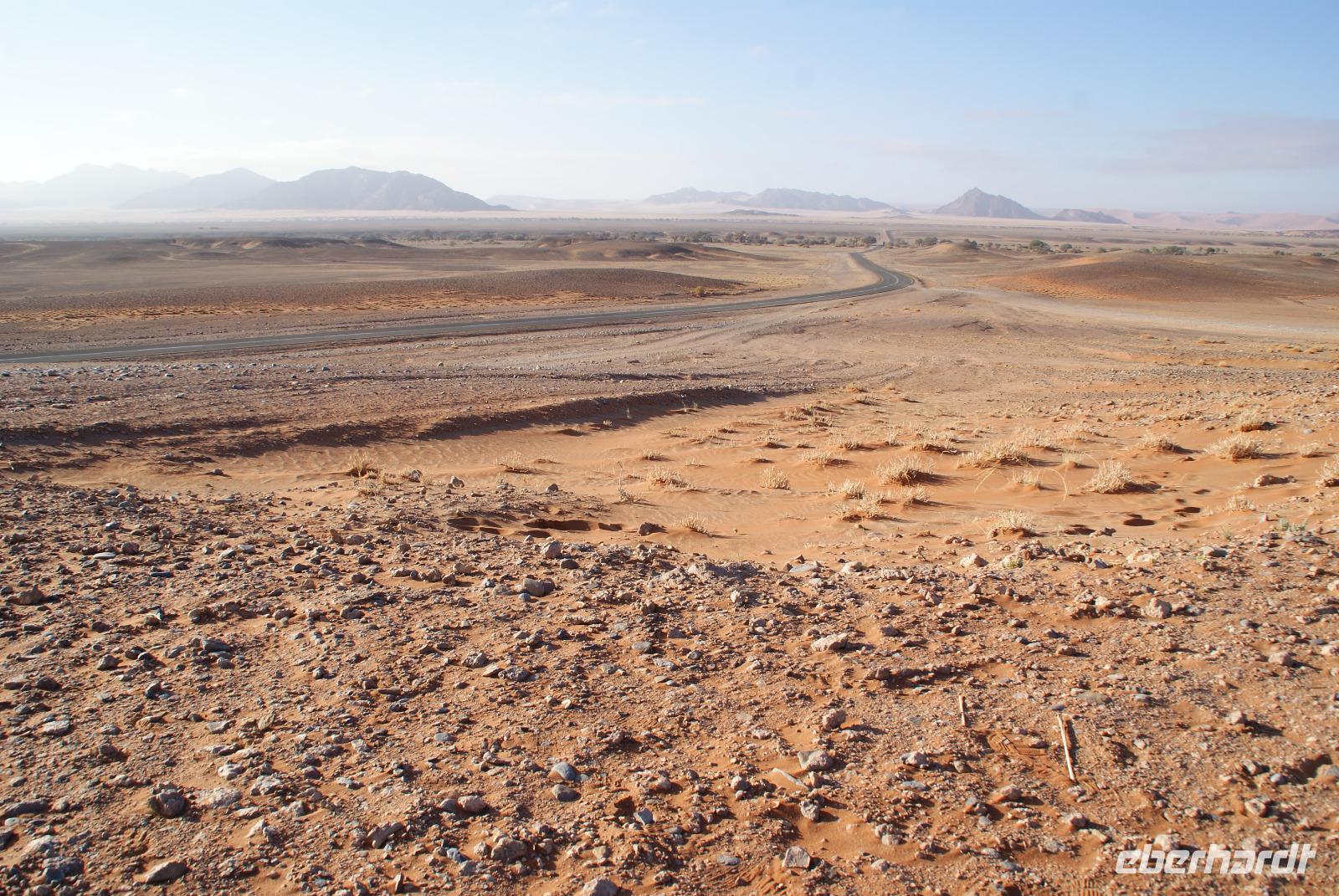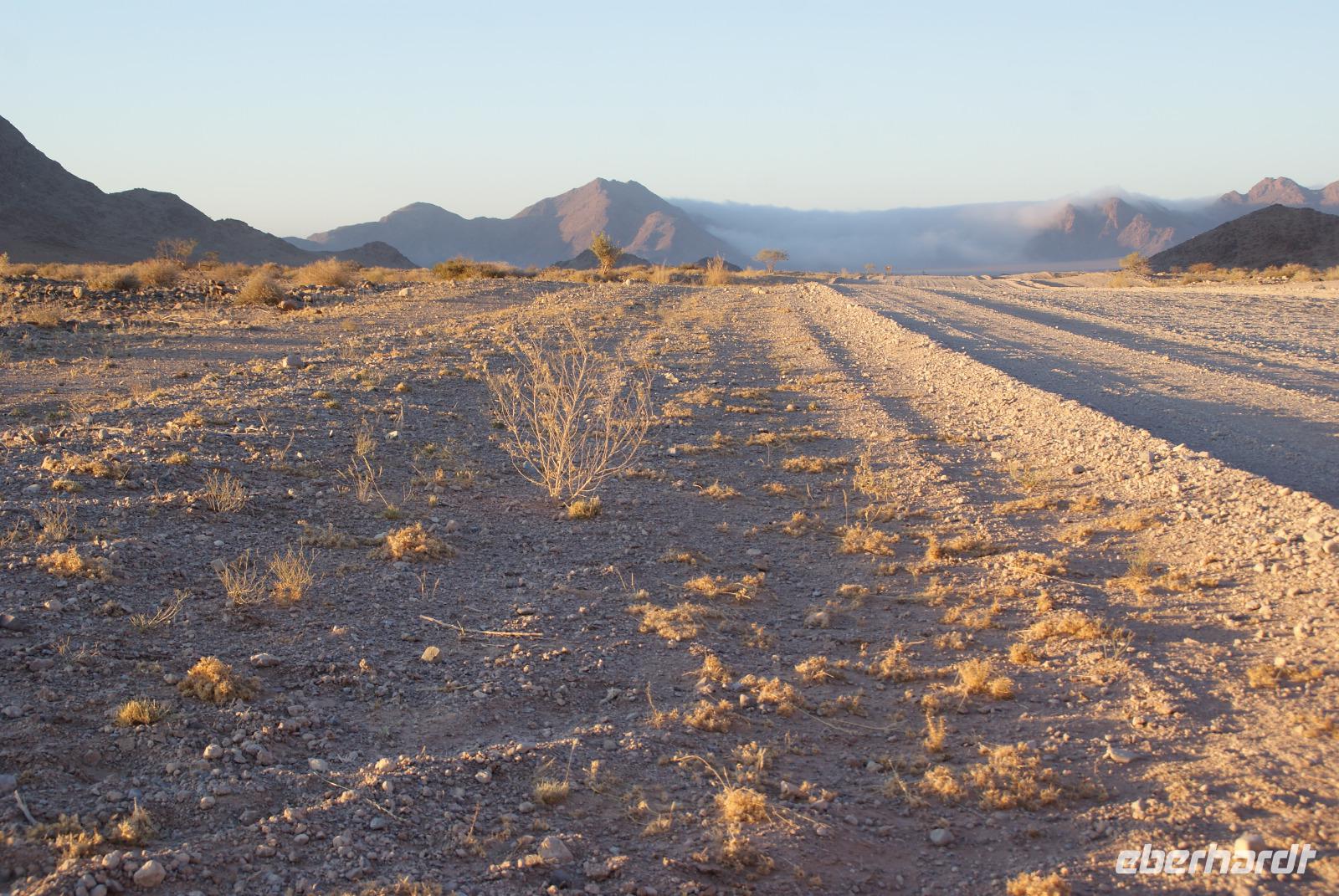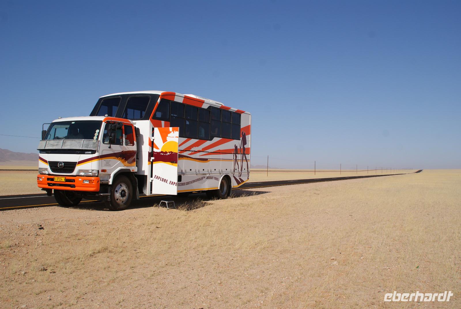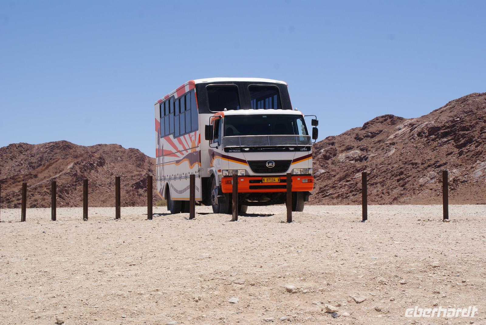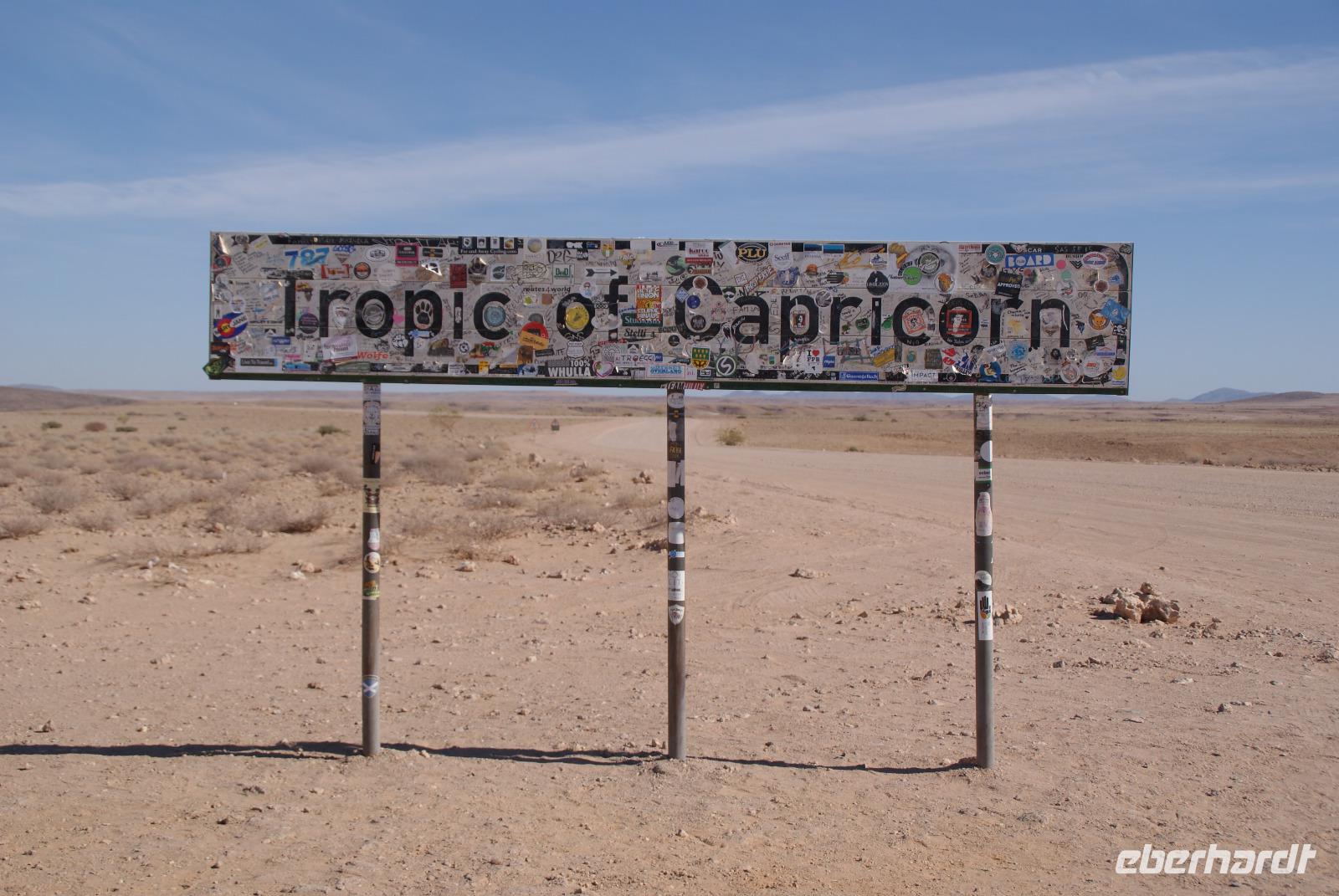 Nochmals heißt es sehr früh aufstehen, ausgiebig frühstücken am einladenden Buffet der Namib Desert Lodge und wir verlassen die wunderschöne Region. Ein kurzer Tankstopp erfolgt in Solitaire, wo unser Truck den nötigen Diesel bekommt und wir einen kräftigen Kaffee und vor allem den über die Grenzen hinaus bekannten Apfelkuchen, der noch dampfend aus dem Ofen auf uns wartet. So erwerben wir das ein oder andere Stück und nehmen es mit für die Weiterfahrt Richtung Küste. Ein Fotostopp erfolgt am Südlichen Wendekreis des Steinbocks/