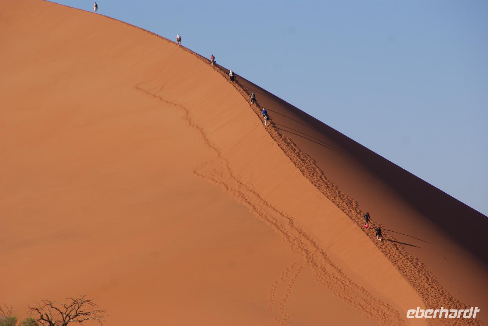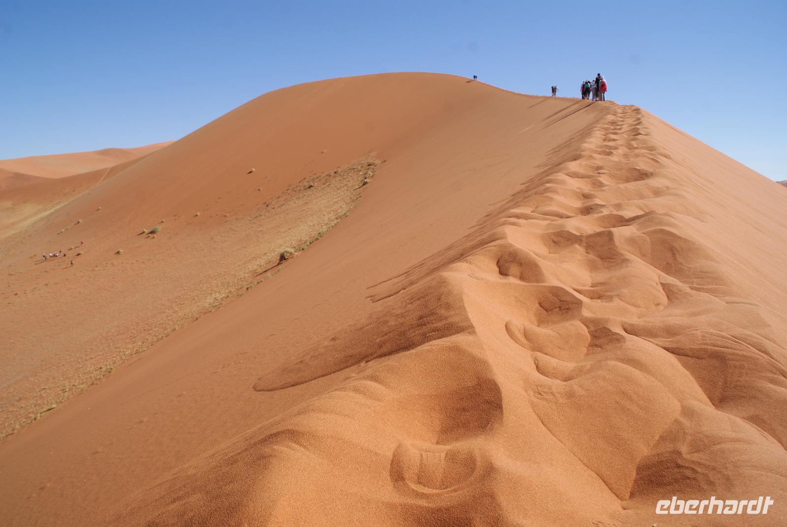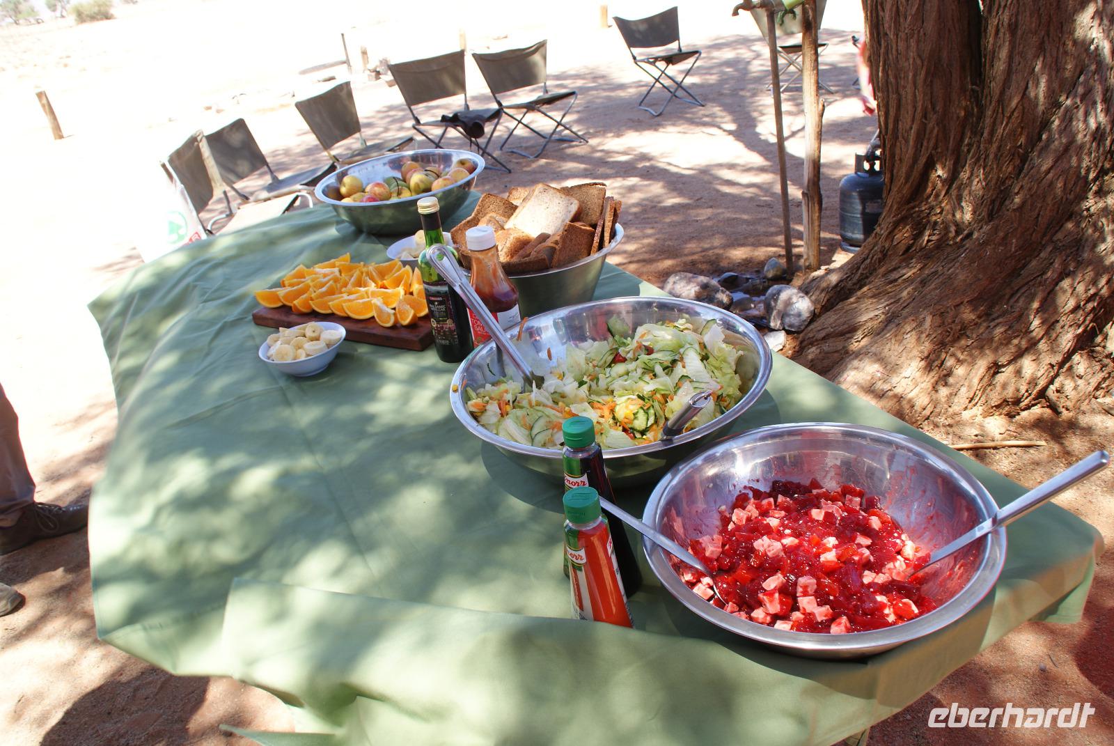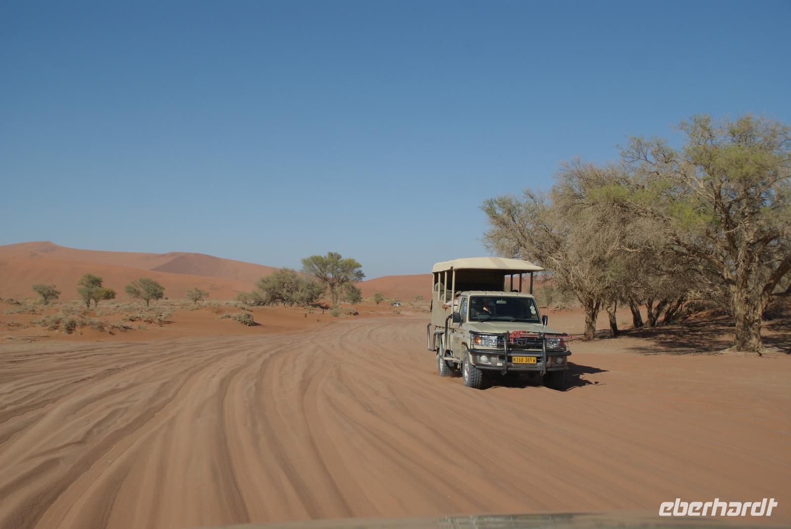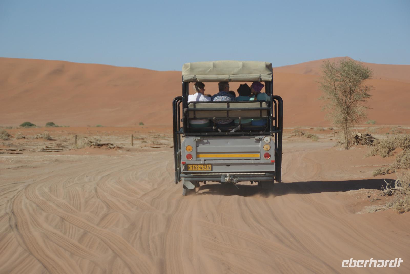 Heute Morgen werden wir lange vor den Hühnern geweckt, denn wir wollen früh abfahren, um das tolle morgendliche Licht und Schattenspektakel der roten Sanddünen zu erleben. Auf der Fahrt ins Sossusvlei sind wir bereits begeistert von dem Naturschauspiel, welches sich uns bietet. Wir halten diverse Male an und machen endlose Aufnahmen von der Natur, den Sanddünen, wir sind zur richtigen Zeit am richtigen Ort. An der bekannten Düne 45 halten wir natürlich auch, entscheiden uns jedoch stattdessen die Big Mama zu erwandern. Wir hören, dass die durchschnittlichen Dünen 200-300m hoch sind und die höchste Düne 480m hoch ist. Um ins Sossusvlei zu gelangen, steigen wir in 4x4 Fahrzeuge um, da das letzte Stück sehr sandig und uneben ist und wir mit unserem Truck keine Chance hätten. Eine schöne Dünenwanderung erfolgt und die Gruppe erreicht vollzählig den Gipfel der Düne und alle sind begeistert von der uns umgebenden Landschaft. Wie auf dem Mond „hopsen" wir anschließend die Düne hinunter und landen wohlbehalten wieder im Sossusvlei, der Tonpfanne, welches der Name Vlei bedeutet. Hier verirrt sich nur noch sehr selten Wasser und so liegt die Tonpfanne ausgetrocknet vor uns. Den gleichen Weg zurück per 4x4 nehmen wir zu unserem Truck und fahren im Anschluss zum bekannten Sesriem Canyon, den wir hinunterwandern und staunend hören, dass dieser vor 7 Jahren zum letzten Mal Wasser führte. Hier begegnen uns ebenfalls einige Tok Tokkies (Käferart), die laut Dagmar auch „knusprige Wasserflasche" genannt werden. Wir erfahren des Weiteren, dass es außer den „Big Five" in Namibia (eigentlich nur noch Big Four, denn der Büffel wurde aufgrund Wassermangels ausquartiert) auch die „Small Five der Wüstentiere" gibt, dazu zählt der Gecko, die Eidechse, die Spinne, die ein Rad schlägt, das Chamäleon und die Sandviper. Unser Mittagshighlight bildet ein schönes Picknick unter einer schattenspendenden Kameldornakazie und wir genießen unser Mittagessen mit frischem Salat, Biltong, Käse und Co. Gut gestärkt geht es zurück zur Lodge, wo am Nachmittag noch eine drei-stündige Panoramafahrt im offenen Jeep auf uns wartet. Auf zwei Jeeps verteilt ziehen wir wieder los und erfreuen uns an der atemberaubenden Kulisse, die uns hier auf 12.500 Hektar umgibt. Natürlich darf ein Gläschen zum Sonnenuntergang nicht fehlen und wir verabschieden einen wunderbaren, erlebnisreichen Tag. Zum Abendessen finden wir uns im Restaurant ein und das schmackhafte Buffet lässt nicht lange auf sich warten.