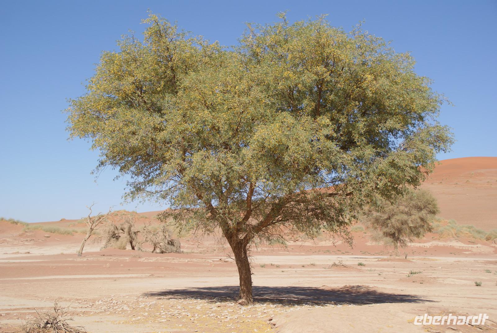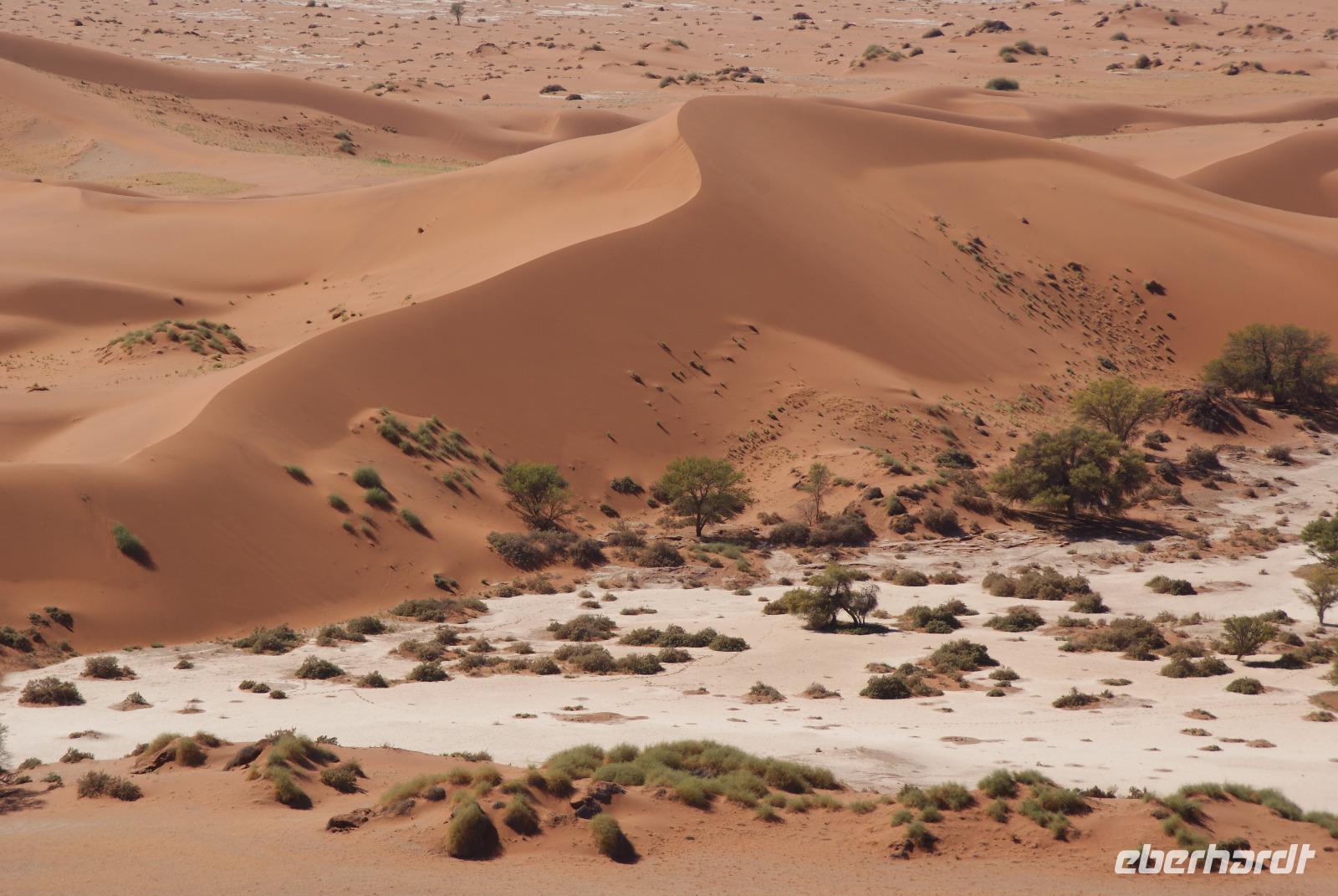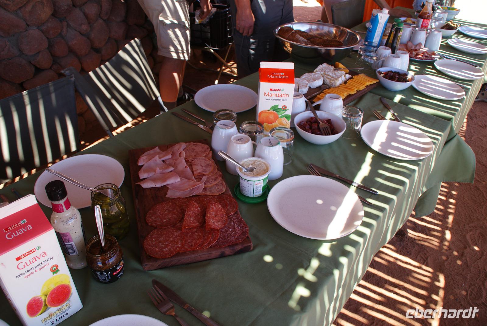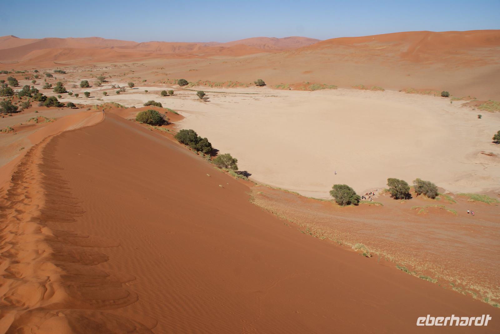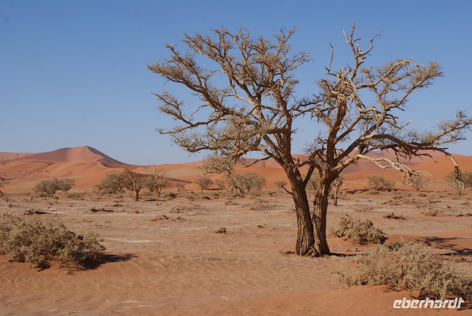 Heute Morgen werden wir lange vor den Hühnern geweckt, denn wir wollen früh abfahren, um das tolle morgendliche Licht und Schattenspektakel der roten Sanddünen zu erleben. Auf der Fahrt ins Sossusvlei sind wir bereits begeistert von dem Naturschauspiel, welches sich uns bietet. Wir halten diverse Male an und machen endlose Aufnahmen von der Natur, den Sanddünen, wir sind zur richtigen Zeit am richtigen Ort. An der bekannten Düne 45 halten wir natürlich auch, entscheiden uns jedoch stattdessen die Big Mama zu erwandern. Wir hören, dass die durchschnittlichen Dünen 200-300m hoch sind und die höchste Düne 480m hoch ist. Um ins Sossusvlei zu gelangen, steigen wir in 4x4 Fahrzeuge um, da das letzte Stück sehr sandig und uneben ist und wir mit unserem Truck keine Chance hätten. Eine schöne Dünenwanderung erfolgt und die Gruppe erreicht vollzählig den Gipfel der Düne und alle sind begeistert von der uns umgebenden Landschaft. Wie auf dem Mond „hopsen" wir anschließend die Düne hinunter und landen wohlbehalten wieder im Sossusvlei, der Tonpfanne, welches der Name Vlei bedeutet. Hier verirrt sich nur noch sehr selten Wasser und so liegt die Tonpfanne ausgetrocknet vor uns. Den gleichen Weg zurück per 4x4 nehmen wir zu unserem Truck und fahren im Anschluss zum bekannten Sesriem Canyon, den wir hinunterwandern und staunend hören, dass dieser vor 7 Jahren zum letzten Mal Wasser führte. Hier begegnen uns ebenfalls einige Tok Tokkies (Käferart), die laut Dagmar auch „knusprige Wasserflasche" genannt werden. Wir erfahren des Weiteren, dass es außer den „Big Five" in Namibia (eigentlich nur noch Big Four, denn der Büffel wurde aufgrund Wassermangels ausquartiert) auch die „Small Five der Wüstentiere" gibt, dazu zählt der Gecko, die Eidechse, die Spinne, die ein Rad schlägt, das Chamäleon und die Sandviper. Unser Mittagshighlight bildet ein schönes Picknick unter einer schattenspendenden Kameldornakazie und wir genießen unser Mittagessen mit frischem Salat, Biltong, Käse und Co. Gut gestärkt geht es zurück zur Lodge, wo am Nachmittag noch eine drei-stündige Panoramafahrt im offenen Jeep auf uns wartet. Auf zwei Jeeps verteilt ziehen wir wieder los und erfreuen uns an der atemberaubenden Kulisse, die uns hier auf 12.500 Hektar umgibt. Natürlich darf ein Gläschen zum Sonnenuntergang nicht fehlen und wir verabschieden einen wunderbaren, erlebnisreichen Tag. Zum Abendessen finden wir uns im Restaurant ein und das schmackhafte Buffet lässt nicht lange auf sich warten.