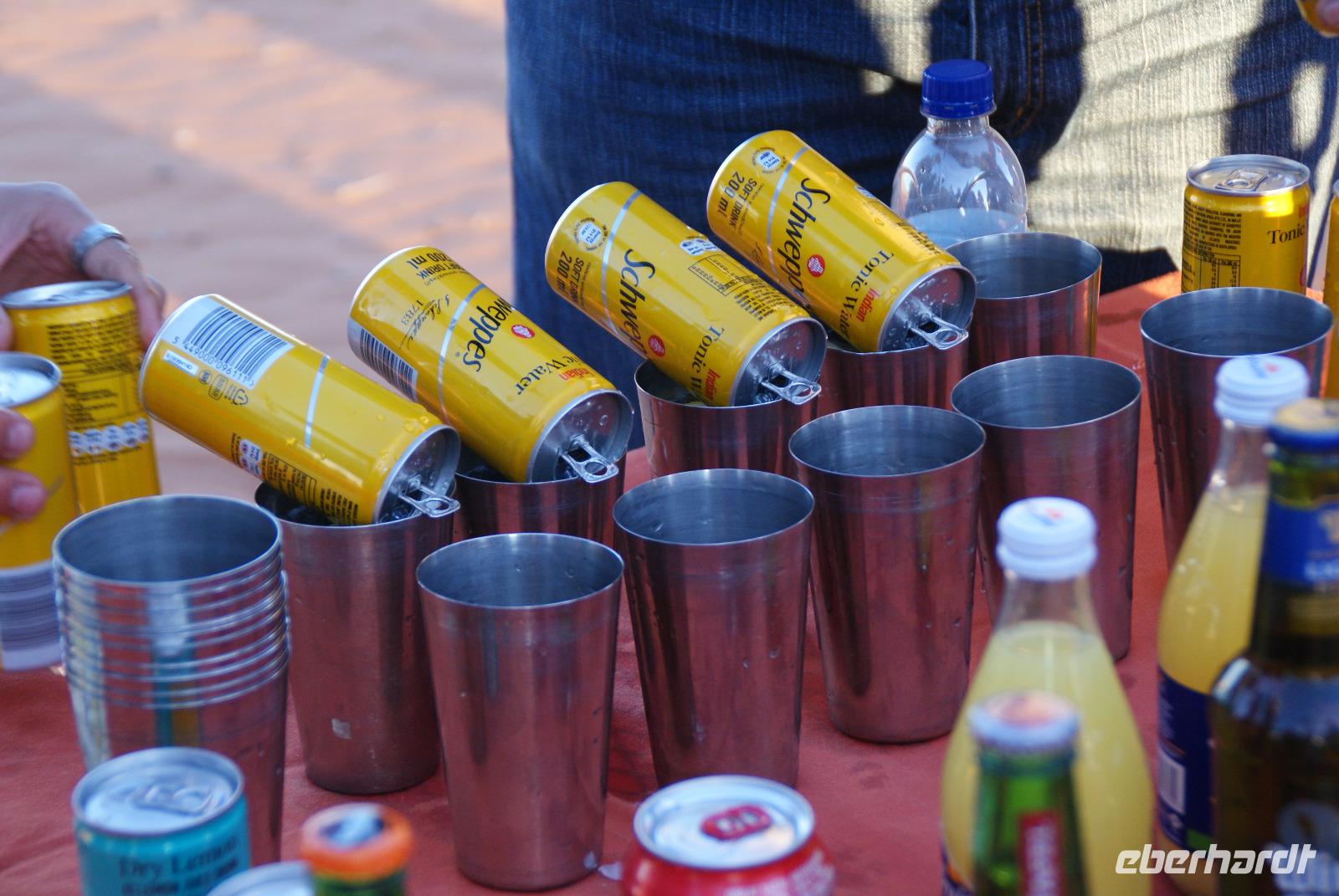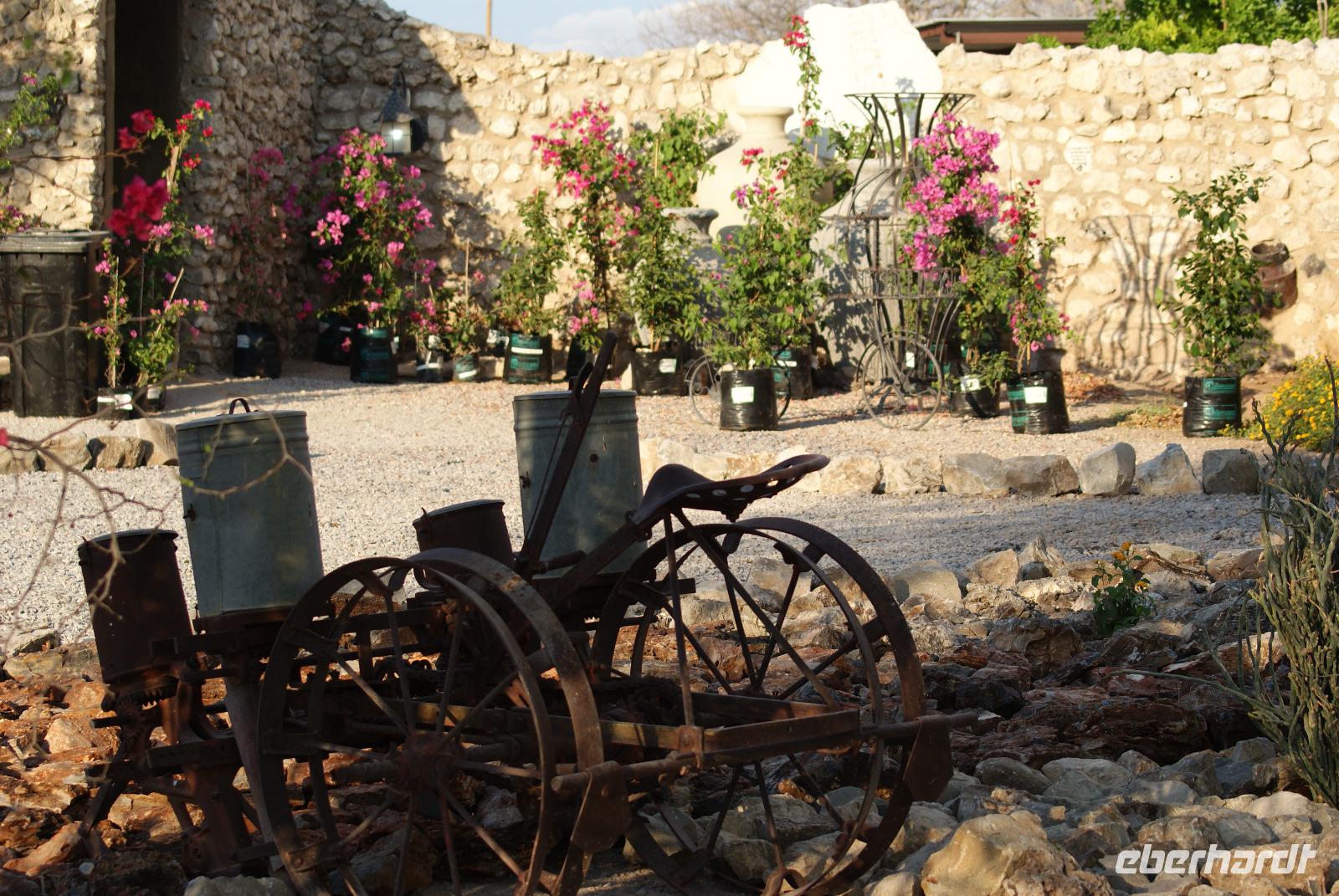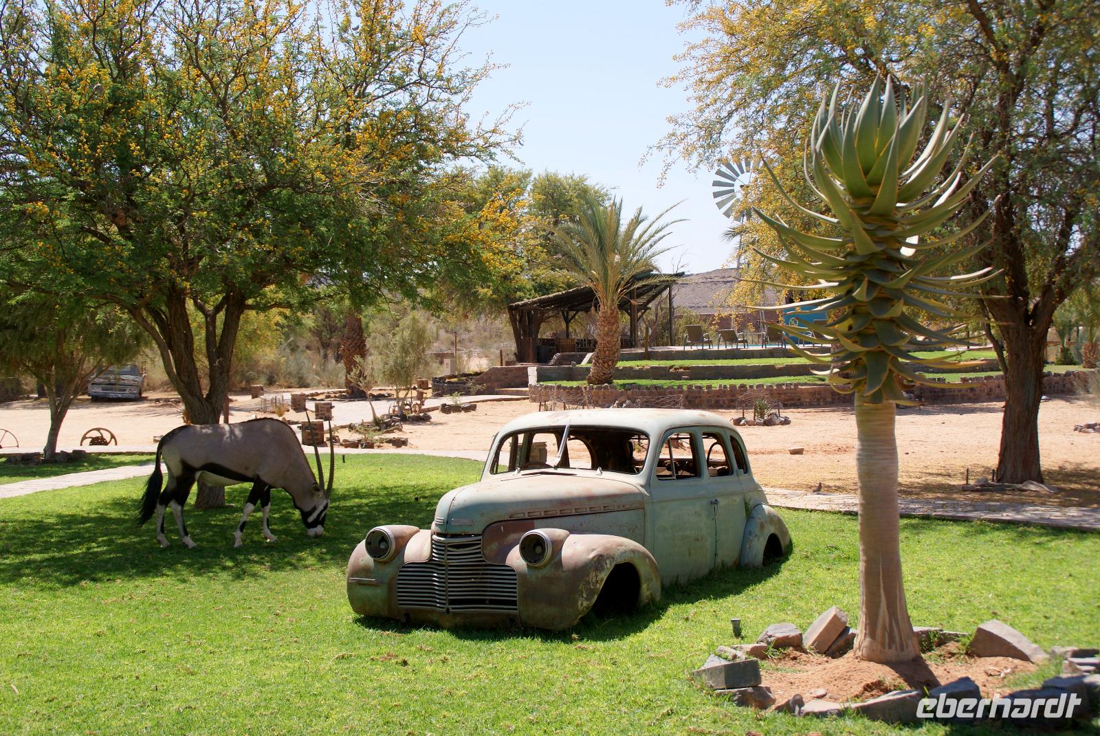 Gut gefrühstückt im deutschstämmigen Schützenhaus verlassen wir die Stadt, nicht jedoch ohne vorher noch einen Blick in den historischen Bahnhof und auf dessen stolze Dampflok aus vergangenen Zeiten zu werfen. Noch kurz zum Postamt und weiter geht die Reise durch das farbenprächtige Namibia. Ein Fotostopp erfolgt am Naute Damm und wir sind erstaunt, dass sich in diesem doch recht viel Wasser befindet obwohl es ja in Namibia kaum regnet. Auch wir sollen ja viel Flüssigkeit zu uns nehmen und so halten wir an der Naute Damm Brennerei von Familie Weder und nehmen an einer Verkostung teil. Verschiedene Spirituosen dürfen wir probieren und so manches Fläschchen wechselt im Anschluss den Besitzer. Gegen Mittag fahren wir in den Godvana Canyon Park ein und sehen in der Nähe eine Gruppe Strauße mit etlichen Jungtieren, die wir, bestens getarnt, beinahe übersehen hätten. Von Dagmar erfahren wir, dass von 12 gelegten Straußeneiern häufig nur 3 Küken überleben. Am malerischen Canyon Roadhouse nehmen wir einen Mittagssnack zu uns und können uns hier an Fotomotiven nicht satt sehen. Unzählige Oldtimer scheinen hier vergessen und beinahe eins mit der Natur und so manchem Köcherbaum zu sein. Webervogelnester in farbenfrohen Bäumen gilt es zu bestaunen, genauso wie eine vermeintlich handzahme Oryxantilope, die nur wenige Schritte von uns entfernt, das grüne Gras der Anlage genießt und sich von uns und unseren Fotoapparaten nicht stören lässt. Im Anschluss fahren wir zu unserer nächsten Herberge, der Canyon Lodge und sind begeistert von diesem tollen Anwesen, welches ein ehemaliges Farmhaus ist und dessen Wohneinheiten bestens in die Natur und Landschaft integriert sind. Am frühen Abend schließen wir uns einem Sonnenuntergangsspaziergang an und steigen auf ein Plateau, wo wir einen wunderbaren Sonnenuntergang genießen. Auch hier ist für unser Wohl gesorgt und so öffnet eine kleine Bar, von Guide Antonio geführt und verwöhnt uns mit frischen Getränken. Nach dem Abstieg zurück zur Lodge erwartet uns ein vielseitiges Abendessen unterm freien Sternenhimmel und wir sind uns einig, dass wir es hier sehr gerne noch ein paar Tage aushalten könnten.