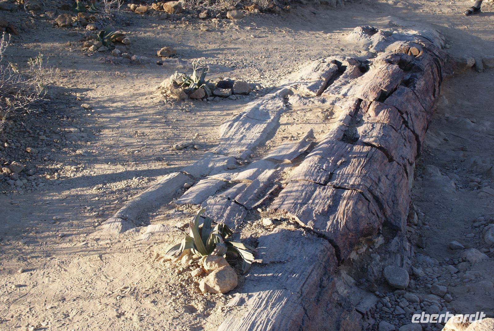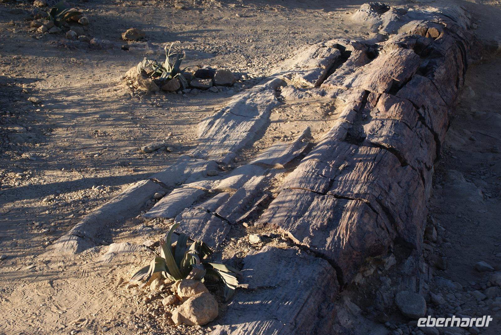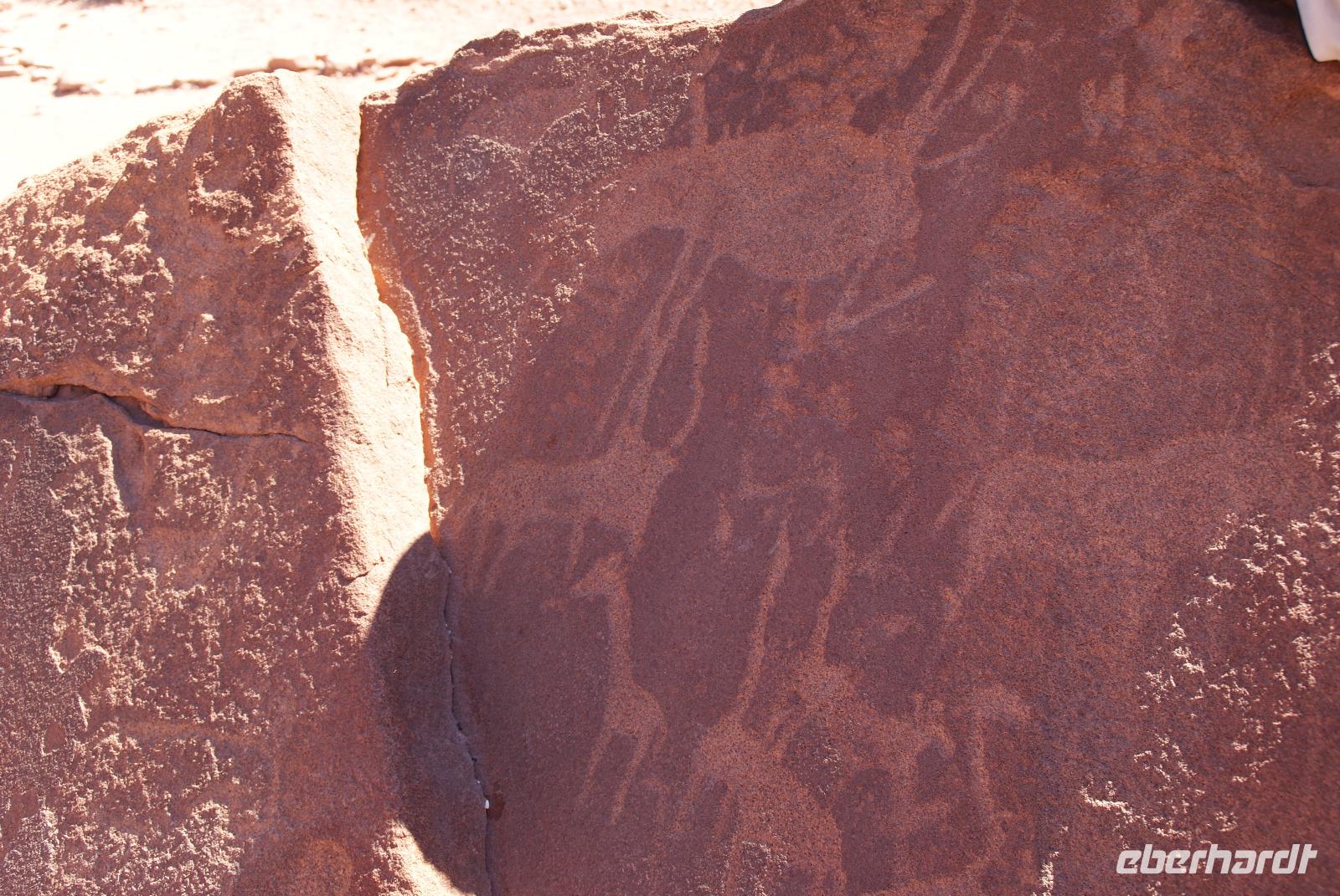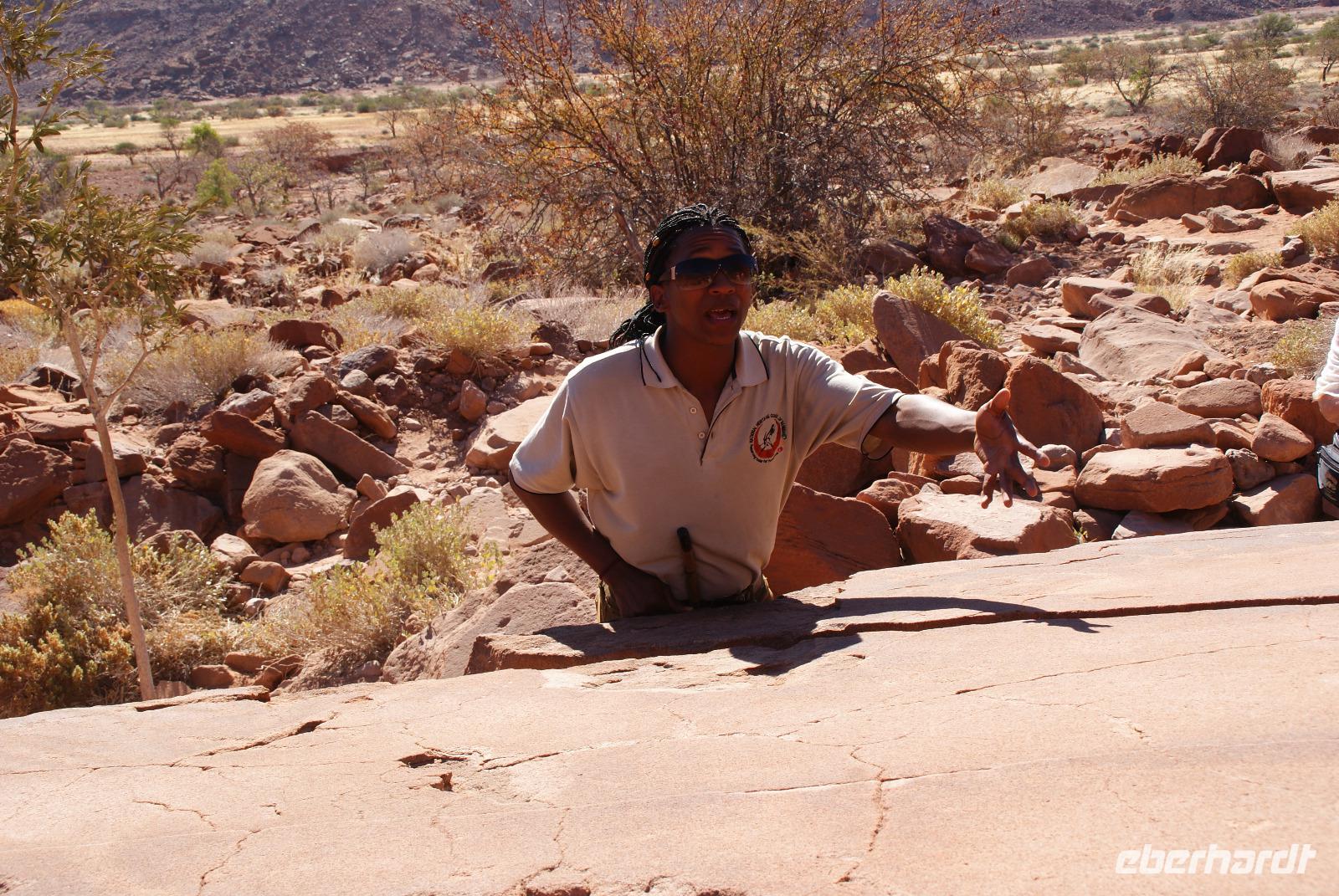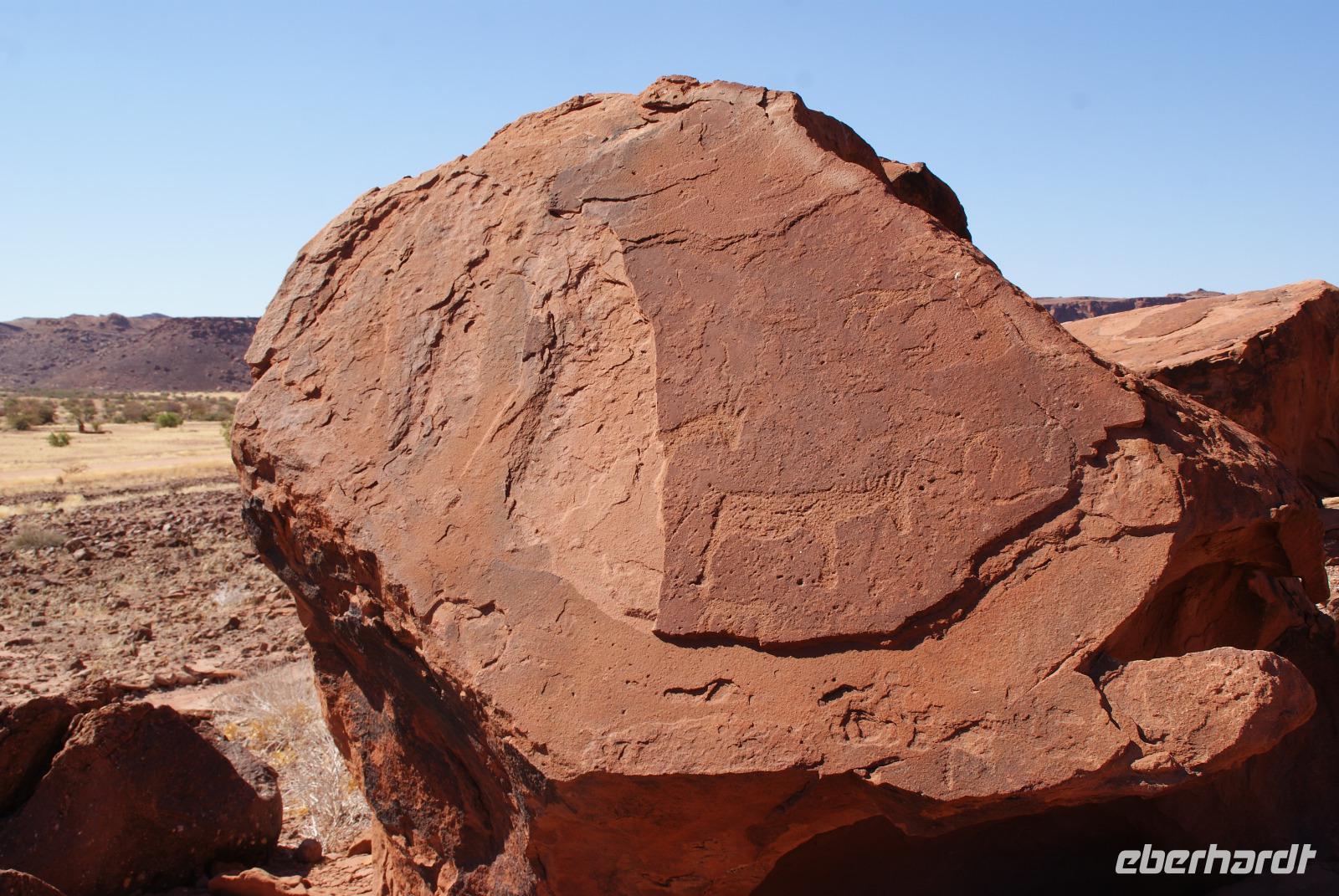 In unserem gediegenen Hansa Hotel haben wir herrlich geschlafen und königlich gefrühstückt. So verlassen wir Swakopmund an der Skelettküste entlang bis Hentiesbaai. Ein kurzer Halt an einem Schiffswrack, welches einer Filmkulisse gleichkommt und am Strand angespült liegt, machen wir ein paar schöne Aufnahmen. Vorbei am Städtchen Uis geht es die Landstraße am Brandberg, dem höchsten Berg Namibias entlang. Bevor wir uns die Felsgravuren von Twyfelfontein ansehen, machen wir zunächst ein herrliches Picknick an einem Camp Site und hier packen alle Gäste kräftig mit an und so entsteht in kurzer Zeit ein herrliches Mittagsmahl in uriger Runde und viel Natur um uns herum. Gut gestärkt wandern wir zu den zwischen 2000-6000 Jahre alten Felsgravuren und Felsmalereien von Twyfelfontein. Wir staunen über die vielen Tiere, die noch gut erhalten sind wie Beispielsweise Giraffen, Antilopen, Strauße und auch einen Felsen mit Wasserquellen bekommen wir zu sehen. Diese Gravuren dienten den San (Buschmänner) zur Orientierung und Wissensüberlieferung an Stammesmitglieder. Unsere Reise führt uns heute noch zum versteinerten Wald, wo wir 300 Millionen Jahre alte versteinerte Koniferen vorfinden. Man vermutet, dass diese einst aus Ostafrika angeschwemmt wurden, da sie hier nicht endemisch sind. Auch von der berühmten Welwitschia (benannt nach Dr. Friedrich Welwitsch) sehen wir einige Exemplare und staunen über diese merkwürdigen Pflanzen, die hier zwischen 50-70 Jahre alt sind. Von hier erfolgt noch eine 45 minütige Fahrt und wir kommen kurz vor dem Abendessen in der wunderschönen Damara Mopane Lodge an. Wir beziehen unsere schönen Häuschen mit Vorgarten und treffen uns im Anschluss zum Abendessen, wo wir ein tolles Buffet unter dem nächtlichen Sternenhimmel Namibias genießen.