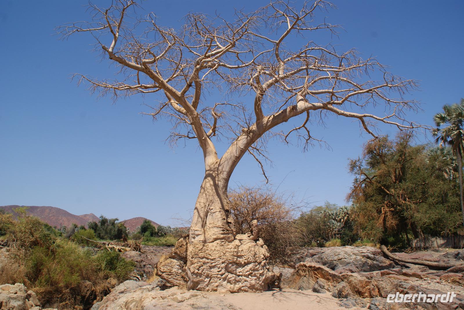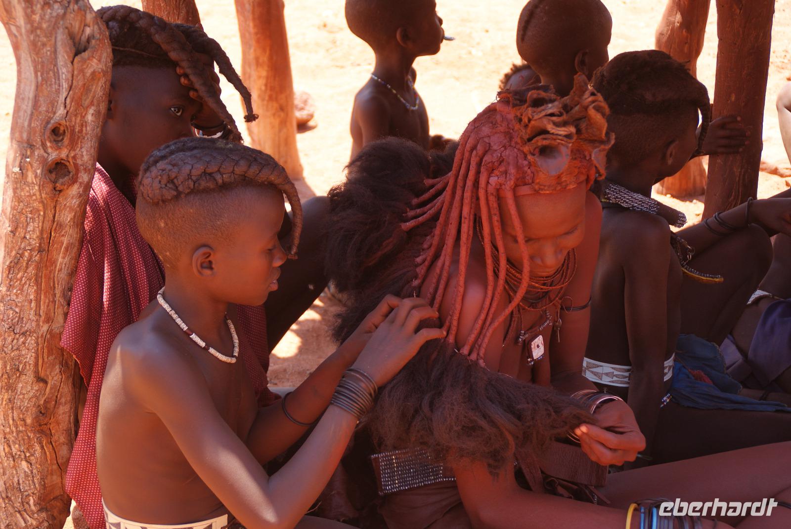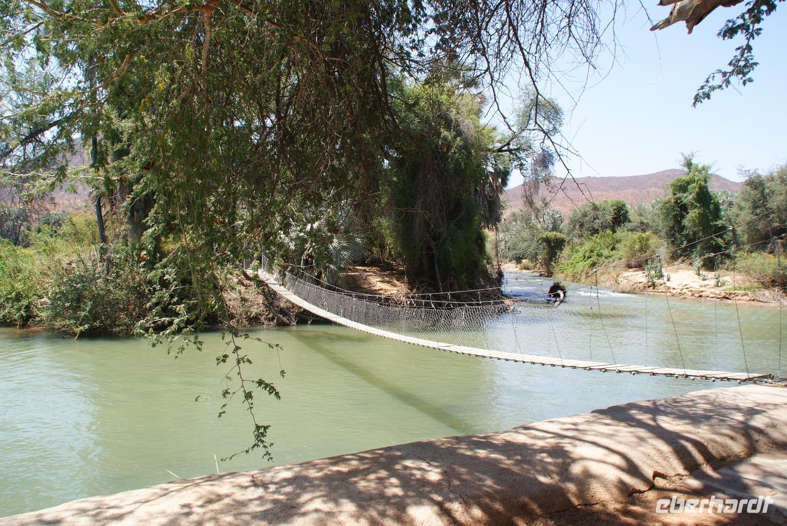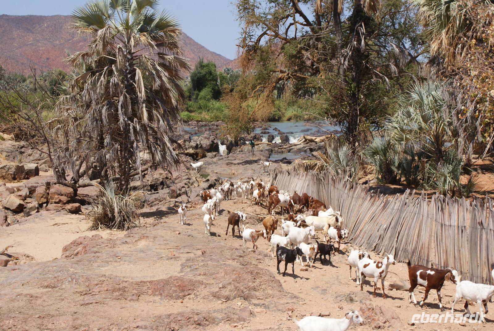 Beim Frühstück mit Aussicht stärken wir uns für den bevorstehenden Tag, der uns heute bis zur Grenze nach Angola an den Fluss Kunene und somit den Epupa Wasserfällen bringen wird. Am späten Vormittag besuchen wir zunächst ein sogenanntes „Lebendiges Museum", ein Himbadorf. Wir sind hier für heute angemeldet und bei unserer Ankunft empfangen uns die vier Frauen des Clanchefs und geduldig beantworten Sie all unsere Fragen. Erstaunt hören wir, dass ein Himbamann so viele Frauen heiraten, wie er mit Rindern bezahlen kann. Somit treffen wir hier auch auf eine große Kinderschar und die freundlichen Menschen und deren Urtümlichkeit ziehen uns rasch in ihren Bann. Der Kral des Dorfes bildet die Mitte und auch das heilige Feuer, welches nie ausgehen darf, wird uns gezeigt. Wir dürfen die verschiedenen Hütten ansehen und in einer dieser erklärt uns eine Himbafrau, wie sich ein eine Braut zur Hochzeit herrichtet. Bevor wir diese besonderen Menschen und letzten Halbnomaden wieder verlassen, statten wir noch einen Besuch auf deren Markt ab und überreichen unsere Gastgeschenke. Als nächstes halten wir an einem Camp Site, wo wir bei herrlichem Blick auf den Kunene Fluss unser Lunchpaket verzehren, dazu kühle Getränke und Kaffee vor Ort dazu kaufen. Hier könnten wir es locker ein paar Tage aushalten. Bedingt durch den Fluss sind wir nun umgeben von üppiger Natur und von leuchtend grüner Farbe, wie wir sie Tage schon nicht mehr gesehen haben. Weiter geht die Fahrt zu den Epupa Wasserfällen und es entstehen tolle Aufnahmen von der sich bietenden Natur und einem besonders imposanten Baobab Tree-einem Affenbrotbaum. Am Nachmittag treten wir die Rückfahrt nach Opuwo an und am frühen Abend erreichen wir unsere Lodge, die bereits mit einem wohlverdienten Abendessen auf uns wartet.