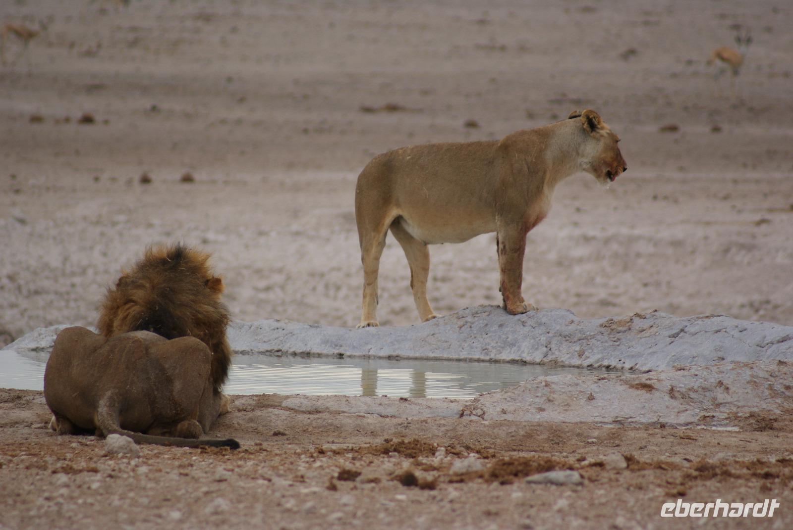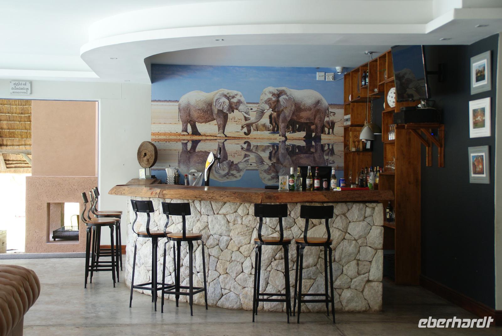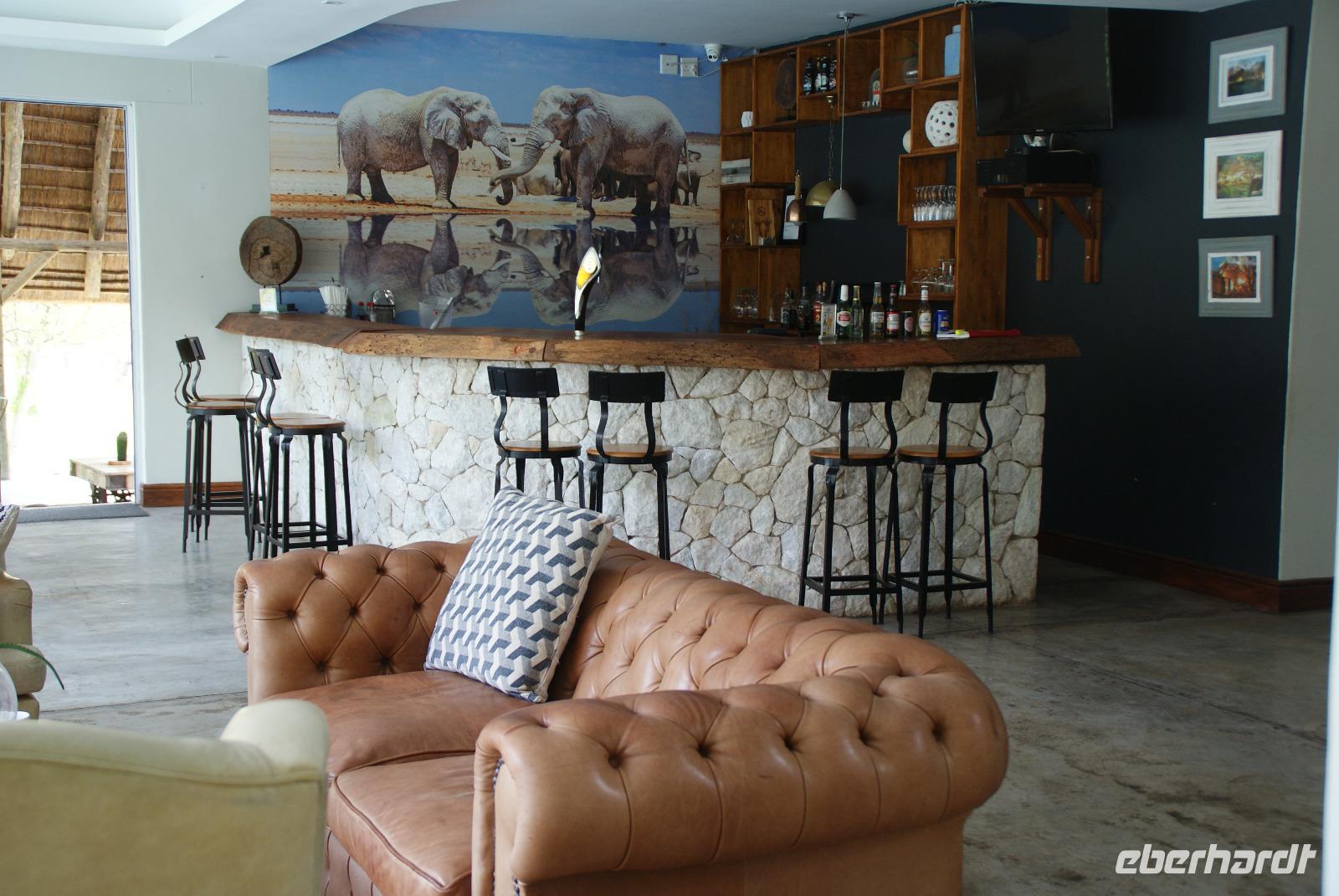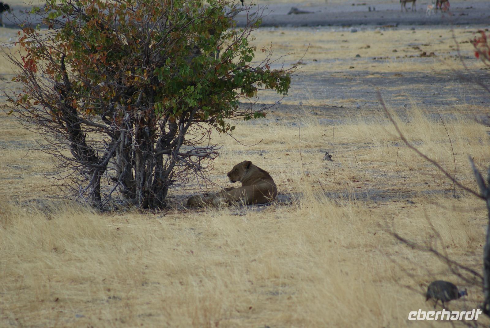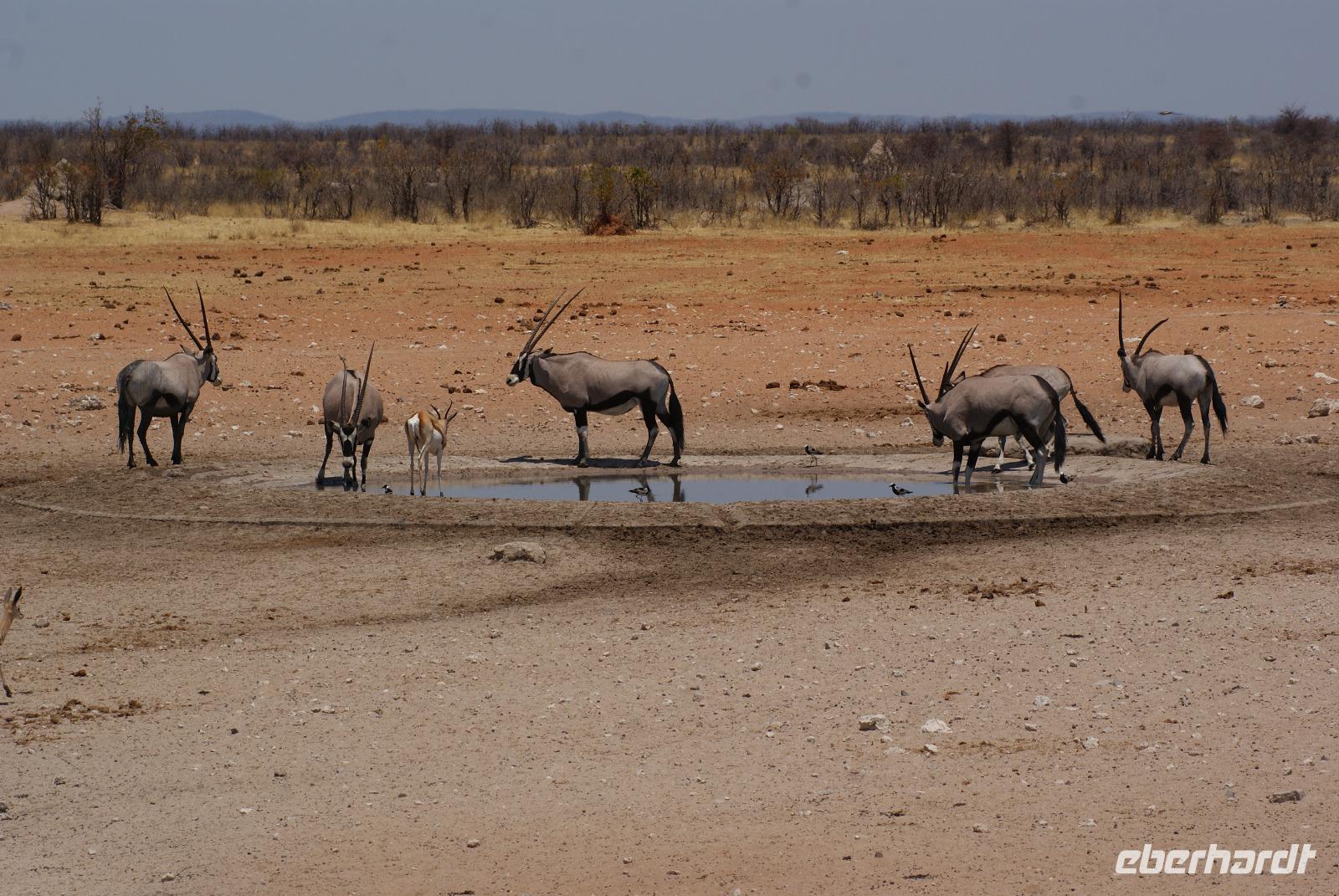 Zeitig und gut gefrühstückt verteilen wir uns auf zwei Jeeps und begeben uns auf Safari. Da der Himmel heute bewölkt ist, hoffen wir auf gute Tiersichtungen, die sich somit nicht mehr von der heißen Sonne verstecken müssen. Wir steuern verschiedene Wasserlöcher an und haben viel Glück, sehen Giraffen, eine Hyäne, eine Riesentrappe, den größten flugfähigen Vogel im südlichen Afrika, welcher bis zu 12 Kg schwer werden kann. Hocherfreut sind wir beim Anblick der fünf Löwen, die sich in keinster Weise von uns stören lassen. Kurze Zeit darauf sehen wir eine Elefantenherde mit ungefähr 20 Tieren. Haben wir ein Glück! Vor dem Mittagsstopp fahren wir vier Wasserlöcher an und können auch hier einige der verschiedenen Gattungen fotografieren. Bis dato fühlten wir uns in Namibia als ob wir das Land alleine bereisen, dies ändert sich schnell im Restcamp Halali, wo gefühlt alle Touristen auf Safari zeitgleich einfahren. Somit fällt unser Mittagsmahl eher überschaubar aus, denn wir wollen zügig unsere Pirschfahrt fortsetzen. Auch der Nachmittag bleibt sehr erfolgreich und wir werden mit einem Nashorn, weiteren Giraffen, einer Hyäne, die Siesta macht und einer großen Springbockherde belohnt. Kurz vor Ende der Safari sehen wir nochmals Löwen und Elefanten an einem Wasserloch und wir wissen gar nicht, wen wir zuerst fotografieren sollen. Am späten Nachmittag verlassen wir durch das Anderson Gate den Etosha Park und fahren zu unserer in der Nähe gelegenen Toshari Lodge. Eine wunderschöne Anlage erwartet uns und Fahrer Jonas hat uns netterweise bereits alle Koffer auf die Zimmer verteilen lassen. Ein herrliches Abendessen vom Buffet und frisch vor unseren Augen zubereitete Speisen, versüßen uns den Abend. Es schmeckt uns heute nach so viel Erlebtem besonders gut. Schnell sind wir uns einig, dass wir auch den dritten Tag Safari genießen werden und schon jetzt gespannt sind, was wir morgen vor die Linse bekommen werden.