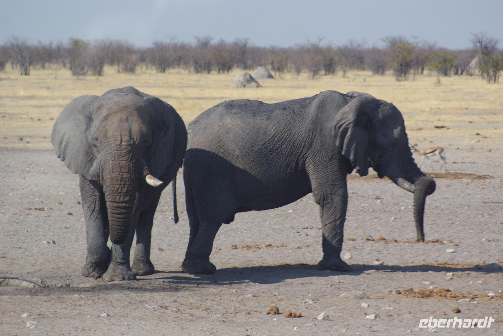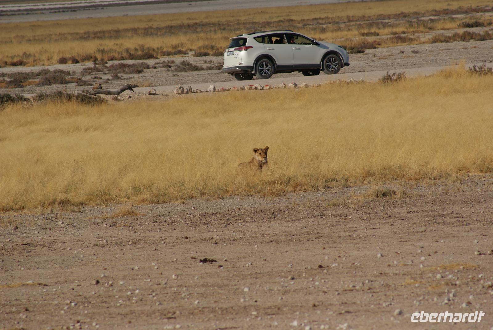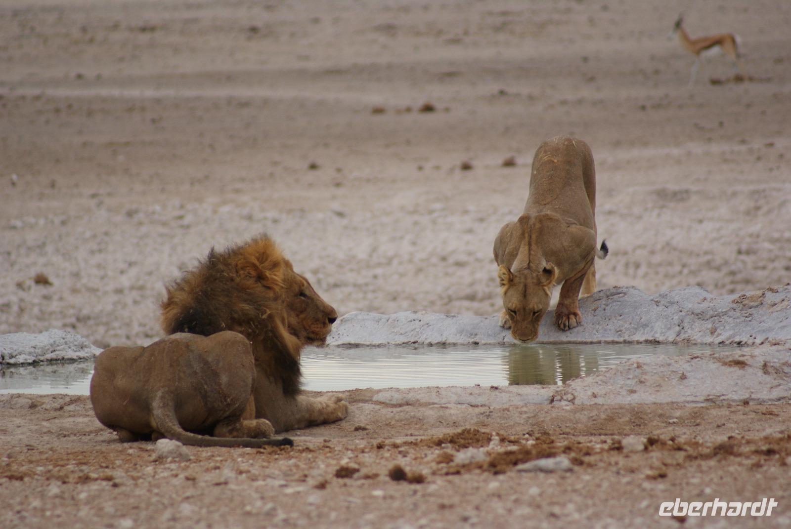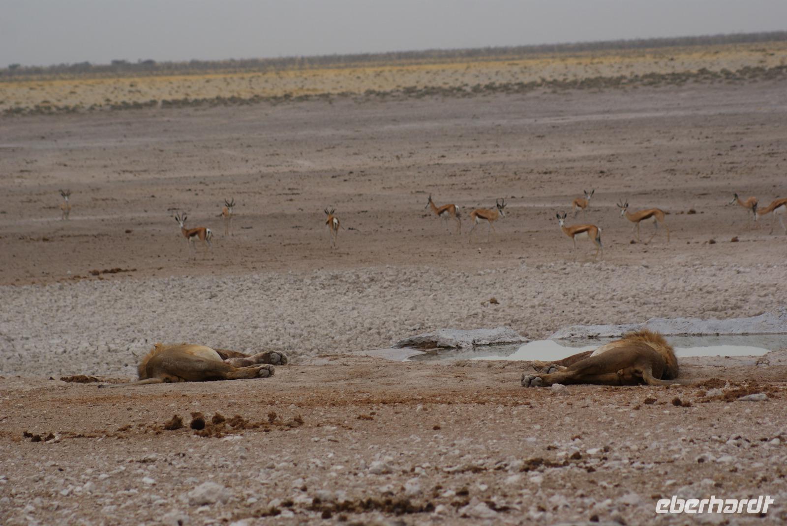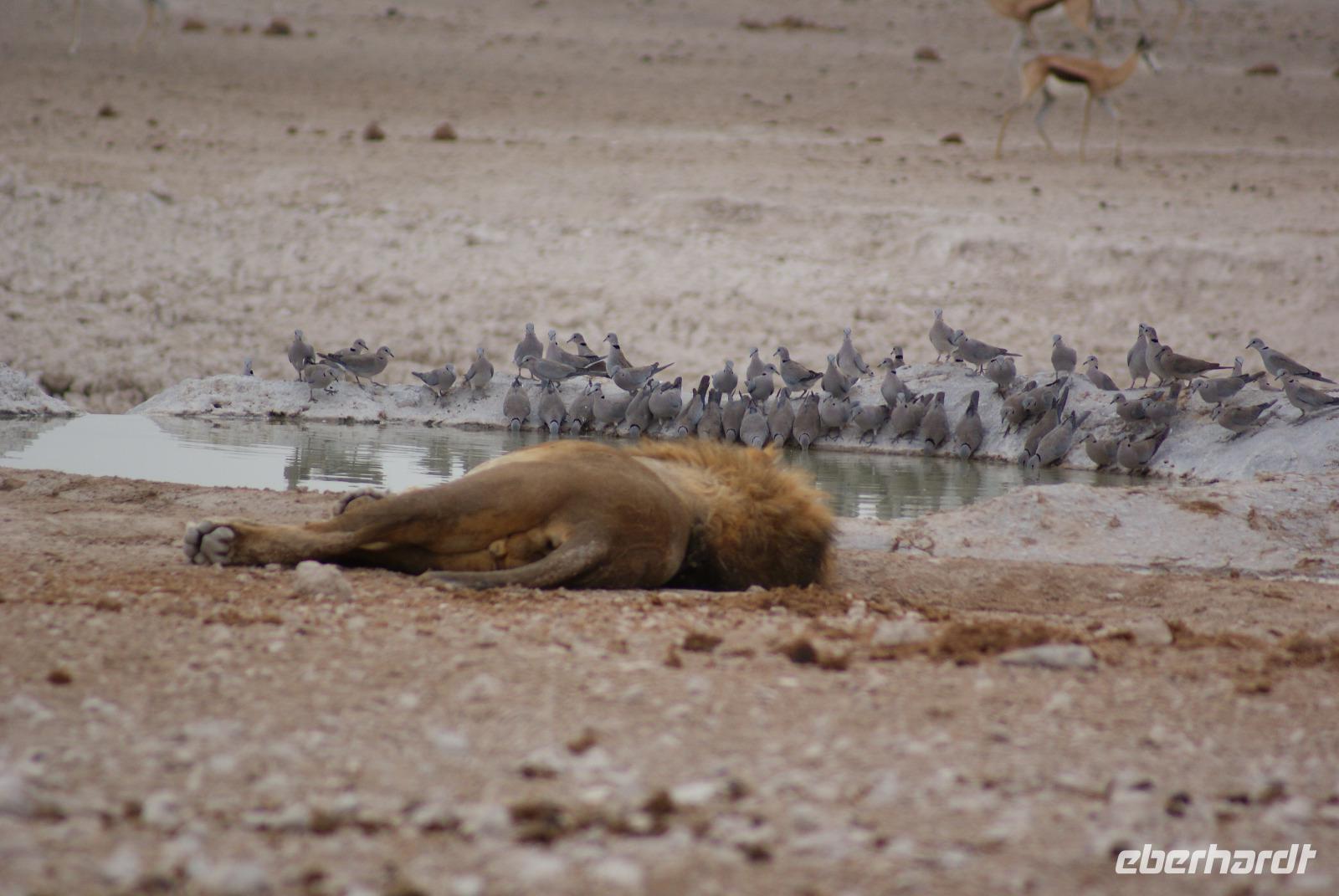 Zeitig und gut gefrühstückt verteilen wir uns auf zwei Jeeps und begeben uns auf Safari. Da der Himmel heute bewölkt ist, hoffen wir auf gute Tiersichtungen, die sich somit nicht mehr von der heißen Sonne verstecken müssen. Wir steuern verschiedene Wasserlöcher an und haben viel Glück, sehen Giraffen, eine Hyäne, eine Riesentrappe, den größten flugfähigen Vogel im südlichen Afrika, welcher bis zu 12 Kg schwer werden kann. Hocherfreut sind wir beim Anblick der fünf Löwen, die sich in keinster Weise von uns stören lassen. Kurze Zeit darauf sehen wir eine Elefantenherde mit ungefähr 20 Tieren. Haben wir ein Glück! Vor dem Mittagsstopp fahren wir vier Wasserlöcher an und können auch hier einige der verschiedenen Gattungen fotografieren. Bis dato fühlten wir uns in Namibia als ob wir das Land alleine bereisen, dies ändert sich schnell im Restcamp Halali, wo gefühlt alle Touristen auf Safari zeitgleich einfahren. Somit fällt unser Mittagsmahl eher überschaubar aus, denn wir wollen zügig unsere Pirschfahrt fortsetzen. Auch der Nachmittag bleibt sehr erfolgreich und wir werden mit einem Nashorn, weiteren Giraffen, einer Hyäne, die Siesta macht und einer großen Springbockherde belohnt. Kurz vor Ende der Safari sehen wir nochmals Löwen und Elefanten an einem Wasserloch und wir wissen gar nicht, wen wir zuerst fotografieren sollen. Am späten Nachmittag verlassen wir durch das Anderson Gate den Etosha Park und fahren zu unserer in der Nähe gelegenen Toshari Lodge. Eine wunderschöne Anlage erwartet uns und Fahrer Jonas hat uns netterweise bereits alle Koffer auf die Zimmer verteilen lassen. Ein herrliches Abendessen vom Buffet und frisch vor unseren Augen zubereitete Speisen, versüßen uns den Abend. Es schmeckt uns heute nach so viel Erlebtem besonders gut. Schnell sind wir uns einig, dass wir auch den dritten Tag Safari genießen werden und schon jetzt gespannt sind, was wir morgen vor die Linse bekommen werden.