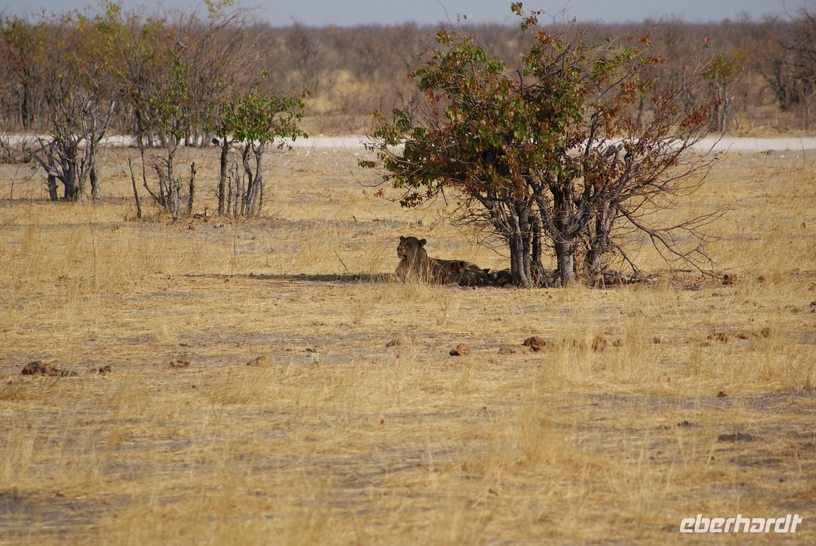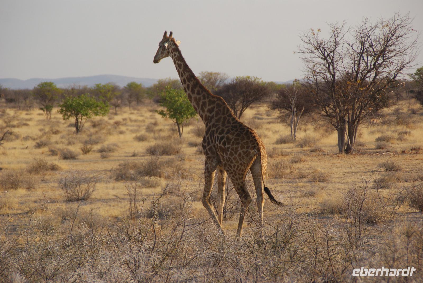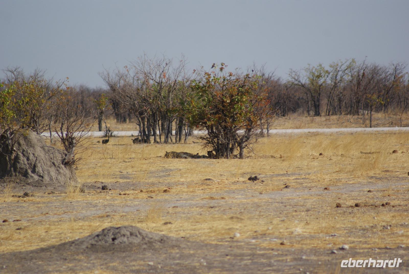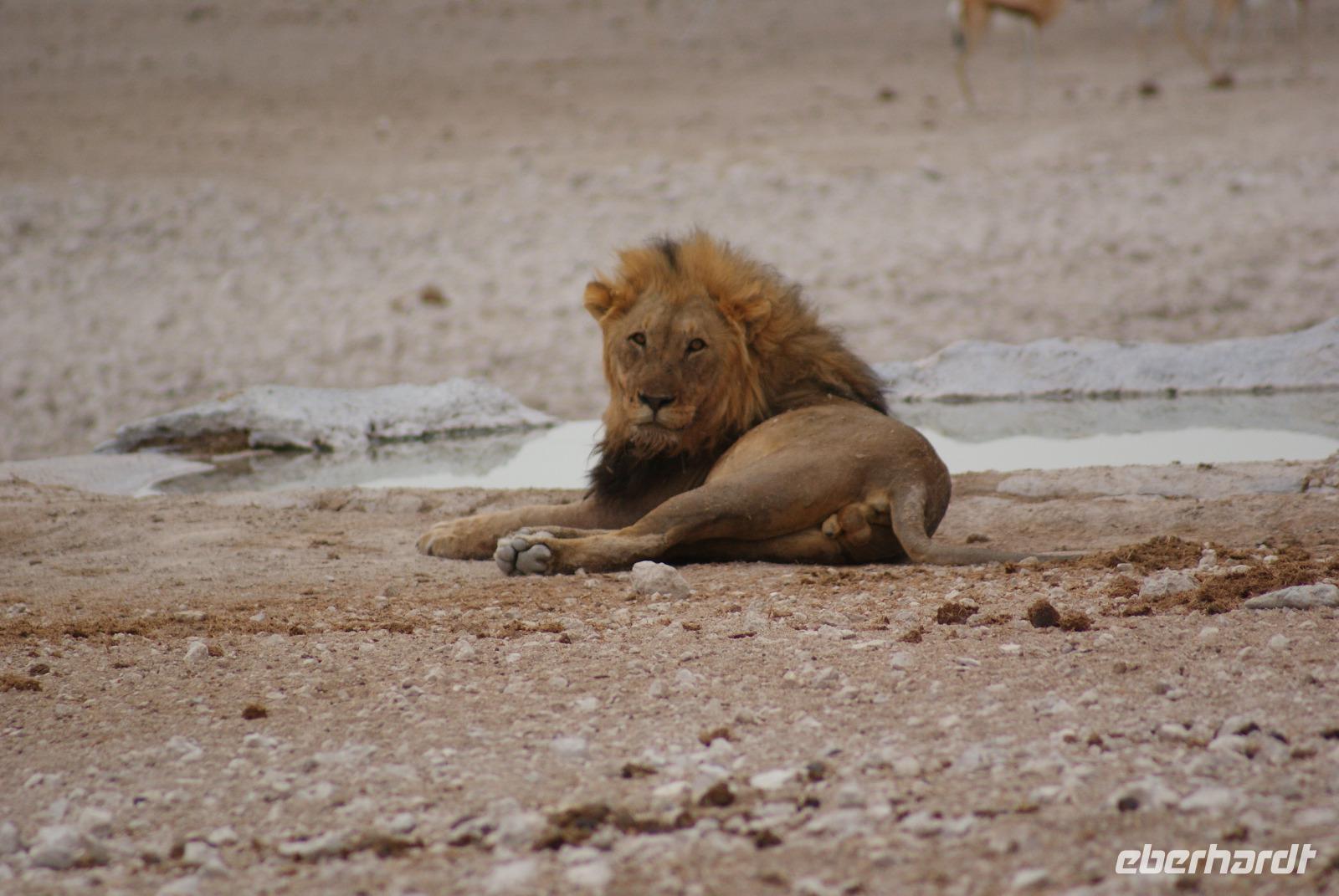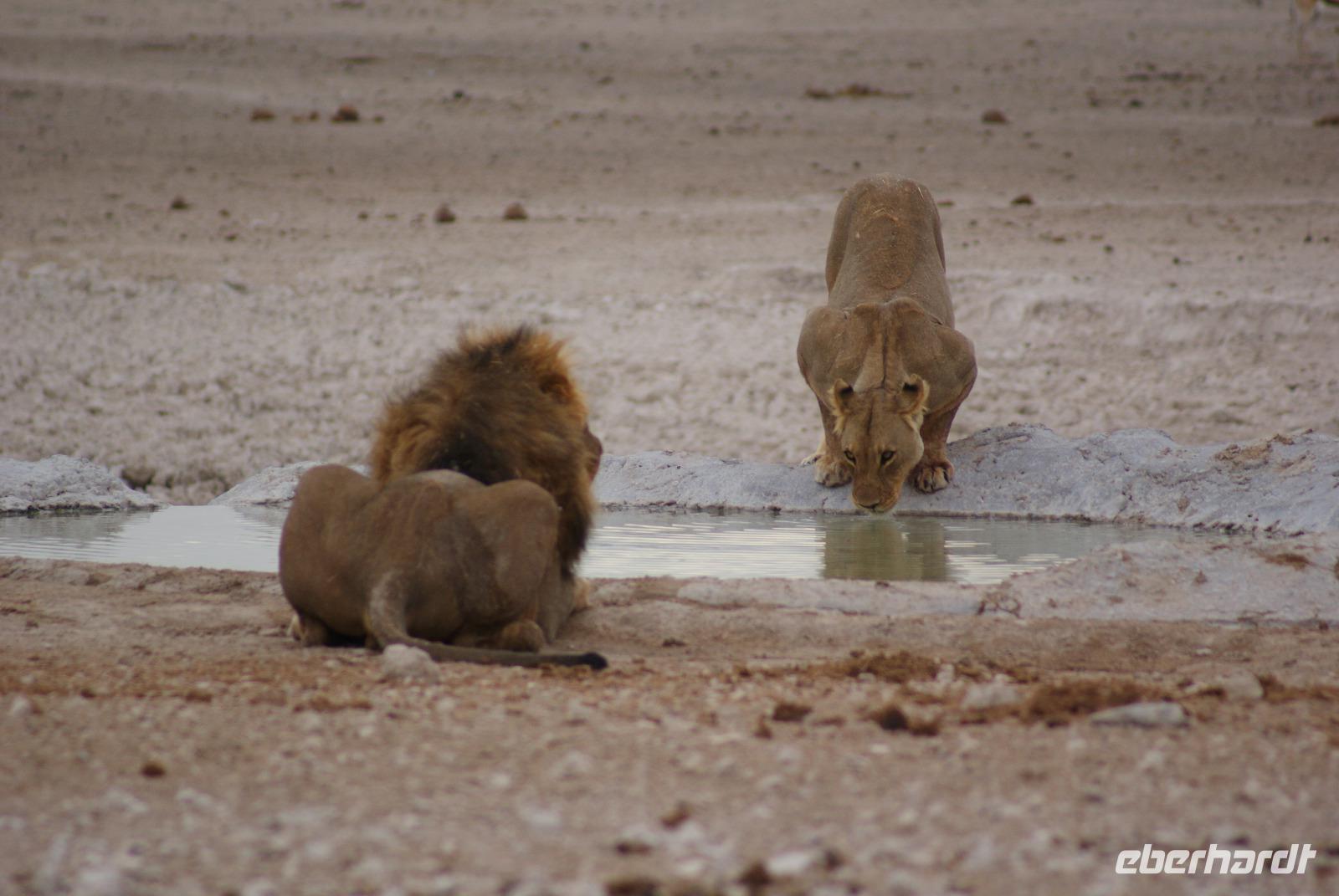 Zeitig und gut gefrühstückt verteilen wir uns auf zwei Jeeps und begeben uns auf Safari. Da der Himmel heute bewölkt ist, hoffen wir auf gute Tiersichtungen, die sich somit nicht mehr von der heißen Sonne verstecken müssen. Wir steuern verschiedene Wasserlöcher an und haben viel Glück, sehen Giraffen, eine Hyäne, eine Riesentrappe, den größten flugfähigen Vogel im südlichen Afrika, welcher bis zu 12 Kg schwer werden kann. Hocherfreut sind wir beim Anblick der fünf Löwen, die sich in keinster Weise von uns stören lassen. Kurze Zeit darauf sehen wir eine Elefantenherde mit ungefähr 20 Tieren. Haben wir ein Glück! Vor dem Mittagsstopp fahren wir vier Wasserlöcher an und können auch hier einige der verschiedenen Gattungen fotografieren. Bis dato fühlten wir uns in Namibia als ob wir das Land alleine bereisen, dies ändert sich schnell im Restcamp Halali, wo gefühlt alle Touristen auf Safari zeitgleich einfahren. Somit fällt unser Mittagsmahl eher überschaubar aus, denn wir wollen zügig unsere Pirschfahrt fortsetzen. Auch der Nachmittag bleibt sehr erfolgreich und wir werden mit einem Nashorn, weiteren Giraffen, einer Hyäne, die Siesta macht und einer großen Springbockherde belohnt. Kurz vor Ende der Safari sehen wir nochmals Löwen und Elefanten an einem Wasserloch und wir wissen gar nicht, wen wir zuerst fotografieren sollen. Am späten Nachmittag verlassen wir durch das Anderson Gate den Etosha Park und fahren zu unserer in der Nähe gelegenen Toshari Lodge. Eine wunderschöne Anlage erwartet uns und Fahrer Jonas hat uns netterweise bereits alle Koffer auf die Zimmer verteilen lassen. Ein herrliches Abendessen vom Buffet und frisch vor unseren Augen zubereitete Speisen, versüßen uns den Abend. Es schmeckt uns heute nach so viel Erlebtem besonders gut. Schnell sind wir uns einig, dass wir auch den dritten Tag Safari genießen werden und schon jetzt gespannt sind, was wir morgen vor die Linse bekommen werden.