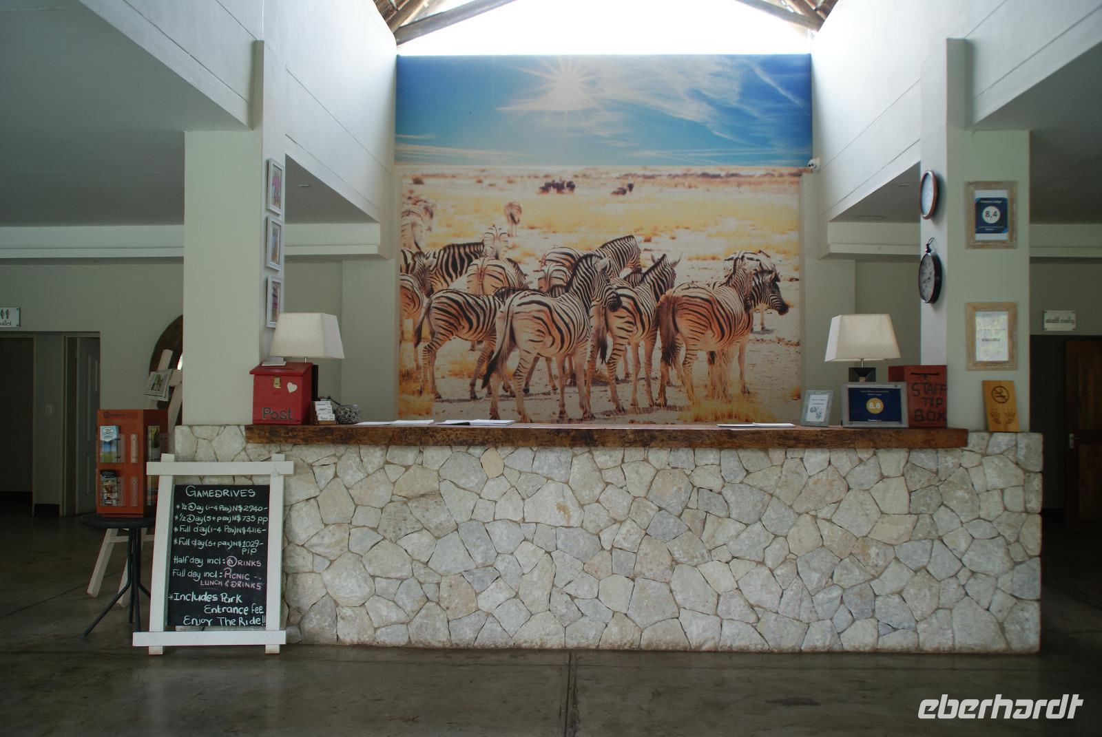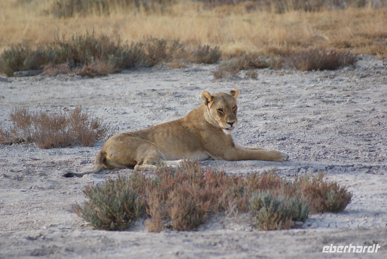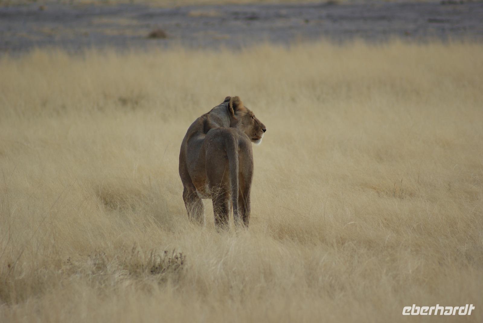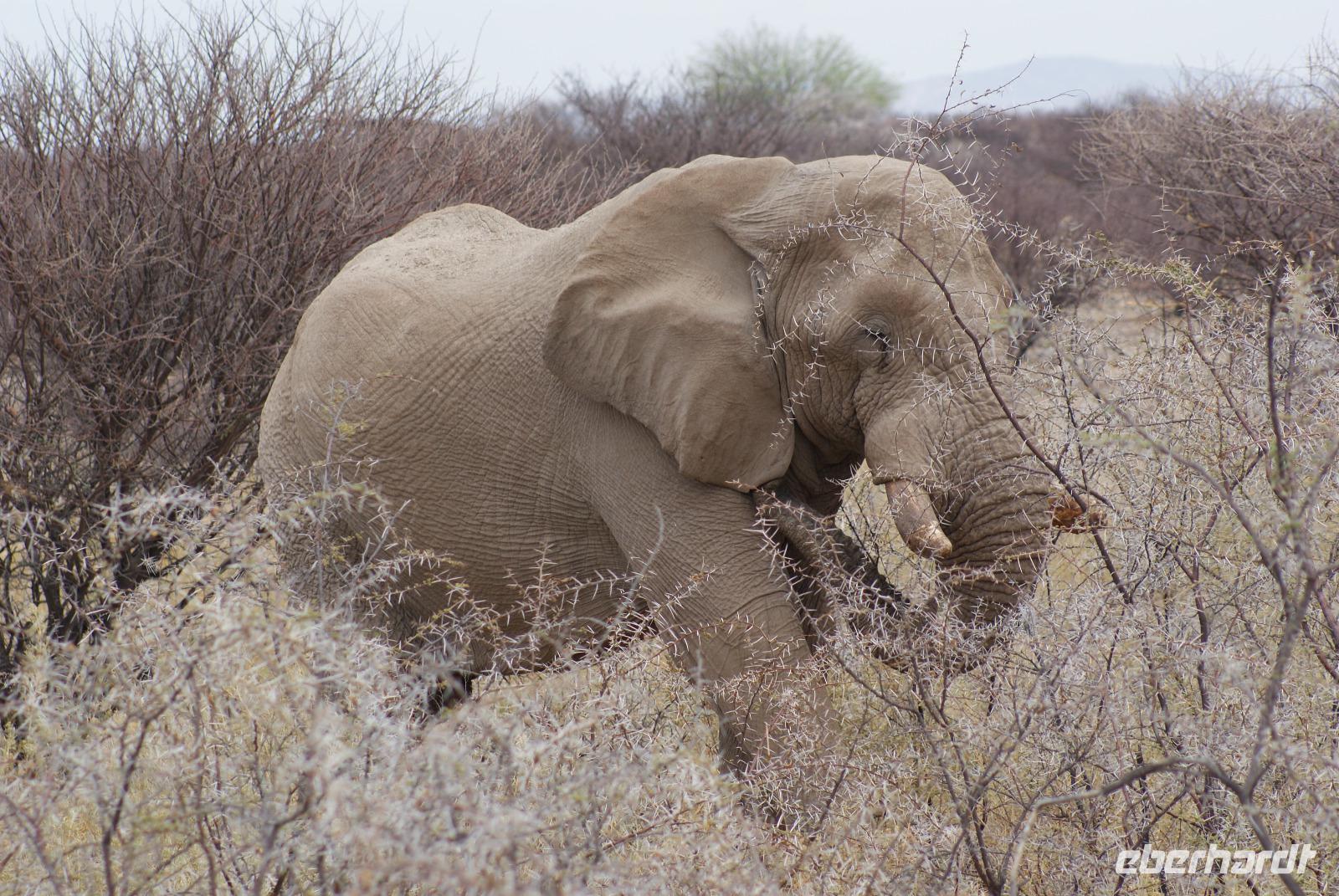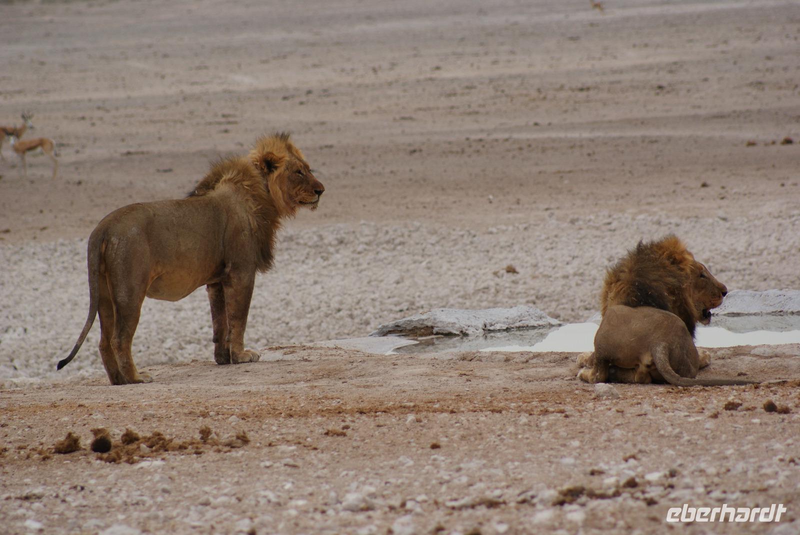 Zeitig und gut gefrühstückt verteilen wir uns auf zwei Jeeps und begeben uns auf Safari. Da der Himmel heute bewölkt ist, hoffen wir auf gute Tiersichtungen, die sich somit nicht mehr von der heißen Sonne verstecken müssen. Wir steuern verschiedene Wasserlöcher an und haben viel Glück, sehen Giraffen, eine Hyäne, eine Riesentrappe, den größten flugfähigen Vogel im südlichen Afrika, welcher bis zu 12 Kg schwer werden kann. Hocherfreut sind wir beim Anblick der fünf Löwen, die sich in keinster Weise von uns stören lassen. Kurze Zeit darauf sehen wir eine Elefantenherde mit ungefähr 20 Tieren. Haben wir ein Glück! Vor dem Mittagsstopp fahren wir vier Wasserlöcher an und können auch hier einige der verschiedenen Gattungen fotografieren. Bis dato fühlten wir uns in Namibia als ob wir das Land alleine bereisen, dies ändert sich schnell im Restcamp Halali, wo gefühlt alle Touristen auf Safari zeitgleich einfahren. Somit fällt unser Mittagsmahl eher überschaubar aus, denn wir wollen zügig unsere Pirschfahrt fortsetzen. Auch der Nachmittag bleibt sehr erfolgreich und wir werden mit einem Nashorn, weiteren Giraffen, einer Hyäne, die Siesta macht und einer großen Springbockherde belohnt. Kurz vor Ende der Safari sehen wir nochmals Löwen und Elefanten an einem Wasserloch und wir wissen gar nicht, wen wir zuerst fotografieren sollen. Am späten Nachmittag verlassen wir durch das Anderson Gate den Etosha Park und fahren zu unserer in der Nähe gelegenen Toshari Lodge. Eine wunderschöne Anlage erwartet uns und Fahrer Jonas hat uns netterweise bereits alle Koffer auf die Zimmer verteilen lassen. Ein herrliches Abendessen vom Buffet und frisch vor unseren Augen zubereitete Speisen, versüßen uns den Abend. Es schmeckt uns heute nach so viel Erlebtem besonders gut. Schnell sind wir uns einig, dass wir auch den dritten Tag Safari genießen werden und schon jetzt gespannt sind, was wir morgen vor die Linse bekommen werden.