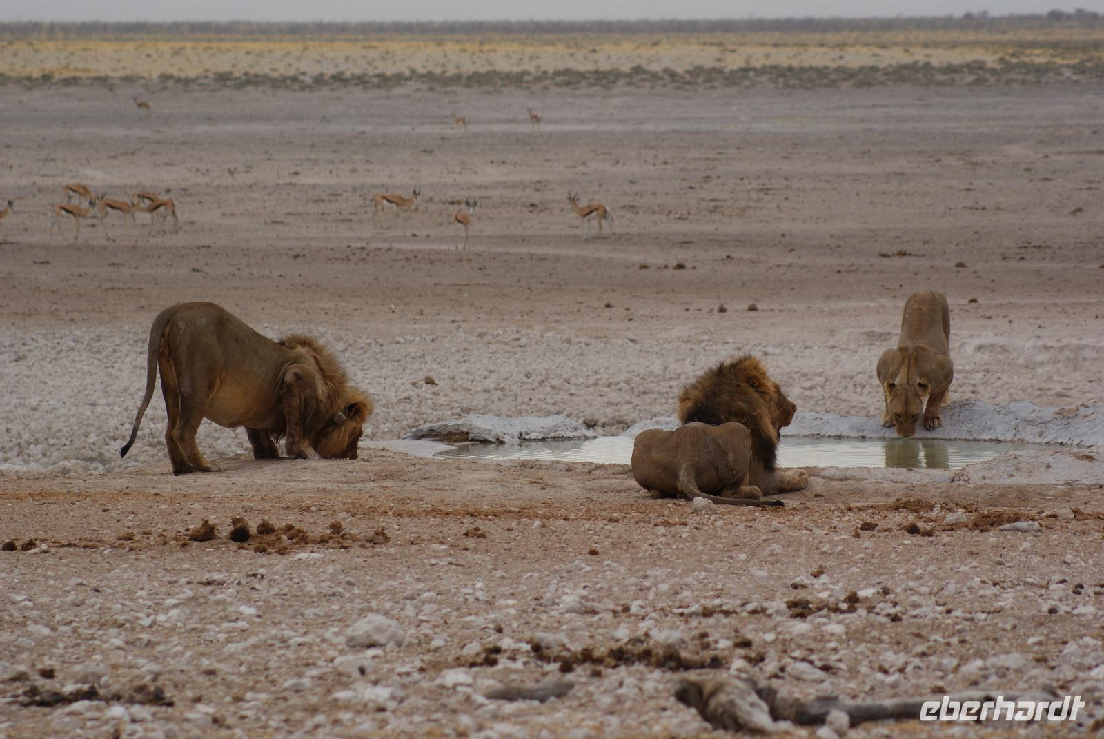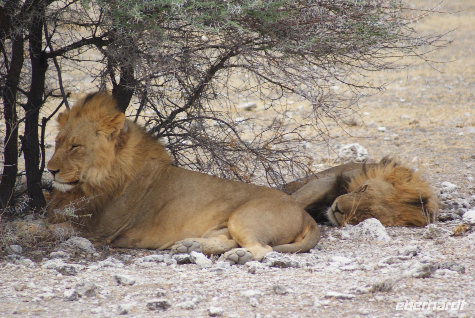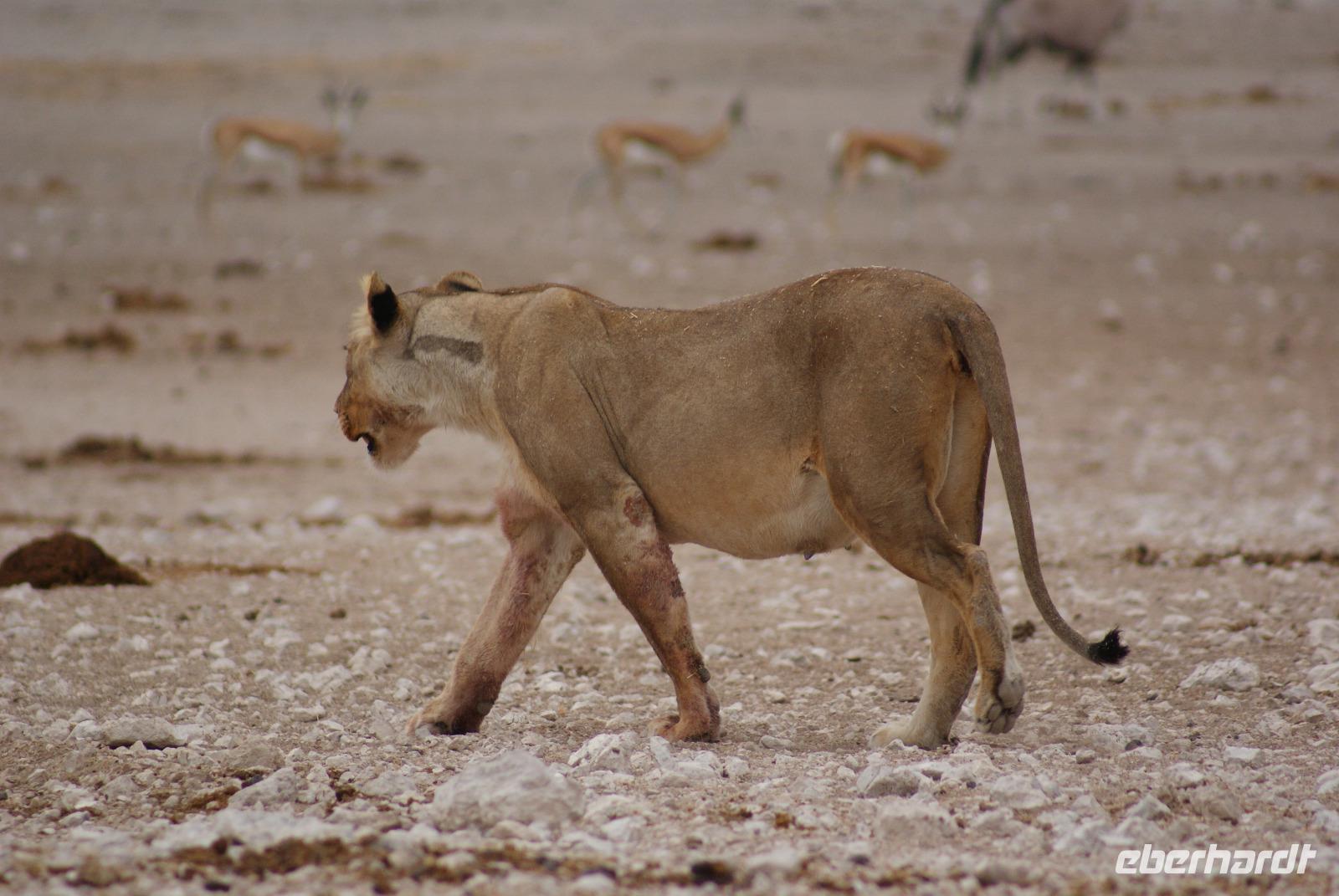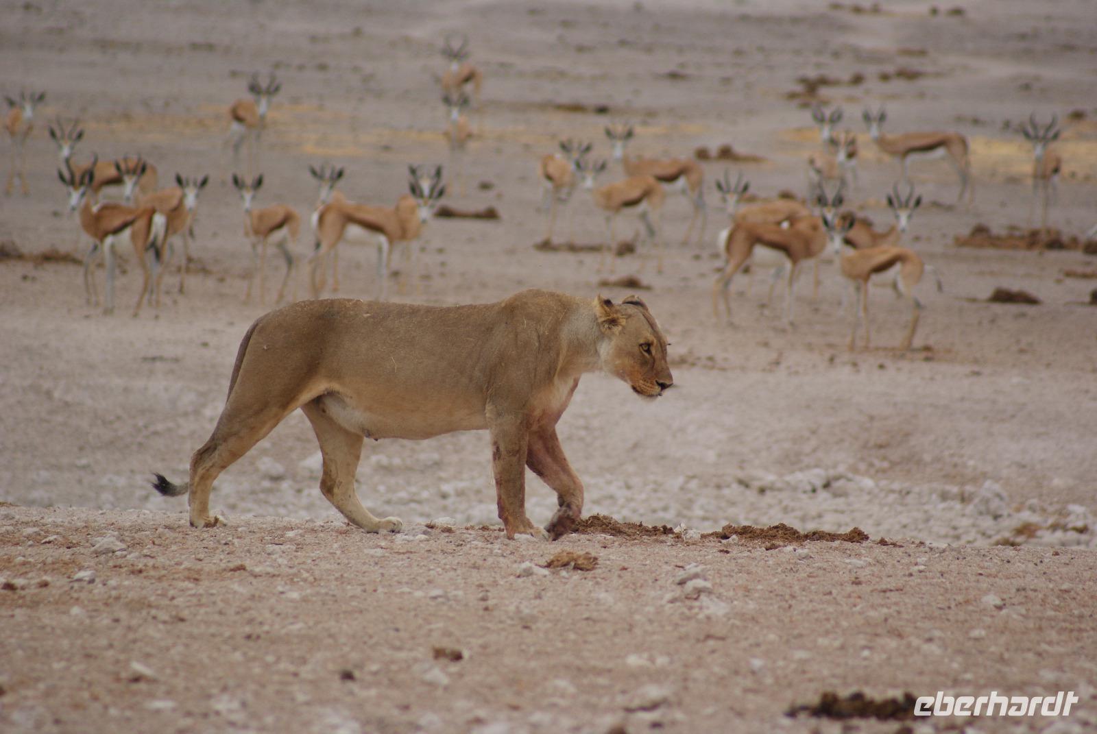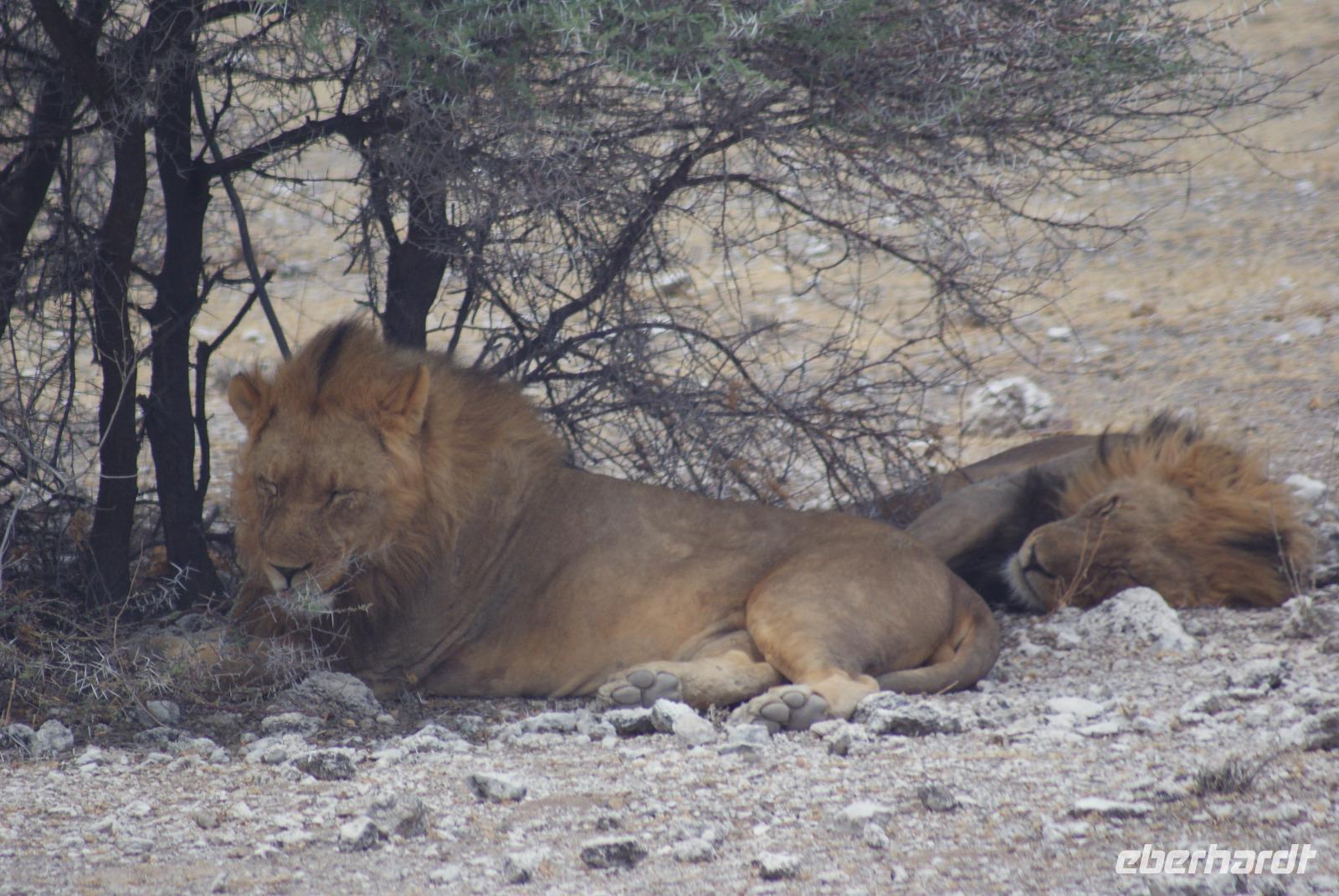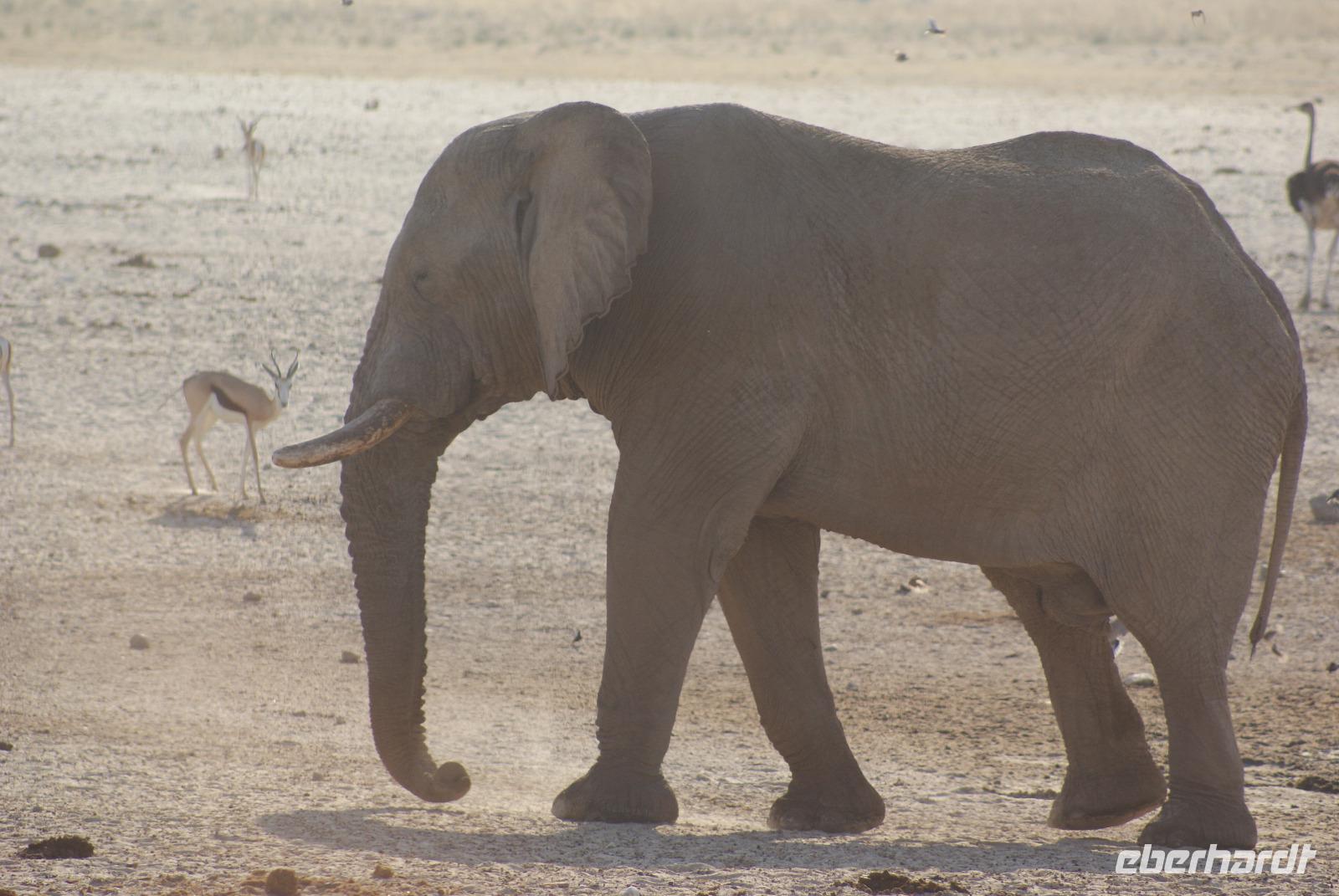 Zeitig und gut gefrühstückt verteilen wir uns auf zwei Jeeps und begeben uns auf Safari. Da der Himmel heute bewölkt ist, hoffen wir auf gute Tiersichtungen, die sich somit nicht mehr von der heißen Sonne verstecken müssen. Wir steuern verschiedene Wasserlöcher an und haben viel Glück, sehen Giraffen, eine Hyäne, eine Riesentrappe, den größten flugfähigen Vogel im südlichen Afrika, welcher bis zu 12 Kg schwer werden kann. Hocherfreut sind wir beim Anblick der fünf Löwen, die sich in keinster Weise von uns stören lassen. Kurze Zeit darauf sehen wir eine Elefantenherde mit ungefähr 20 Tieren. Haben wir ein Glück! Vor dem Mittagsstopp fahren wir vier Wasserlöcher an und können auch hier einige der verschiedenen Gattungen fotografieren. Bis dato fühlten wir uns in Namibia als ob wir das Land alleine bereisen, dies ändert sich schnell im Restcamp Halali, wo gefühlt alle Touristen auf Safari zeitgleich einfahren. Somit fällt unser Mittagsmahl eher überschaubar aus, denn wir wollen zügig unsere Pirschfahrt fortsetzen. Auch der Nachmittag bleibt sehr erfolgreich und wir werden mit einem Nashorn, weiteren Giraffen, einer Hyäne, die Siesta macht und einer großen Springbockherde belohnt. Kurz vor Ende der Safari sehen wir nochmals Löwen und Elefanten an einem Wasserloch und wir wissen gar nicht, wen wir zuerst fotografieren sollen. Am späten Nachmittag verlassen wir durch das Anderson Gate den Etosha Park und fahren zu unserer in der Nähe gelegenen Toshari Lodge. Eine wunderschöne Anlage erwartet uns und Fahrer Jonas hat uns netterweise bereits alle Koffer auf die Zimmer verteilen lassen. Ein herrliches Abendessen vom Buffet und frisch vor unseren Augen zubereitete Speisen, versüßen uns den Abend. Es schmeckt uns heute nach so viel Erlebtem besonders gut. Schnell sind wir uns einig, dass wir auch den dritten Tag Safari genießen werden und schon jetzt gespannt sind, was wir morgen vor die Linse bekommen werden.