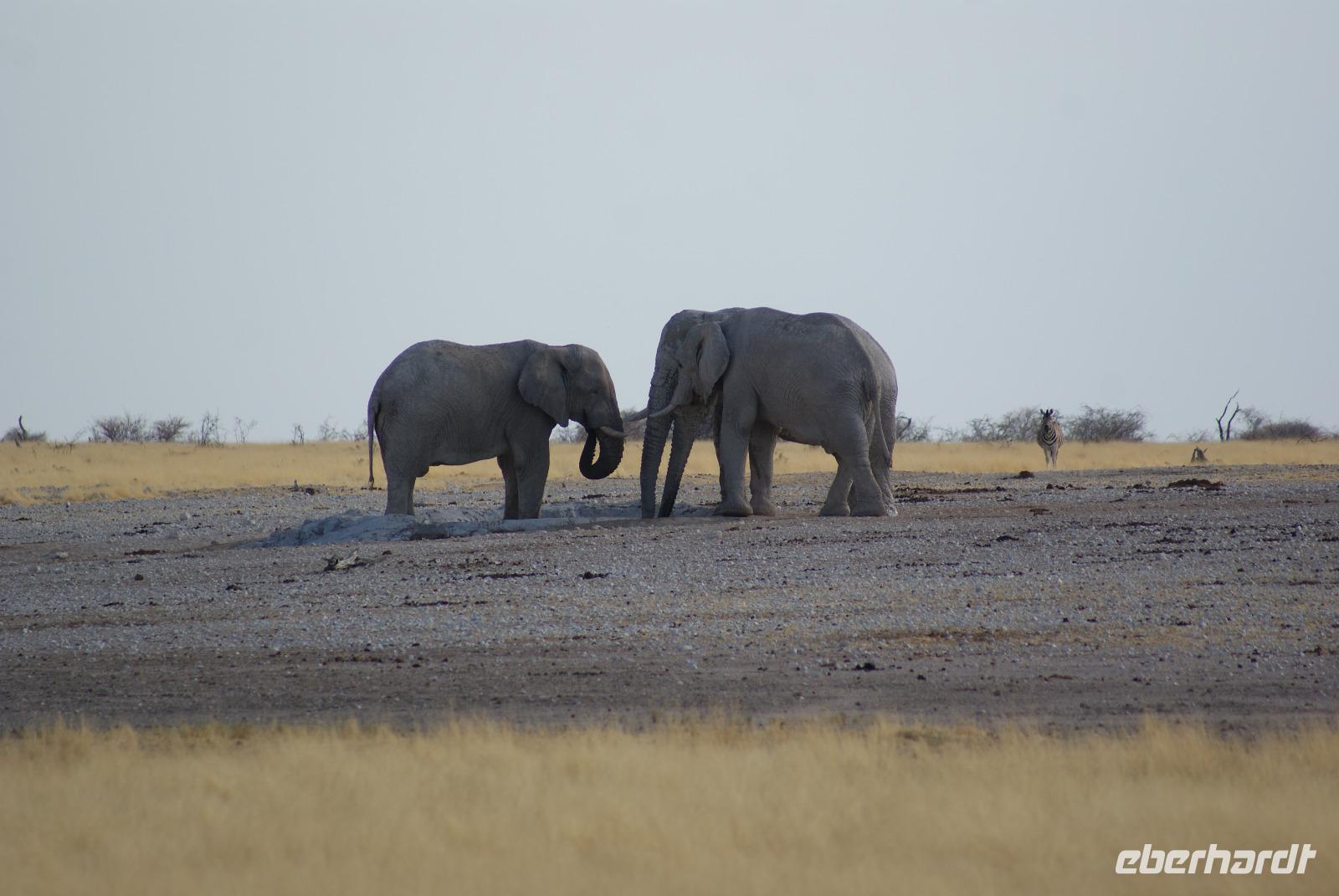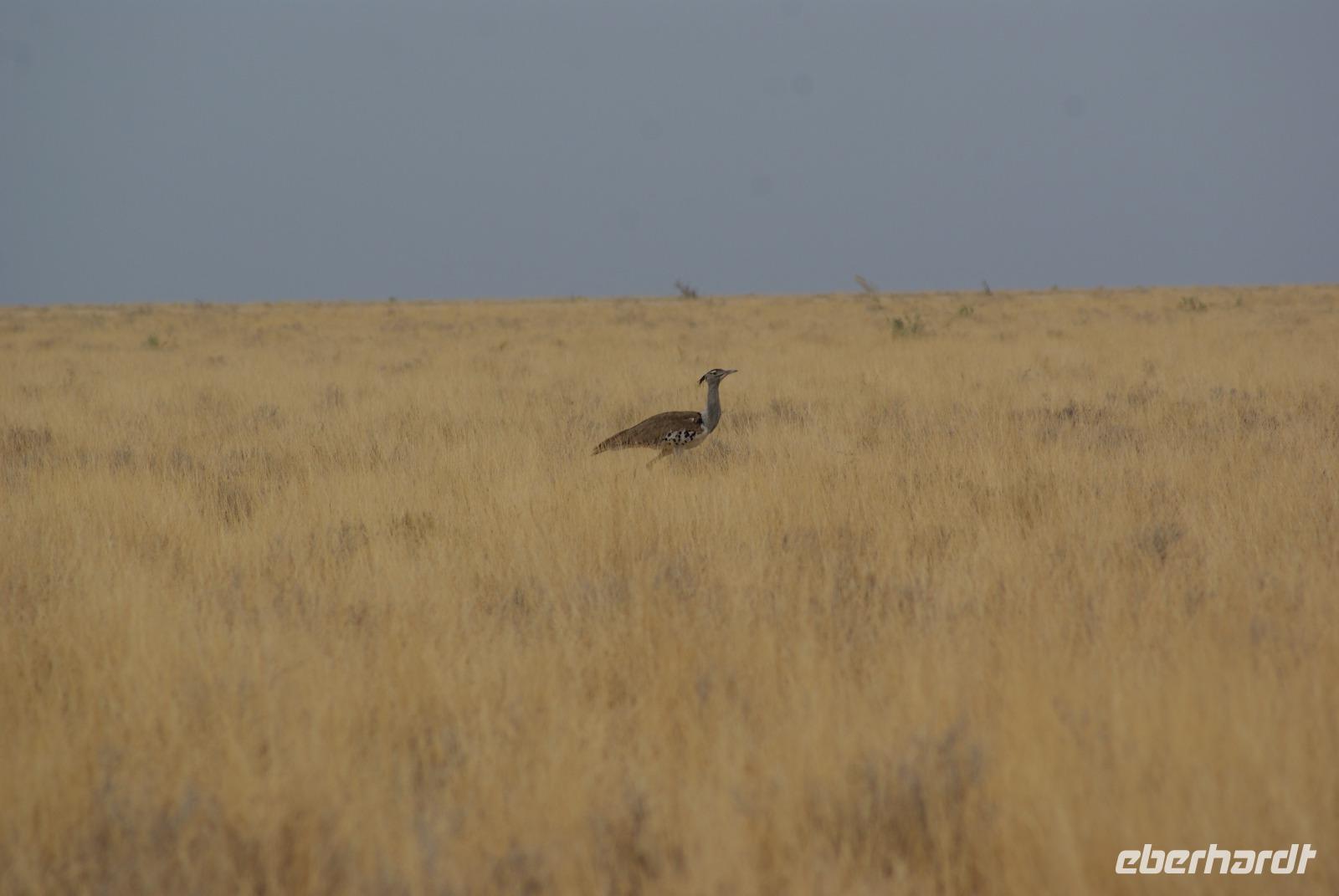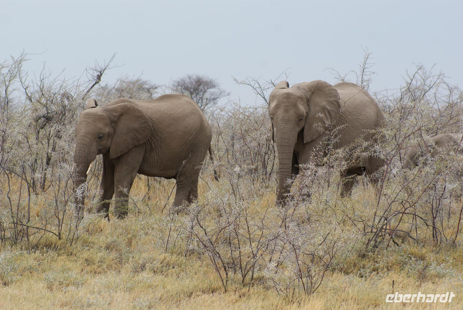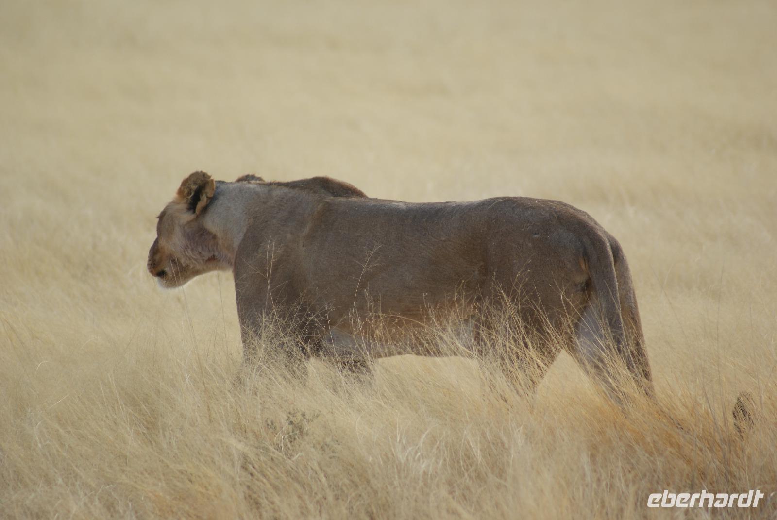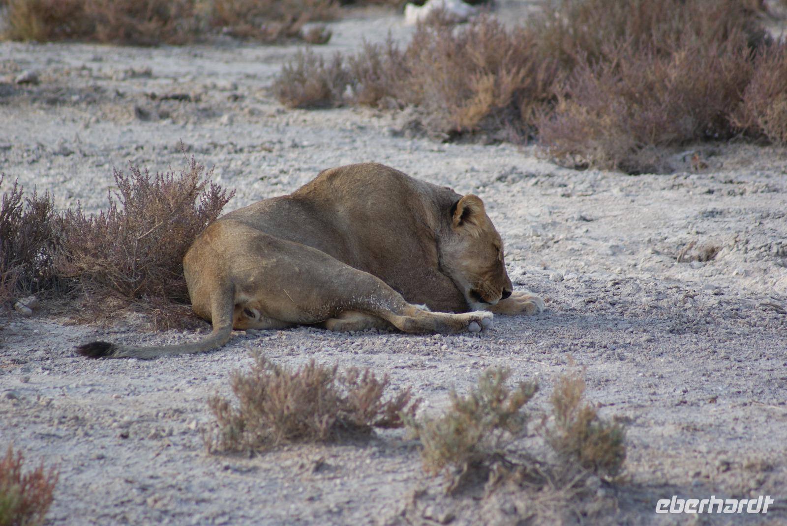 Zeitig und gut gefrühstückt verteilen wir uns auf zwei Jeeps und begeben uns auf Safari. Da der Himmel heute bewölkt ist, hoffen wir auf gute Tiersichtungen, die sich somit nicht mehr von der heißen Sonne verstecken müssen. Wir steuern verschiedene Wasserlöcher an und haben viel Glück, sehen Giraffen, eine Hyäne, eine Riesentrappe, den größten flugfähigen Vogel im südlichen Afrika, welcher bis zu 12 Kg schwer werden kann. Hocherfreut sind wir beim Anblick der fünf Löwen, die sich in keinster Weise von uns stören lassen. Kurze Zeit darauf sehen wir eine Elefantenherde mit ungefähr 20 Tieren. Haben wir ein Glück! Vor dem Mittagsstopp fahren wir vier Wasserlöcher an und können auch hier einige der verschiedenen Gattungen fotografieren. Bis dato fühlten wir uns in Namibia als ob wir das Land alleine bereisen, dies ändert sich schnell im Restcamp Halali, wo gefühlt alle Touristen auf Safari zeitgleich einfahren. Somit fällt unser Mittagsmahl eher überschaubar aus, denn wir wollen zügig unsere Pirschfahrt fortsetzen. Auch der Nachmittag bleibt sehr erfolgreich und wir werden mit einem Nashorn, weiteren Giraffen, einer Hyäne, die Siesta macht und einer großen Springbockherde belohnt. Kurz vor Ende der Safari sehen wir nochmals Löwen und Elefanten an einem Wasserloch und wir wissen gar nicht, wen wir zuerst fotografieren sollen. Am späten Nachmittag verlassen wir durch das Anderson Gate den Etosha Park und fahren zu unserer in der Nähe gelegenen Toshari Lodge. Eine wunderschöne Anlage erwartet uns und Fahrer Jonas hat uns netterweise bereits alle Koffer auf die Zimmer verteilen lassen. Ein herrliches Abendessen vom Buffet und frisch vor unseren Augen zubereitete Speisen, versüßen uns den Abend. Es schmeckt uns heute nach so viel Erlebtem besonders gut. Schnell sind wir uns einig, dass wir auch den dritten Tag Safari genießen werden und schon jetzt gespannt sind, was wir morgen vor die Linse bekommen werden.