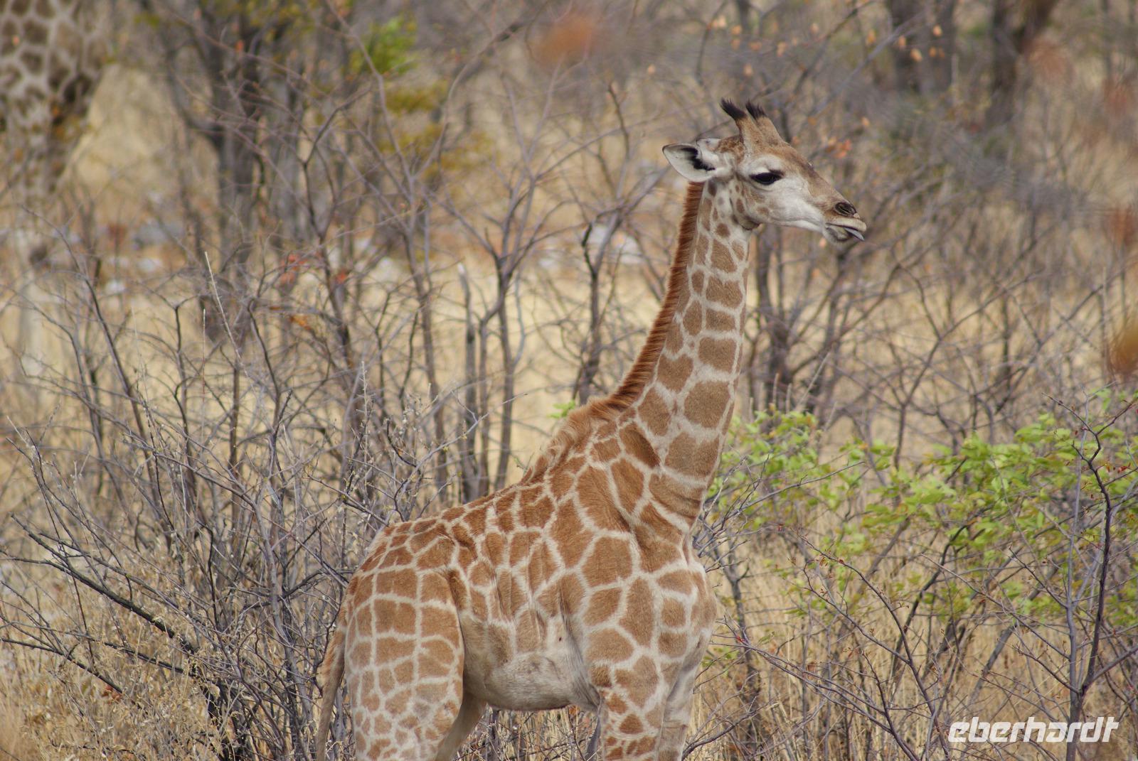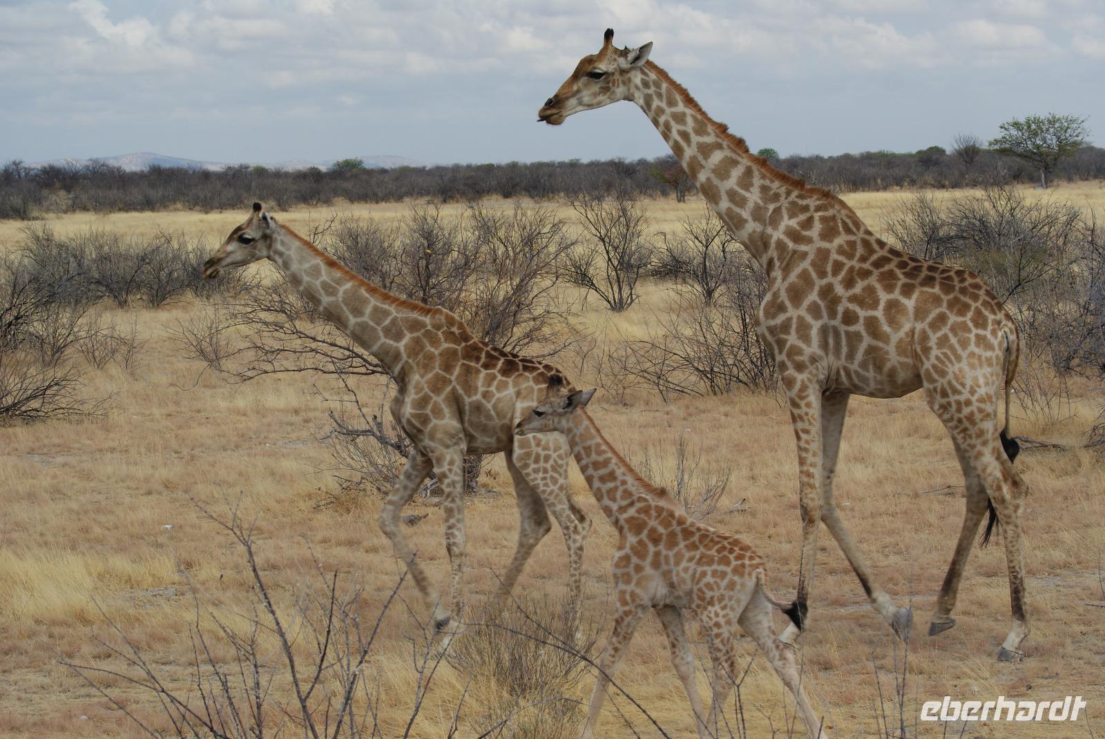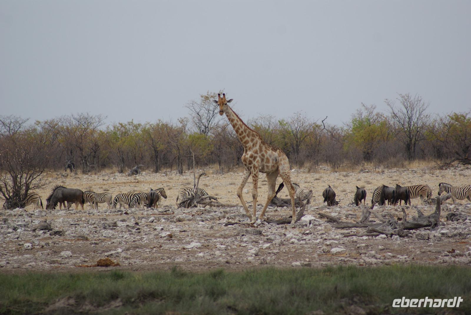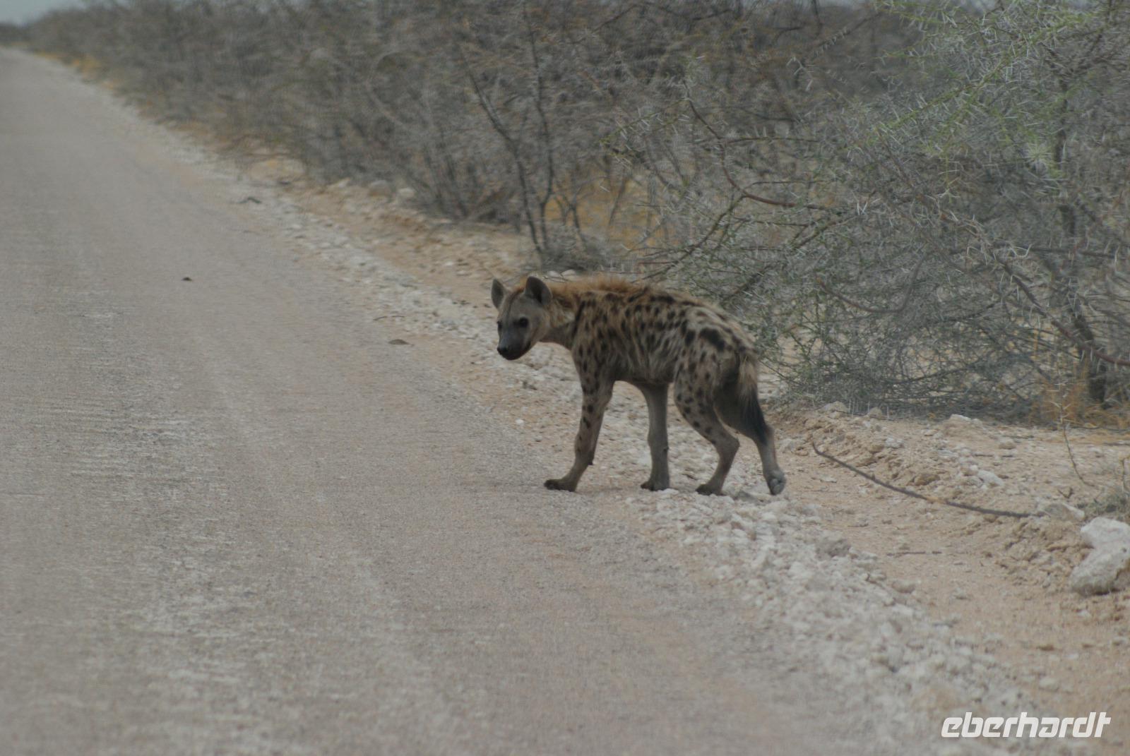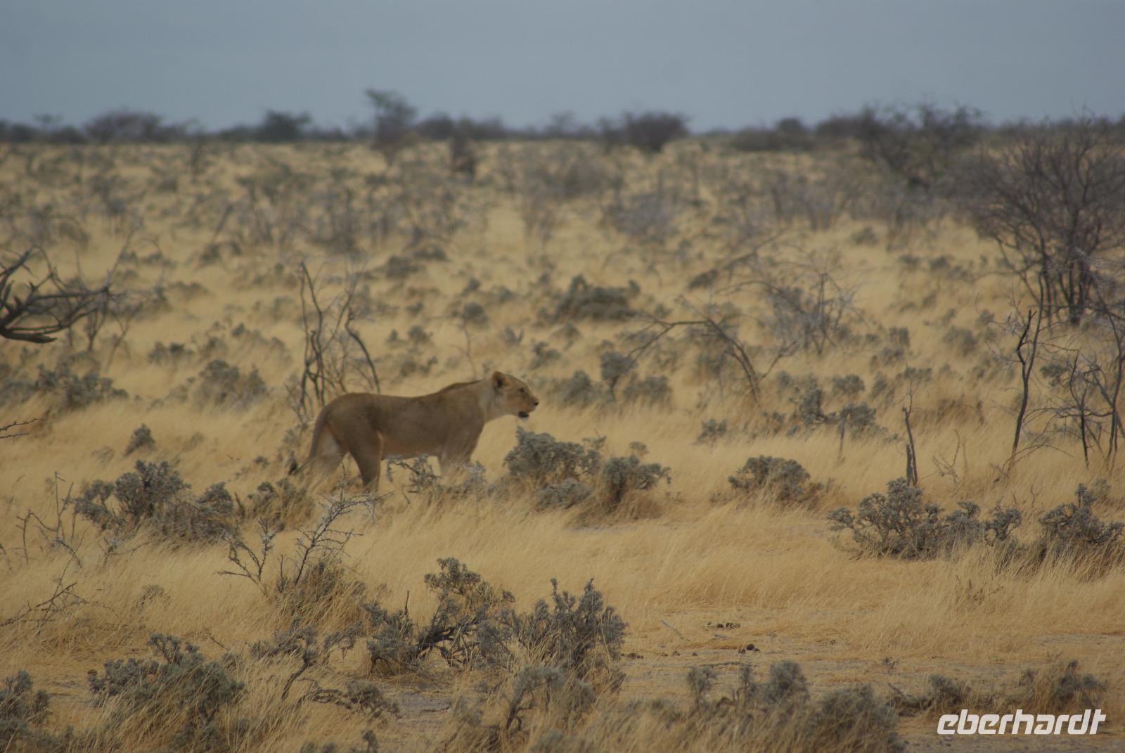 Zeitig und gut gefrühstückt verteilen wir uns auf zwei Jeeps und begeben uns auf Safari. Da der Himmel heute bewölkt ist, hoffen wir auf gute Tiersichtungen, die sich somit nicht mehr von der heißen Sonne verstecken müssen. Wir steuern verschiedene Wasserlöcher an und haben viel Glück, sehen Giraffen, eine Hyäne, eine Riesentrappe, den größten flugfähigen Vogel im südlichen Afrika, welcher bis zu 12 Kg schwer werden kann. Hocherfreut sind wir beim Anblick der fünf Löwen, die sich in keinster Weise von uns stören lassen. Kurze Zeit darauf sehen wir eine Elefantenherde mit ungefähr 20 Tieren. Haben wir ein Glück! Vor dem Mittagsstopp fahren wir vier Wasserlöcher an und können auch hier einige der verschiedenen Gattungen fotografieren. Bis dato fühlten wir uns in Namibia als ob wir das Land alleine bereisen, dies ändert sich schnell im Restcamp Halali, wo gefühlt alle Touristen auf Safari zeitgleich einfahren. Somit fällt unser Mittagsmahl eher überschaubar aus, denn wir wollen zügig unsere Pirschfahrt fortsetzen. Auch der Nachmittag bleibt sehr erfolgreich und wir werden mit einem Nashorn, weiteren Giraffen, einer Hyäne, die Siesta macht und einer großen Springbockherde belohnt. Kurz vor Ende der Safari sehen wir nochmals Löwen und Elefanten an einem Wasserloch und wir wissen gar nicht, wen wir zuerst fotografieren sollen. Am späten Nachmittag verlassen wir durch das Anderson Gate den Etosha Park und fahren zu unserer in der Nähe gelegenen Toshari Lodge. Eine wunderschöne Anlage erwartet uns und Fahrer Jonas hat uns netterweise bereits alle Koffer auf die Zimmer verteilen lassen. Ein herrliches Abendessen vom Buffet und frisch vor unseren Augen zubereitete Speisen, versüßen uns den Abend. Es schmeckt uns heute nach so viel Erlebtem besonders gut. Schnell sind wir uns einig, dass wir auch den dritten Tag Safari genießen werden und schon jetzt gespannt sind, was wir morgen vor die Linse bekommen werden.