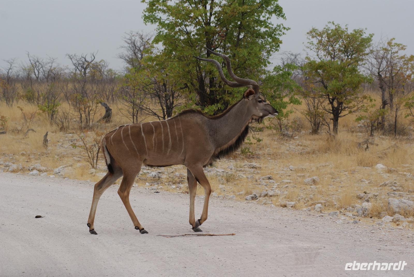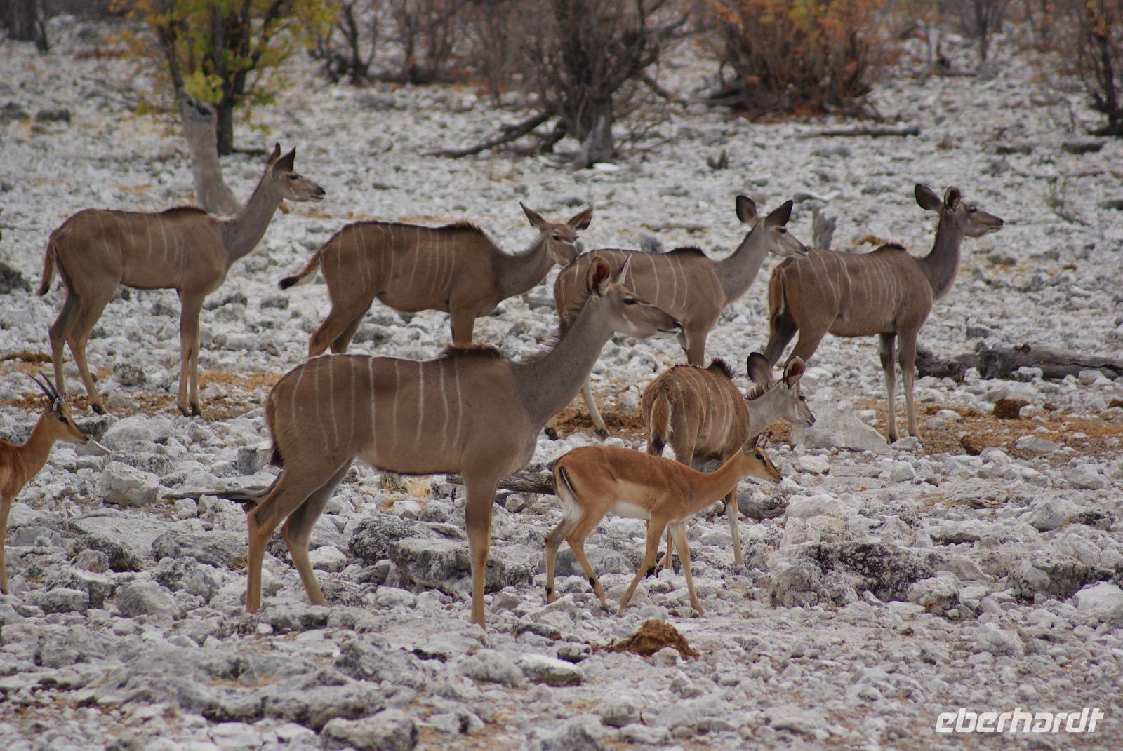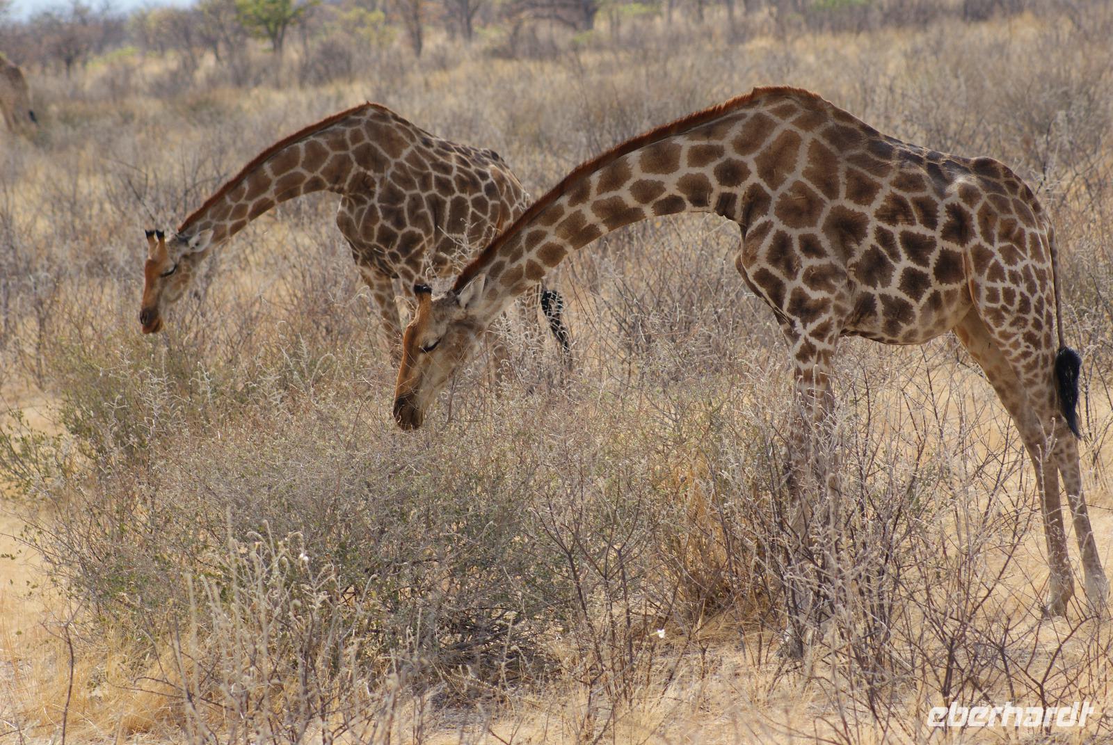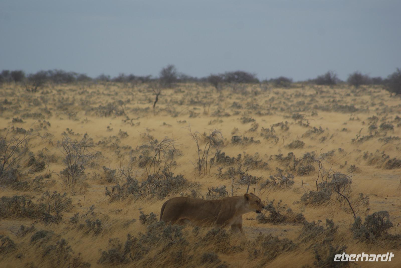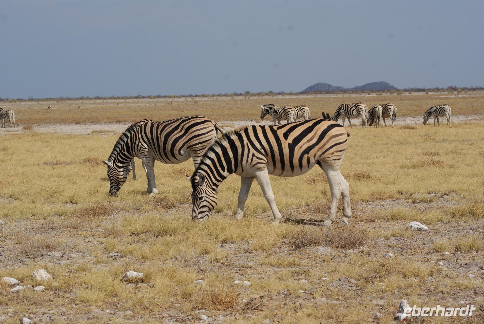 Zeitig und gut gefrühstückt verteilen wir uns auf zwei Jeeps und begeben uns auf Safari. Da der Himmel heute bewölkt ist, hoffen wir auf gute Tiersichtungen, die sich somit nicht mehr von der heißen Sonne verstecken müssen. Wir steuern verschiedene Wasserlöcher an und haben viel Glück, sehen Giraffen, eine Hyäne, eine Riesentrappe, den größten flugfähigen Vogel im südlichen Afrika, welcher bis zu 12 Kg schwer werden kann. Hocherfreut sind wir beim Anblick der fünf Löwen, die sich in keinster Weise von uns stören lassen. Kurze Zeit darauf sehen wir eine Elefantenherde mit ungefähr 20 Tieren. Haben wir ein Glück! Vor dem Mittagsstopp fahren wir vier Wasserlöcher an und können auch hier einige der verschiedenen Gattungen fotografieren. Bis dato fühlten wir uns in Namibia als ob wir das Land alleine bereisen, dies ändert sich schnell im Restcamp Halali, wo gefühlt alle Touristen auf Safari zeitgleich einfahren. Somit fällt unser Mittagsmahl eher überschaubar aus, denn wir wollen zügig unsere Pirschfahrt fortsetzen. Auch der Nachmittag bleibt sehr erfolgreich und wir werden mit einem Nashorn, weiteren Giraffen, einer Hyäne, die Siesta macht und einer großen Springbockherde belohnt. Kurz vor Ende der Safari sehen wir nochmals Löwen und Elefanten an einem Wasserloch und wir wissen gar nicht, wen wir zuerst fotografieren sollen. Am späten Nachmittag verlassen wir durch das Anderson Gate den Etosha Park und fahren zu unserer in der Nähe gelegenen Toshari Lodge. Eine wunderschöne Anlage erwartet uns und Fahrer Jonas hat uns netterweise bereits alle Koffer auf die Zimmer verteilen lassen. Ein herrliches Abendessen vom Buffet und frisch vor unseren Augen zubereitete Speisen, versüßen uns den Abend. Es schmeckt uns heute nach so viel Erlebtem besonders gut. Schnell sind wir uns einig, dass wir auch den dritten Tag Safari genießen werden und schon jetzt gespannt sind, was wir morgen vor die Linse bekommen werden.