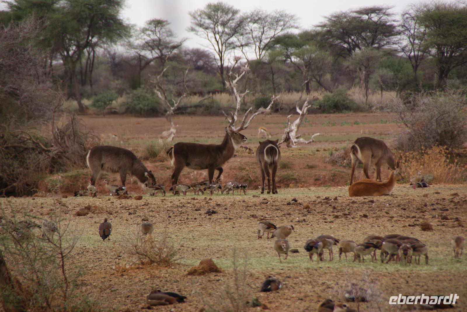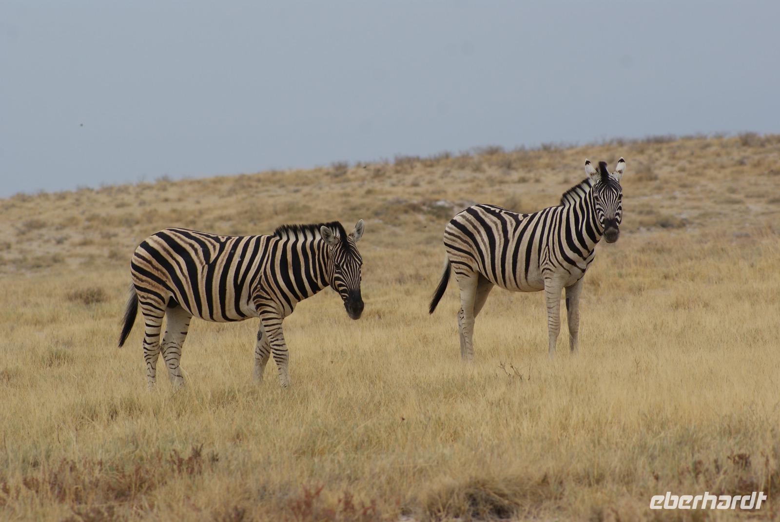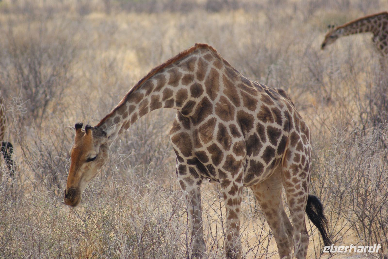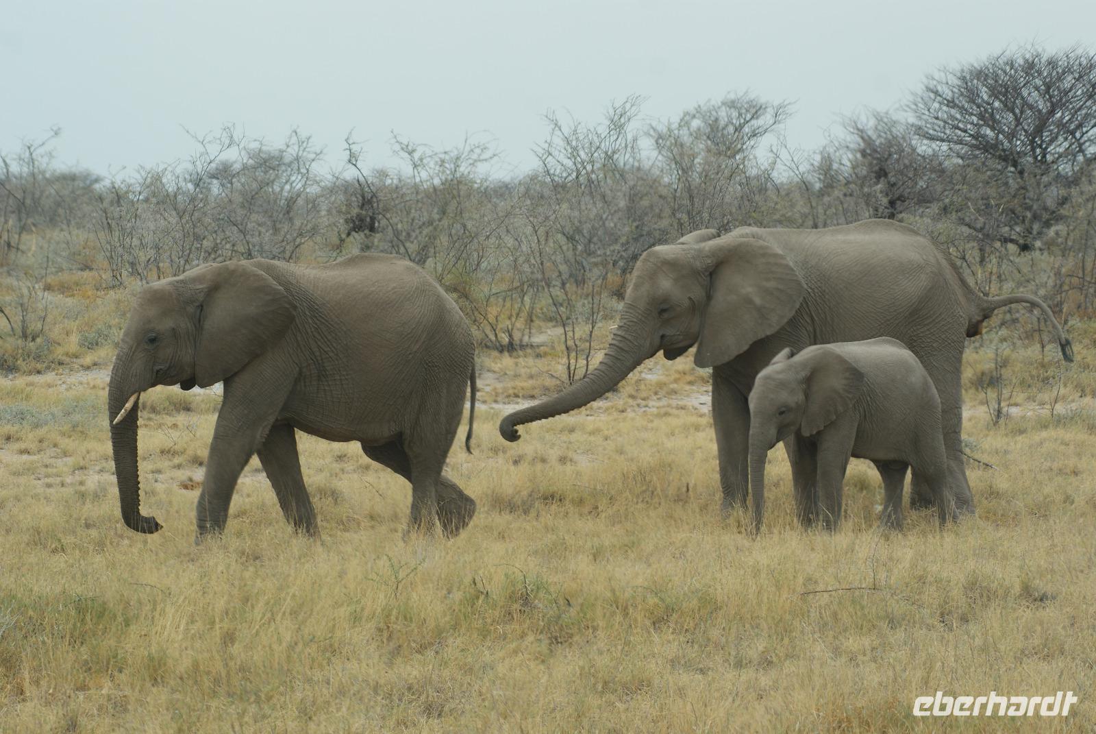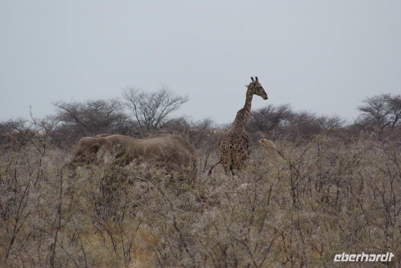 Zeitig und gut gefrühstückt verteilen wir uns auf zwei Jeeps und begeben uns auf Safari. Da der Himmel heute bewölkt ist, hoffen wir auf gute Tiersichtungen, die sich somit nicht mehr von der heißen Sonne verstecken müssen. Wir steuern verschiedene Wasserlöcher an und haben viel Glück, sehen Giraffen, eine Hyäne, eine Riesentrappe, den größten flugfähigen Vogel im südlichen Afrika, welcher bis zu 12 Kg schwer werden kann. Hocherfreut sind wir beim Anblick der fünf Löwen, die sich in keinster Weise von uns stören lassen. Kurze Zeit darauf sehen wir eine Elefantenherde mit ungefähr 20 Tieren. Haben wir ein Glück! Vor dem Mittagsstopp fahren wir vier Wasserlöcher an und können auch hier einige der verschiedenen Gattungen fotografieren. Bis dato fühlten wir uns in Namibia als ob wir das Land alleine bereisen, dies ändert sich schnell im Restcamp Halali, wo gefühlt alle Touristen auf Safari zeitgleich einfahren. Somit fällt unser Mittagsmahl eher überschaubar aus, denn wir wollen zügig unsere Pirschfahrt fortsetzen. Auch der Nachmittag bleibt sehr erfolgreich und wir werden mit einem Nashorn, weiteren Giraffen, einer Hyäne, die Siesta macht und einer großen Springbockherde belohnt. Kurz vor Ende der Safari sehen wir nochmals Löwen und Elefanten an einem Wasserloch und wir wissen gar nicht, wen wir zuerst fotografieren sollen. Am späten Nachmittag verlassen wir durch das Anderson Gate den Etosha Park und fahren zu unserer in der Nähe gelegenen Toshari Lodge. Eine wunderschöne Anlage erwartet uns und Fahrer Jonas hat uns netterweise bereits alle Koffer auf die Zimmer verteilen lassen. Ein herrliches Abendessen vom Buffet und frisch vor unseren Augen zubereitete Speisen, versüßen uns den Abend. Es schmeckt uns heute nach so viel Erlebtem besonders gut. Schnell sind wir uns einig, dass wir auch den dritten Tag Safari genießen werden und schon jetzt gespannt sind, was wir morgen vor die Linse bekommen werden.