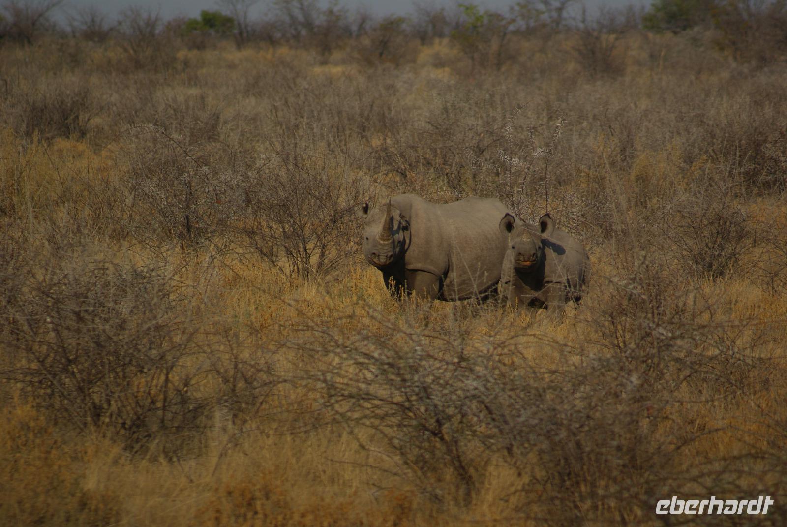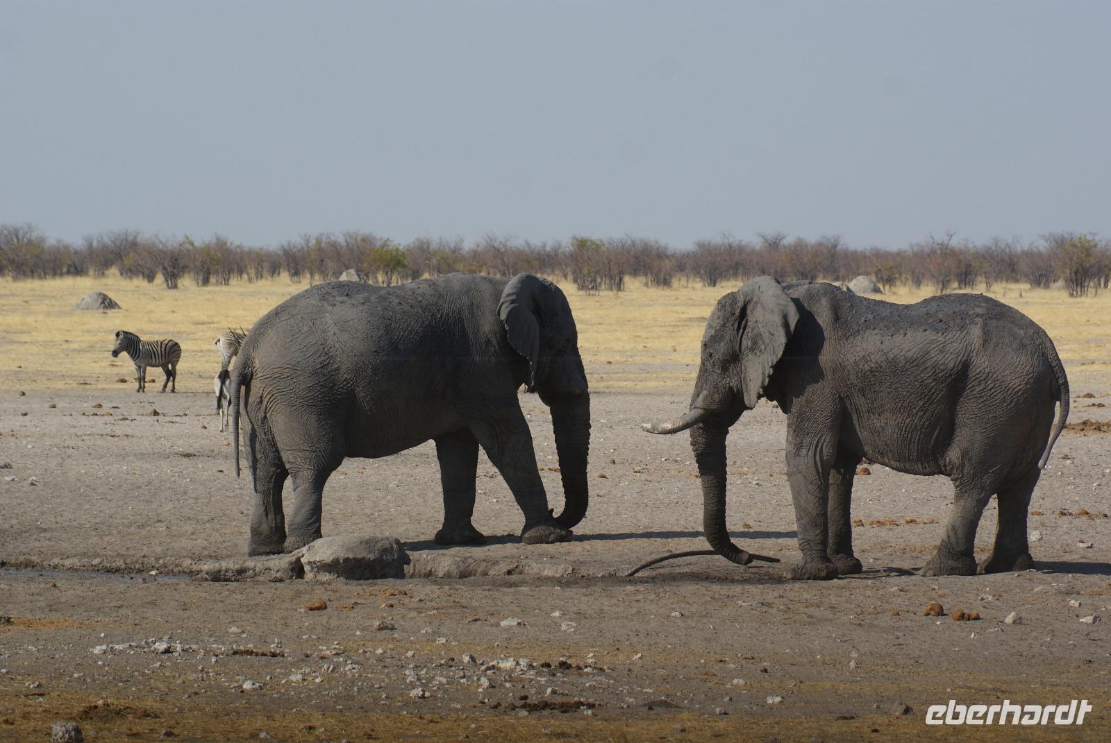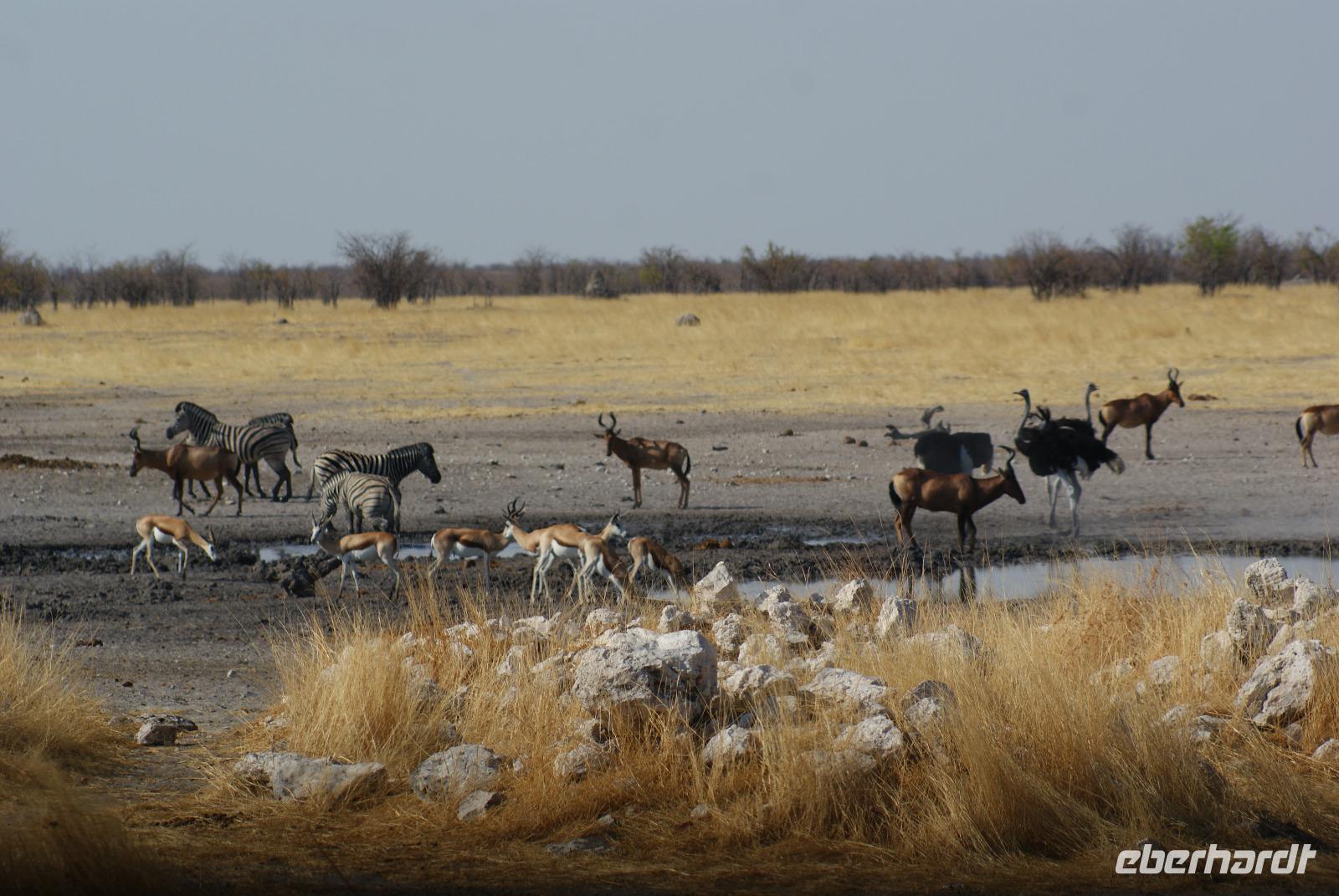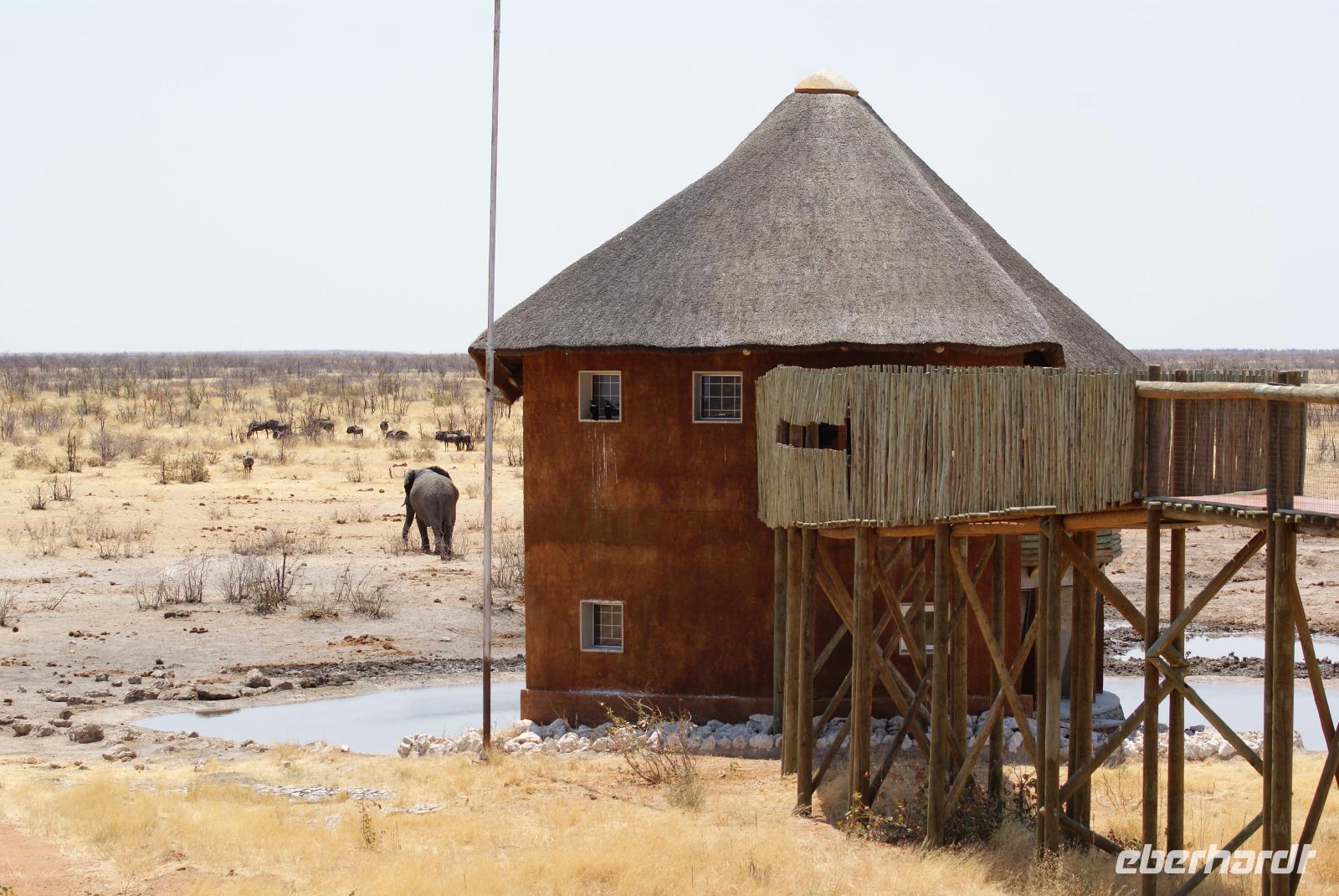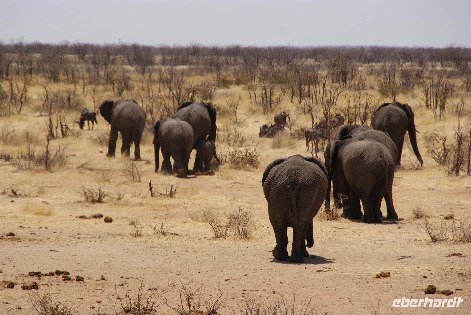 Ein letztes schönes Frühstück mit grandioser Aussicht auf die umliegenden Berge und wir brechen auf, um unser heutiges Tagesziel den Etosha Nationalpark zu erreichen. Auf der Strecke sehen wir viele Termitenhügel und hören von Dagmar, dass diese zu den Kakerlaken gehören. Ein Termitenhügel bis zu 3m hoch ist und eine konstante Temperatur von 30,1 Grad hat. Diese sind meistens Richtung Nord-Westen ausgerichtet und die Königin legt täglich bis zu 30.000 Eier. Angekommen im Etosha Nationalpark begeben wir uns auf Safari. Zunächst ist noch nicht viel zu sehen, doch dies ändert sich im Laufe des Tages gewaltig. Mittags halten wir im Camp Site Olifantsrus, welches erst 2014 errichtet wurde. Ein toller Aussichtspunkt in luftiger Höhe wurde aufgestellt und am darunter liegenden Wasserloch sehen wir eine Herde Elefanten, Gnus, Zebras und Springböcke. Am Nachmittag sehen wir bereits 4 Löwen, 2 Nashörner, endlos Elefanten, Giraffen, Gnus und Springböcke. Der erste Safaritag war bereits mehr als erfolgreich. So checken wir am frühen Abend im Okaukueijo Camp Resort ein und nach einem schmackhaften Abendessen mit etwas eigenwilligem Service finden wir uns alle am Wasserloch wieder. Hier sind bereits 3 Nashörner zum Trinken da sowie etliche Giraffen. Resümee des heutigen Tages: Elefanten, Nashörner, Löwen, Kudus, Zebras, Springböcke, Schakale, Affen, Strauße, Riesentrappe, Elefantenherden. Abends am Wasserloch genießen wir eine ganz besondere Atmosphäre bei weichem Scheinwerferlicht sehen wir Nashörner und Giraffen beim Versuch, ebenfalls einen kräftigen Schluck Wasser zu erhaschen.