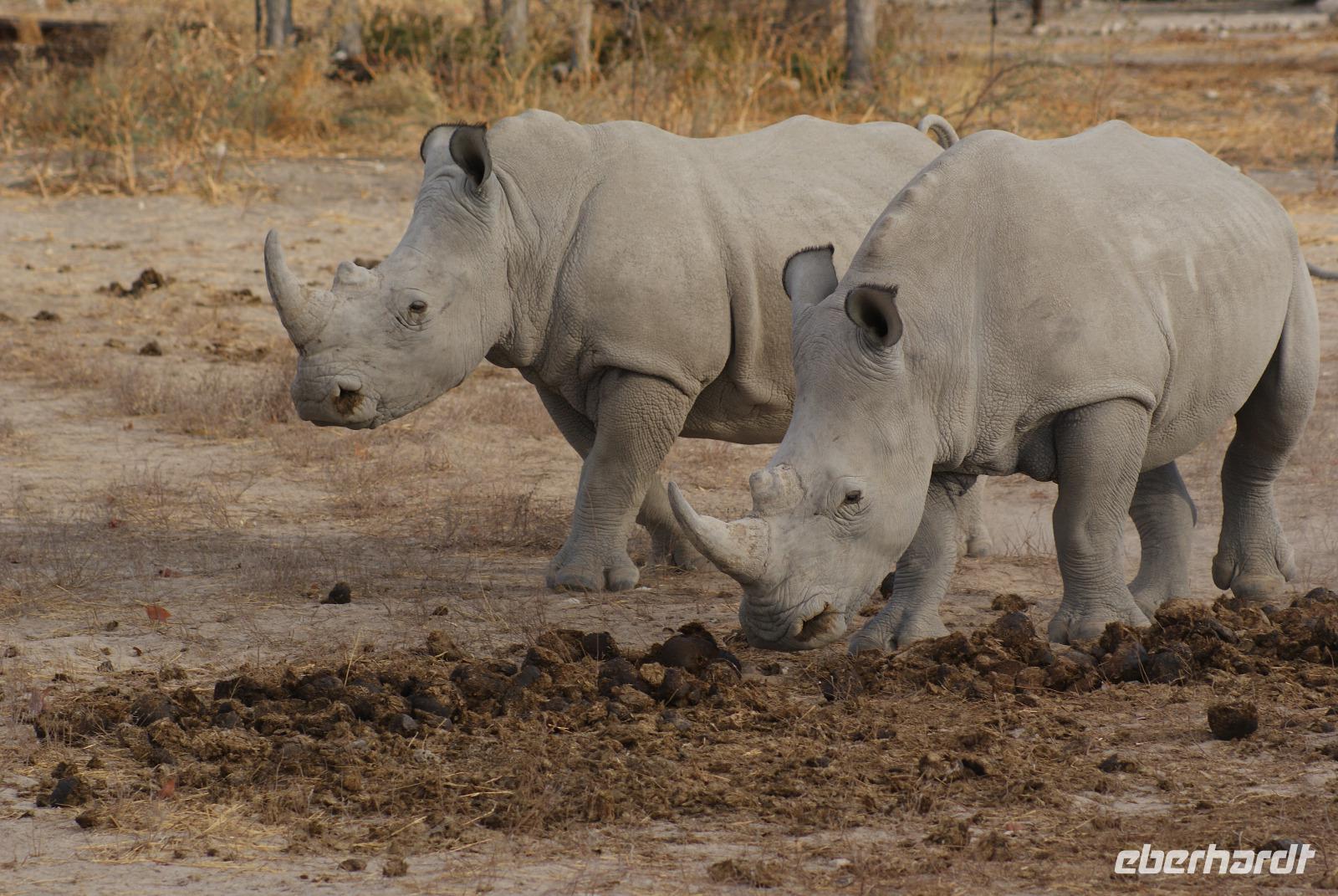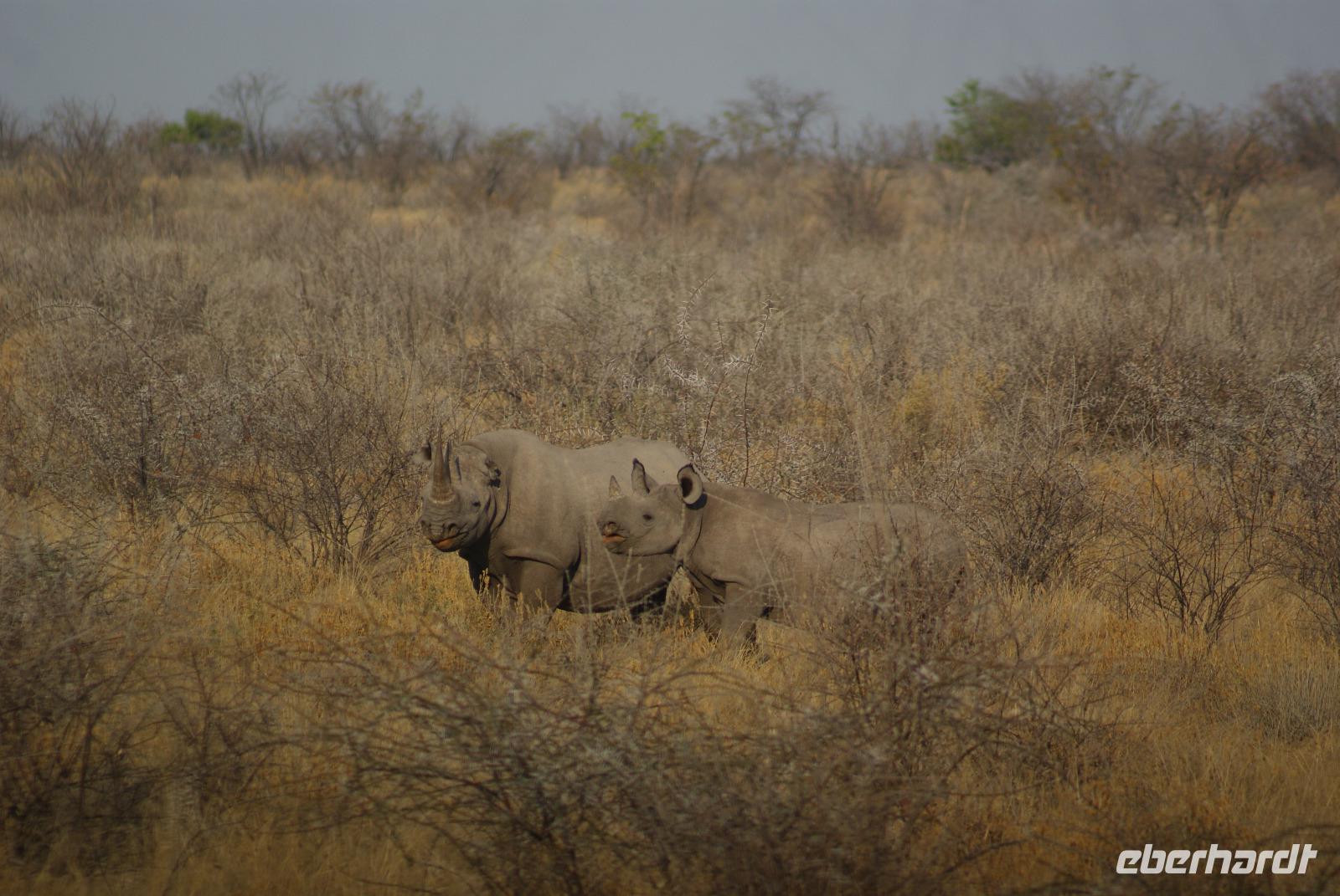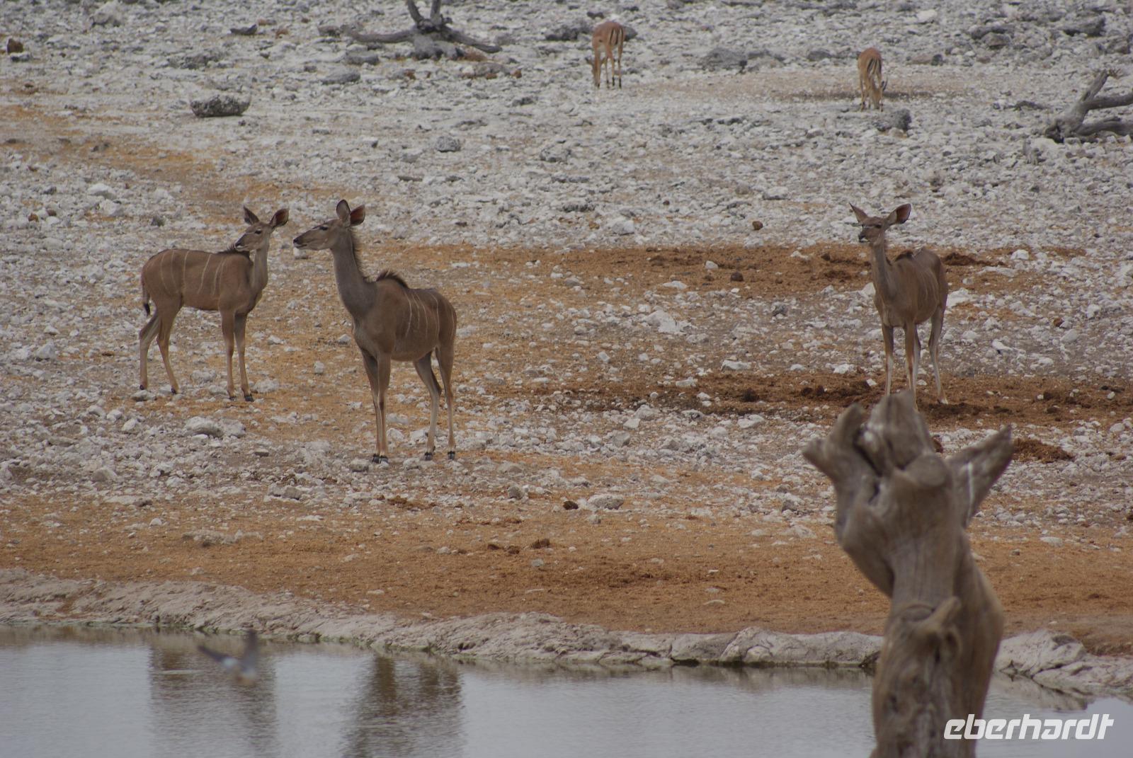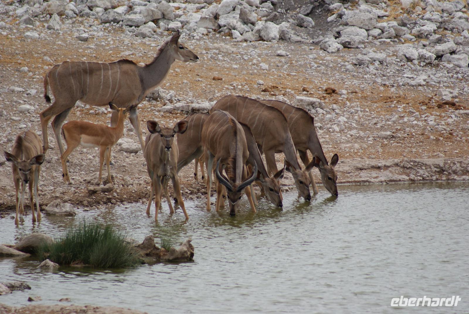 Ein letztes schönes Frühstück mit grandioser Aussicht auf die umliegenden Berge und wir brechen auf, um unser heutiges Tagesziel den Etosha Nationalpark zu erreichen. Auf der Strecke sehen wir viele Termitenhügel und hören von Dagmar, dass diese zu den Kakerlaken gehören. Ein Termitenhügel bis zu 3m hoch ist und eine konstante Temperatur von 30,1 Grad hat. Diese sind meistens Richtung Nord-Westen ausgerichtet und die Königin legt täglich bis zu 30.000 Eier. Angekommen im Etosha Nationalpark begeben wir uns auf Safari. Zunächst ist noch nicht viel zu sehen, doch dies ändert sich im Laufe des Tages gewaltig. Mittags halten wir im Camp Site Olifantsrus, welches erst 2014 errichtet wurde. Ein toller Aussichtspunkt in luftiger Höhe wurde aufgestellt und am darunter liegenden Wasserloch sehen wir eine Herde Elefanten, Gnus, Zebras und Springböcke. Am Nachmittag sehen wir bereits 4 Löwen, 2 Nashörner, endlos Elefanten, Giraffen, Gnus und Springböcke. Der erste Safaritag war bereits mehr als erfolgreich. So checken wir am frühen Abend im Okaukueijo Camp Resort ein und nach einem schmackhaften Abendessen mit etwas eigenwilligem Service finden wir uns alle am Wasserloch wieder. Hier sind bereits 3 Nashörner zum Trinken da sowie etliche Giraffen. Resümee des heutigen Tages: Elefanten, Nashörner, Löwen, Kudus, Zebras, Springböcke, Schakale, Affen, Strauße, Riesentrappe, Elefantenherden. Abends am Wasserloch genießen wir eine ganz besondere Atmosphäre bei weichem Scheinwerferlicht sehen wir Nashörner und Giraffen beim Versuch, ebenfalls einen kräftigen Schluck Wasser zu erhaschen.