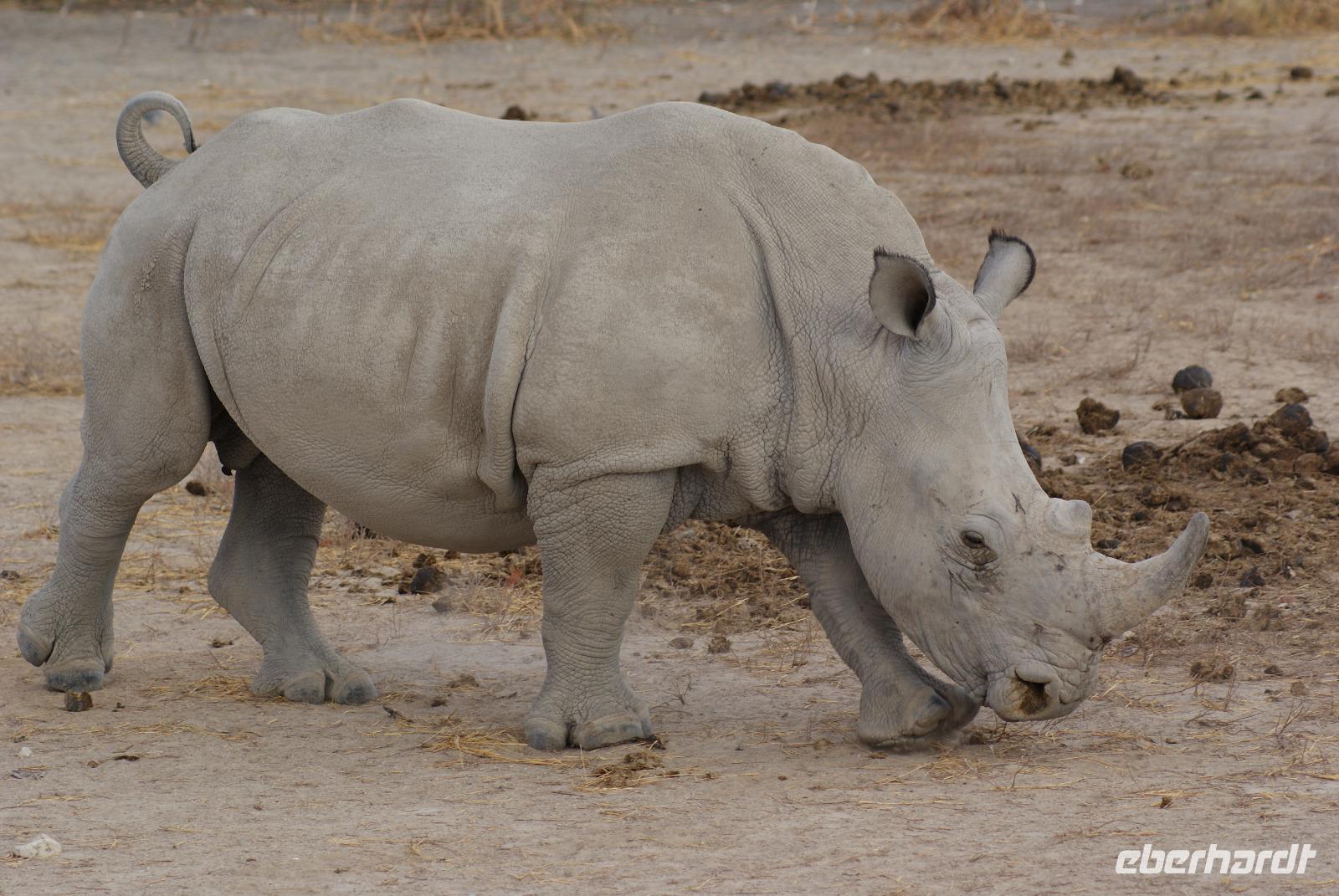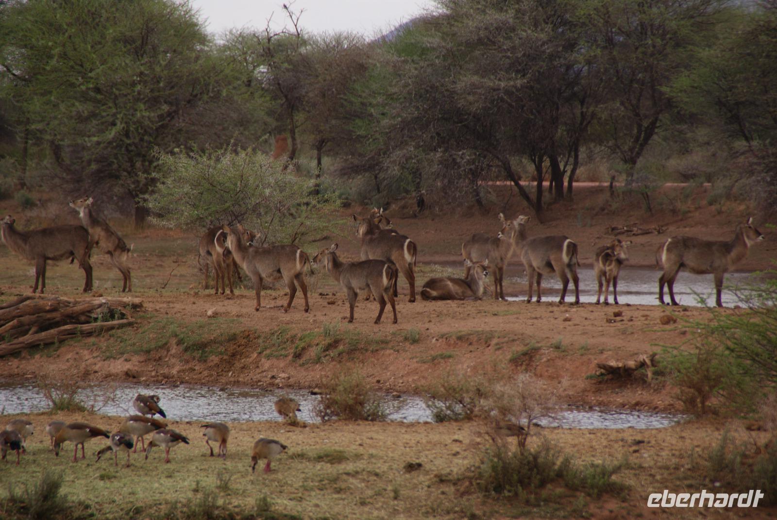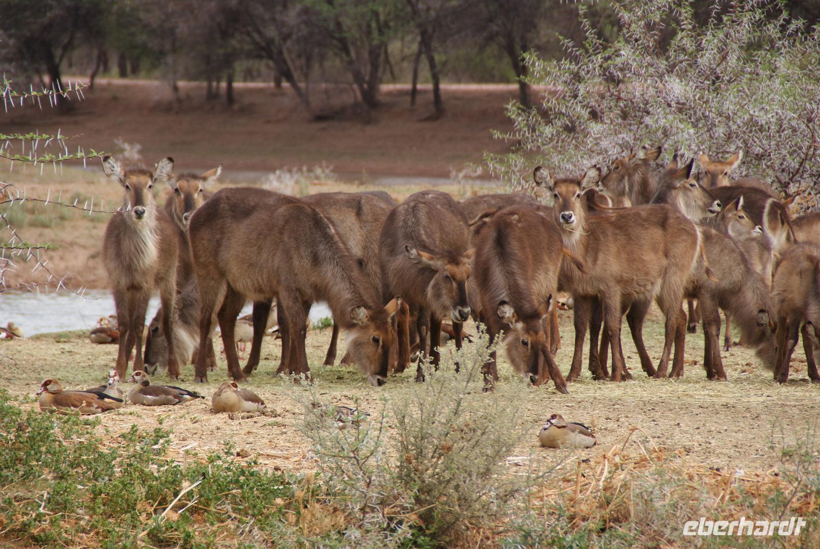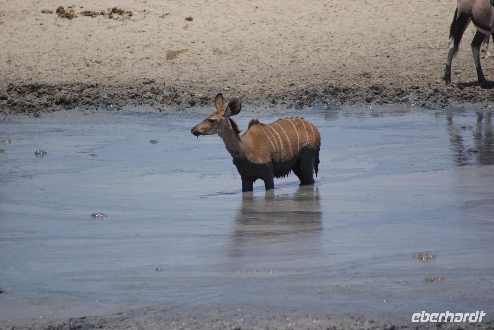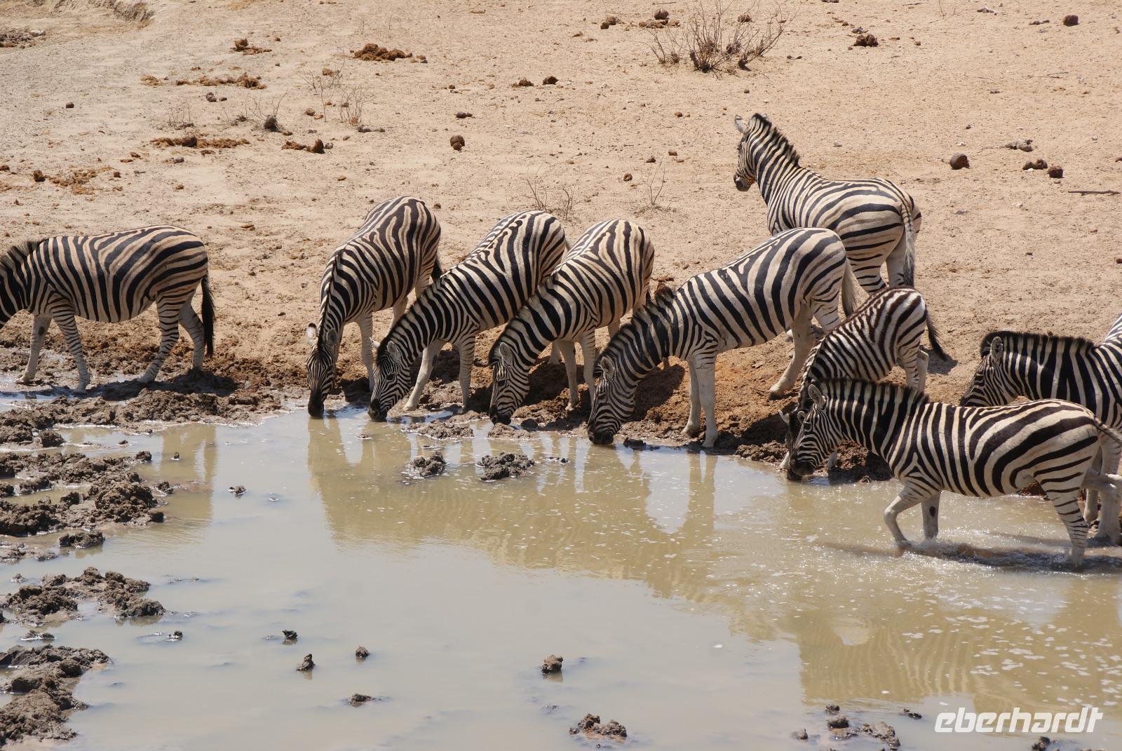 Ein letztes schönes Frühstück mit grandioser Aussicht auf die umliegenden Berge und wir brechen auf, um unser heutiges Tagesziel den Etosha Nationalpark zu erreichen. Auf der Strecke sehen wir viele Termitenhügel und hören von Dagmar, dass diese zu den Kakerlaken gehören. Ein Termitenhügel bis zu 3m hoch ist und eine konstante Temperatur von 30,1 Grad hat. Diese sind meistens Richtung Nord-Westen ausgerichtet und die Königin legt täglich bis zu 30.000 Eier. Angekommen im Etosha Nationalpark begeben wir uns auf Safari. Zunächst ist noch nicht viel zu sehen, doch dies ändert sich im Laufe des Tages gewaltig. Mittags halten wir im Camp Site Olifantsrus, welches erst 2014 errichtet wurde. Ein toller Aussichtspunkt in luftiger Höhe wurde aufgestellt und am darunter liegenden Wasserloch sehen wir eine Herde Elefanten, Gnus, Zebras und Springböcke. Am Nachmittag sehen wir bereits 4 Löwen, 2 Nashörner, endlos Elefanten, Giraffen, Gnus und Springböcke. Der erste Safaritag war bereits mehr als erfolgreich. So checken wir am frühen Abend im Okaukueijo Camp Resort ein und nach einem schmackhaften Abendessen mit etwas eigenwilligem Service finden wir uns alle am Wasserloch wieder. Hier sind bereits 3 Nashörner zum Trinken da sowie etliche Giraffen. Resümee des heutigen Tages: Elefanten, Nashörner, Löwen, Kudus, Zebras, Springböcke, Schakale, Affen, Strauße, Riesentrappe, Elefantenherden. Abends am Wasserloch genießen wir eine ganz besondere Atmosphäre bei weichem Scheinwerferlicht sehen wir Nashörner und Giraffen beim Versuch, ebenfalls einen kräftigen Schluck Wasser zu erhaschen.