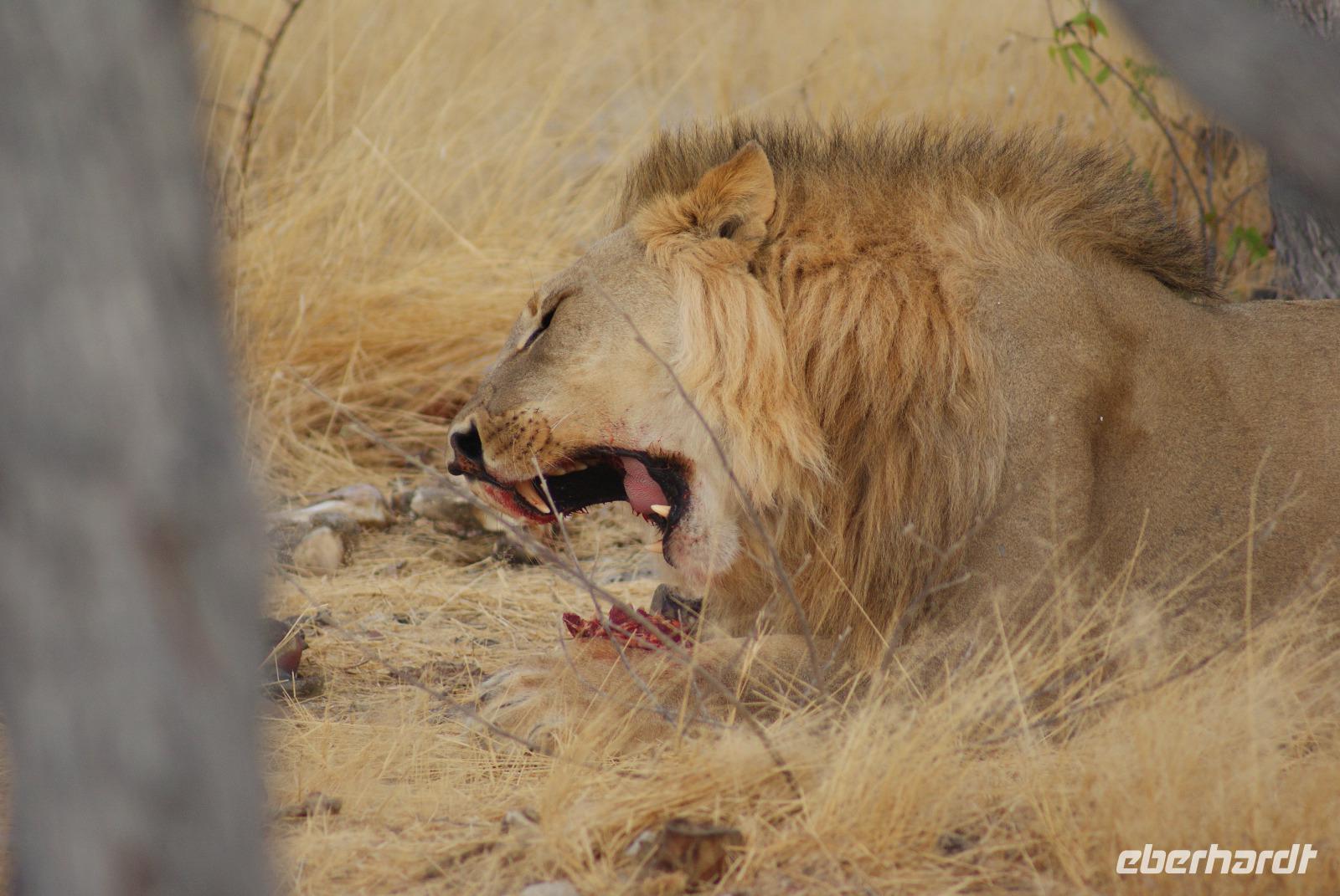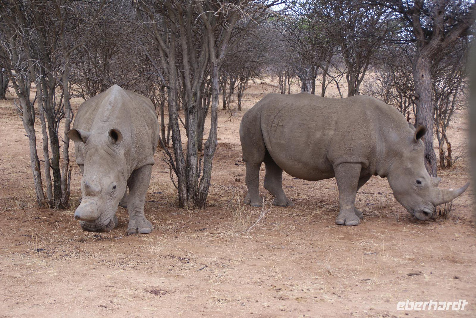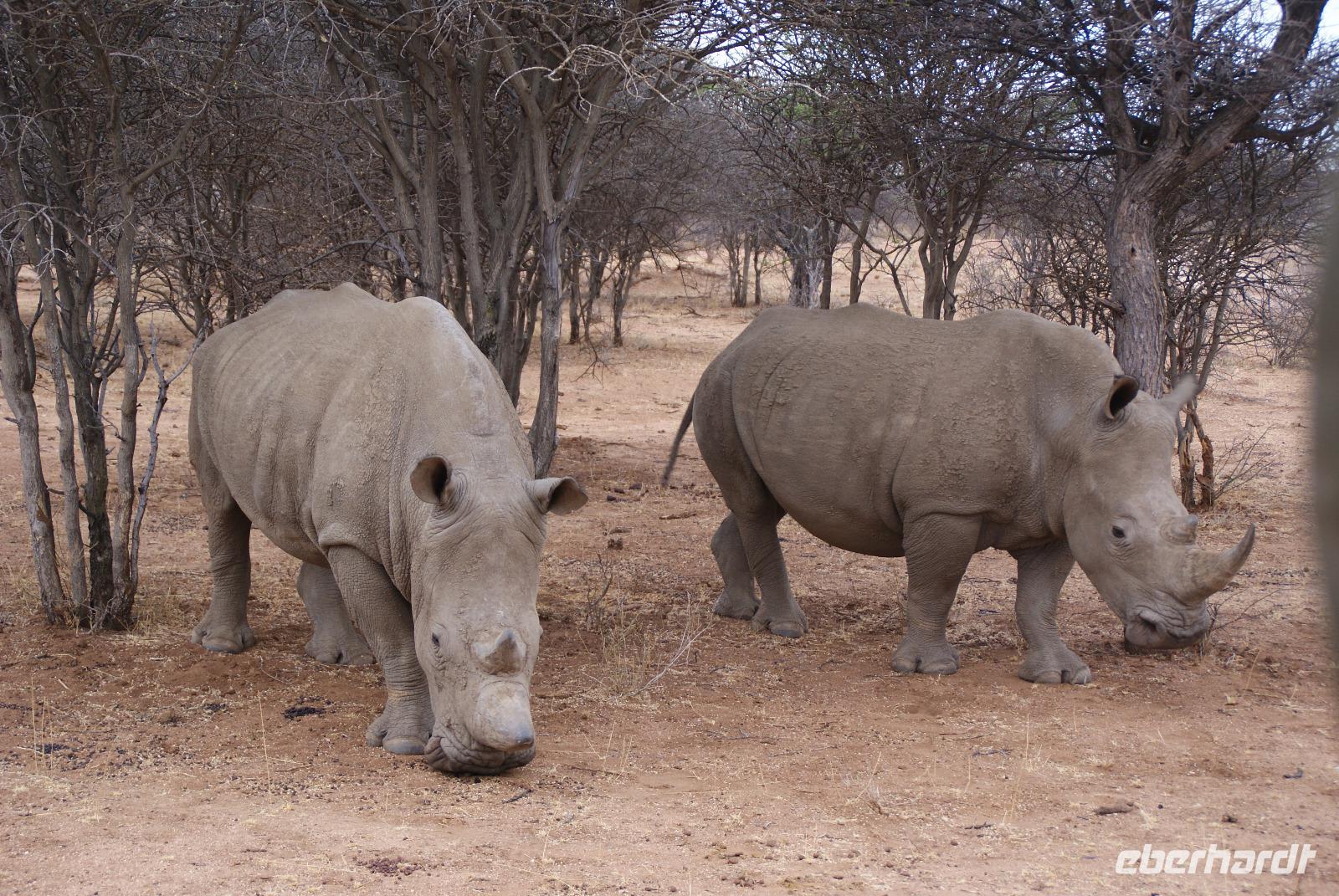 Erneut bestens geschlafen und dank Klimaanlage und Peaceful Sleep von den Mücken verschont, treffen wir uns zu einem leckeren Frühstück wieder. Wir verlassen die schöne Lodge und halten zunächst in Outjo (kleiner Hügel) mit 7000 Einwohnern und auf 1400m Höhe gelegen. Dieses schöne Kleinstädtchen lädt zum Verweilen ein. So zieht es uns in den schönen Souvenirladen und danach ins Farmhaus, welches von einer Einheimischen geführt wird, die lange in der Schweiz gelebt hat. Somit gibt es hier tollen Kuchen und Torten und wir lassen uns eine leckere Kaffeespezialität nicht entgehen. Gemütlich im Biergarten im Innenhof sitzend könnten wir es noch lange aushalten. Doch die Reise geht weiter. Otjiwarongo (=hübsches Dorf oder „oder da, wo die Rinder fett werden") erwartet uns. Auch hier haben wir einen kurzen Aufenthalt und lassen das städtische Treiben auf uns wirken. Ein kurzer Halt am alten Bahnhof gibt uns die Gelegenheit, die alte Dampflok aus vergangenen Tagen zu fotografieren, die einst in Kassel/Deutschland gebaut wurde. Wir befinden uns nun in der Region, die als Welthauptstadt der Geparden bekannt ist, wobei es leider in ganz Namibia nur noch 2500 Exemplare gibt. Unsere Reiseleitung berichtet, dass Geparden tagaktive Tiere sind, welches man auch an den schwarzen Streifen im Gesicht erkennen kann. Diese dienen als Sonnenabweiser, so dass die Tiere weniger geblendet werden. Löwen und Leoparden hingegen sind nachtaktiv und haben somit helle Streifen unter den Augen, welche das Mondlicht gut reflektieren und den Tieren nachts eine bessere Sicht bieten. Des Weiteren hören wir, dass ein Gepard auf kurzer Strecke bis zu 120 Km/h schnell werden kann. Ein Löwe hingegen bringt es auf „nur" 80 Km/h und ein Leopard auf „nur" 40 Km/h. Wieder was gelernt!! Die Reise führt uns zweiter am Wasserberg Plateau entlang und wir sichten in der Ferne die Omatakoberge, die bei den Einheimischen „Poberge" aufgrund ihrer Form genannt werden. Gegen Mittag erreichen wir die wunderschöne Mount Etjo (= Zufluchtsort) und werden mit einem kühlen Getränk empfangen. An Nachmittag sind wir alle von der Lodge zu Kaffee und Kuchen eingeladen, welch netter Service! Anschließend begeben wir uns auf eine letzte drei-stündige Pirschfahrt über das 45.000 Hektar große Okonjati Wildreservat. Im offenen Wagen genießen wir die Fahrt über das schöne Gelände und haben eine traumhafte Aussicht mit endlosen Fotomotiven. Natürlich sehen wir auch hier viele Tiere u.a. Schlangenadler, Weißrückengeier, Rotbauchwürger, Giraffen, Warzenschweine, Kudus, Impalas, Springböcke, etc. Als absolutes Highlight sehen wir zwei Nashörner, in deren Nähe wir bis auf wenige Meter kommen können. Einfach nur beeindruckend, diese schönen Geschöpfe einmal so nah erleben zu dürfen. Vorbei an Butterbäumen und so manchem Ohrfeigenbaum machen wir uns auf den Rückweg. Schaffen es so gerade noch vor dem Einsetzen eines (ersten) kräftigen Regens und anschließendem Gewitter trocken zur Lodge zurück zu kehren. Wir beenden den erlebnisreichen Tag mit einem leckeren Abendessen in der Boma (einem Rundhaus mit Feuerstelle) in gemütlicher Runde. Verwöhnt werden wir von den Köchen mit frisch vor Ort gegrillten Fleischspezialitäten. Die Mutigen von uns fahren anschließend noch zu der beeindruckenden von der Lodge angebotenen nächtlichen Löwenfütterung und befinden sich bald Auge um Auge mit der hungrigen Meute, die ebenso genüsslich ein Stück Giraffe verspeist.