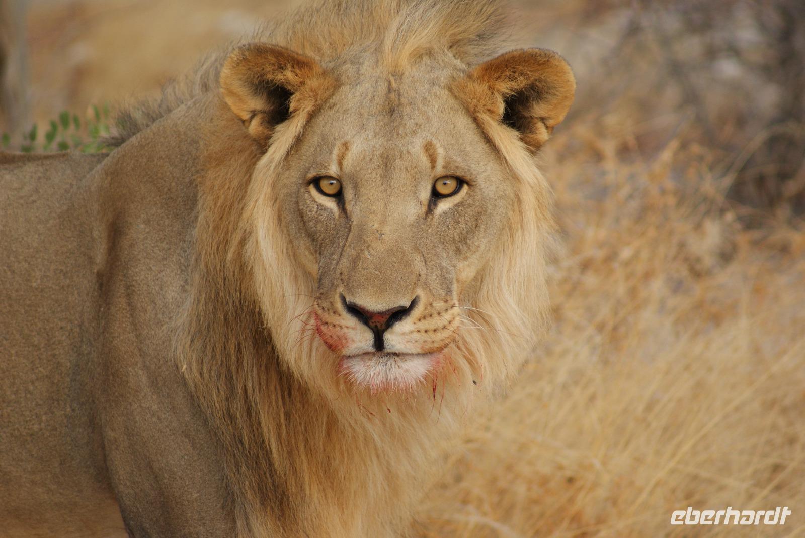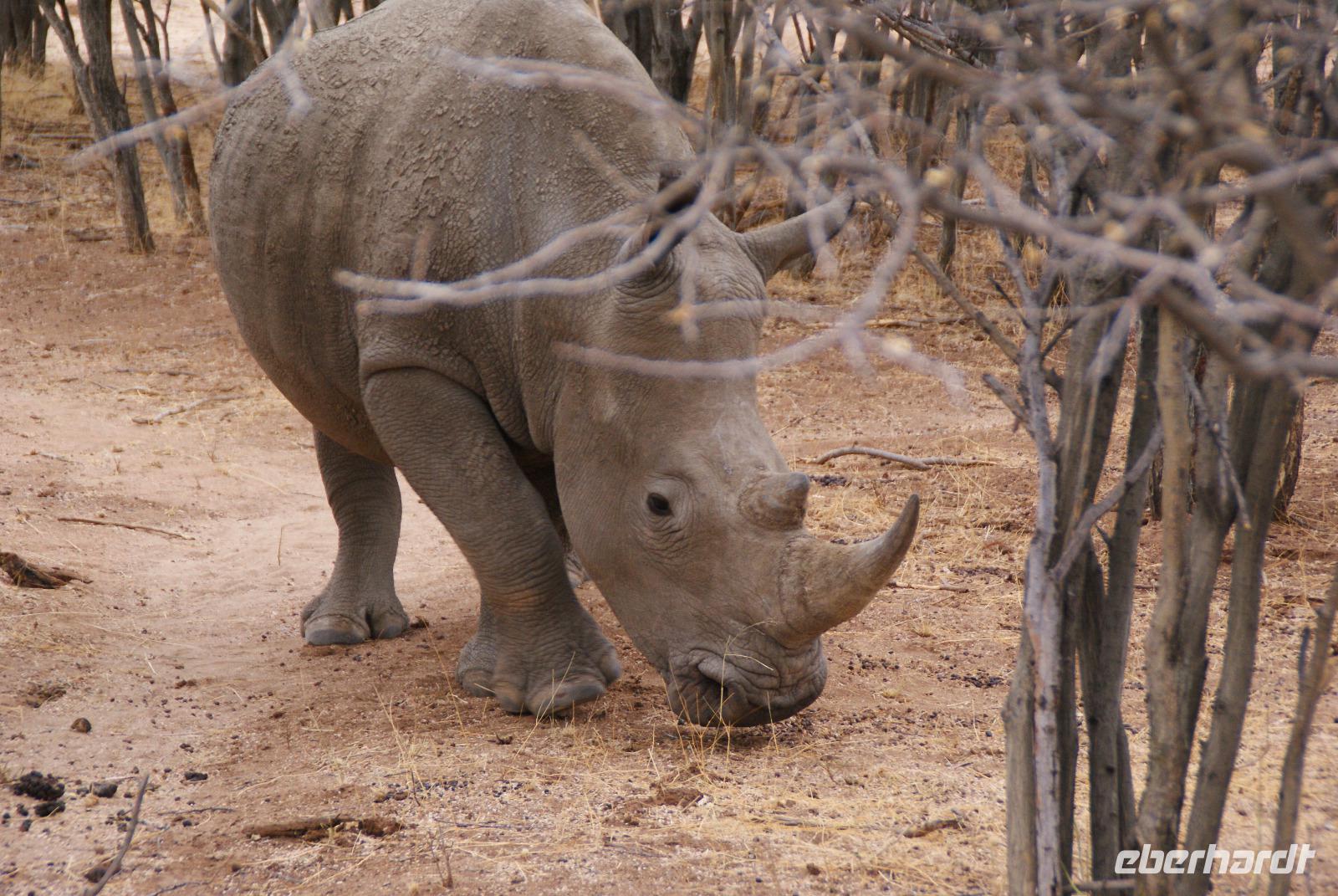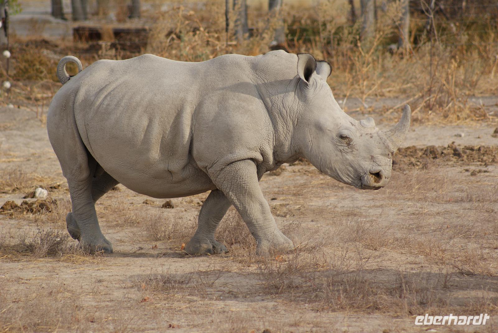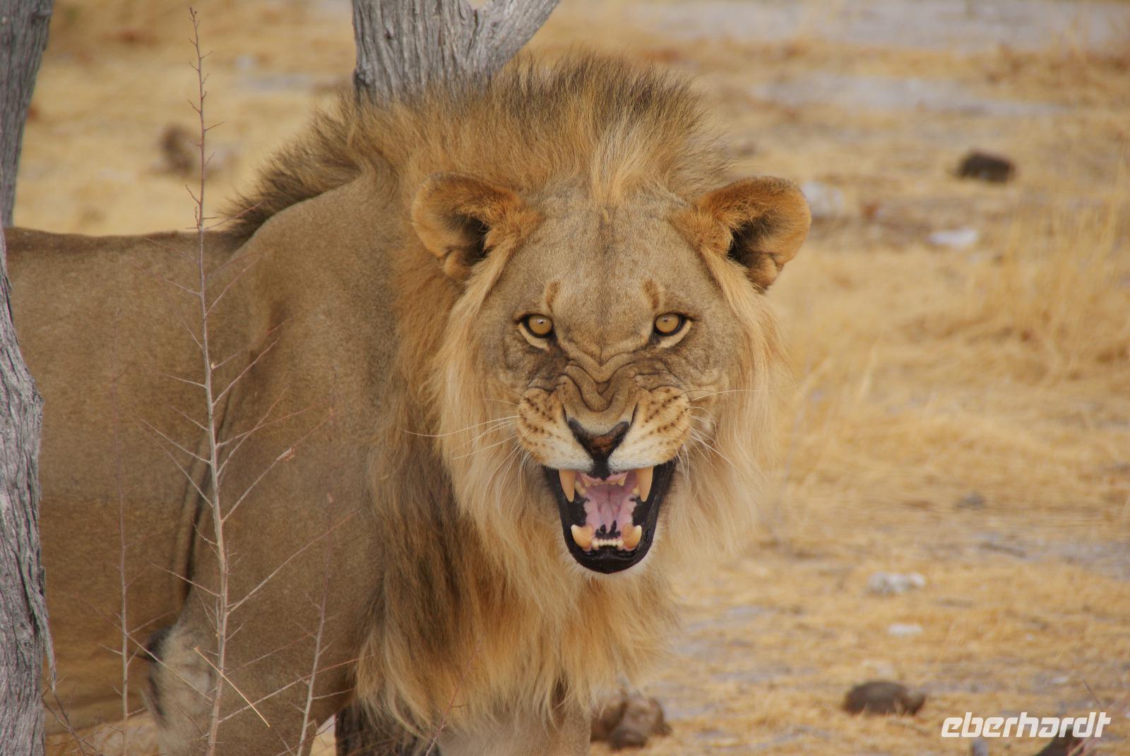 Erneut bestens geschlafen und dank Klimaanlage und Peaceful Sleep von den Mücken verschont, treffen wir uns zu einem leckeren Frühstück wieder. Wir verlassen die schöne Lodge und halten zunächst in Outjo (kleiner Hügel) mit 7000 Einwohnern und auf 1400m Höhe gelegen. Dieses schöne Kleinstädtchen lädt zum Verweilen ein. So zieht es uns in den schönen Souvenirladen und danach ins Farmhaus, welches von einer Einheimischen geführt wird, die lange in der Schweiz gelebt hat. Somit gibt es hier tollen Kuchen und Torten und wir lassen uns eine leckere Kaffeespezialität nicht entgehen. Gemütlich im Biergarten im Innenhof sitzend könnten wir es noch lange aushalten. Doch die Reise geht weiter. Otjiwarongo (=hübsches Dorf oder „oder da, wo die Rinder fett werden") erwartet uns. Auch hier haben wir einen kurzen Aufenthalt und lassen das städtische Treiben auf uns wirken. Ein kurzer Halt am alten Bahnhof gibt uns die Gelegenheit, die alte Dampflok aus vergangenen Tagen zu fotografieren, die einst in Kassel/Deutschland gebaut wurde. Wir befinden uns nun in der Region, die als Welthauptstadt der Geparden bekannt ist, wobei es leider in ganz Namibia nur noch 2500 Exemplare gibt. Unsere Reiseleitung berichtet, dass Geparden tagaktive Tiere sind, welches man auch an den schwarzen Streifen im Gesicht erkennen kann. Diese dienen als Sonnenabweiser, so dass die Tiere weniger geblendet werden. Löwen und Leoparden hingegen sind nachtaktiv und haben somit helle Streifen unter den Augen, welche das Mondlicht gut reflektieren und den Tieren nachts eine bessere Sicht bieten. Des Weiteren hören wir, dass ein Gepard auf kurzer Strecke bis zu 120 Km/h schnell werden kann. Ein Löwe hingegen bringt es auf „nur" 80 Km/h und ein Leopard auf „nur" 40 Km/h. Wieder was gelernt!! Die Reise führt uns zweiter am Wasserberg Plateau entlang und wir sichten in der Ferne die Omatakoberge, die bei den Einheimischen „Poberge" aufgrund ihrer Form genannt werden. Gegen Mittag erreichen wir die wunderschöne Mount Etjo (= Zufluchtsort) und werden mit einem kühlen Getränk empfangen. An Nachmittag sind wir alle von der Lodge zu Kaffee und Kuchen eingeladen, welch netter Service! Anschließend begeben wir uns auf eine letzte drei-stündige Pirschfahrt über das 45.000 Hektar große Okonjati Wildreservat. Im offenen Wagen genießen wir die Fahrt über das schöne Gelände und haben eine traumhafte Aussicht mit endlosen Fotomotiven. Natürlich sehen wir auch hier viele Tiere u.a. Schlangenadler, Weißrückengeier, Rotbauchwürger, Giraffen, Warzenschweine, Kudus, Impalas, Springböcke, etc. Als absolutes Highlight sehen wir zwei Nashörner, in deren Nähe wir bis auf wenige Meter kommen können. Einfach nur beeindruckend, diese schönen Geschöpfe einmal so nah erleben zu dürfen. Vorbei an Butterbäumen und so manchem Ohrfeigenbaum machen wir uns auf den Rückweg. Schaffen es so gerade noch vor dem Einsetzen eines (ersten) kräftigen Regens und anschließendem Gewitter trocken zur Lodge zurück zu kehren. Wir beenden den erlebnisreichen Tag mit einem leckeren Abendessen in der Boma (einem Rundhaus mit Feuerstelle) in gemütlicher Runde. Verwöhnt werden wir von den Köchen mit frisch vor Ort gegrillten Fleischspezialitäten. Die Mutigen von uns fahren anschließend noch zu der beeindruckenden von der Lodge angebotenen nächtlichen Löwenfütterung und befinden sich bald Auge um Auge mit der hungrigen Meute, die ebenso genüsslich ein Stück Giraffe verspeist.