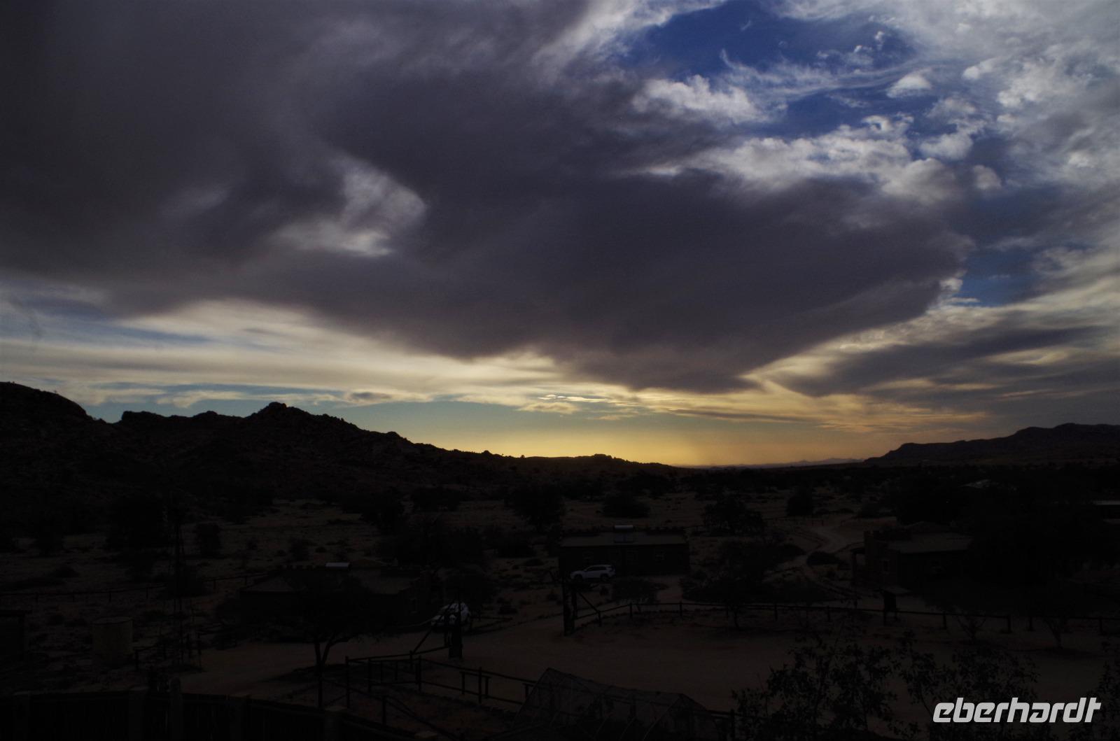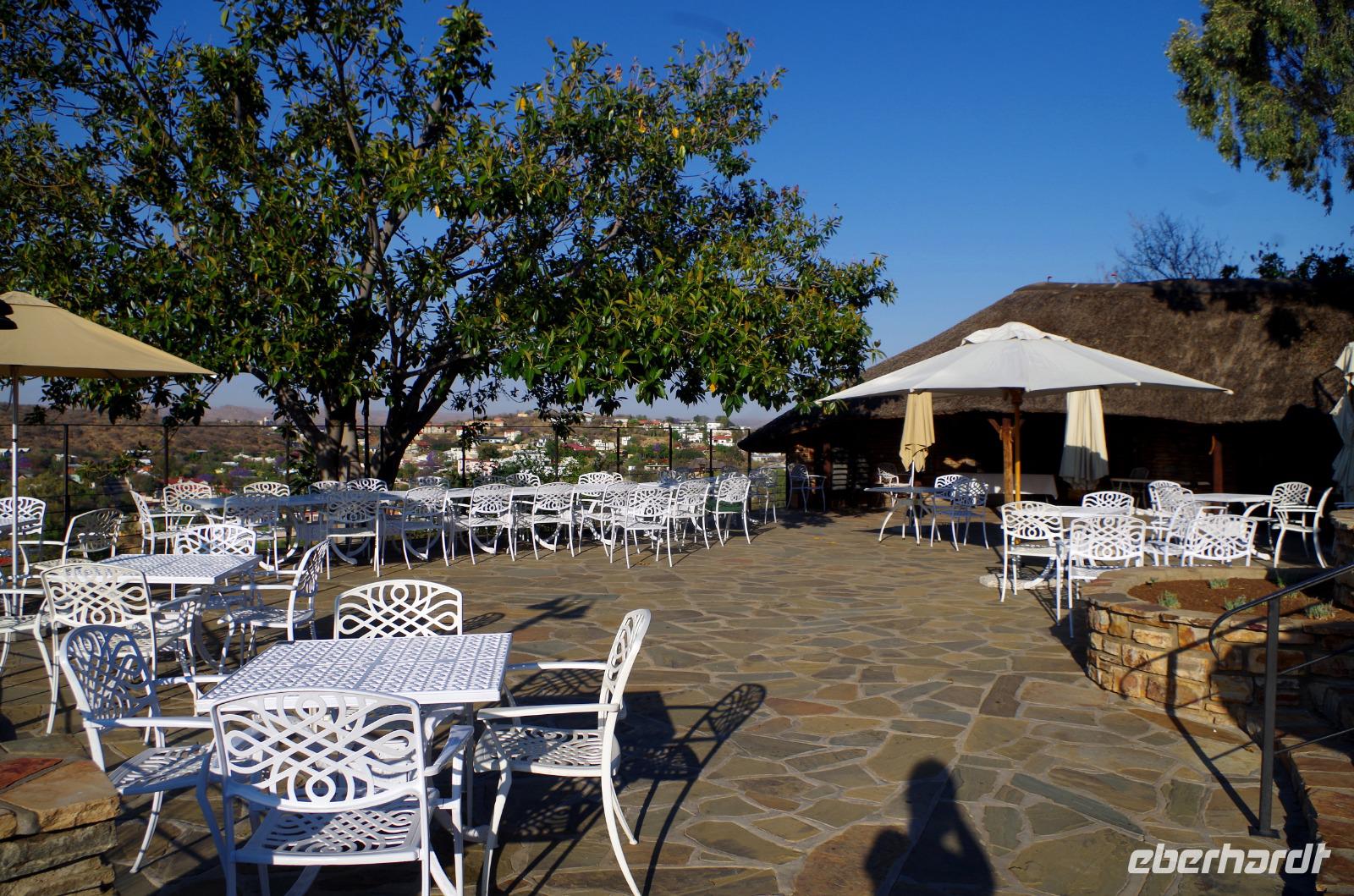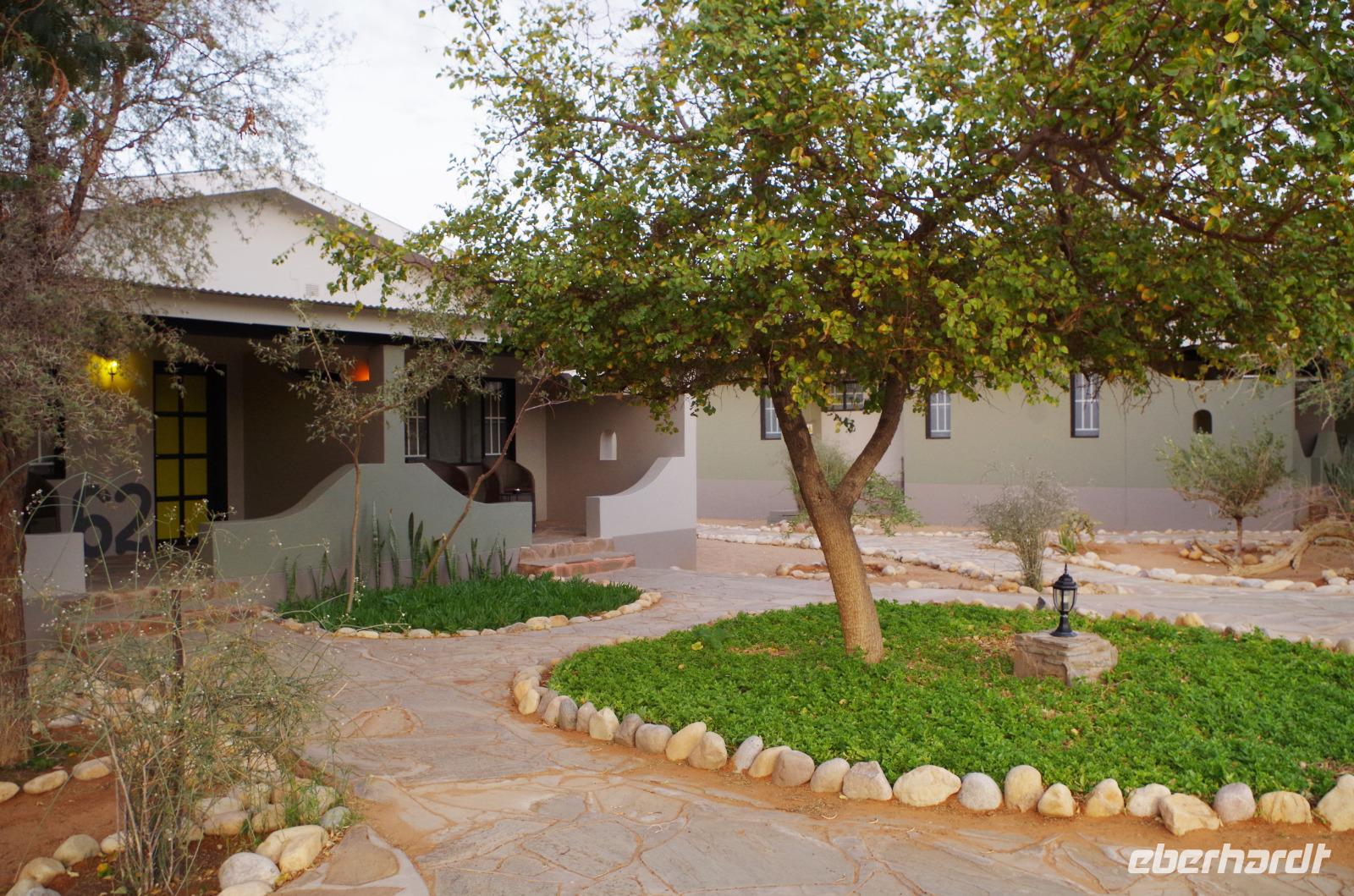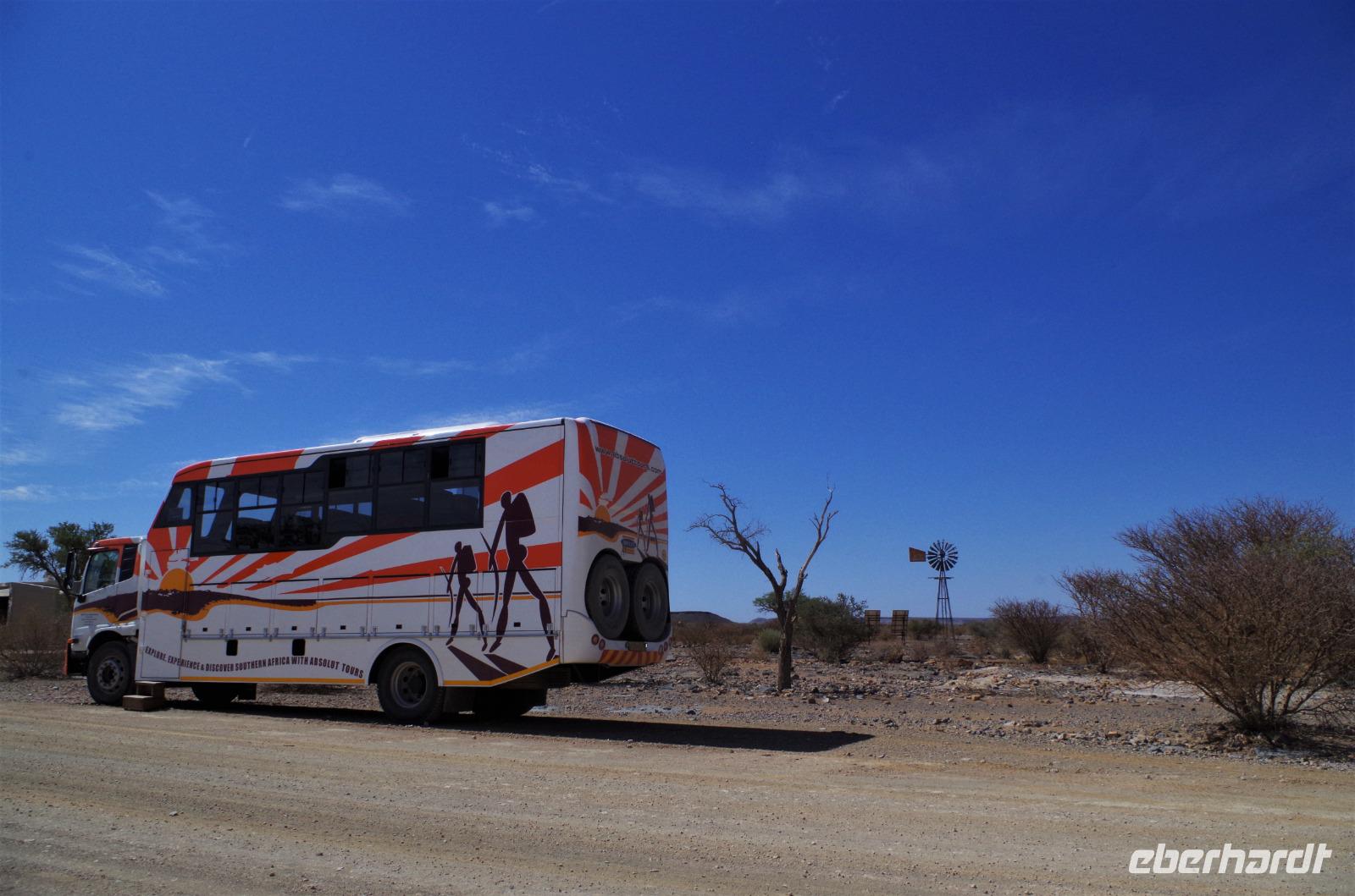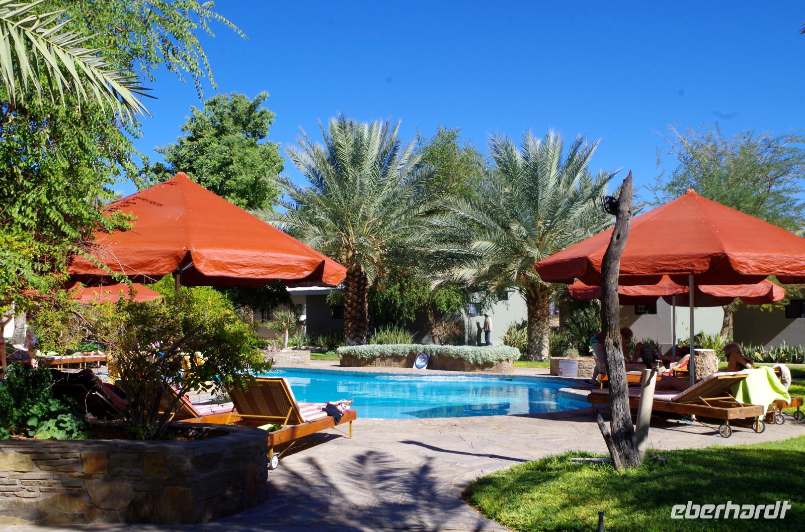 Am frühen Morgen landeten wir in Johannesburg. Dort passierten wir via Transit Pass- und Sicherheitskontrolle und bald darauf ging es nach Windhoek, der Hauptstadt Namibias, weiter. Beim Landeanflug machte Windhoek (windige Ecke) seinen Namen alle Ehre. Wieder festen Boden unter den Füßen spazierten wir über das Rollfeld zur Einreisekontrolle. Eberhardt TRAVEL hatte bereits alle notwendigen Formulare für die Gäste ausgefüllt hatte, sodass die Kontrolle relativ zügig verlief. Am Gepäckband nahmen wir vollzählig alle Koffer in Empfang. Am Ausgang des Flughafens warteten schon Fritz, der örtliche Reiseleiter und Gerhard, unser Truckfahrer. Direkt am Flughafen wurden an der Bank € gegen namibianische Dollar getauscht oder am Bankautomaten Geld gezogen. Danach bestiegen wir den Safari-Truck und fuhren zu unserem Hotel bei Klein-Windhoek. Hier wurden wir mit Sekt aus der wilden Orange und bei Sonnenschein herzlich empfangen. Danach bezogen wir unsere Zimmer und konnten nach der langen Fluganreise entspannen und uns an die warmen Temperaturen gewöhnen. Am späten Nachmittag trafen wir uns auf der wunderschönen Terrasse auf ein Getränk, bevor wir im Restaurant zu Abend speisten. Anschließend gingen wir rasch ins Bett. Tagesetappe im Truck: 102 km