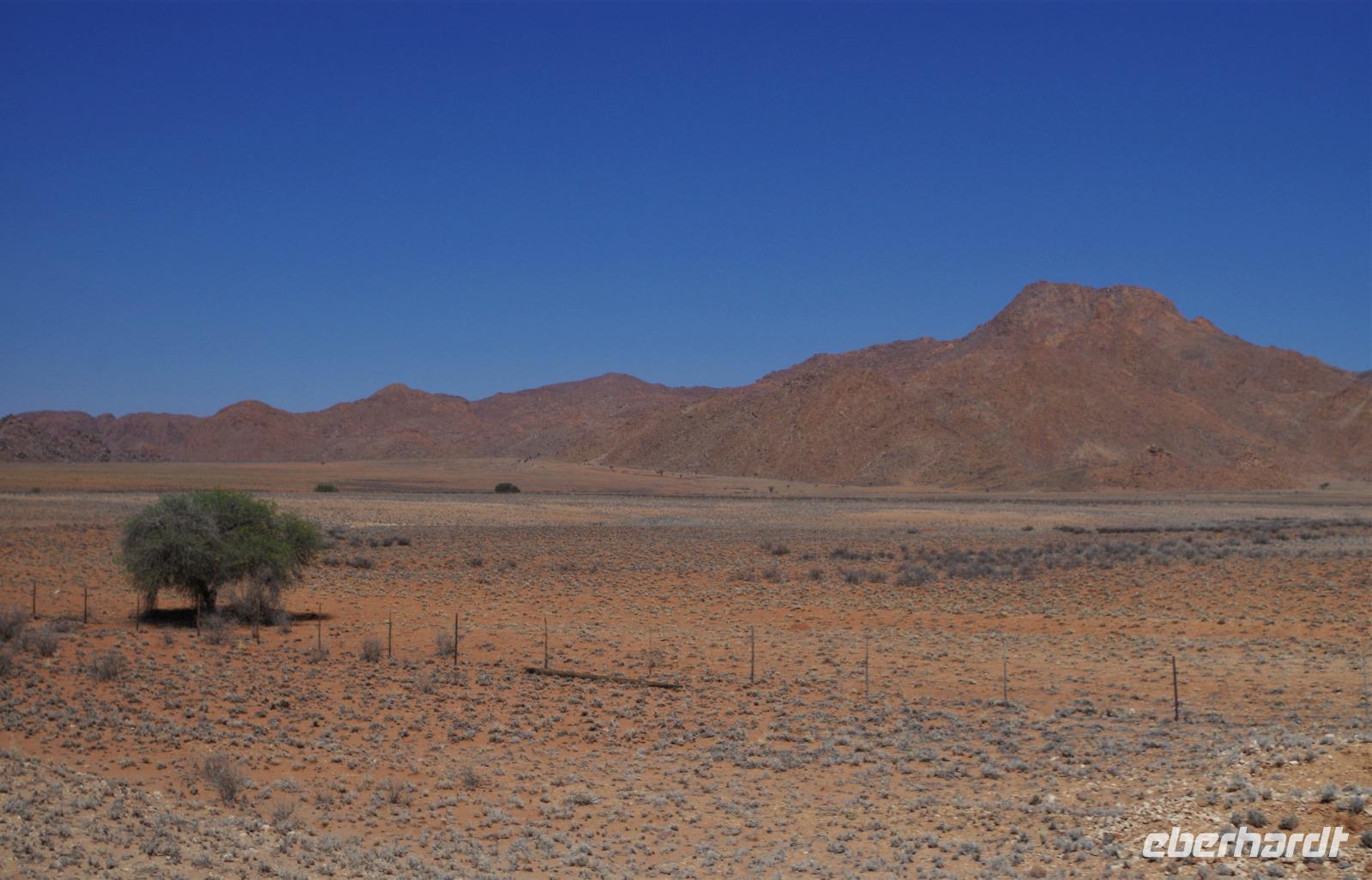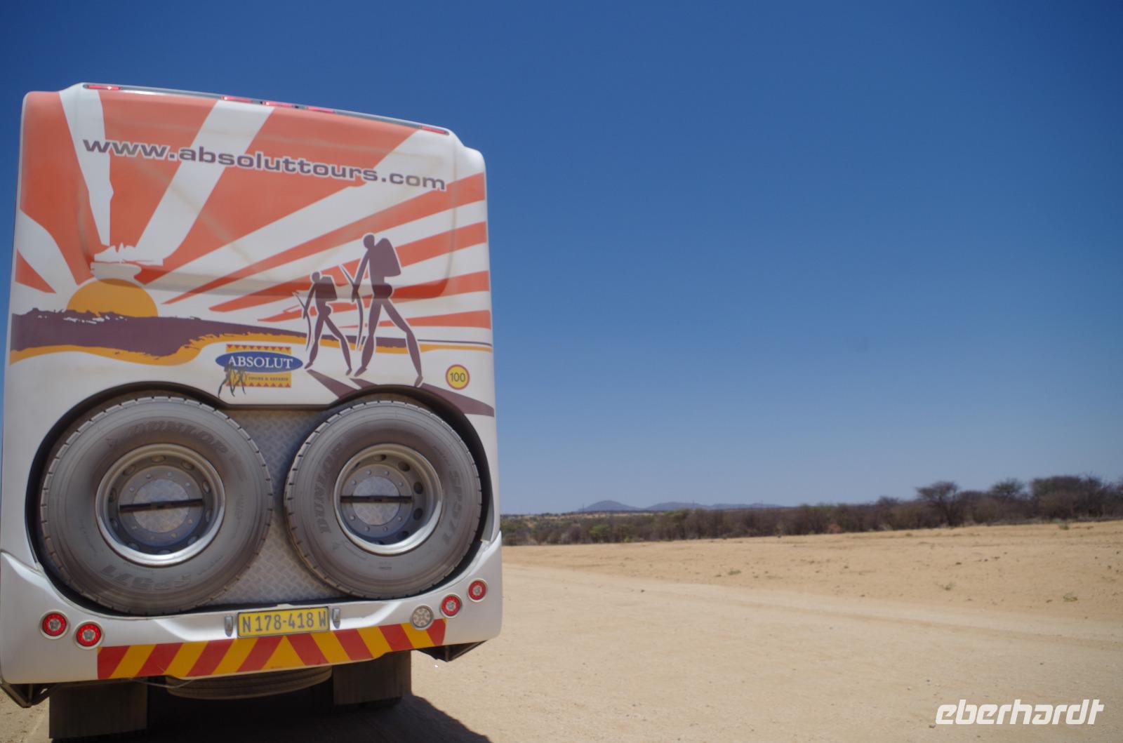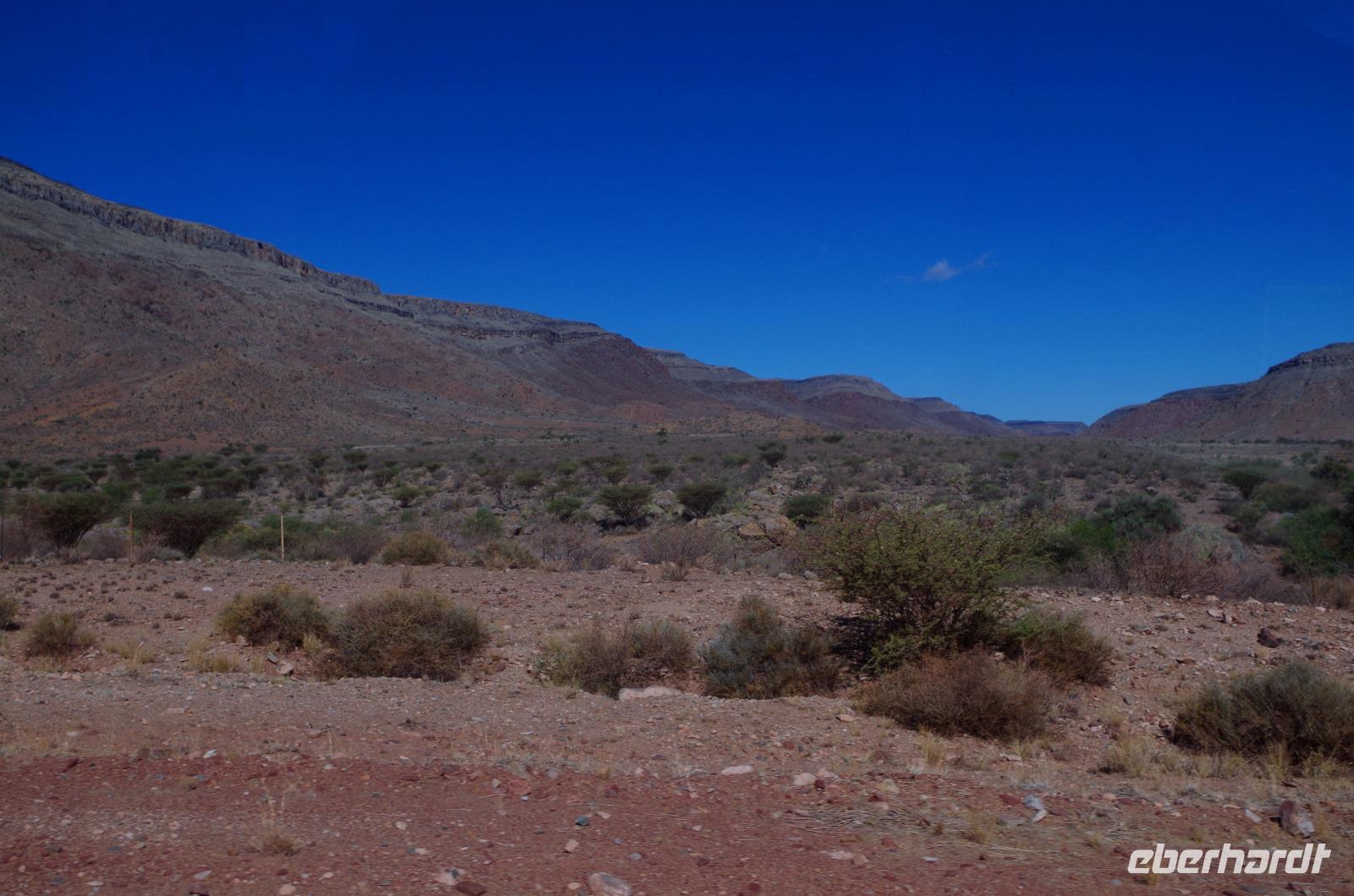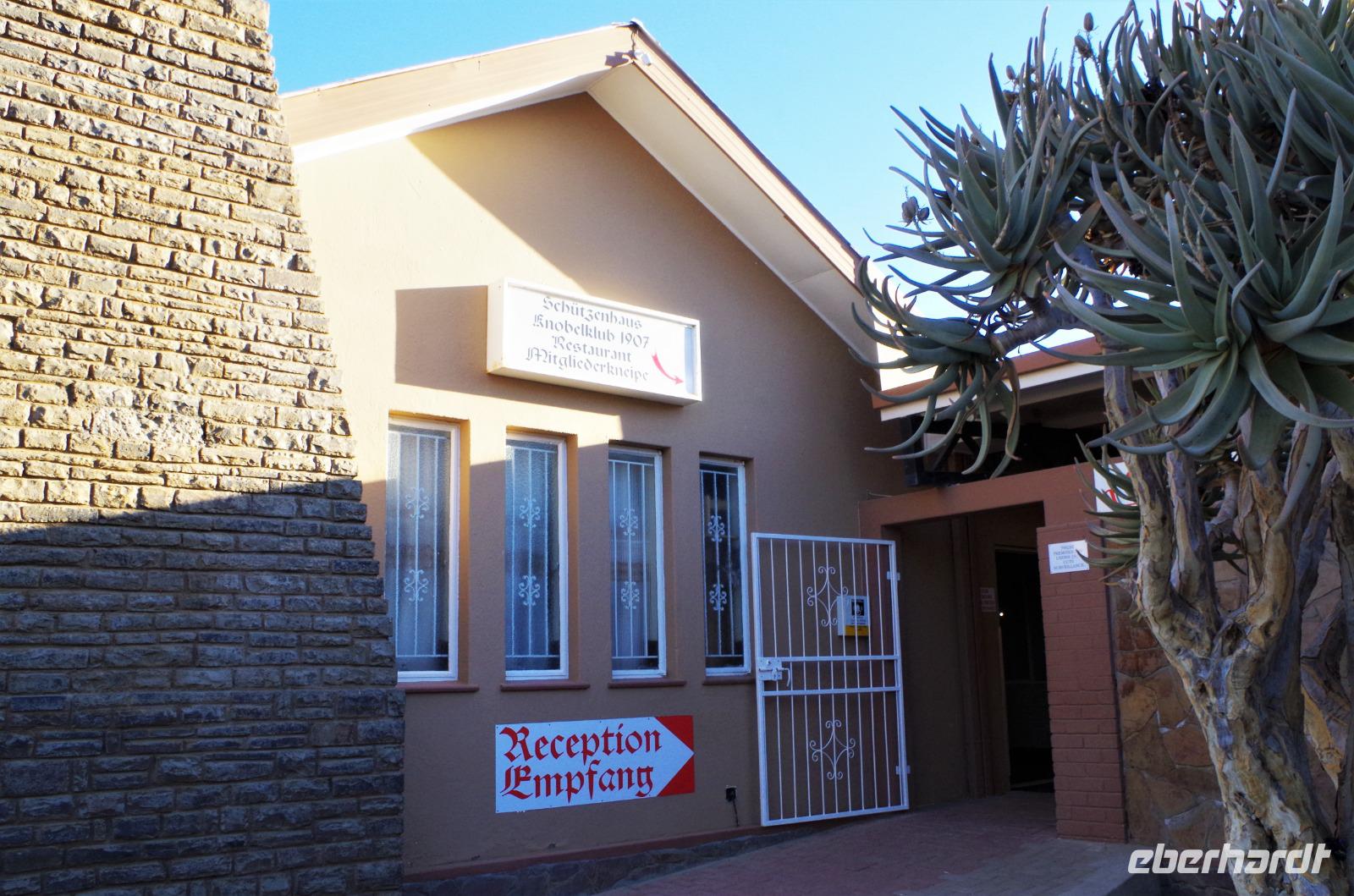 Am frühen Morgen landeten wir in Johannesburg. Dort passierten wir via Transit Pass- und Sicherheitskontrolle und bald darauf ging es nach Windhoek, der Hauptstadt Namibias, weiter. Beim Landeanflug machte Windhoek (windige Ecke) seinen Namen alle Ehre. Wieder festen Boden unter den Füßen spazierten wir über das Rollfeld zur Einreisekontrolle. Eberhardt TRAVEL hatte bereits alle notwendigen Formulare für die Gäste ausgefüllt hatte, sodass die Kontrolle relativ zügig verlief. Am Gepäckband nahmen wir vollzählig alle Koffer in Empfang. Am Ausgang des Flughafens warteten schon Fritz, der örtliche Reiseleiter und Gerhard, unser Truckfahrer. Direkt am Flughafen wurden an der Bank € gegen namibianische Dollar getauscht oder am Bankautomaten Geld gezogen. Danach bestiegen wir den Safari-Truck und fuhren zu unserem Hotel bei Klein-Windhoek. Hier wurden wir mit Sekt aus der wilden Orange und bei Sonnenschein herzlich empfangen. Danach bezogen wir unsere Zimmer und konnten nach der langen Fluganreise entspannen und uns an die warmen Temperaturen gewöhnen. Am späten Nachmittag trafen wir uns auf der wunderschönen Terrasse auf ein Getränk, bevor wir im Restaurant zu Abend speisten. Anschließend gingen wir rasch ins Bett. Tagesetappe im Truck: 102 km