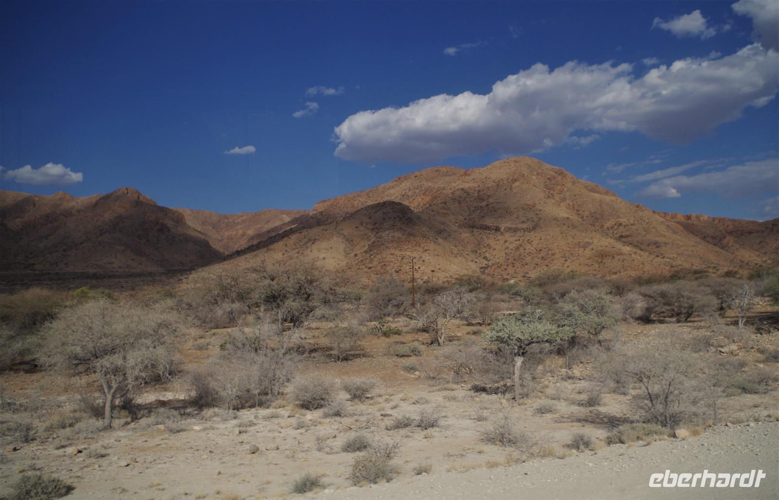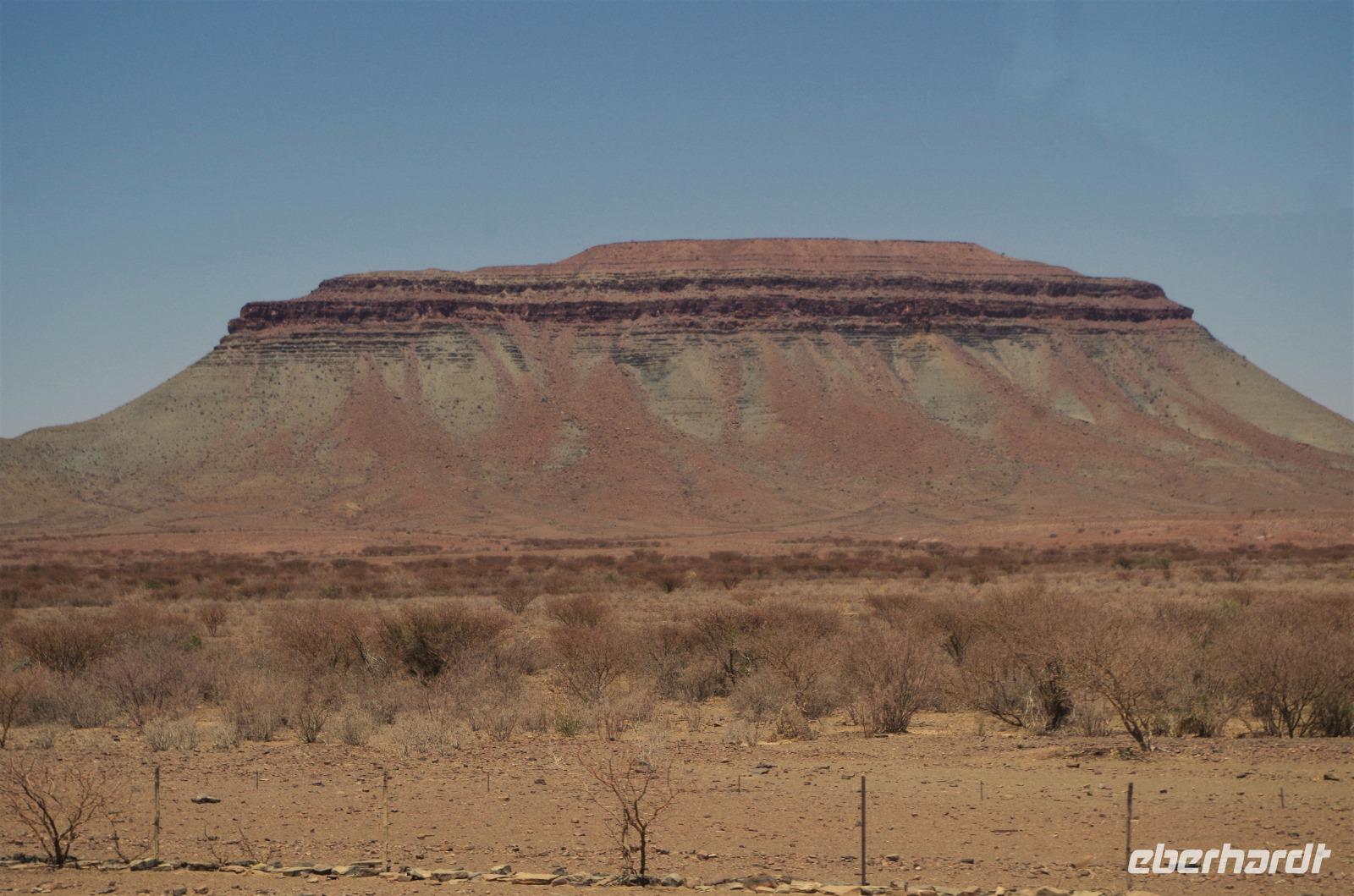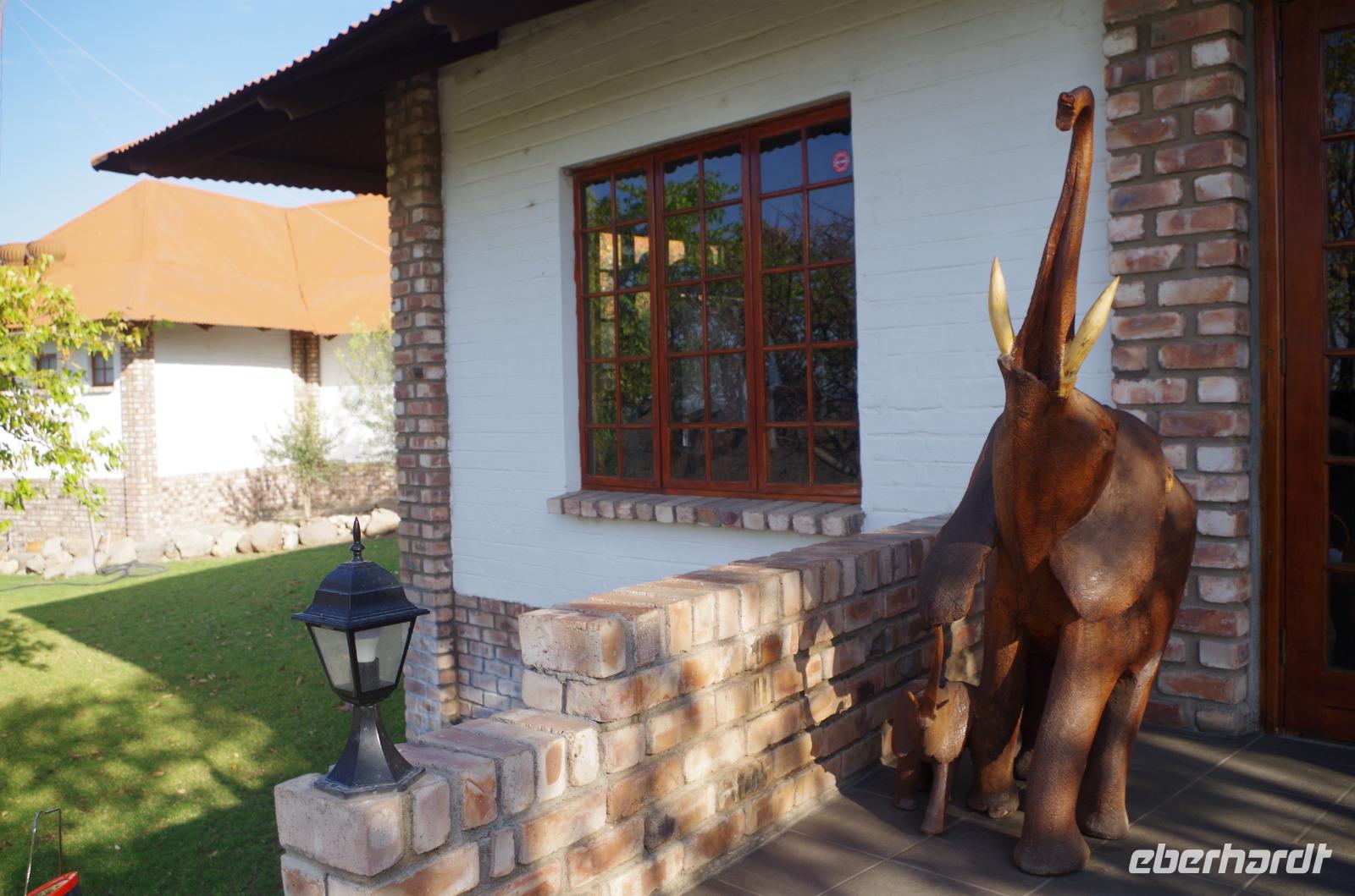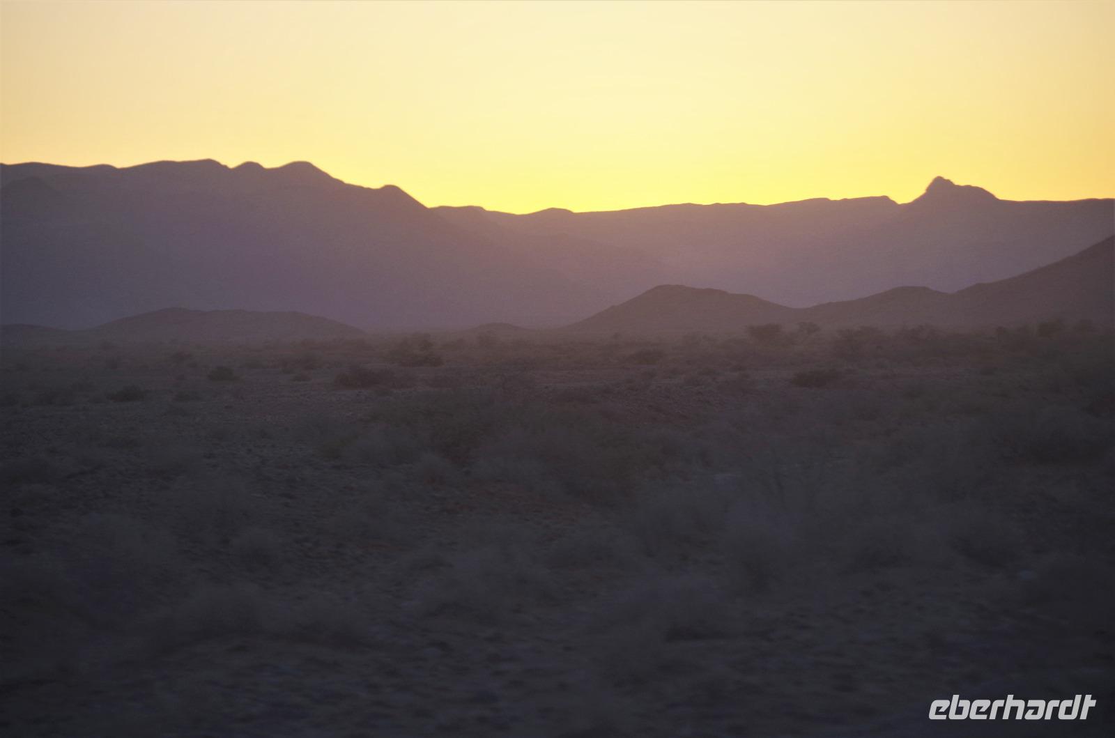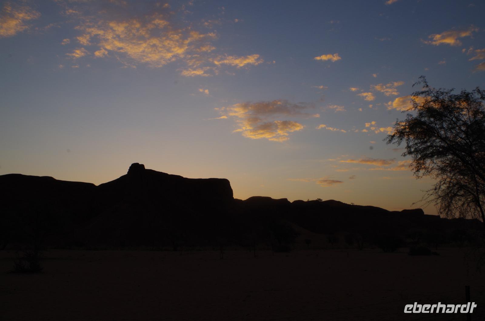 Am frühen Morgen landeten wir in Johannesburg. Dort passierten wir via Transit Pass- und Sicherheitskontrolle und bald darauf ging es nach Windhoek, der Hauptstadt Namibias, weiter. Beim Landeanflug machte Windhoek (windige Ecke) seinen Namen alle Ehre. Wieder festen Boden unter den Füßen spazierten wir über das Rollfeld zur Einreisekontrolle. Eberhardt TRAVEL hatte bereits alle notwendigen Formulare für die Gäste ausgefüllt hatte, sodass die Kontrolle relativ zügig verlief. Am Gepäckband nahmen wir vollzählig alle Koffer in Empfang. Am Ausgang des Flughafens warteten schon Fritz, der örtliche Reiseleiter und Gerhard, unser Truckfahrer. Direkt am Flughafen wurden an der Bank € gegen namibianische Dollar getauscht oder am Bankautomaten Geld gezogen. Danach bestiegen wir den Safari-Truck und fuhren zu unserem Hotel bei Klein-Windhoek. Hier wurden wir mit Sekt aus der wilden Orange und bei Sonnenschein herzlich empfangen. Danach bezogen wir unsere Zimmer und konnten nach der langen Fluganreise entspannen und uns an die warmen Temperaturen gewöhnen. Am späten Nachmittag trafen wir uns auf der wunderschönen Terrasse auf ein Getränk, bevor wir im Restaurant zu Abend speisten. Anschließend gingen wir rasch ins Bett. Tagesetappe im Truck: 102 km