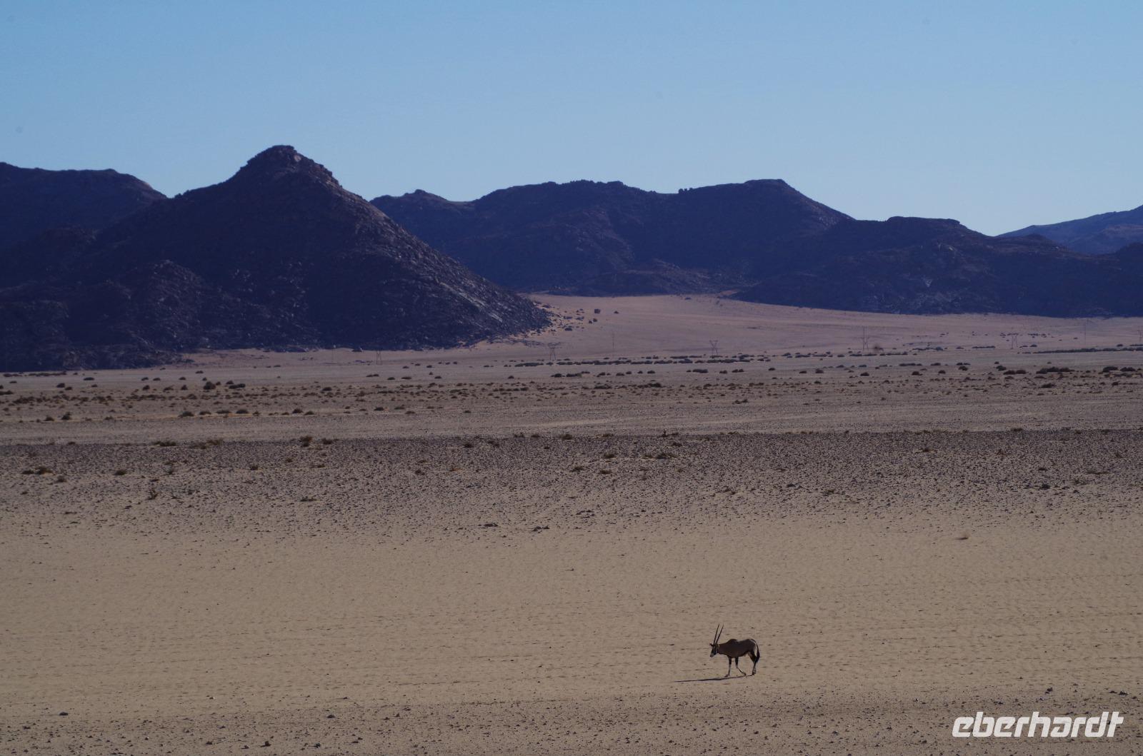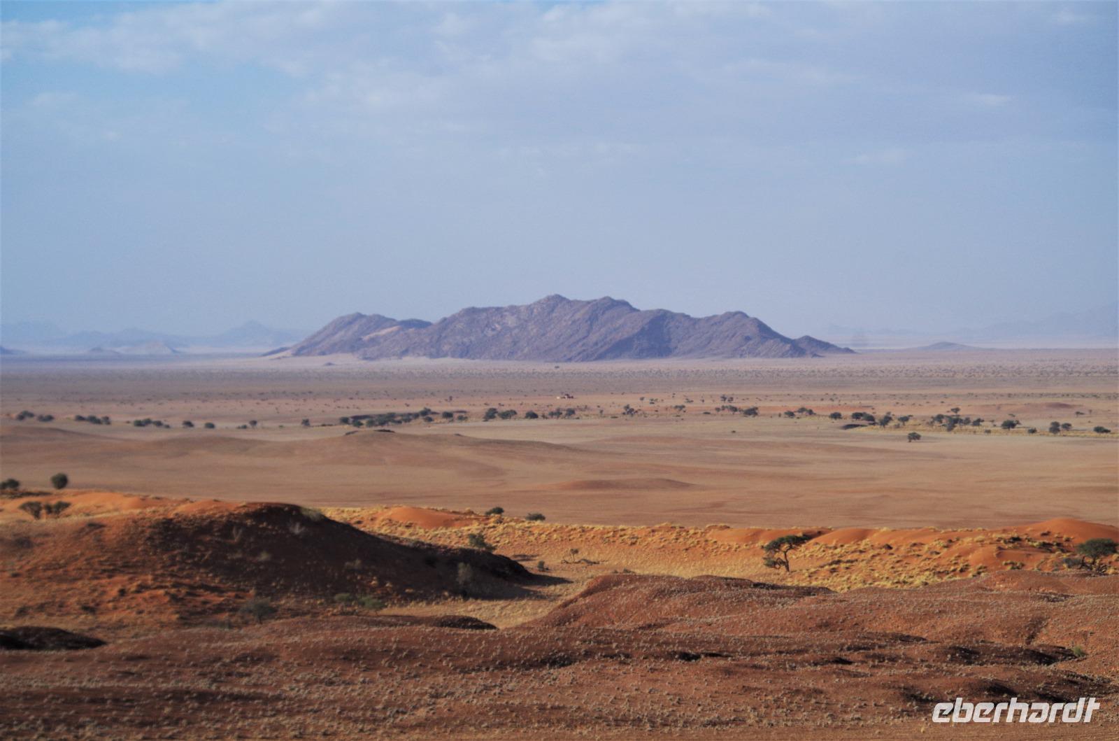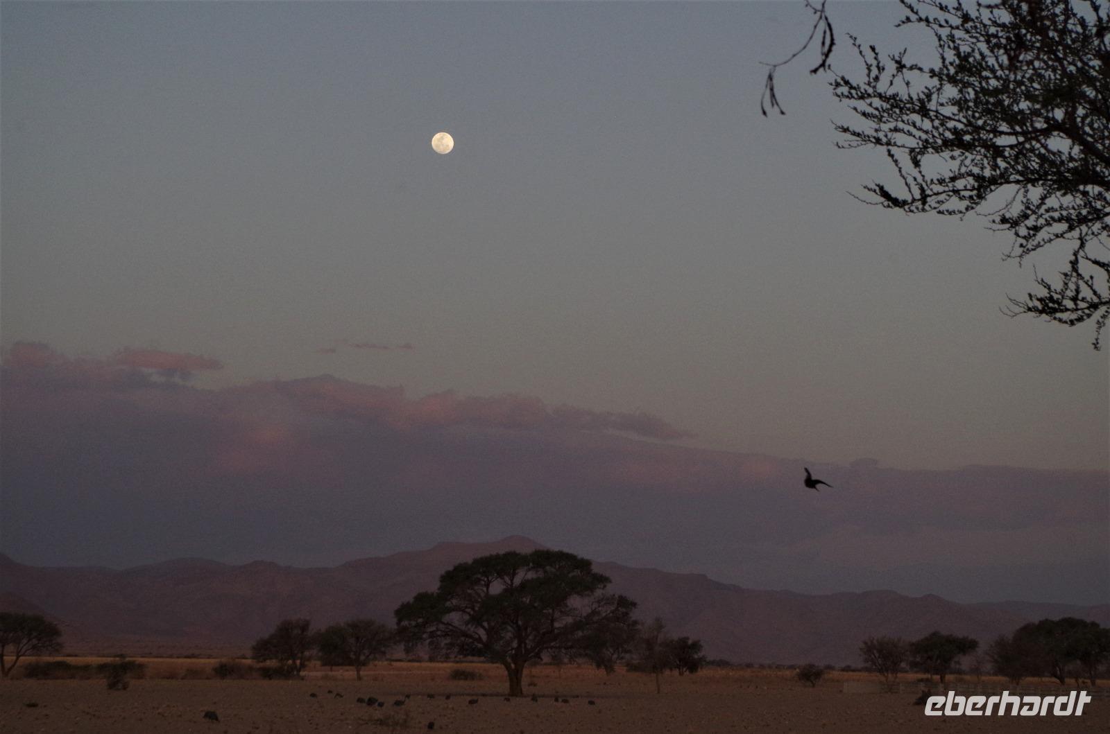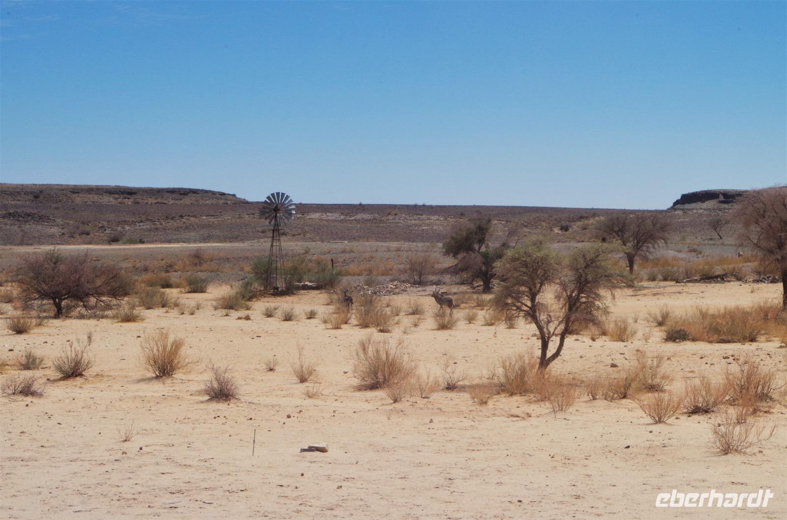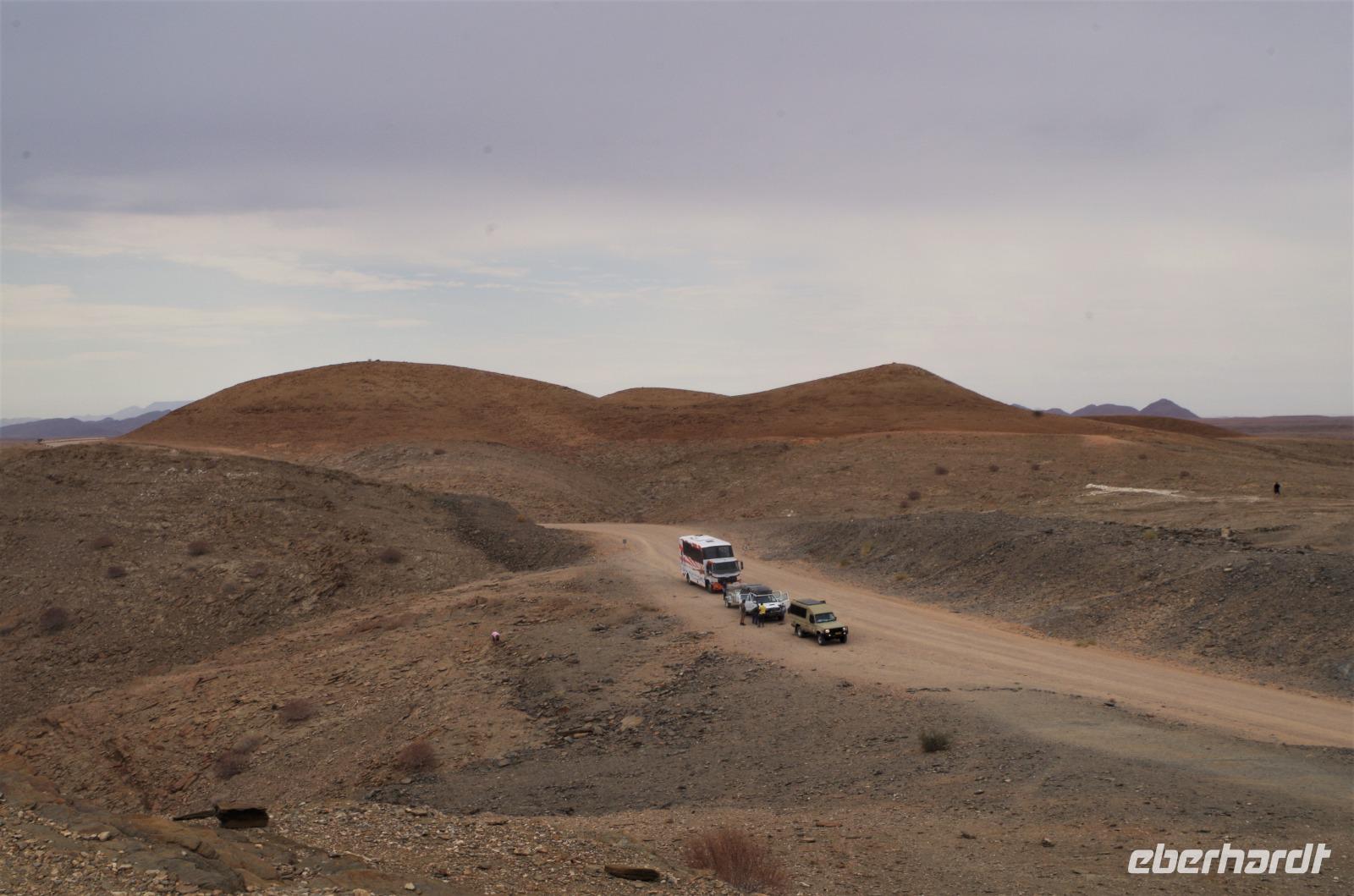 Am frühen Morgen landeten wir in Johannesburg. Dort passierten wir via Transit Pass- und Sicherheitskontrolle und bald darauf ging es nach Windhoek, der Hauptstadt Namibias, weiter. Beim Landeanflug machte Windhoek (windige Ecke) seinen Namen alle Ehre. Wieder festen Boden unter den Füßen spazierten wir über das Rollfeld zur Einreisekontrolle. Eberhardt TRAVEL hatte bereits alle notwendigen Formulare für die Gäste ausgefüllt hatte, sodass die Kontrolle relativ zügig verlief. Am Gepäckband nahmen wir vollzählig alle Koffer in Empfang. Am Ausgang des Flughafens warteten schon Fritz, der örtliche Reiseleiter und Gerhard, unser Truckfahrer. Direkt am Flughafen wurden an der Bank € gegen namibianische Dollar getauscht oder am Bankautomaten Geld gezogen. Danach bestiegen wir den Safari-Truck und fuhren zu unserem Hotel bei Klein-Windhoek. Hier wurden wir mit Sekt aus der wilden Orange und bei Sonnenschein herzlich empfangen. Danach bezogen wir unsere Zimmer und konnten nach der langen Fluganreise entspannen und uns an die warmen Temperaturen gewöhnen. Am späten Nachmittag trafen wir uns auf der wunderschönen Terrasse auf ein Getränk, bevor wir im Restaurant zu Abend speisten. Anschließend gingen wir rasch ins Bett. Tagesetappe im Truck: 102 km