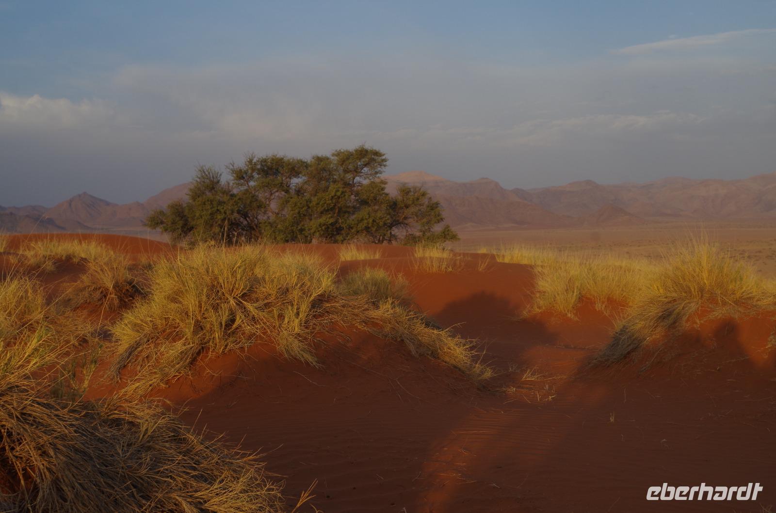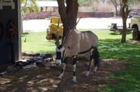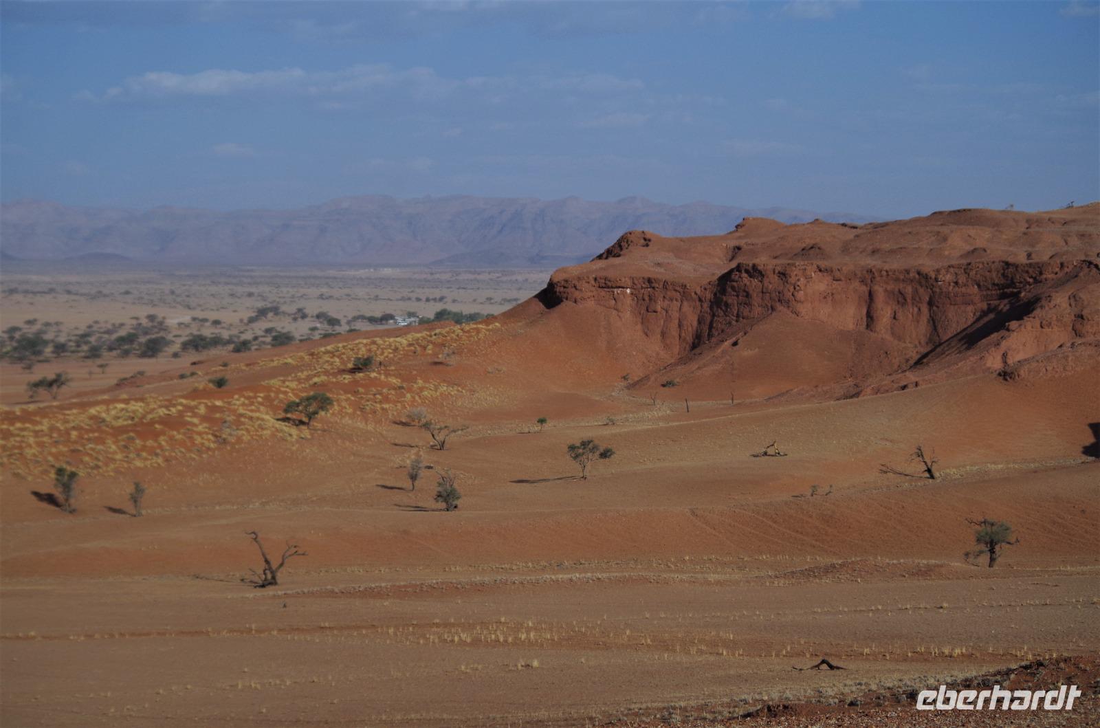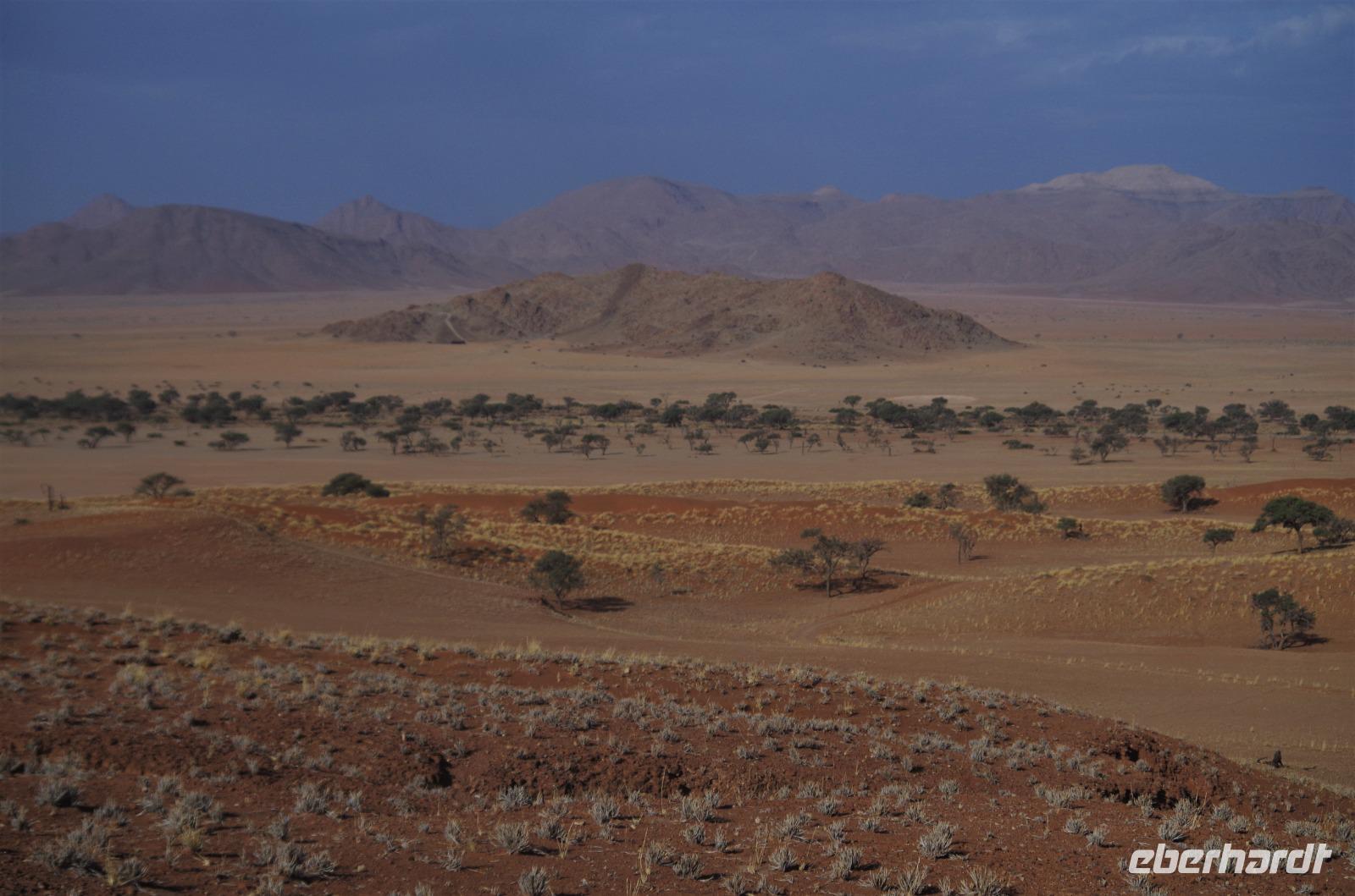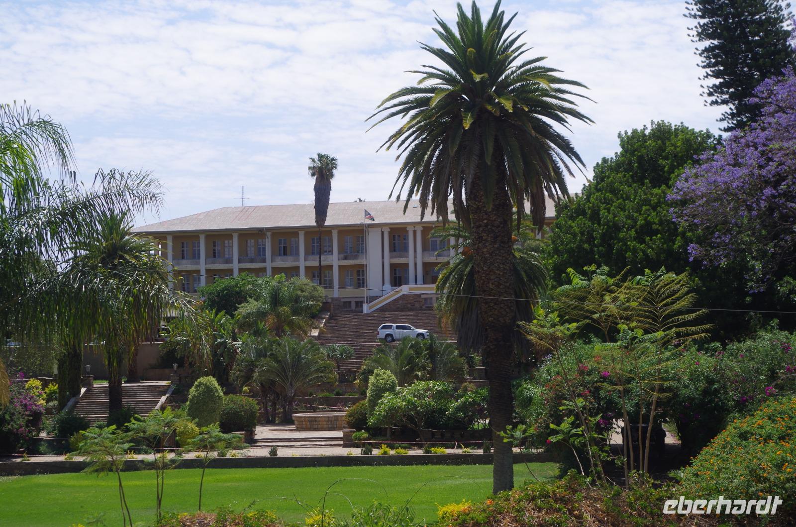 Am frühen Morgen landeten wir in Johannesburg. Dort passierten wir via Transit Pass- und Sicherheitskontrolle und bald darauf ging es nach Windhoek, der Hauptstadt Namibias, weiter. Beim Landeanflug machte Windhoek (windige Ecke) seinen Namen alle Ehre. Wieder festen Boden unter den Füßen spazierten wir über das Rollfeld zur Einreisekontrolle. Eberhardt TRAVEL hatte bereits alle notwendigen Formulare für die Gäste ausgefüllt hatte, sodass die Kontrolle relativ zügig verlief. Am Gepäckband nahmen wir vollzählig alle Koffer in Empfang. Am Ausgang des Flughafens warteten schon Fritz, der örtliche Reiseleiter und Gerhard, unser Truckfahrer. Direkt am Flughafen wurden an der Bank € gegen namibianische Dollar getauscht oder am Bankautomaten Geld gezogen. Danach bestiegen wir den Safari-Truck und fuhren zu unserem Hotel bei Klein-Windhoek. Hier wurden wir mit Sekt aus der wilden Orange und bei Sonnenschein herzlich empfangen. Danach bezogen wir unsere Zimmer und konnten nach der langen Fluganreise entspannen und uns an die warmen Temperaturen gewöhnen. Am späten Nachmittag trafen wir uns auf der wunderschönen Terrasse auf ein Getränk, bevor wir im Restaurant zu Abend speisten. Anschließend gingen wir rasch ins Bett. Tagesetappe im Truck: 102 km