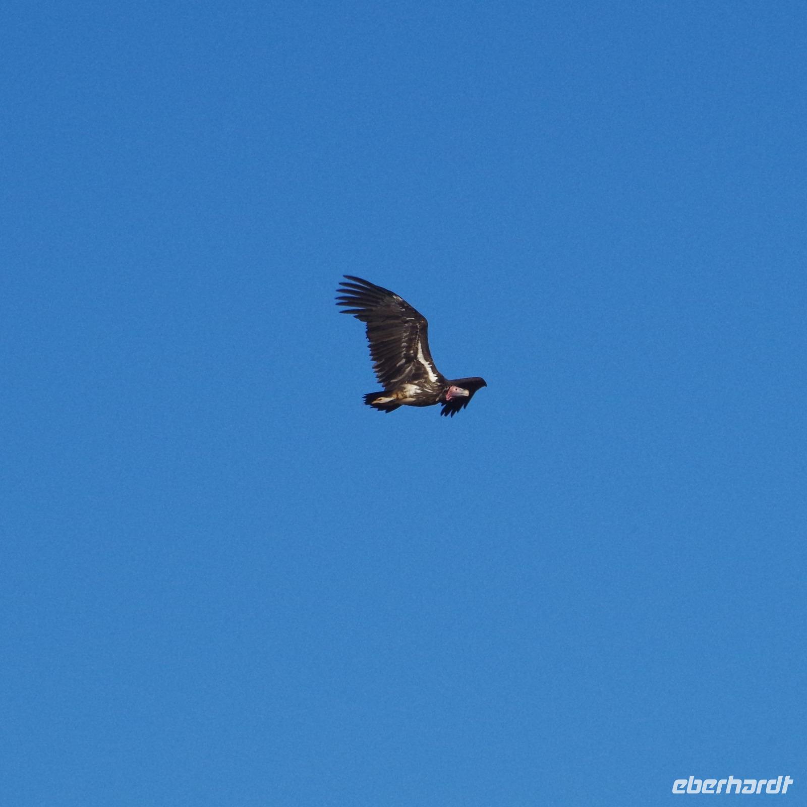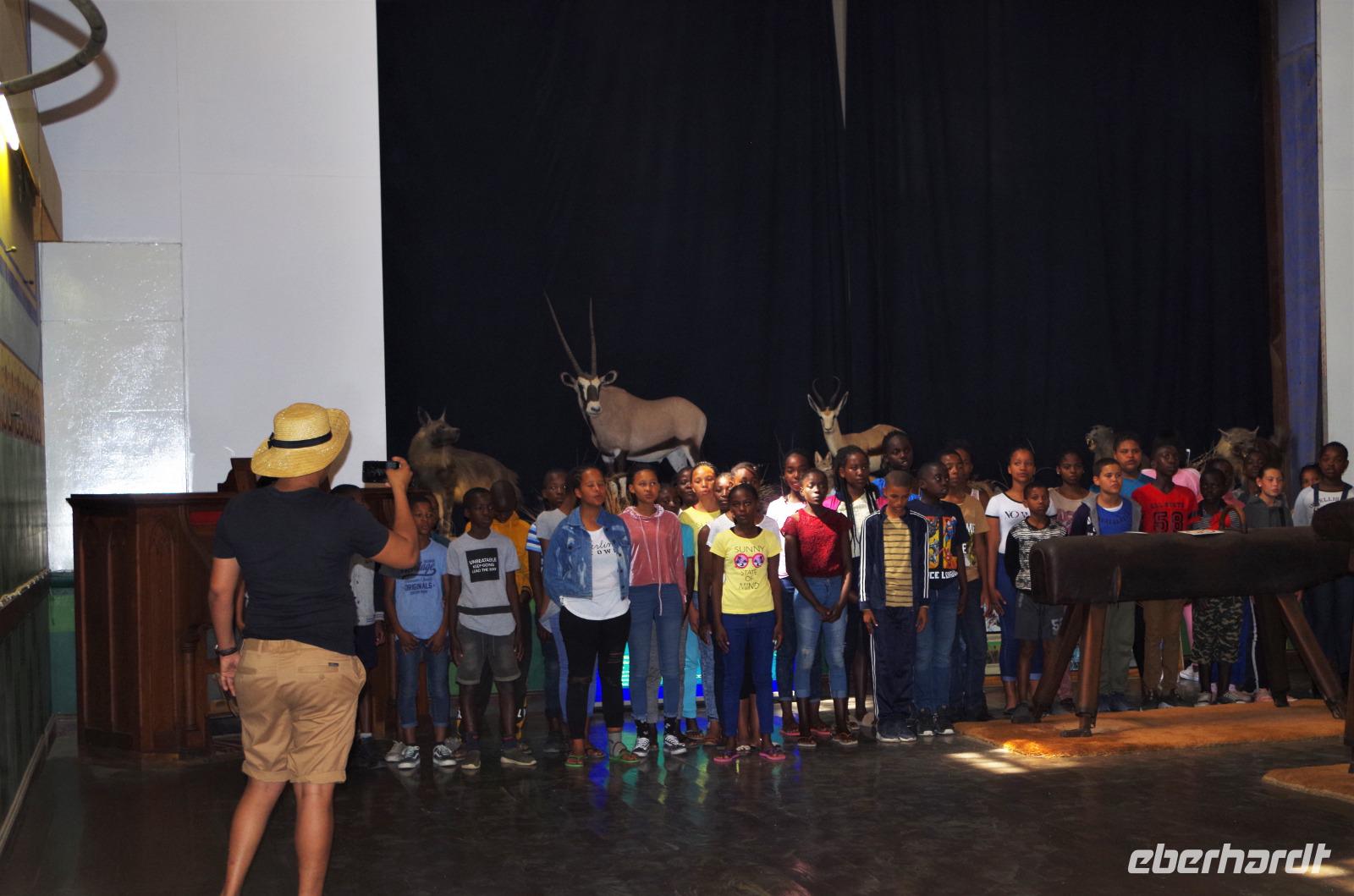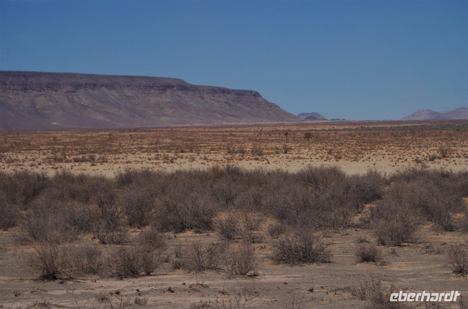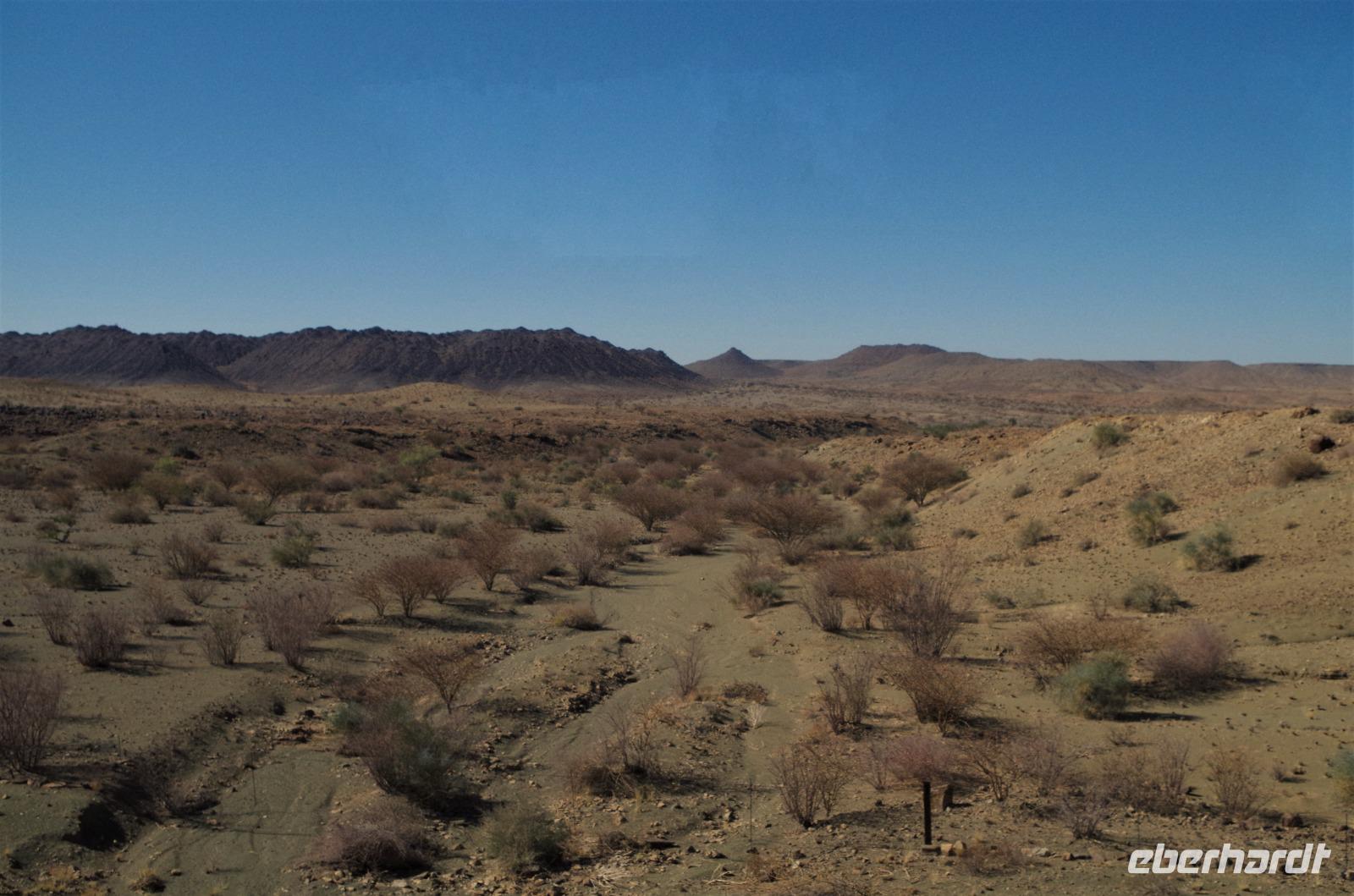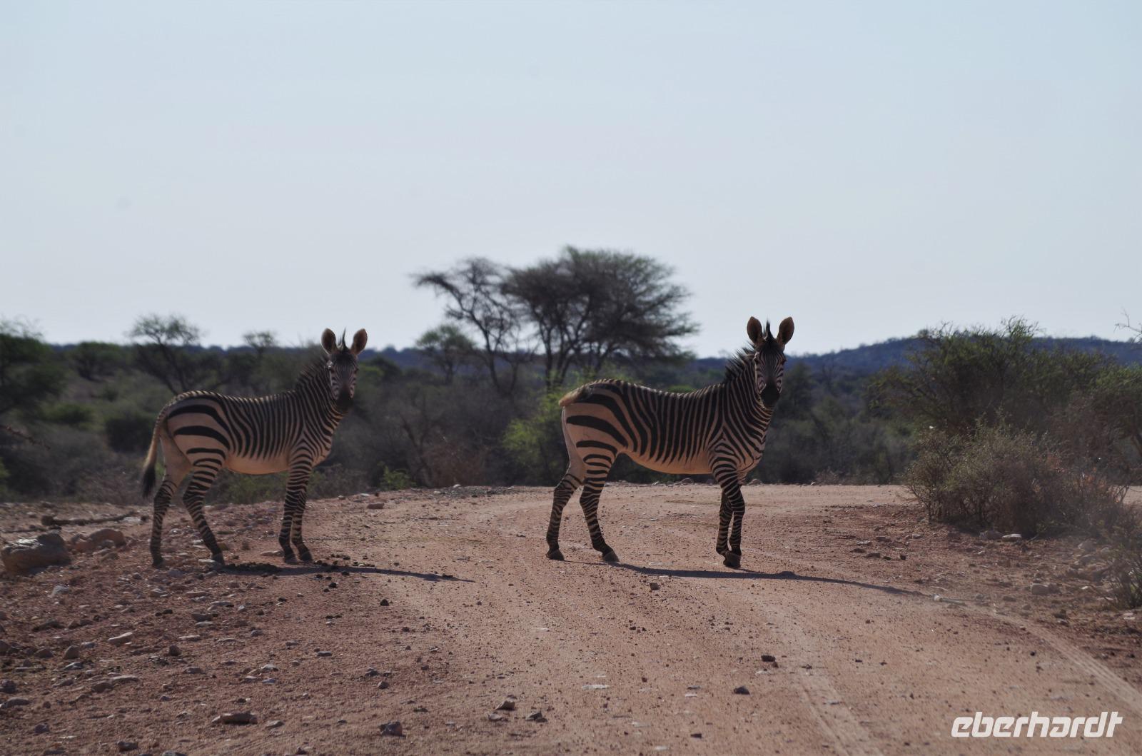 Am frühen Morgen landeten wir in Johannesburg. Dort passierten wir via Transit Pass- und Sicherheitskontrolle und bald darauf ging es nach Windhoek, der Hauptstadt Namibias, weiter. Beim Landeanflug machte Windhoek (windige Ecke) seinen Namen alle Ehre. Wieder festen Boden unter den Füßen spazierten wir über das Rollfeld zur Einreisekontrolle. Eberhardt TRAVEL hatte bereits alle notwendigen Formulare für die Gäste ausgefüllt hatte, sodass die Kontrolle relativ zügig verlief. Am Gepäckband nahmen wir vollzählig alle Koffer in Empfang. Am Ausgang des Flughafens warteten schon Fritz, der örtliche Reiseleiter und Gerhard, unser Truckfahrer. Direkt am Flughafen wurden an der Bank € gegen namibianische Dollar getauscht oder am Bankautomaten Geld gezogen. Danach bestiegen wir den Safari-Truck und fuhren zu unserem Hotel bei Klein-Windhoek. Hier wurden wir mit Sekt aus der wilden Orange und bei Sonnenschein herzlich empfangen. Danach bezogen wir unsere Zimmer und konnten nach der langen Fluganreise entspannen und uns an die warmen Temperaturen gewöhnen. Am späten Nachmittag trafen wir uns auf der wunderschönen Terrasse auf ein Getränk, bevor wir im Restaurant zu Abend speisten. Anschließend gingen wir rasch ins Bett. Tagesetappe im Truck: 102 km