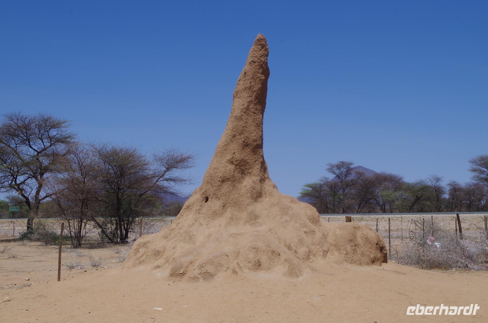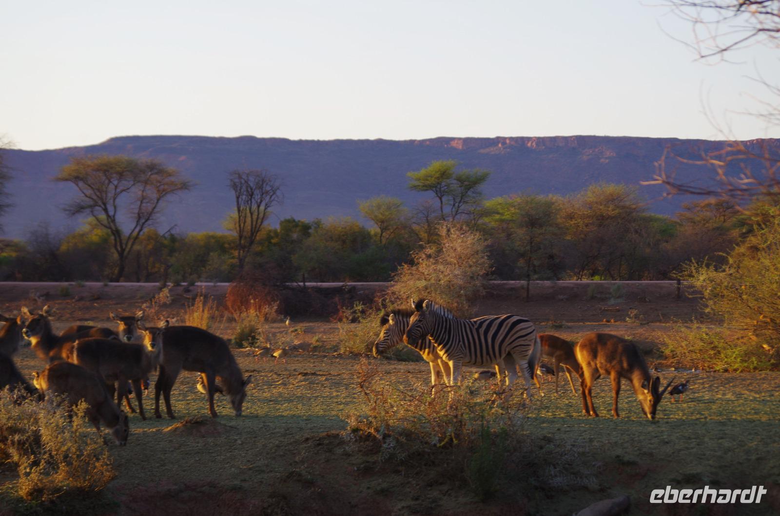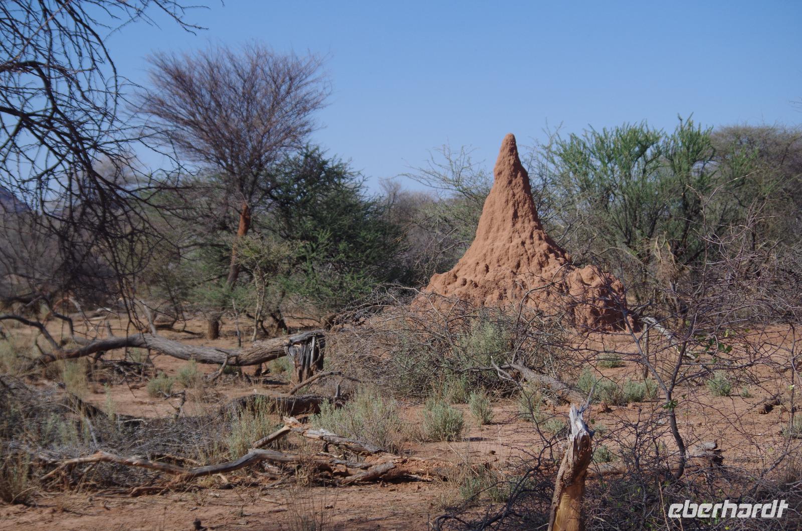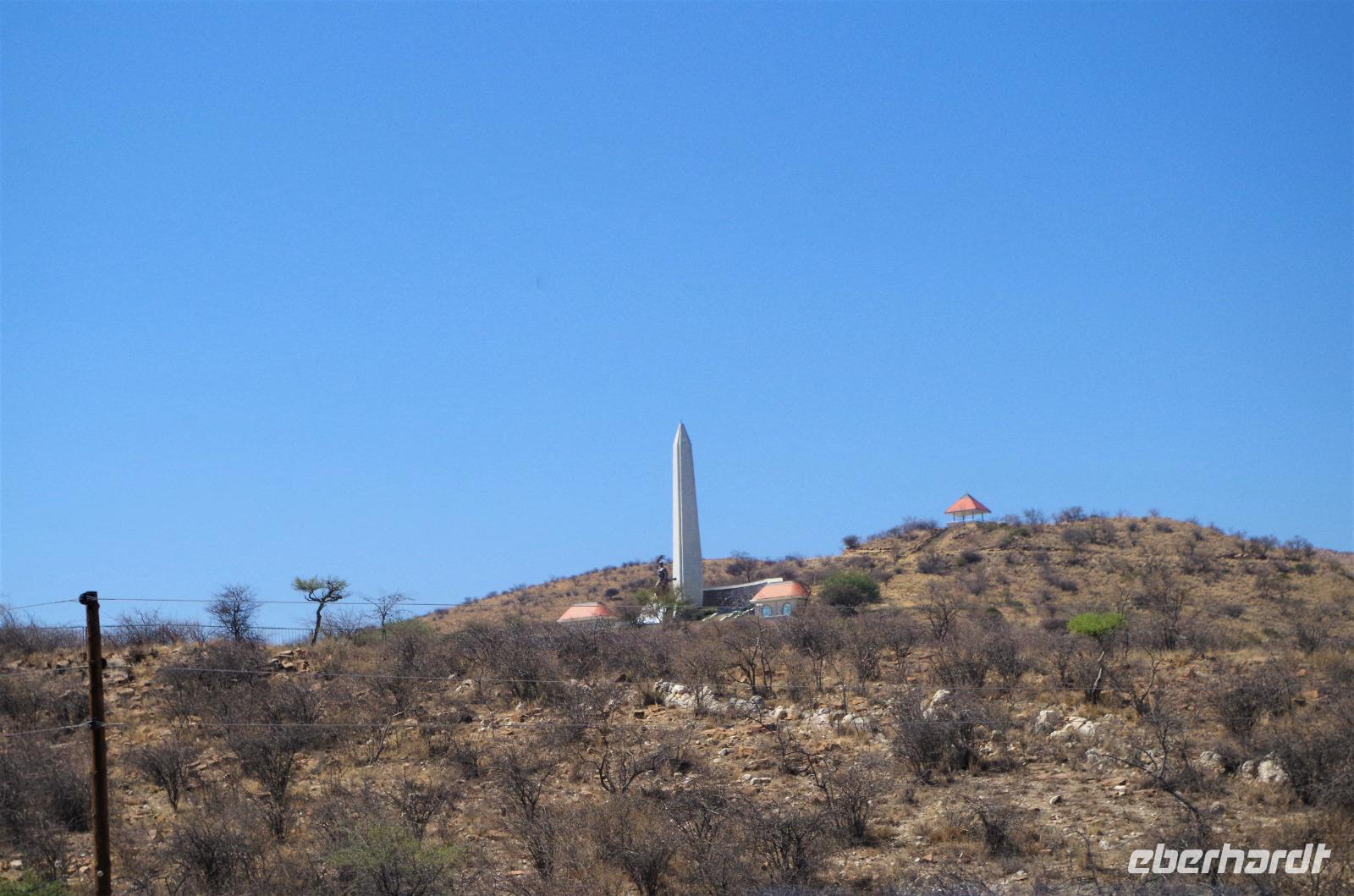 Einige sind heute schon sehr früh aufgestanden, um die plantschen Hippos zu beobachten. Später frühstücken wir gemütlich und genießen noch etwas die schöne Anlage, bevor wir in Richtung Windhoek aufbrechen. Von weiten sehen wir die Omatako-Berge. Man nennt sie auch Popo-Berge, obwohl sie eher aussehen wie ein anderes weibliches Körperteil. Auf der B1 hatten wieder Asphalt unterm Hintern. Während der Reise sahen wir viele Termitenhügel verschiedenster Baustile. An einem besonders schönen und großen Termintenbau halten wir an. Fritz erzählt uns über die Termitenvölker und vom dem riesigen Pilz, der eine besondere Delikatesse ist. Wir erreichen Okahandja, was große, sandige Ebene bedeutet. Wir fahren zur kleinen Kirche der Rheinischen Mission. Dahinter befindet sich der Friedhof aus dem Jahr 1872, auf dem viele Deutsche aus dem damaligen Deutsch-Süd-West begraben liegen. Gegenüber befinden sich die gut eingezäumten Gräber führender Herero-Persönlichkeiten. Am Nachmittag erreichen wir Windhoek und fahren durch den Stadtteil Olympia, wo Fritz wohnt. Vorbei am Heldenacker fahren wir zur privaten Auas Game Lodge, die etwas außerhalb am Rande der Auas-Berge liegt. Der Weg scheint uns ewig lang, aber wir kommen an. Vor der Terrasse ist eine Wasserstelle, wo wir zugleich von Gnus, Zebras, Wasserböcken und Warzenschweinen begrüßt werden. Wir beziehen uns Zimmer und treffen uns später zu Kaffee und Kuchen. Beim letzten Abendessen auf der Terrasse lassen wir die Reise noch einmal Revue passieren. - Tagesetappe im Truck: 288 km