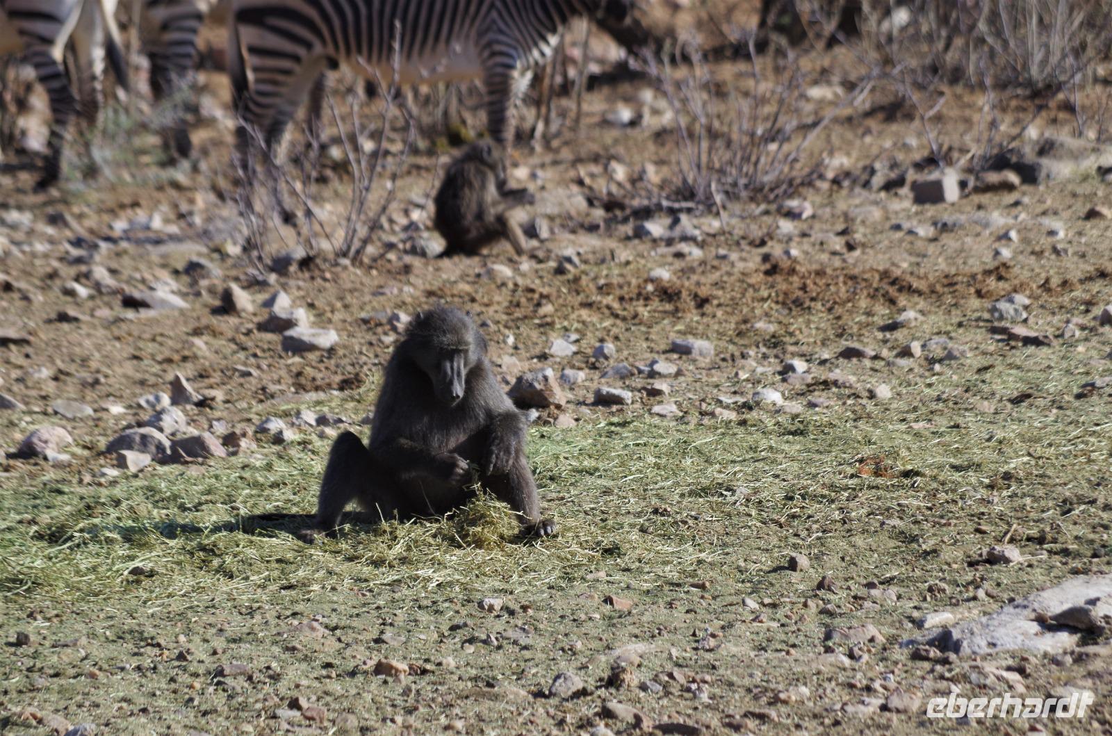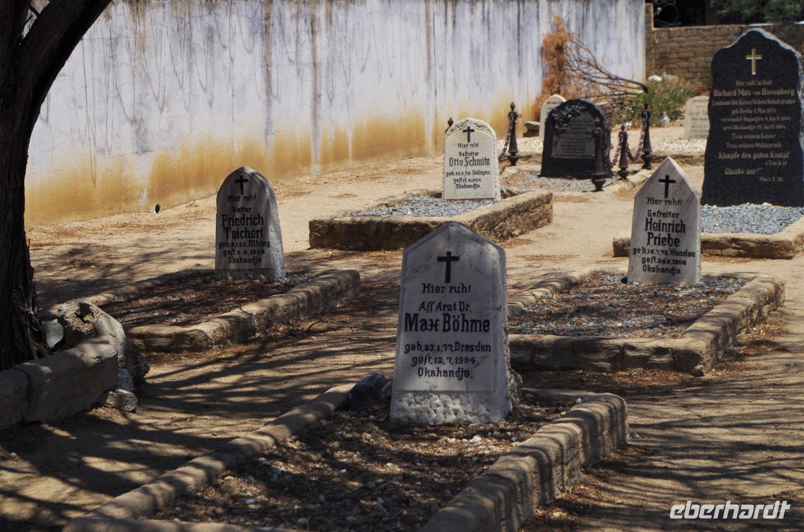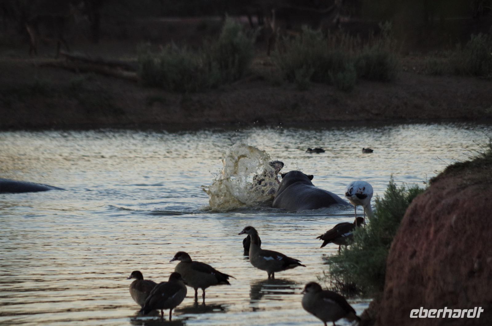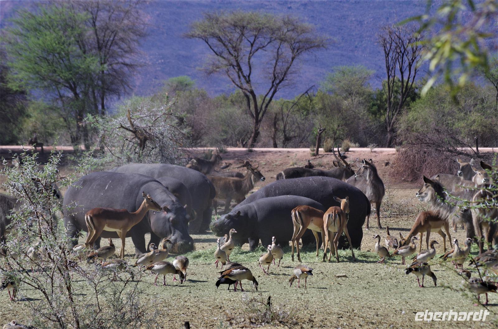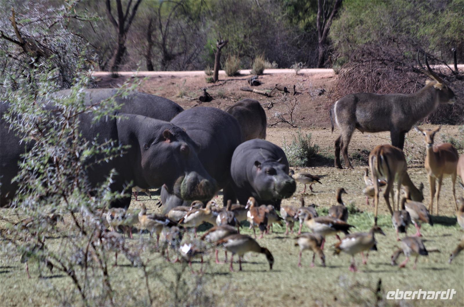 Einige sind heute schon sehr früh aufgestanden, um die plantschen Hippos zu beobachten. Später frühstücken wir gemütlich und genießen noch etwas die schöne Anlage, bevor wir in Richtung Windhoek aufbrechen. Von weiten sehen wir die Omatako-Berge. Man nennt sie auch Popo-Berge, obwohl sie eher aussehen wie ein anderes weibliches Körperteil. Auf der B1 hatten wieder Asphalt unterm Hintern. Während der Reise sahen wir viele Termitenhügel verschiedenster Baustile. An einem besonders schönen und großen Termintenbau halten wir an. Fritz erzählt uns über die Termitenvölker und vom dem riesigen Pilz, der eine besondere Delikatesse ist. Wir erreichen Okahandja, was große, sandige Ebene bedeutet. Wir fahren zur kleinen Kirche der Rheinischen Mission. Dahinter befindet sich der Friedhof aus dem Jahr 1872, auf dem viele Deutsche aus dem damaligen Deutsch-Süd-West begraben liegen. Gegenüber befinden sich die gut eingezäumten Gräber führender Herero-Persönlichkeiten. Am Nachmittag erreichen wir Windhoek und fahren durch den Stadtteil Olympia, wo Fritz wohnt. Vorbei am Heldenacker fahren wir zur privaten Auas Game Lodge, die etwas außerhalb am Rande der Auas-Berge liegt. Der Weg scheint uns ewig lang, aber wir kommen an. Vor der Terrasse ist eine Wasserstelle, wo wir zugleich von Gnus, Zebras, Wasserböcken und Warzenschweinen begrüßt werden. Wir beziehen uns Zimmer und treffen uns später zu Kaffee und Kuchen. Beim letzten Abendessen auf der Terrasse lassen wir die Reise noch einmal Revue passieren. - Tagesetappe im Truck: 288 km