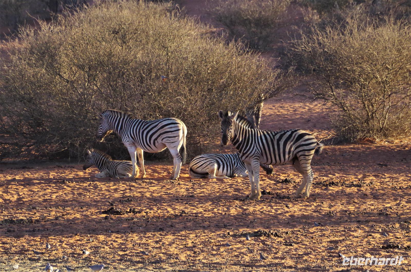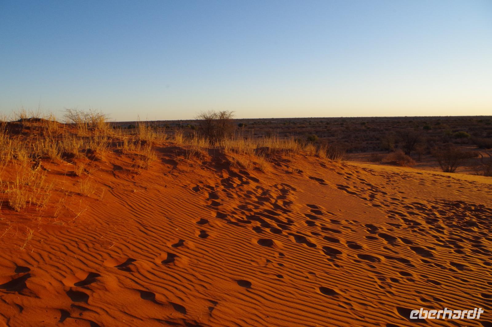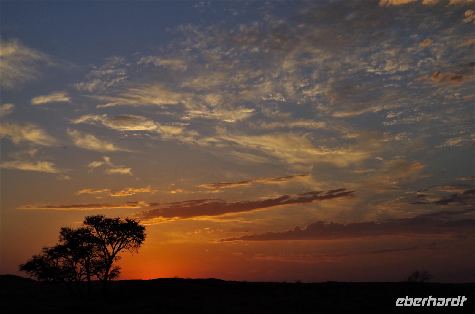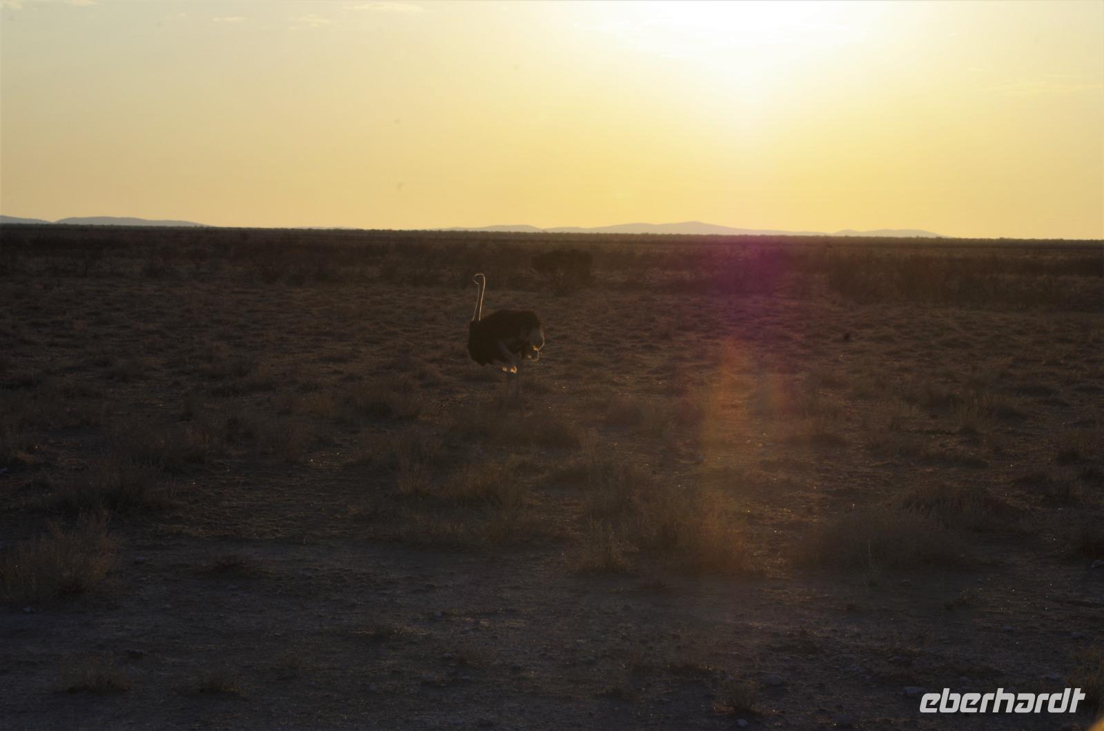 In der Nacht hatte es etwas getröpfelt, aber nun schien die Sonne wieder. Wir genossen nicht nur unser erstes Frühstück, sondern auch den Panoramablick vom Restaurant. Danach beluden wir den Truck und fuhren zunächst zur Maerua Shopping Mall, benannt nach einem immergrünen Baum dieser Gegend. Im hiesigen SuperSpar machten wir einige Besorgungen (Peaceful Sleep und Adapter) und kauften für die Picknicks unterwegs ein.Wir verliessen Windhoek und fuhren entlang der Auas Berge, noch auf Asphalt, Richtung Süden. Wir sahen das Heroe's Acre (Heldenacker) mit seinem weißen Monument, dass als nationales Denkmal den Freiheitskämpfern gewidmet ist. Obwohl in Namibia viele Menschen ohne Arbeit sind und es auch gute Baufirmen im Land gibt, wurde dieses Denkmal von einer nordkoreanischen Firma gebaut... Später erreichten wir die Basterstadt Rehoboth. Als Baster werden die Nachkommen aus den Mischehen zwischen Nama-Frauen und burischen Einwanderen aus der Kapregion bezeichnet. Baster gilt hier übrigens nicht als Schimpfwort, sondern ist ein Ehrentitel. Nach einer TOI-Pause fuhren wir weiter. Das schwarze Asphaltband zog sich schnurgerade durch die Landschaft, typisch für Namibia. Blauer Himmel, gelb-rote Felsen und dürres, ausgetrocknetes Weideland .... Erst jetzt wurde uns so richtig bewusst, wie sehr das Land unter der extremen Trockenheit in diesem Jahr leidet. Von Fritz erfuhren wir, dass Rinderfarmen und private Wildreservate zufüttern müssen, um ein Überleben der Tiere zu sichern. Unterwegs passierten wir den Tropic of Capricorn (südlicher Wendekreis des Steinbocks). Der Gürtel oberhalb, bis zum nördlichen Wendekreis des Krebses, wird als die Tropen bezeichnet. Später bogen wir auf Sand-Pad ab. Pad, so heißen in Namibia die Verkehrswege, egal ob Teer, Schotter oder Sand. Wir sind also immer auf Pad in Namibia. Von weiten entdeckten wir die Ausläufer der Kalahari. In der Kalahari sind die roten Sanddünen wellenförmig, nicht sehr hoch und bewachsen. Rechts und links Dornakazien, Farmland und die typischen Windräder der Wasserpumpen. Am frühen Nachmittag checkten wir in der schönen Kalahari Anib Lodge ein und entspannten ein wenig. An der Wasserstelle der Lodge versammelte sich eine Herde Eland-Antilopen (größte Antilopenart). Am späteren Nachmittag nahmen alle am optional angebotenen Sunset Nature Drive im Jeep teil, einen fuhr Numda und den anderen Fritz. Die 3-stündige Fahrt führte uns durch die sanfte Dünenlandschaft des privaten Gondwana-Parks, welche 10.000 Hektar (100 km²) umfasst. Obwohl auch hier alles sehr dürr und trocken war, boten sich uns wunderschöne Fotomotive. Zwischen den Ästen eines Kameldornbaumes entdeckten wir ein riesiges Nest der Webersiedlervögel (sozialer Wohnungsbau) und versteckt einen Flecken-Uhu. Weiter sahen Giraffen (Schiraffen), Strauße, Weißrückengeier, Streifengnus, Zebras und Oryxe. Auf einer höheren Düne stoppte unser Jeep rechtzeitig zum Sonnenuntergang und eine Bar wurde aufgebaut: Billtong, Trockenwurst, Chips, Nüsse und diverse Getränke - die Auswahl war groß. Schnell hatten wir unser Lieblingsgetränk in der Hand und erfreuten uns an der untergehenden Sonne. Es war einfach fantastisch schön! Am Abend bedienten wir uns auf großen Buffet und ließen den Tag ausklingen. Tagesetappe im Truck: 289 km