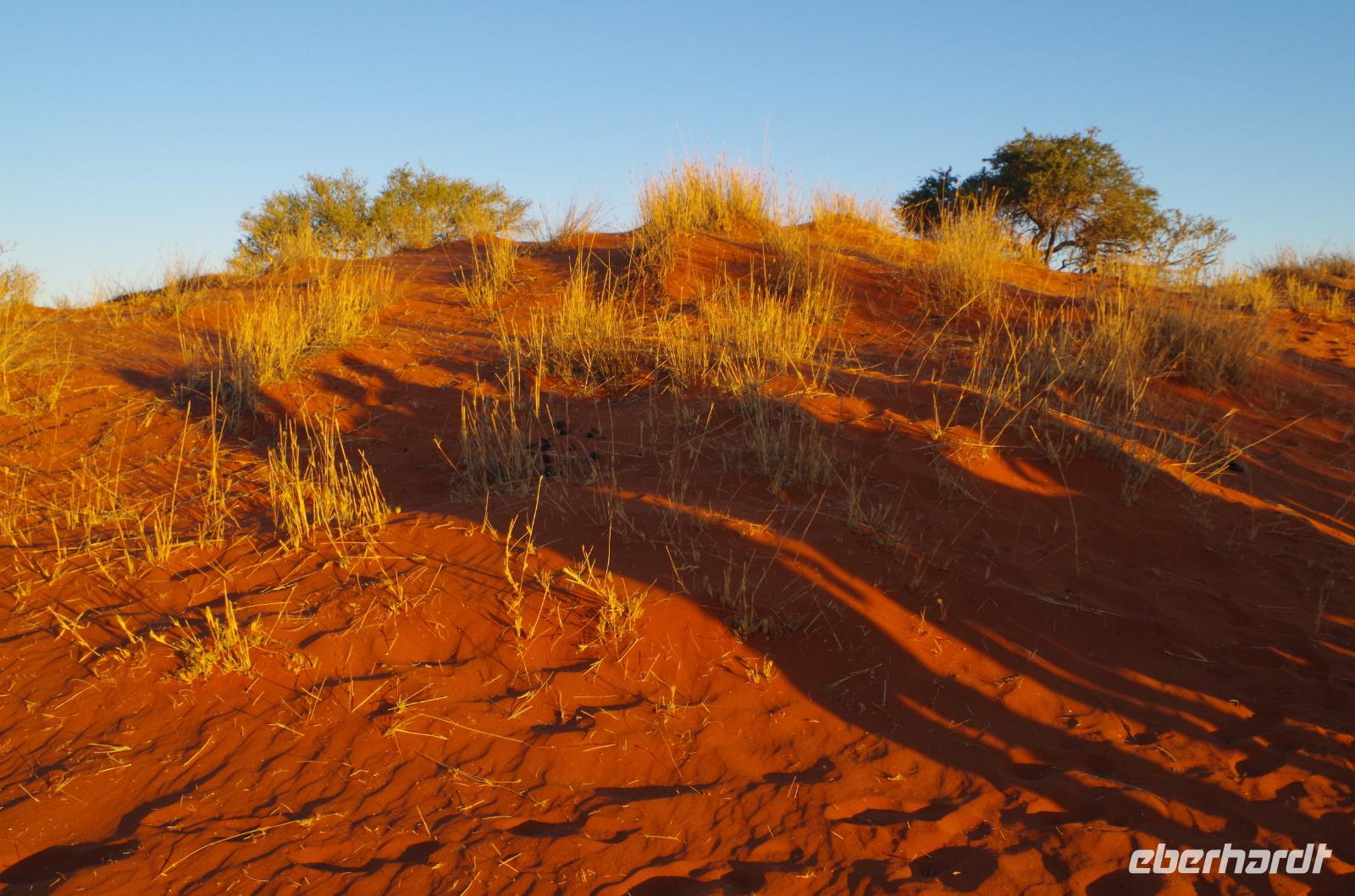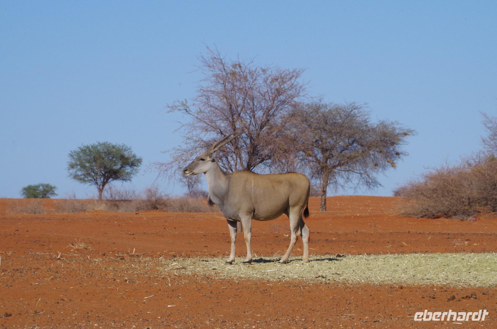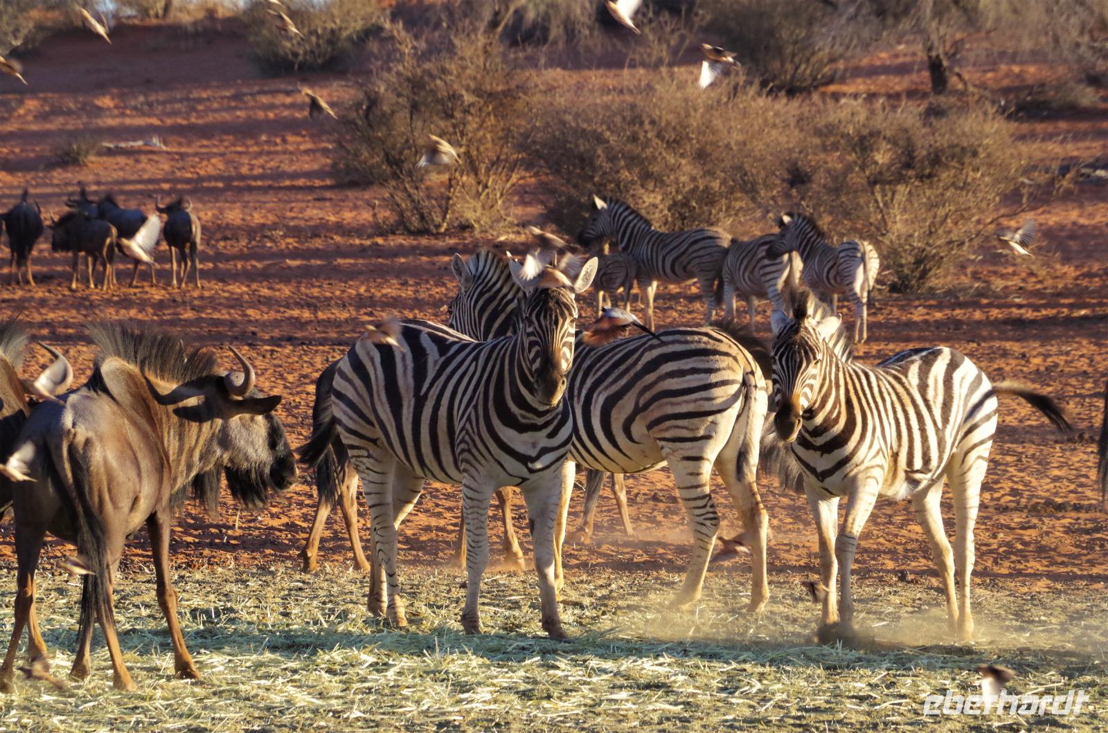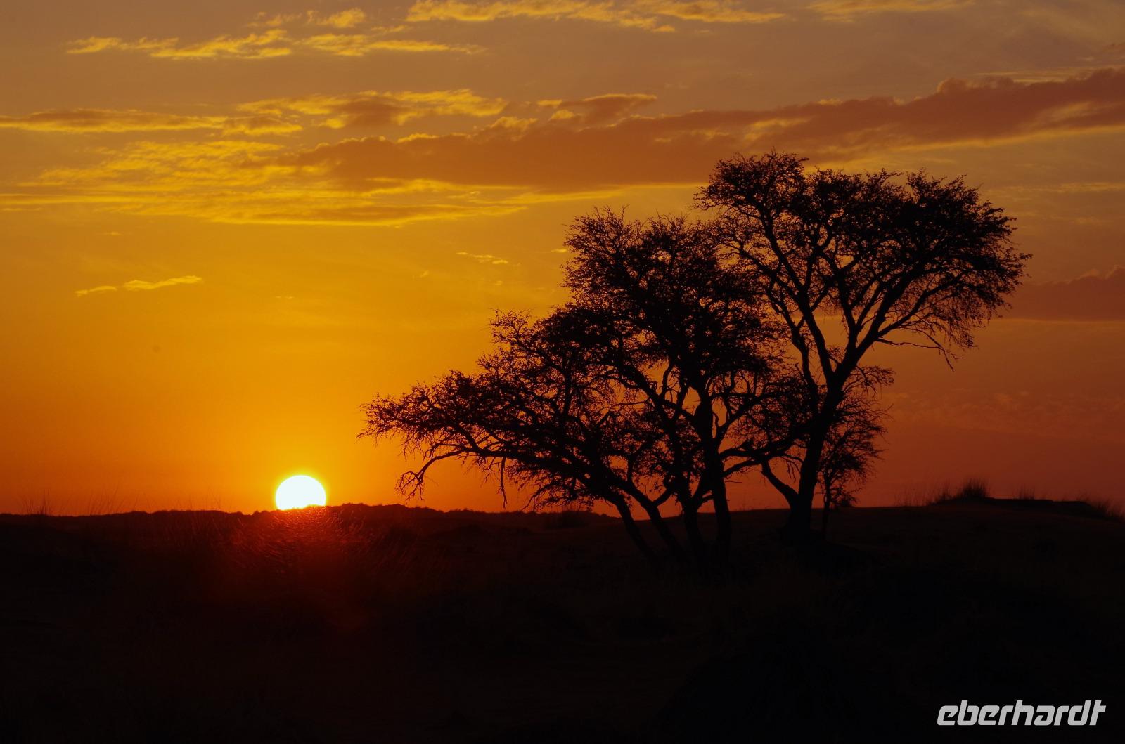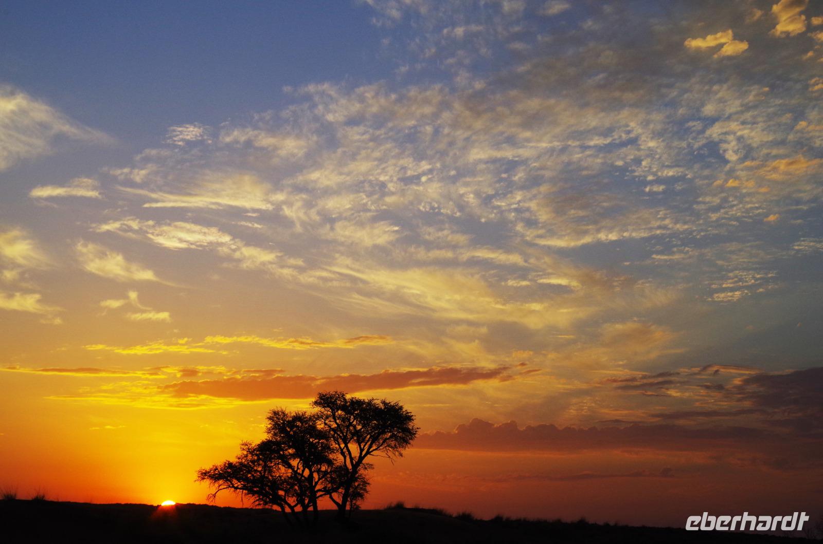 In der Nacht hatte es etwas getröpfelt, aber nun schien die Sonne wieder. Wir genossen nicht nur unser erstes Frühstück, sondern auch den Panoramablick vom Restaurant. Danach beluden wir den Truck und fuhren zunächst zur Maerua Shopping Mall, benannt nach einem immergrünen Baum dieser Gegend. Im hiesigen SuperSpar machten wir einige Besorgungen (Peaceful Sleep und Adapter) und kauften für die Picknicks unterwegs ein.Wir verliessen Windhoek und fuhren entlang der Auas Berge, noch auf Asphalt, Richtung Süden. Wir sahen das Heroe's Acre (Heldenacker) mit seinem weißen Monument, dass als nationales Denkmal den Freiheitskämpfern gewidmet ist. Obwohl in Namibia viele Menschen ohne Arbeit sind und es auch gute Baufirmen im Land gibt, wurde dieses Denkmal von einer nordkoreanischen Firma gebaut... Später erreichten wir die Basterstadt Rehoboth. Als Baster werden die Nachkommen aus den Mischehen zwischen Nama-Frauen und burischen Einwanderen aus der Kapregion bezeichnet. Baster gilt hier übrigens nicht als Schimpfwort, sondern ist ein Ehrentitel. Nach einer TOI-Pause fuhren wir weiter. Das schwarze Asphaltband zog sich schnurgerade durch die Landschaft, typisch für Namibia. Blauer Himmel, gelb-rote Felsen und dürres, ausgetrocknetes Weideland .... Erst jetzt wurde uns so richtig bewusst, wie sehr das Land unter der extremen Trockenheit in diesem Jahr leidet. Von Fritz erfuhren wir, dass Rinderfarmen und private Wildreservate zufüttern müssen, um ein Überleben der Tiere zu sichern. Unterwegs passierten wir den Tropic of Capricorn (südlicher Wendekreis des Steinbocks). Der Gürtel oberhalb, bis zum nördlichen Wendekreis des Krebses, wird als die Tropen bezeichnet. Später bogen wir auf Sand-Pad ab. Pad, so heißen in Namibia die Verkehrswege, egal ob Teer, Schotter oder Sand. Wir sind also immer auf Pad in Namibia. Von weiten entdeckten wir die Ausläufer der Kalahari. In der Kalahari sind die roten Sanddünen wellenförmig, nicht sehr hoch und bewachsen. Rechts und links Dornakazien, Farmland und die typischen Windräder der Wasserpumpen. Am frühen Nachmittag checkten wir in der schönen Kalahari Anib Lodge ein und entspannten ein wenig. An der Wasserstelle der Lodge versammelte sich eine Herde Eland-Antilopen (größte Antilopenart). Am späteren Nachmittag nahmen alle am optional angebotenen Sunset Nature Drive im Jeep teil, einen fuhr Numda und den anderen Fritz. Die 3-stündige Fahrt führte uns durch die sanfte Dünenlandschaft des privaten Gondwana-Parks, welche 10.000 Hektar (100 km²) umfasst. Obwohl auch hier alles sehr dürr und trocken war, boten sich uns wunderschöne Fotomotive. Zwischen den Ästen eines Kameldornbaumes entdeckten wir ein riesiges Nest der Webersiedlervögel (sozialer Wohnungsbau) und versteckt einen Flecken-Uhu. Weiter sahen Giraffen (Schiraffen), Strauße, Weißrückengeier, Streifengnus, Zebras und Oryxe. Auf einer höheren Düne stoppte unser Jeep rechtzeitig zum Sonnenuntergang und eine Bar wurde aufgebaut: Billtong, Trockenwurst, Chips, Nüsse und diverse Getränke - die Auswahl war groß. Schnell hatten wir unser Lieblingsgetränk in der Hand und erfreuten uns an der untergehenden Sonne. Es war einfach fantastisch schön! Am Abend bedienten wir uns auf großen Buffet und ließen den Tag ausklingen. Tagesetappe im Truck: 289 km