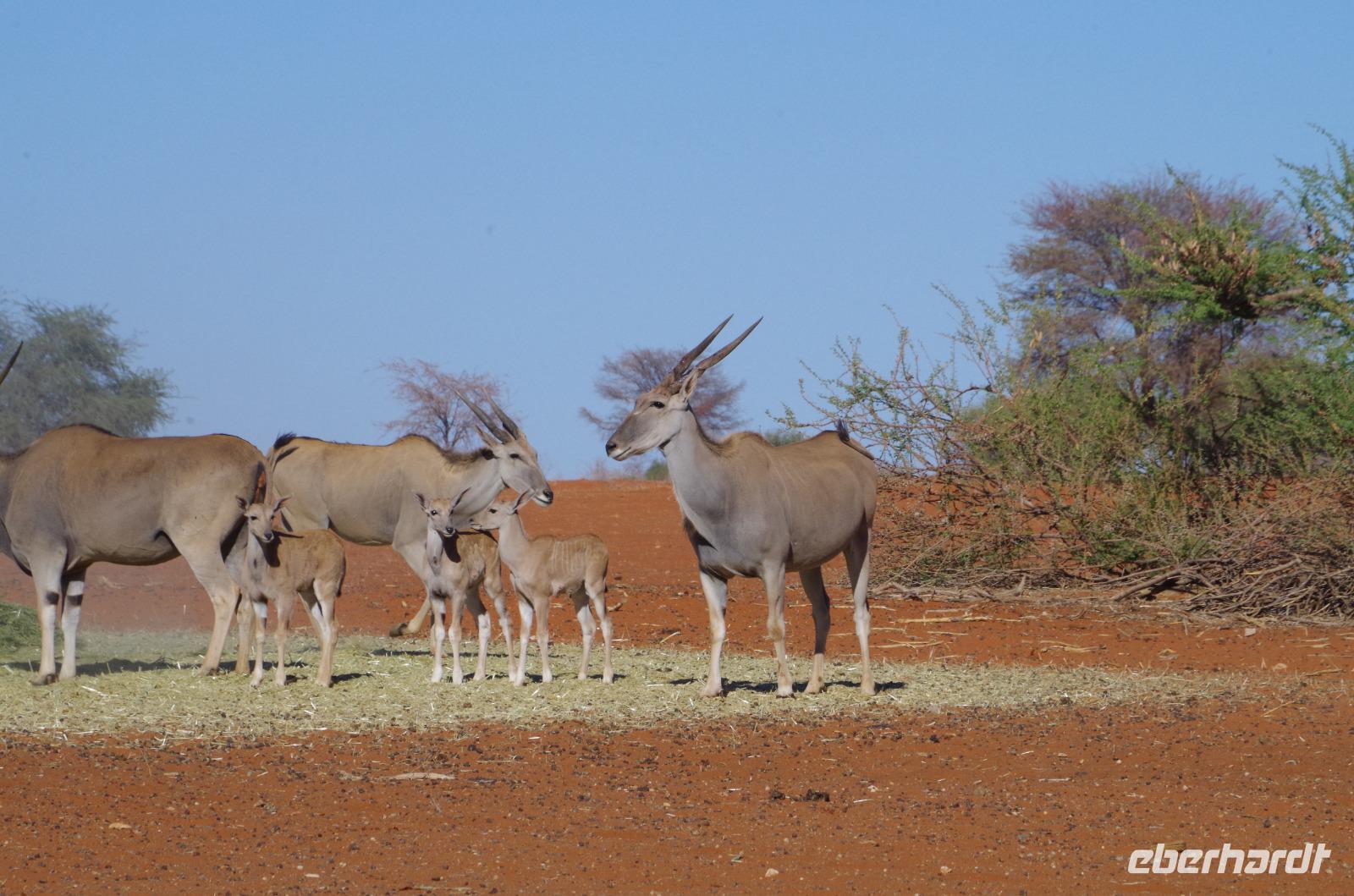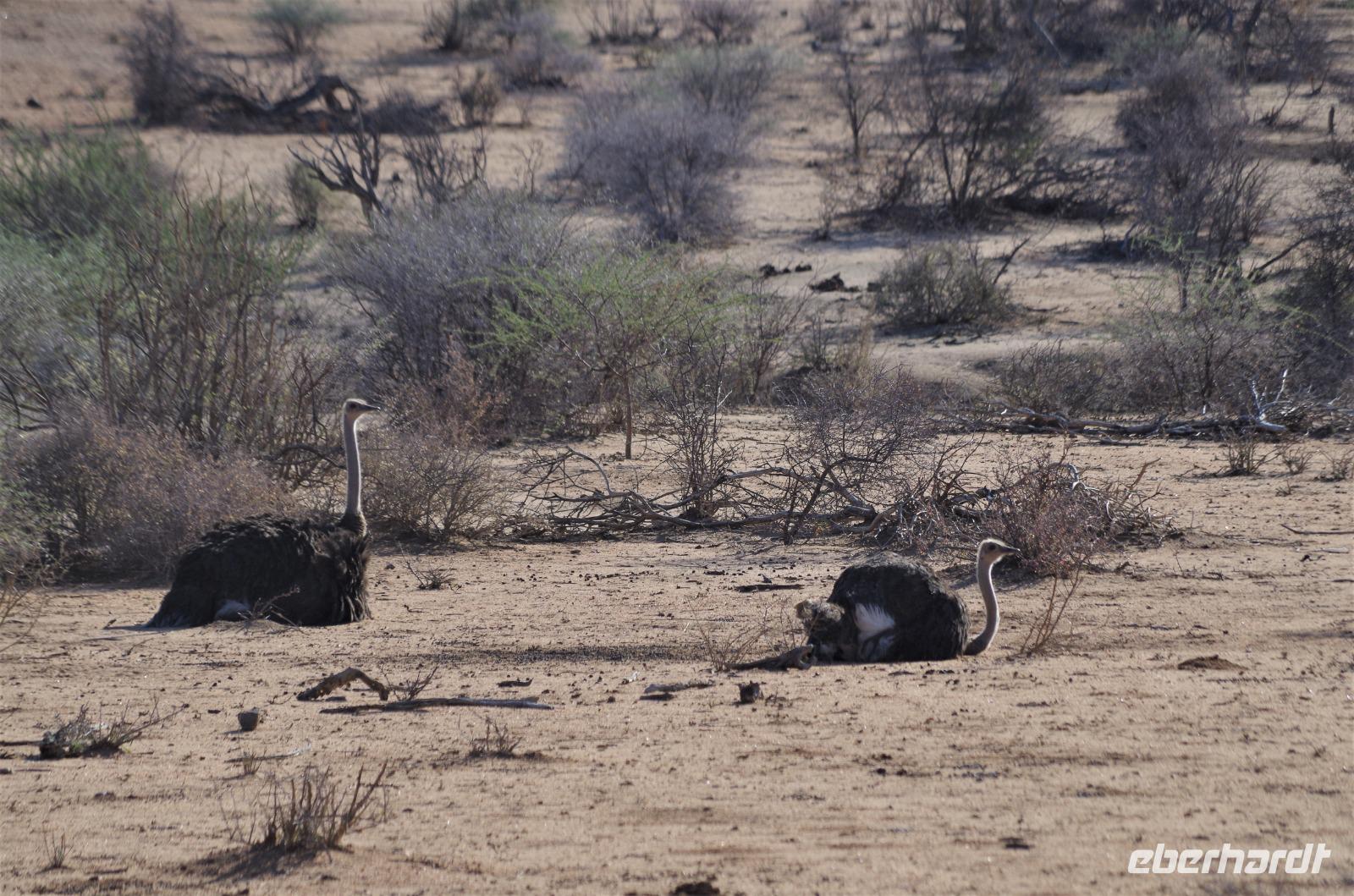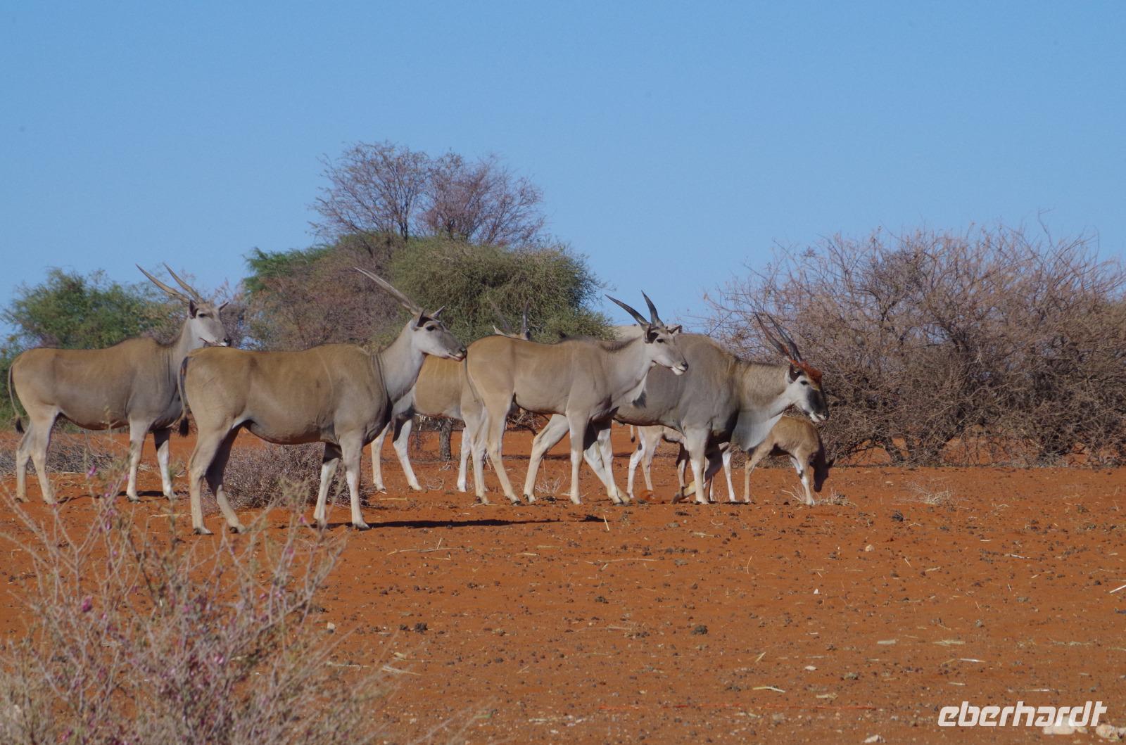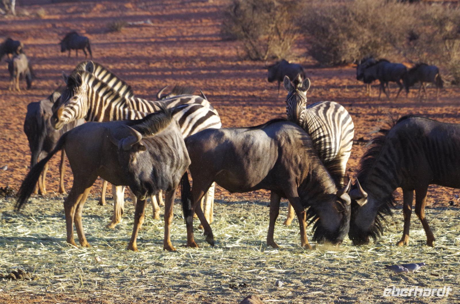 In der Nacht hatte es etwas getröpfelt, aber nun schien die Sonne wieder. Wir genossen nicht nur unser erstes Frühstück, sondern auch den Panoramablick vom Restaurant. Danach beluden wir den Truck und fuhren zunächst zur Maerua Shopping Mall, benannt nach einem immergrünen Baum dieser Gegend. Im hiesigen SuperSpar machten wir einige Besorgungen (Peaceful Sleep und Adapter) und kauften für die Picknicks unterwegs ein.Wir verliessen Windhoek und fuhren entlang der Auas Berge, noch auf Asphalt, Richtung Süden. Wir sahen das Heroe's Acre (Heldenacker) mit seinem weißen Monument, dass als nationales Denkmal den Freiheitskämpfern gewidmet ist. Obwohl in Namibia viele Menschen ohne Arbeit sind und es auch gute Baufirmen im Land gibt, wurde dieses Denkmal von einer nordkoreanischen Firma gebaut... Später erreichten wir die Basterstadt Rehoboth. Als Baster werden die Nachkommen aus den Mischehen zwischen Nama-Frauen und burischen Einwanderen aus der Kapregion bezeichnet. Baster gilt hier übrigens nicht als Schimpfwort, sondern ist ein Ehrentitel. Nach einer TOI-Pause fuhren wir weiter. Das schwarze Asphaltband zog sich schnurgerade durch die Landschaft, typisch für Namibia. Blauer Himmel, gelb-rote Felsen und dürres, ausgetrocknetes Weideland .... Erst jetzt wurde uns so richtig bewusst, wie sehr das Land unter der extremen Trockenheit in diesem Jahr leidet. Von Fritz erfuhren wir, dass Rinderfarmen und private Wildreservate zufüttern müssen, um ein Überleben der Tiere zu sichern. Unterwegs passierten wir den Tropic of Capricorn (südlicher Wendekreis des Steinbocks). Der Gürtel oberhalb, bis zum nördlichen Wendekreis des Krebses, wird als die Tropen bezeichnet. Später bogen wir auf Sand-Pad ab. Pad, so heißen in Namibia die Verkehrswege, egal ob Teer, Schotter oder Sand. Wir sind also immer auf Pad in Namibia. Von weiten entdeckten wir die Ausläufer der Kalahari. In der Kalahari sind die roten Sanddünen wellenförmig, nicht sehr hoch und bewachsen. Rechts und links Dornakazien, Farmland und die typischen Windräder der Wasserpumpen. Am frühen Nachmittag checkten wir in der schönen Kalahari Anib Lodge ein und entspannten ein wenig. An der Wasserstelle der Lodge versammelte sich eine Herde Eland-Antilopen (größte Antilopenart). Am späteren Nachmittag nahmen alle am optional angebotenen Sunset Nature Drive im Jeep teil, einen fuhr Numda und den anderen Fritz. Die 3-stündige Fahrt führte uns durch die sanfte Dünenlandschaft des privaten Gondwana-Parks, welche 10.000 Hektar (100 km²) umfasst. Obwohl auch hier alles sehr dürr und trocken war, boten sich uns wunderschöne Fotomotive. Zwischen den Ästen eines Kameldornbaumes entdeckten wir ein riesiges Nest der Webersiedlervögel (sozialer Wohnungsbau) und versteckt einen Flecken-Uhu. Weiter sahen Giraffen (Schiraffen), Strauße, Weißrückengeier, Streifengnus, Zebras und Oryxe. Auf einer höheren Düne stoppte unser Jeep rechtzeitig zum Sonnenuntergang und eine Bar wurde aufgebaut: Billtong, Trockenwurst, Chips, Nüsse und diverse Getränke - die Auswahl war groß. Schnell hatten wir unser Lieblingsgetränk in der Hand und erfreuten uns an der untergehenden Sonne. Es war einfach fantastisch schön! Am Abend bedienten wir uns auf großen Buffet und ließen den Tag ausklingen. Tagesetappe im Truck: 289 km