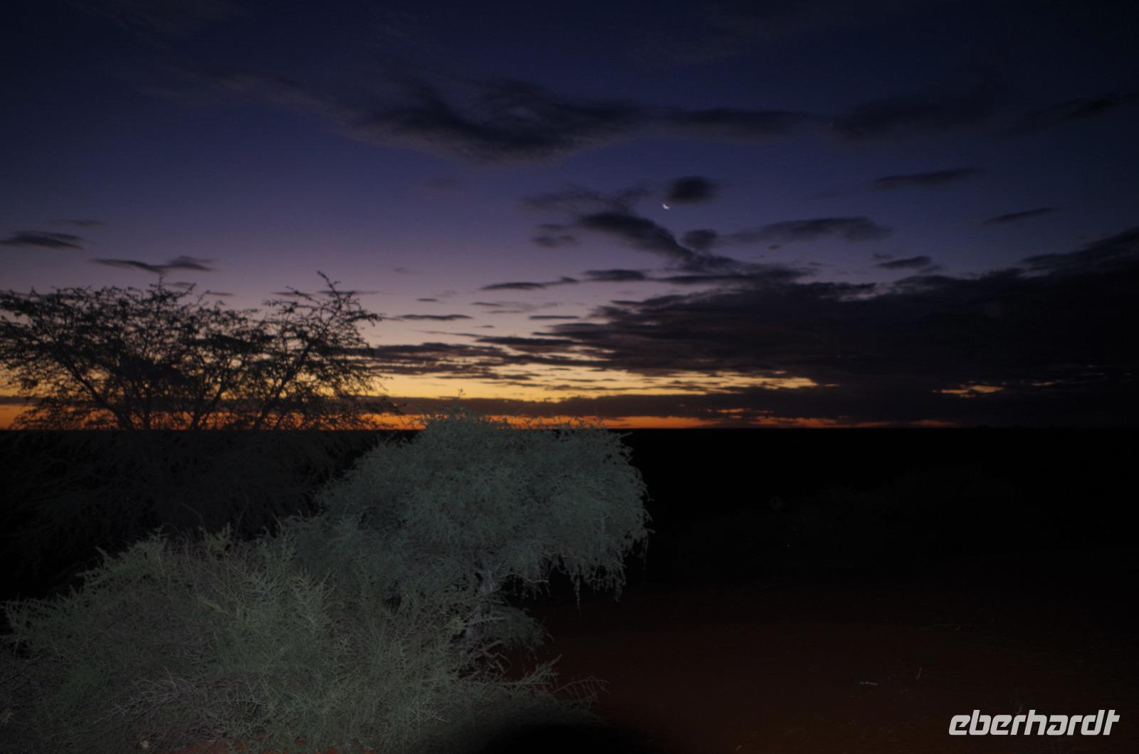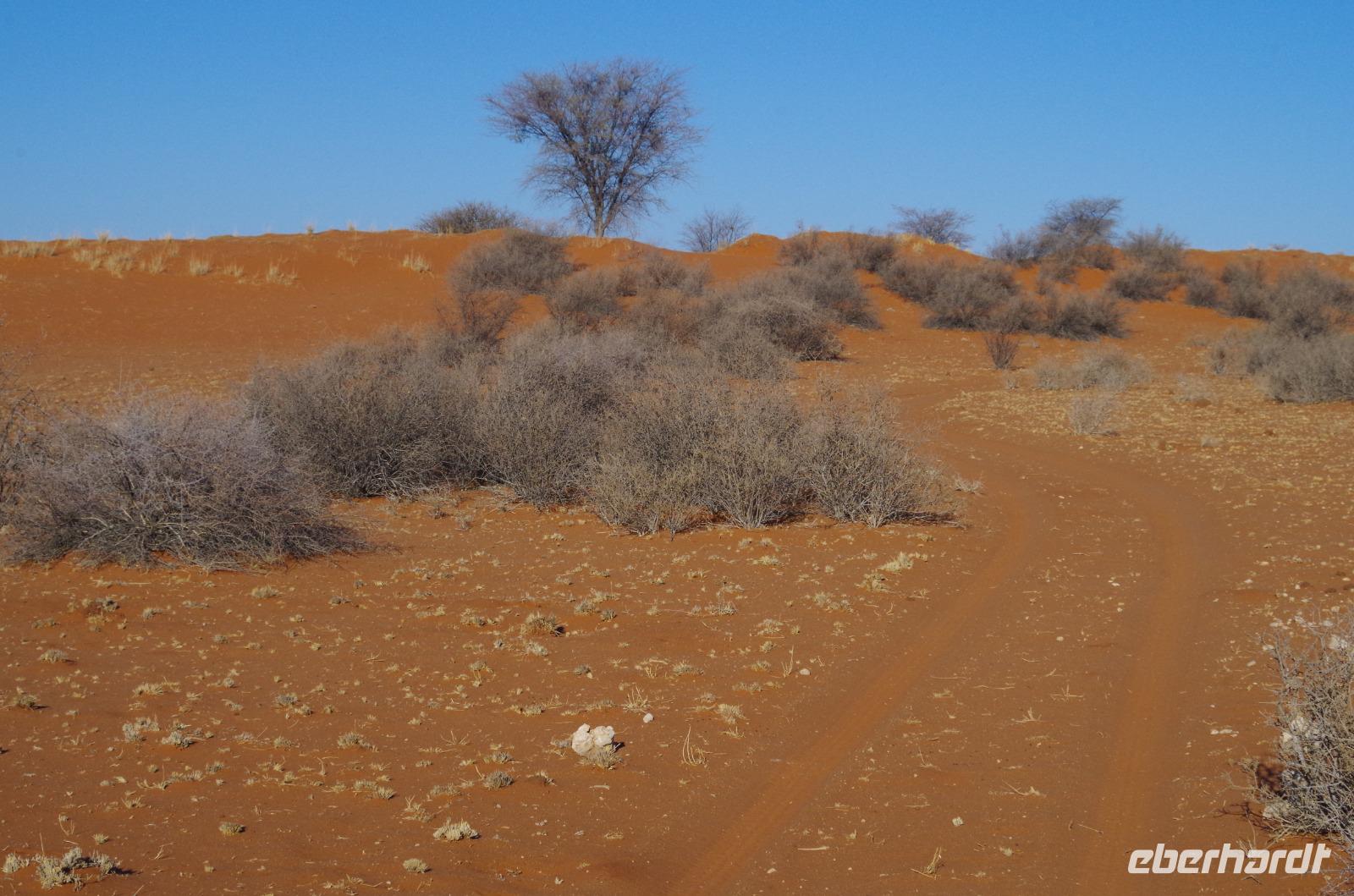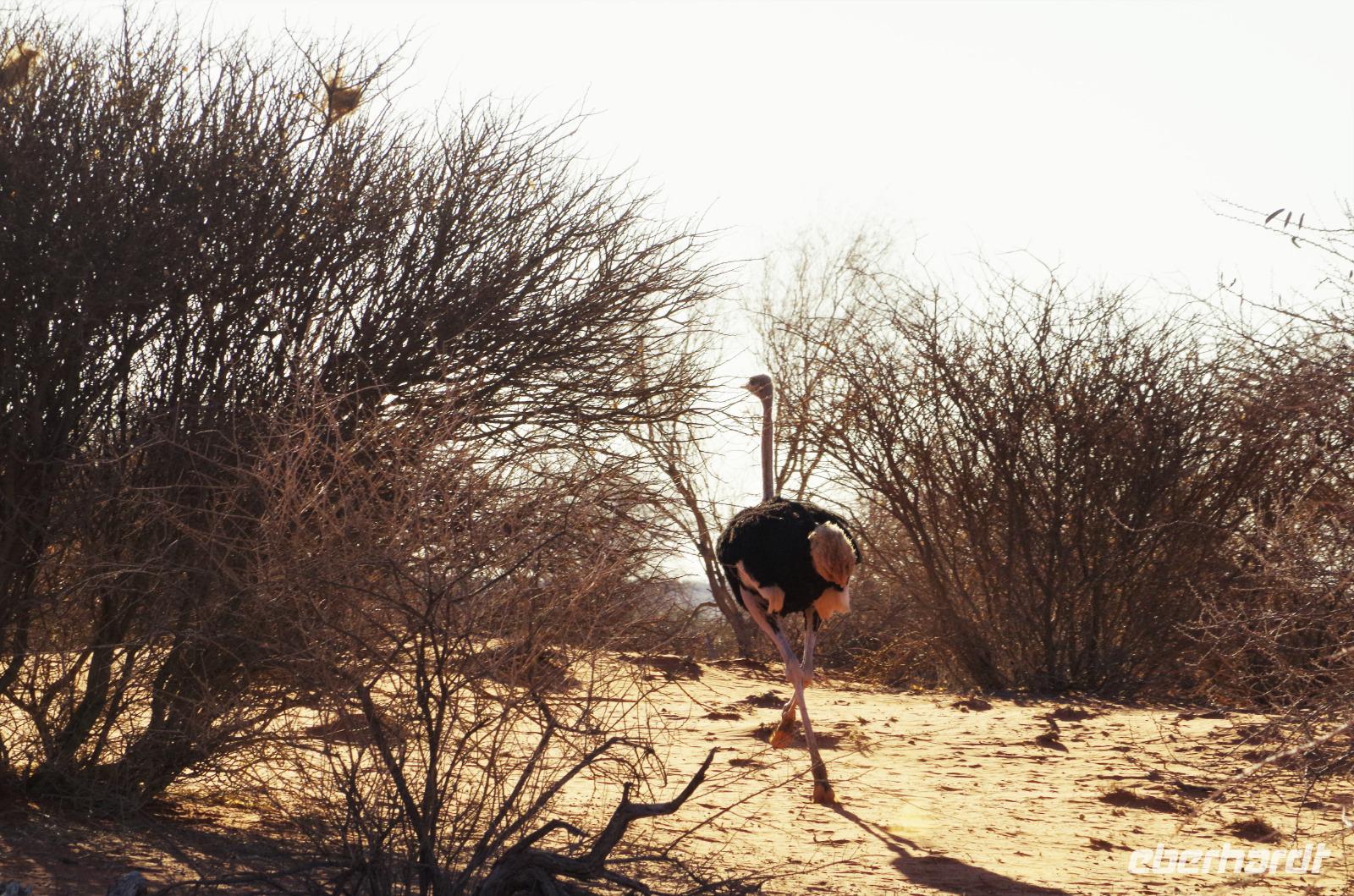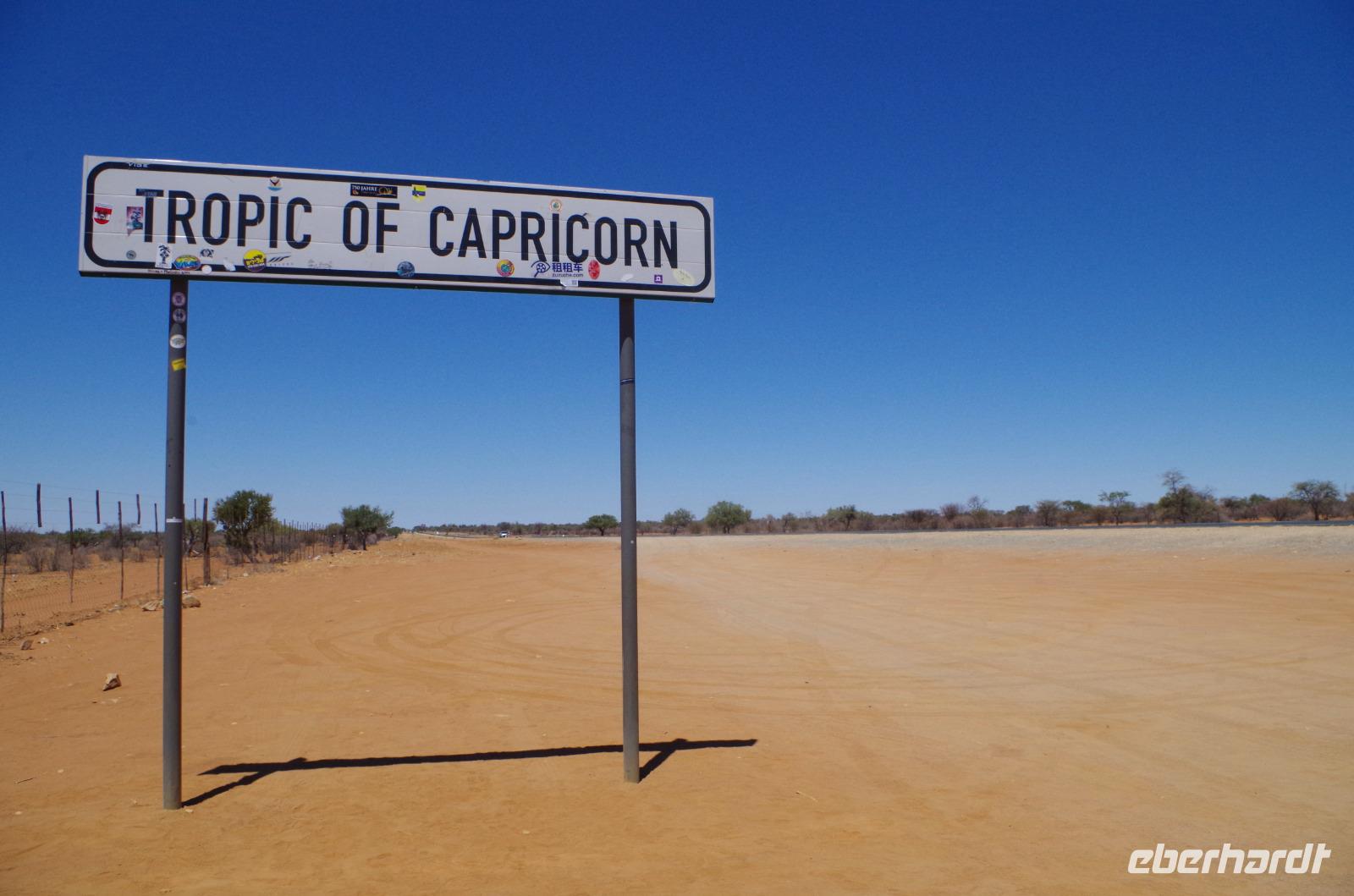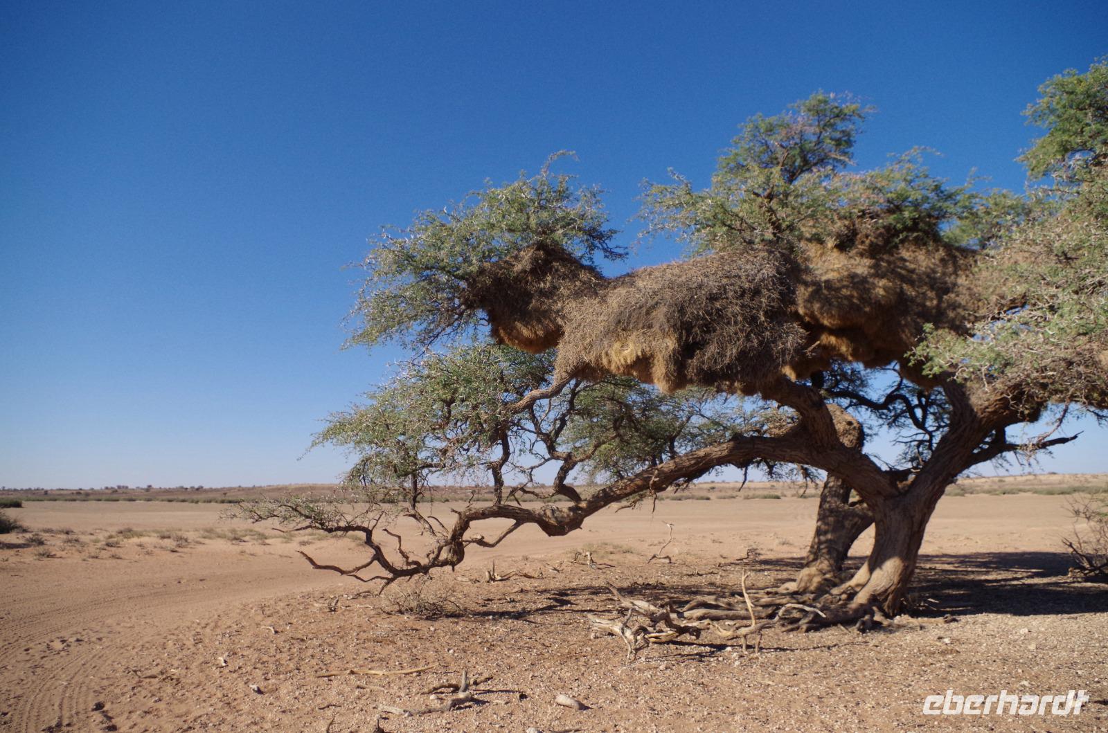 In der Nacht hatte es etwas getröpfelt, aber nun schien die Sonne wieder. Wir genossen nicht nur unser erstes Frühstück, sondern auch den Panoramablick vom Restaurant. Danach beluden wir den Truck und fuhren zunächst zur Maerua Shopping Mall, benannt nach einem immergrünen Baum dieser Gegend. Im hiesigen SuperSpar machten wir einige Besorgungen (Peaceful Sleep und Adapter) und kauften für die Picknicks unterwegs ein.Wir verliessen Windhoek und fuhren entlang der Auas Berge, noch auf Asphalt, Richtung Süden. Wir sahen das Heroe's Acre (Heldenacker) mit seinem weißen Monument, dass als nationales Denkmal den Freiheitskämpfern gewidmet ist. Obwohl in Namibia viele Menschen ohne Arbeit sind und es auch gute Baufirmen im Land gibt, wurde dieses Denkmal von einer nordkoreanischen Firma gebaut... Später erreichten wir die Basterstadt Rehoboth. Als Baster werden die Nachkommen aus den Mischehen zwischen Nama-Frauen und burischen Einwanderen aus der Kapregion bezeichnet. Baster gilt hier übrigens nicht als Schimpfwort, sondern ist ein Ehrentitel. Nach einer TOI-Pause fuhren wir weiter. Das schwarze Asphaltband zog sich schnurgerade durch die Landschaft, typisch für Namibia. Blauer Himmel, gelb-rote Felsen und dürres, ausgetrocknetes Weideland .... Erst jetzt wurde uns so richtig bewusst, wie sehr das Land unter der extremen Trockenheit in diesem Jahr leidet. Von Fritz erfuhren wir, dass Rinderfarmen und private Wildreservate zufüttern müssen, um ein Überleben der Tiere zu sichern. Unterwegs passierten wir den Tropic of Capricorn (südlicher Wendekreis des Steinbocks). Der Gürtel oberhalb, bis zum nördlichen Wendekreis des Krebses, wird als die Tropen bezeichnet. Später bogen wir auf Sand-Pad ab. Pad, so heißen in Namibia die Verkehrswege, egal ob Teer, Schotter oder Sand. Wir sind also immer auf Pad in Namibia. Von weiten entdeckten wir die Ausläufer der Kalahari. In der Kalahari sind die roten Sanddünen wellenförmig, nicht sehr hoch und bewachsen. Rechts und links Dornakazien, Farmland und die typischen Windräder der Wasserpumpen. Am frühen Nachmittag checkten wir in der schönen Kalahari Anib Lodge ein und entspannten ein wenig. An der Wasserstelle der Lodge versammelte sich eine Herde Eland-Antilopen (größte Antilopenart). Am späteren Nachmittag nahmen alle am optional angebotenen Sunset Nature Drive im Jeep teil, einen fuhr Numda und den anderen Fritz. Die 3-stündige Fahrt führte uns durch die sanfte Dünenlandschaft des privaten Gondwana-Parks, welche 10.000 Hektar (100 km²) umfasst. Obwohl auch hier alles sehr dürr und trocken war, boten sich uns wunderschöne Fotomotive. Zwischen den Ästen eines Kameldornbaumes entdeckten wir ein riesiges Nest der Webersiedlervögel (sozialer Wohnungsbau) und versteckt einen Flecken-Uhu. Weiter sahen Giraffen (Schiraffen), Strauße, Weißrückengeier, Streifengnus, Zebras und Oryxe. Auf einer höheren Düne stoppte unser Jeep rechtzeitig zum Sonnenuntergang und eine Bar wurde aufgebaut: Billtong, Trockenwurst, Chips, Nüsse und diverse Getränke - die Auswahl war groß. Schnell hatten wir unser Lieblingsgetränk in der Hand und erfreuten uns an der untergehenden Sonne. Es war einfach fantastisch schön! Am Abend bedienten wir uns auf großen Buffet und ließen den Tag ausklingen. Tagesetappe im Truck: 289 km