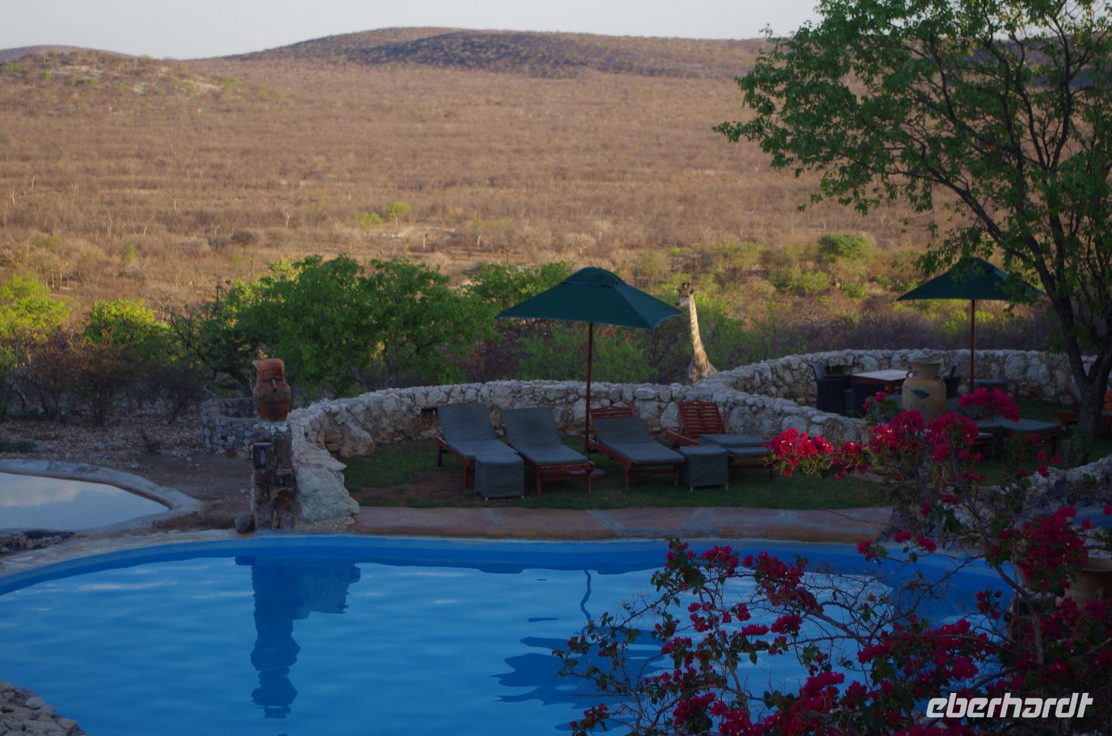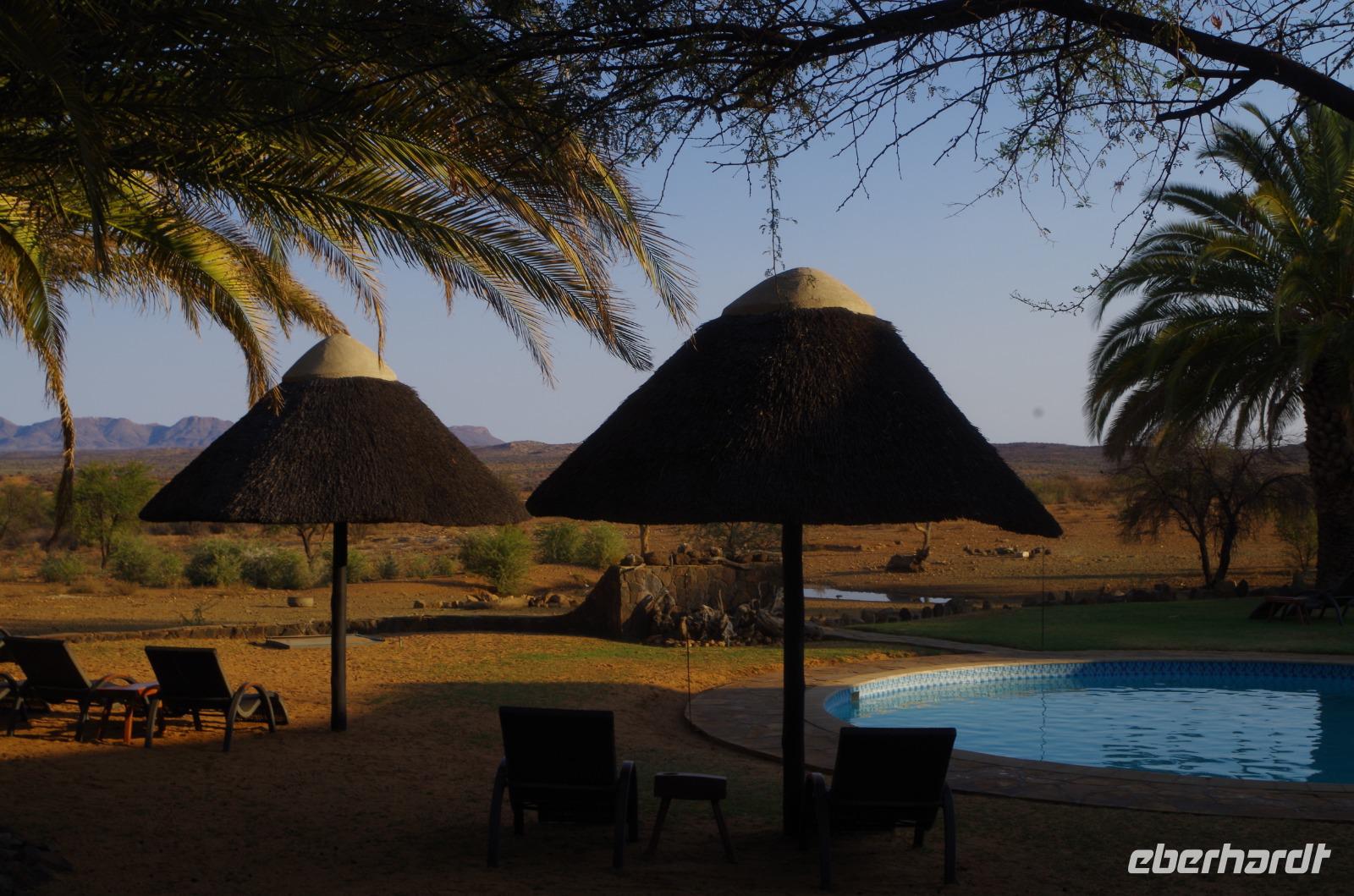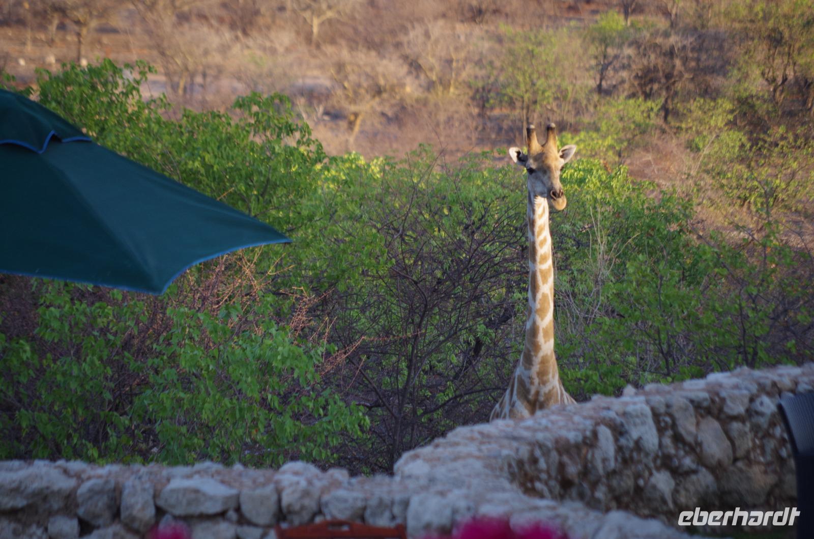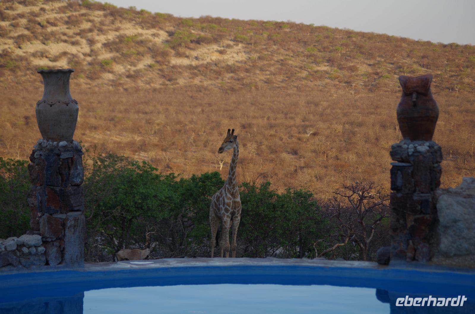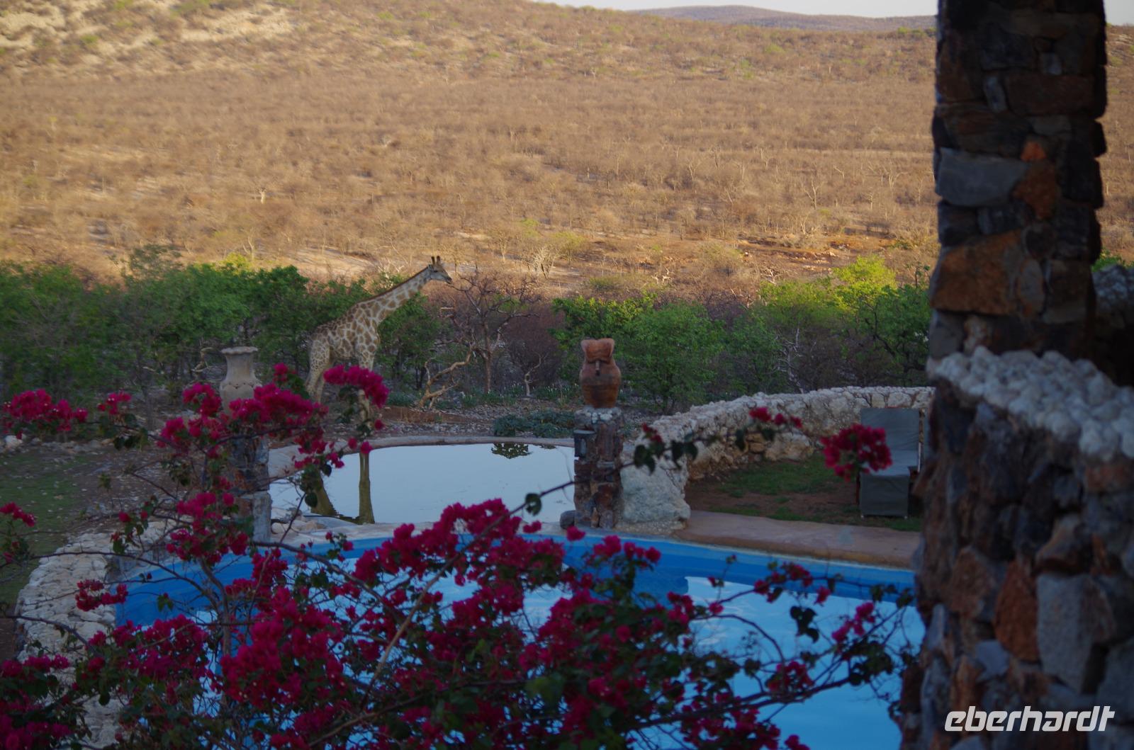 Nach dem Frühstück fuhren wir wieder in südliche Richtung. Wir passierten wir den Veterinärzaun, der sich wie eine rote Linie quer durch Namibia, Botswana und Simbabwe zieht. Eine freundliche Beamtin kontrollierte unsere Vorräte, den der Transport von Fleisch und anderen tierrischen Produkten ist verboten. Via Kamanjab truckten wir wiederum durch Farmgebiet, bis wir das Eoaacha Game Reserve erreichten. Hier wurden wir zugleich von Giraffen begrüßt. Von weiten sahen wir bereits die Eagle Tented Lodge, deren Zelt-Chaltes sich entlang der Bergkette schlängeln. Die Zelte waren komfortabel ausgestattet: Eigene Terrasse mit Ausblick (einige mit Außen-Badewanne), Himmelbett mit Moskitonetz sowie Bad en-suite. An diesem Tag war es wieder ungewöhnlich heiß, über 45 °C und kein Windchen, obwohl wir ober auf dem Berg waren. Entsprechend kuschlig war es in unseren Zelten. Warmes Wasser hatten wir auch ausreichend?? Eine Abkühlung versprach nur das Pool am Hauptgebäude der Lodge, dass einem Dornröschenschloss ähnelte. Auf der Gartenterrasse wurde Kaffee und Kuchen serviert. Abends traf man sich auf einen Sundowner und Giraffen waren auch zu Gast. Denn direkt davor, war eine Wasserstelle, die von den Tieren in dieser Dürre gern genutzt wurde. Ja, Giraffen oder besser Schiraffen gab es hier unzählige. Sie spazierten einfach durch das Gelände, vor unseren Augen. Tagesetappe: 450 km