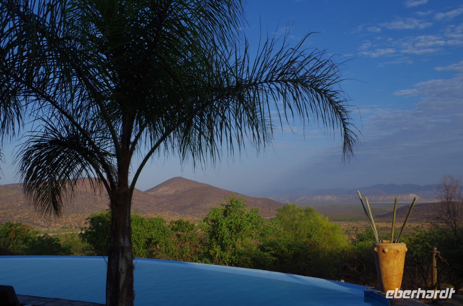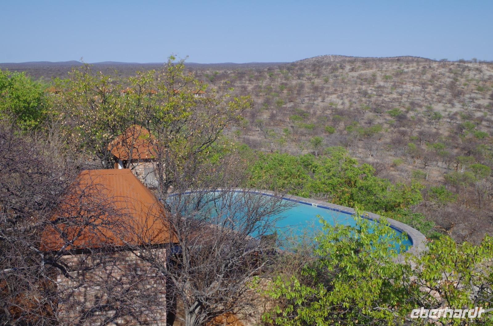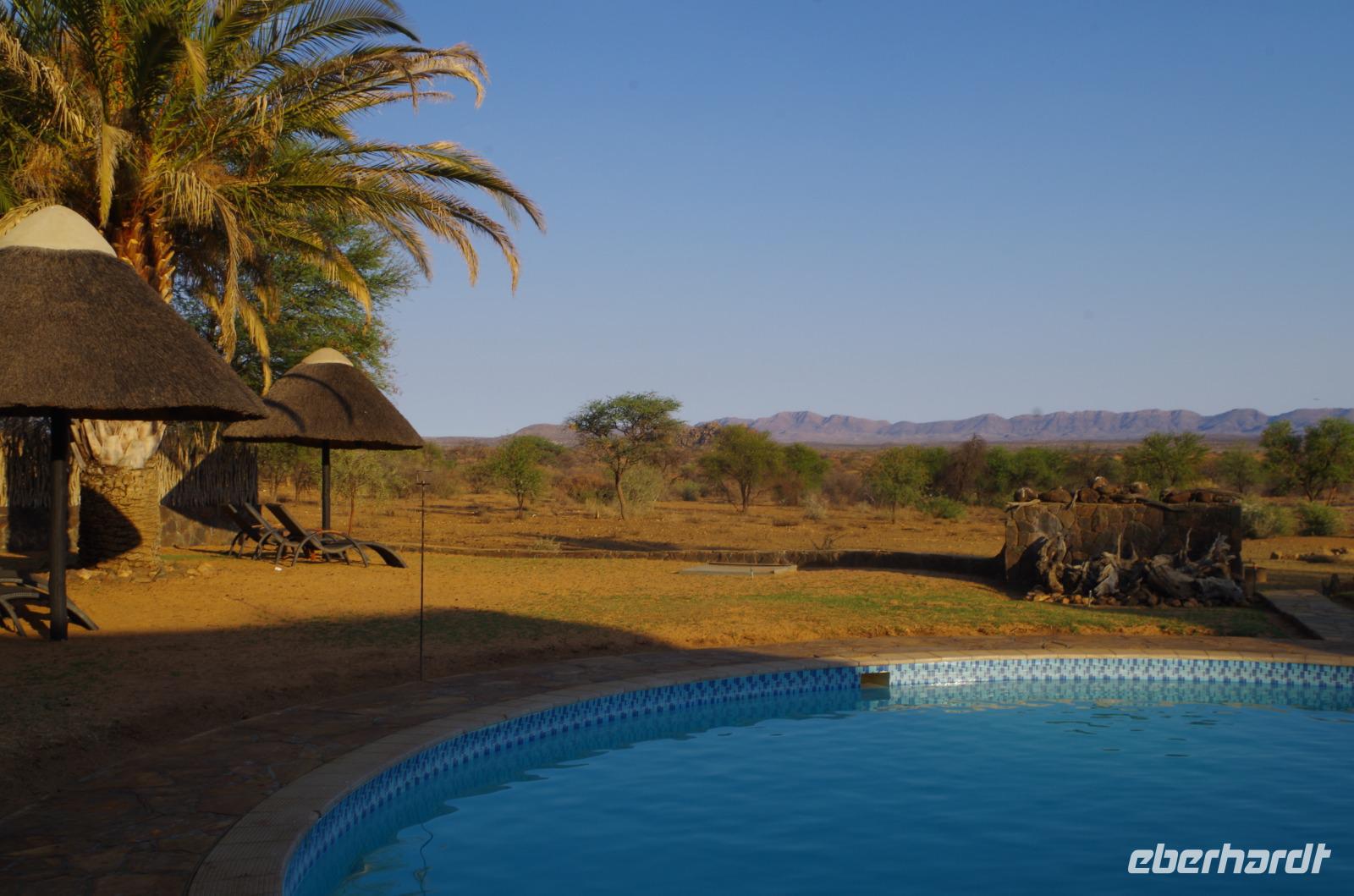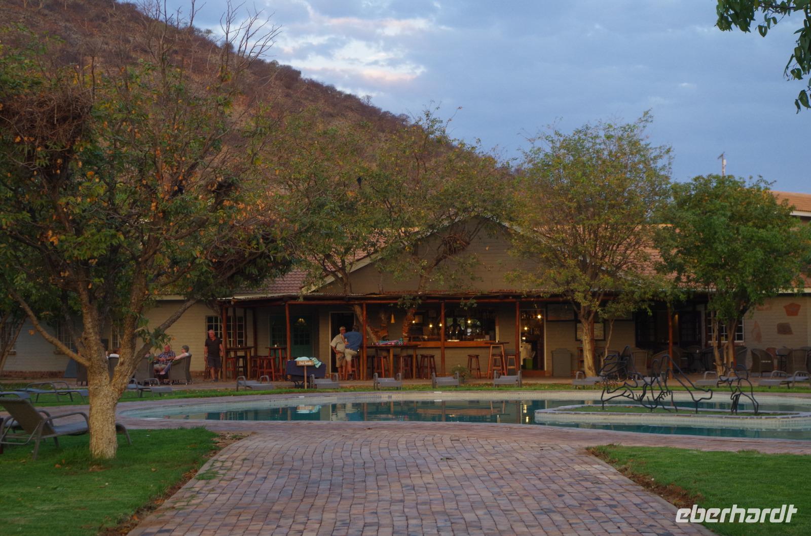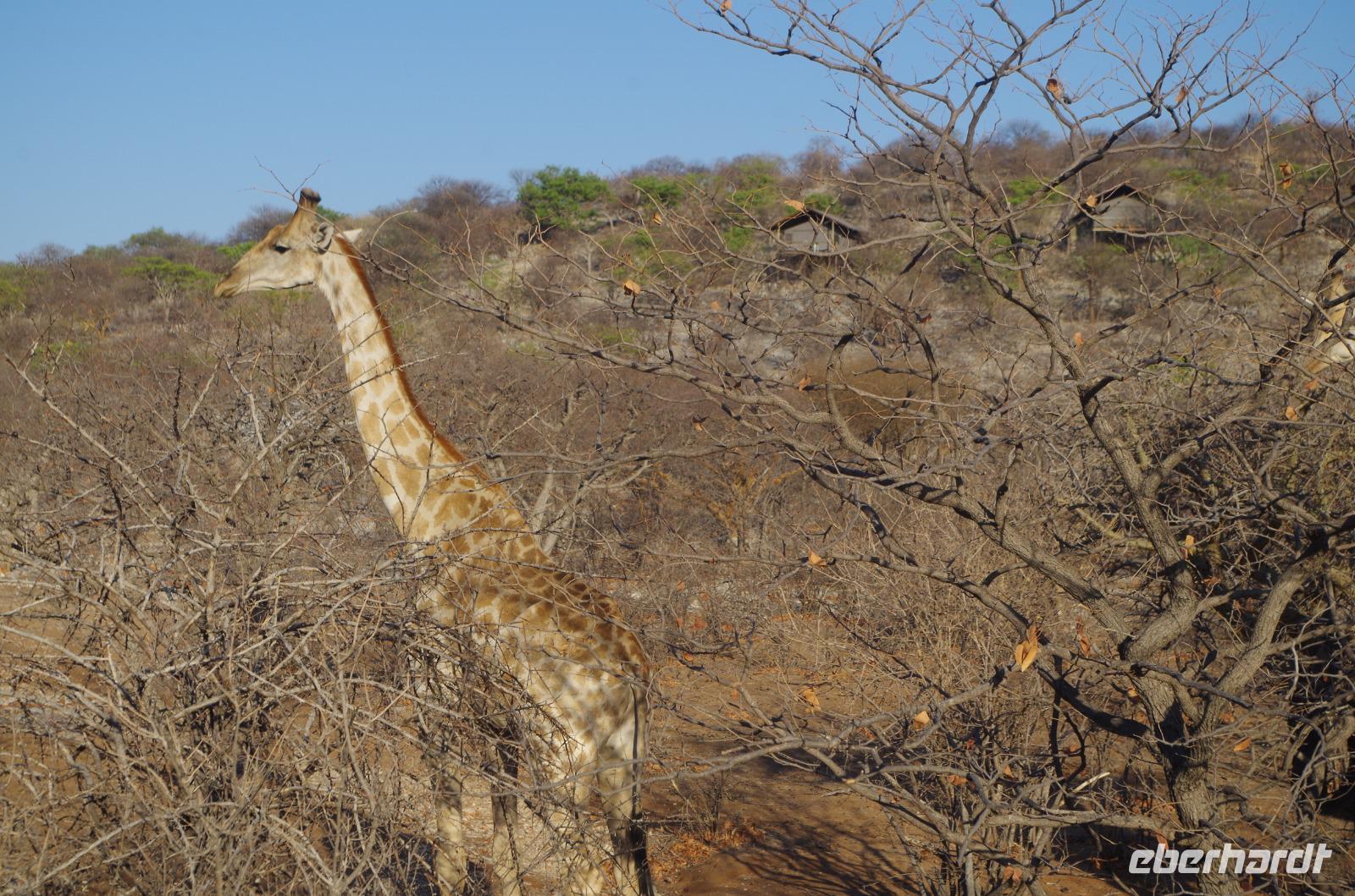Nach dem Frühstück fuhren wir wieder in südliche Richtung. Wir passierten wir den Veterinärzaun, der sich wie eine rote Linie quer durch Namibia, Botswana und Simbabwe zieht. Eine freundliche Beamtin kontrollierte unsere Vorräte, den der Transport von Fleisch und anderen tierrischen Produkten ist verboten. Via Kamanjab truckten wir wiederum durch Farmgebiet, bis wir das Eoaacha Game Reserve erreichten. Hier wurden wir zugleich von Giraffen begrüßt. Von weiten sahen wir bereits die Eagle Tented Lodge, deren Zelt-Chaltes sich entlang der Bergkette schlängeln. Die Zelte waren komfortabel ausgestattet: Eigene Terrasse mit Ausblick (einige mit Außen-Badewanne), Himmelbett mit Moskitonetz sowie Bad en-suite. An diesem Tag war es wieder ungewöhnlich heiß, über 45 °C und kein Windchen, obwohl wir ober auf dem Berg waren. Entsprechend kuschlig war es in unseren Zelten. Warmes Wasser hatten wir auch ausreichend?? Eine Abkühlung versprach nur das Pool am Hauptgebäude der Lodge, dass einem Dornröschenschloss ähnelte. Auf der Gartenterrasse wurde Kaffee und Kuchen serviert. Abends traf man sich auf einen Sundowner und Giraffen waren auch zu Gast. Denn direkt davor, war eine Wasserstelle, die von den Tieren in dieser Dürre gern genutzt wurde. Ja, Giraffen oder besser Schiraffen gab es hier unzählige. Sie spazierten einfach durch das Gelände, vor unseren Augen. Tagesetappe: 450 km