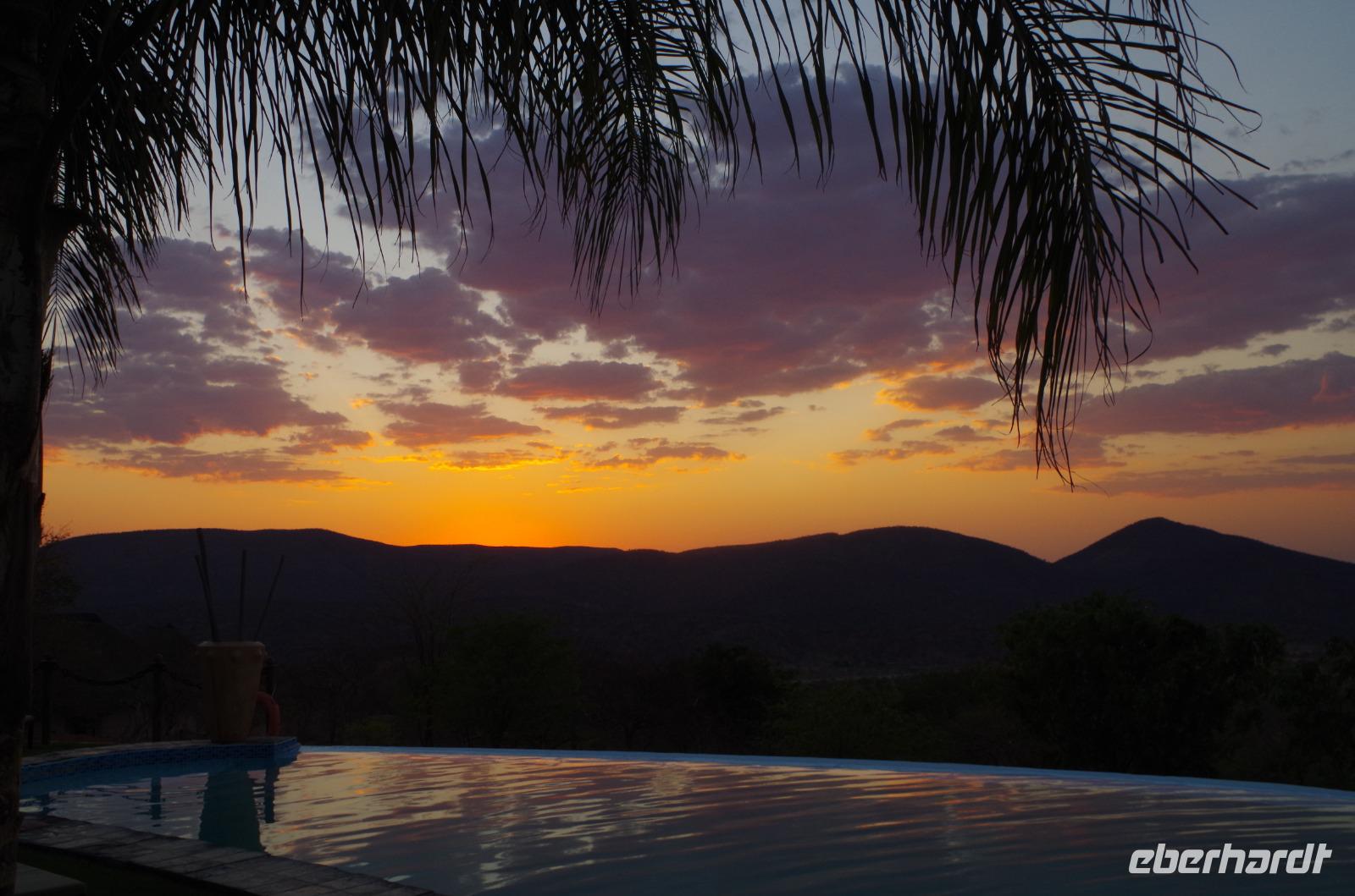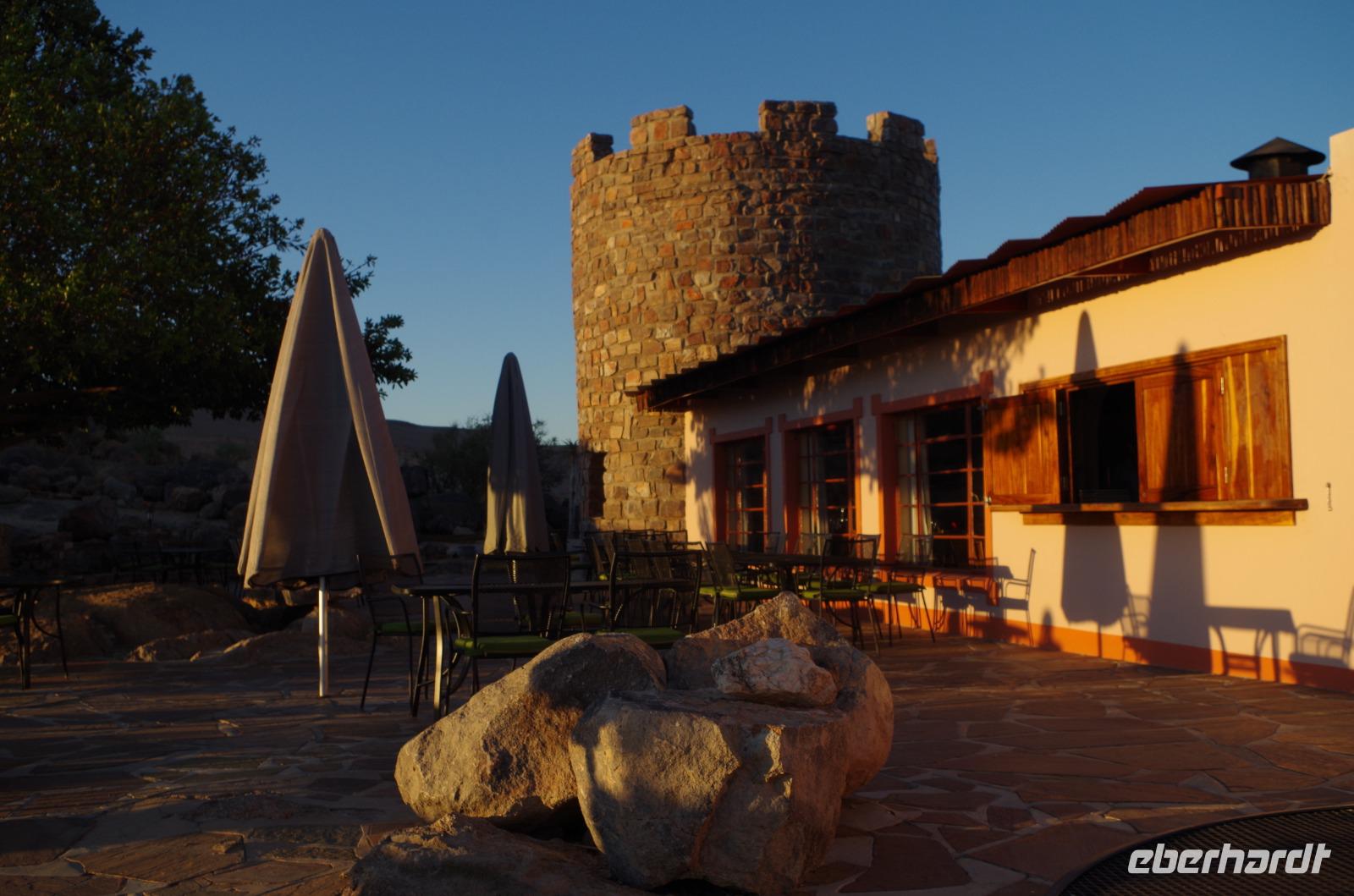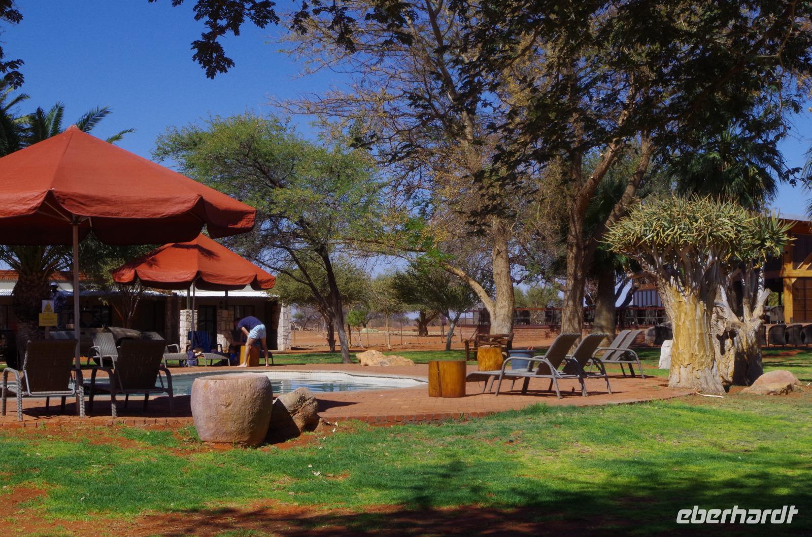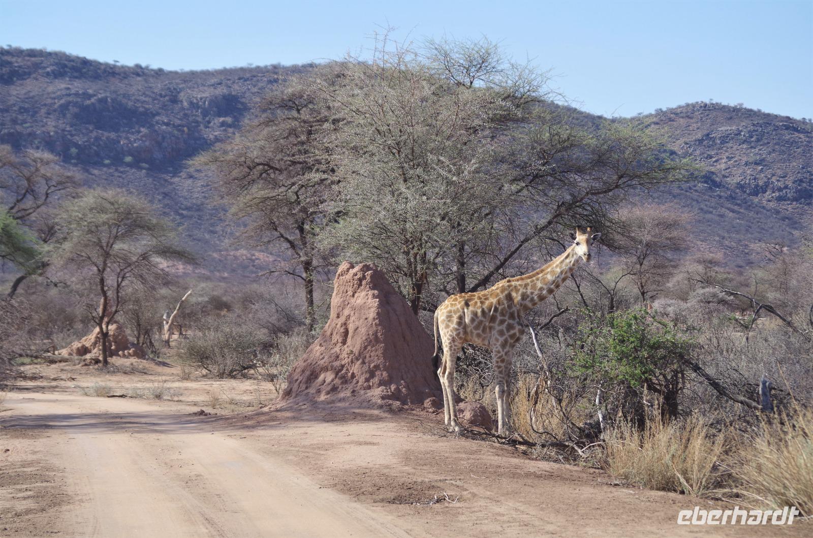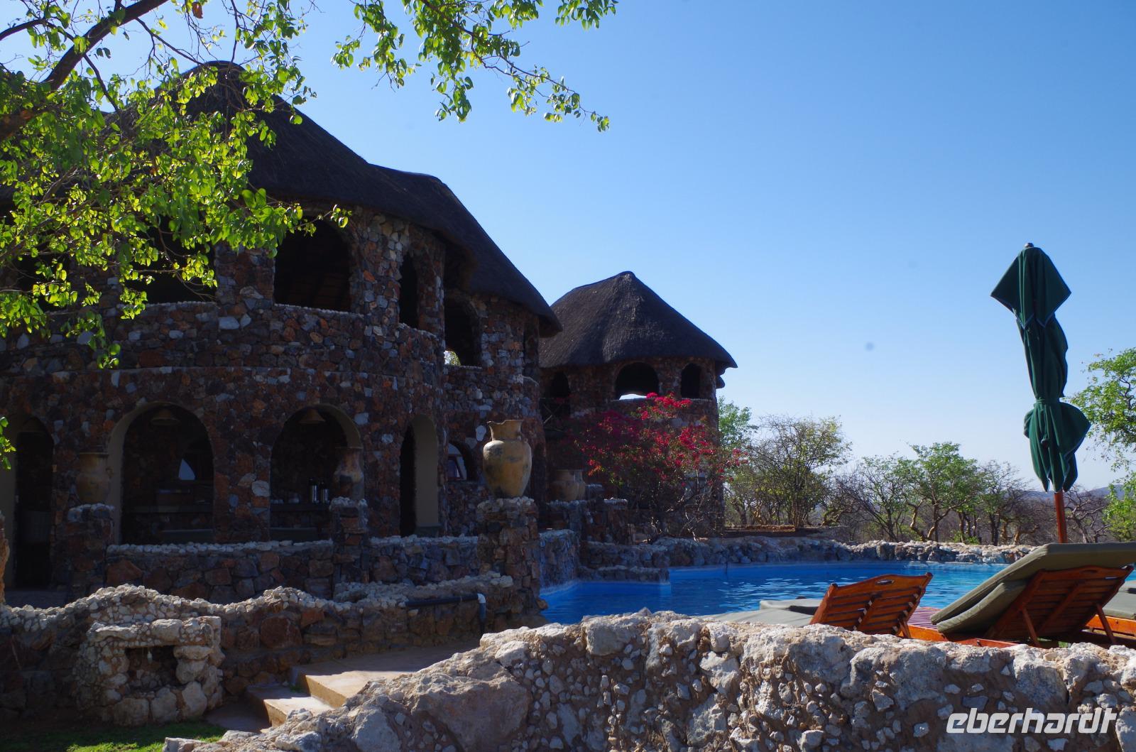 Nach dem Frühstück fuhren wir wieder in südliche Richtung. Wir passierten wir den Veterinärzaun, der sich wie eine rote Linie quer durch Namibia, Botswana und Simbabwe zieht. Eine freundliche Beamtin kontrollierte unsere Vorräte, den der Transport von Fleisch und anderen tierrischen Produkten ist verboten. Via Kamanjab truckten wir wiederum durch Farmgebiet, bis wir das Eoaacha Game Reserve erreichten. Hier wurden wir zugleich von Giraffen begrüßt. Von weiten sahen wir bereits die Eagle Tented Lodge, deren Zelt-Chaltes sich entlang der Bergkette schlängeln. Die Zelte waren komfortabel ausgestattet: Eigene Terrasse mit Ausblick (einige mit Außen-Badewanne), Himmelbett mit Moskitonetz sowie Bad en-suite. An diesem Tag war es wieder ungewöhnlich heiß, über 45 °C und kein Windchen, obwohl wir ober auf dem Berg waren. Entsprechend kuschlig war es in unseren Zelten. Warmes Wasser hatten wir auch ausreichend?? Eine Abkühlung versprach nur das Pool am Hauptgebäude der Lodge, dass einem Dornröschenschloss ähnelte. Auf der Gartenterrasse wurde Kaffee und Kuchen serviert. Abends traf man sich auf einen Sundowner und Giraffen waren auch zu Gast. Denn direkt davor, war eine Wasserstelle, die von den Tieren in dieser Dürre gern genutzt wurde. Ja, Giraffen oder besser Schiraffen gab es hier unzählige. Sie spazierten einfach durch das Gelände, vor unseren Augen. Tagesetappe: 450 km