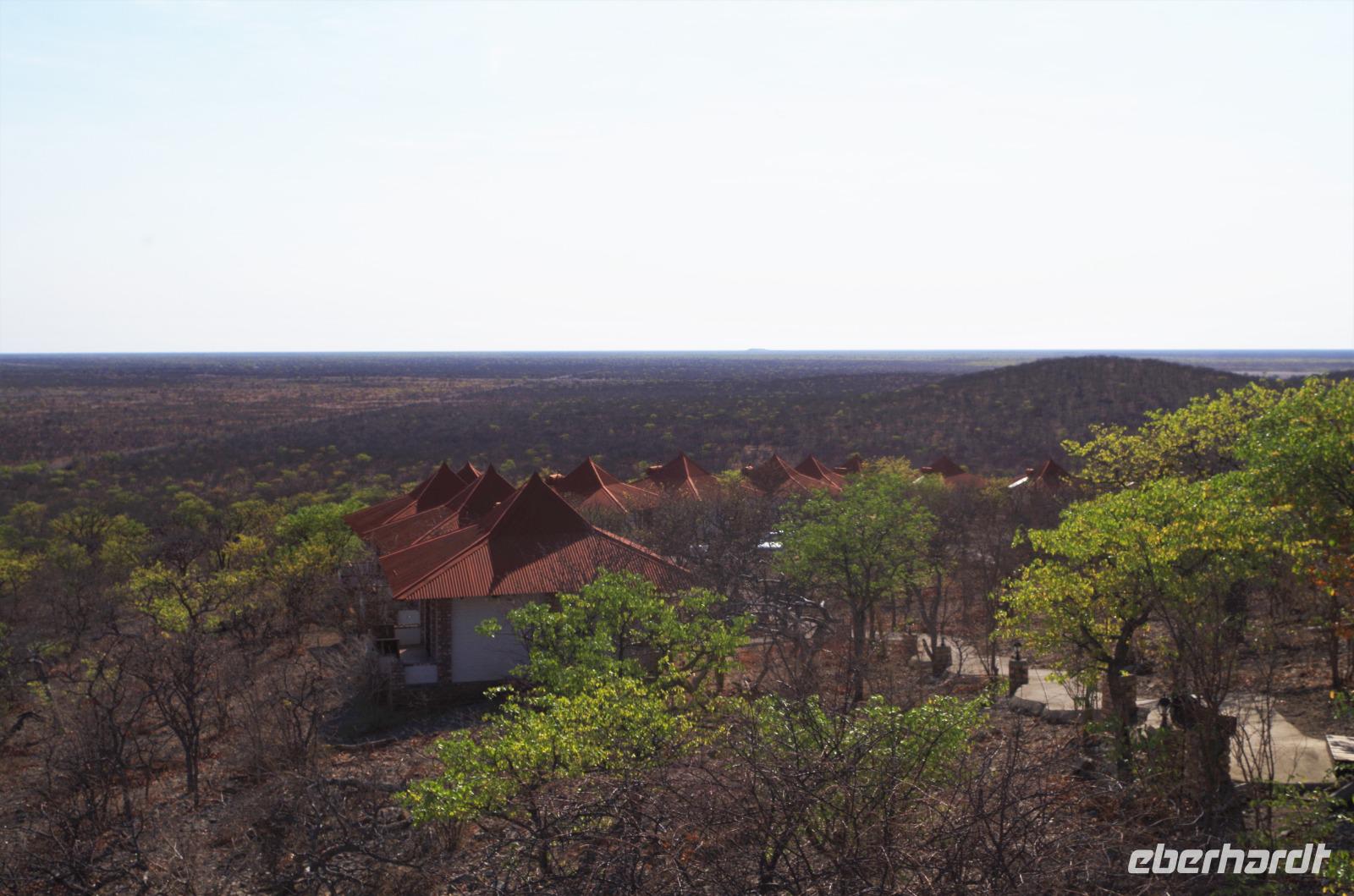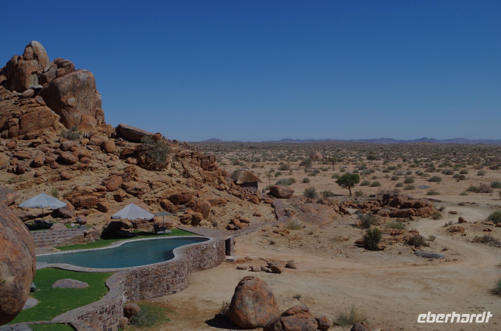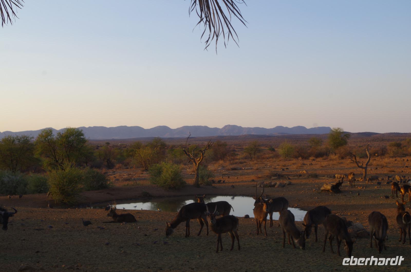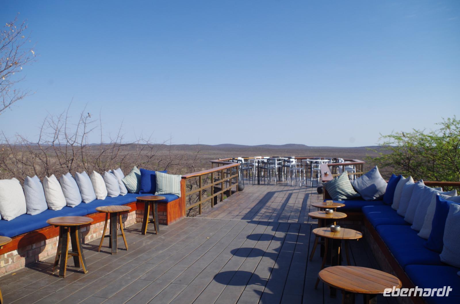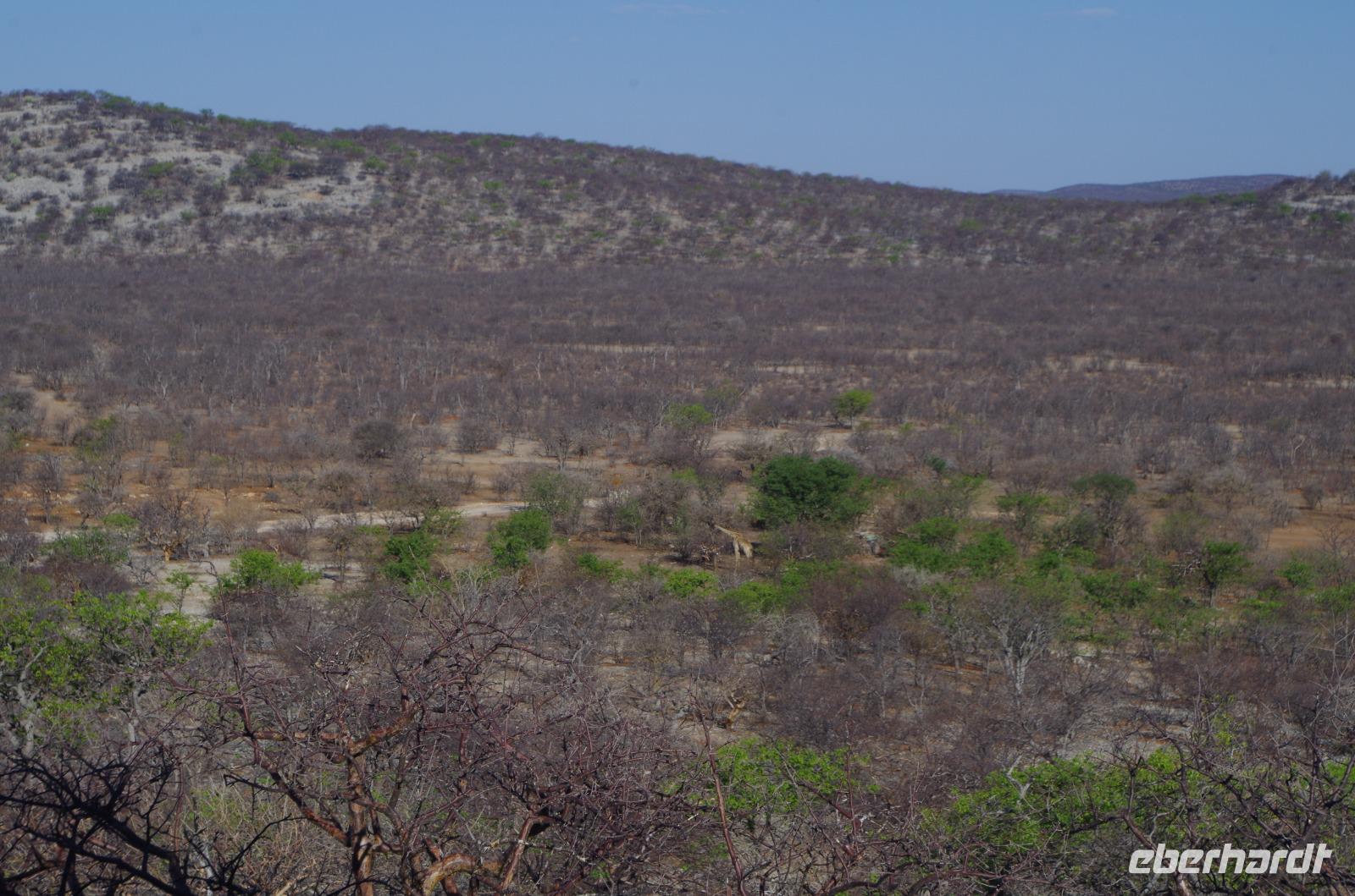 Nach dem Frühstück fuhren wir wieder in südliche Richtung. Wir passierten wir den Veterinärzaun, der sich wie eine rote Linie quer durch Namibia, Botswana und Simbabwe zieht. Eine freundliche Beamtin kontrollierte unsere Vorräte, den der Transport von Fleisch und anderen tierrischen Produkten ist verboten. Via Kamanjab truckten wir wiederum durch Farmgebiet, bis wir das Eoaacha Game Reserve erreichten. Hier wurden wir zugleich von Giraffen begrüßt. Von weiten sahen wir bereits die Eagle Tented Lodge, deren Zelt-Chaltes sich entlang der Bergkette schlängeln. Die Zelte waren komfortabel ausgestattet: Eigene Terrasse mit Ausblick (einige mit Außen-Badewanne), Himmelbett mit Moskitonetz sowie Bad en-suite. An diesem Tag war es wieder ungewöhnlich heiß, über 45 °C und kein Windchen, obwohl wir ober auf dem Berg waren. Entsprechend kuschlig war es in unseren Zelten. Warmes Wasser hatten wir auch ausreichend?? Eine Abkühlung versprach nur das Pool am Hauptgebäude der Lodge, dass einem Dornröschenschloss ähnelte. Auf der Gartenterrasse wurde Kaffee und Kuchen serviert. Abends traf man sich auf einen Sundowner und Giraffen waren auch zu Gast. Denn direkt davor, war eine Wasserstelle, die von den Tieren in dieser Dürre gern genutzt wurde. Ja, Giraffen oder besser Schiraffen gab es hier unzählige. Sie spazierten einfach durch das Gelände, vor unseren Augen. Tagesetappe: 450 km