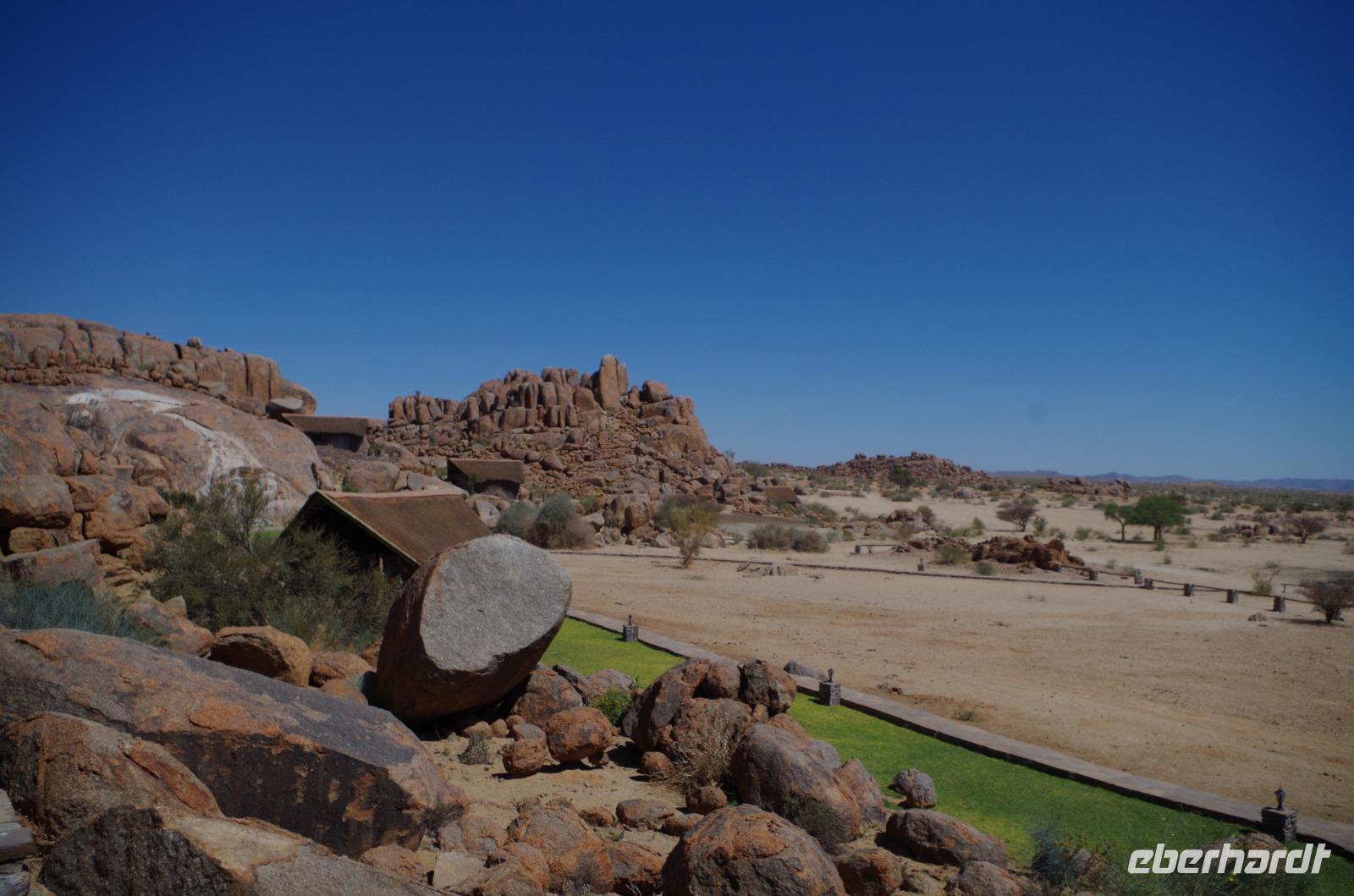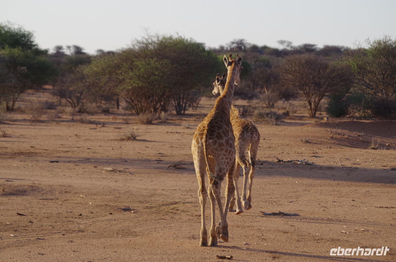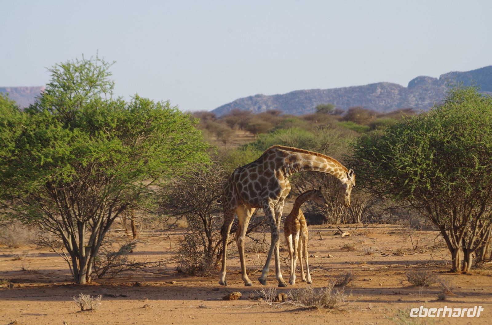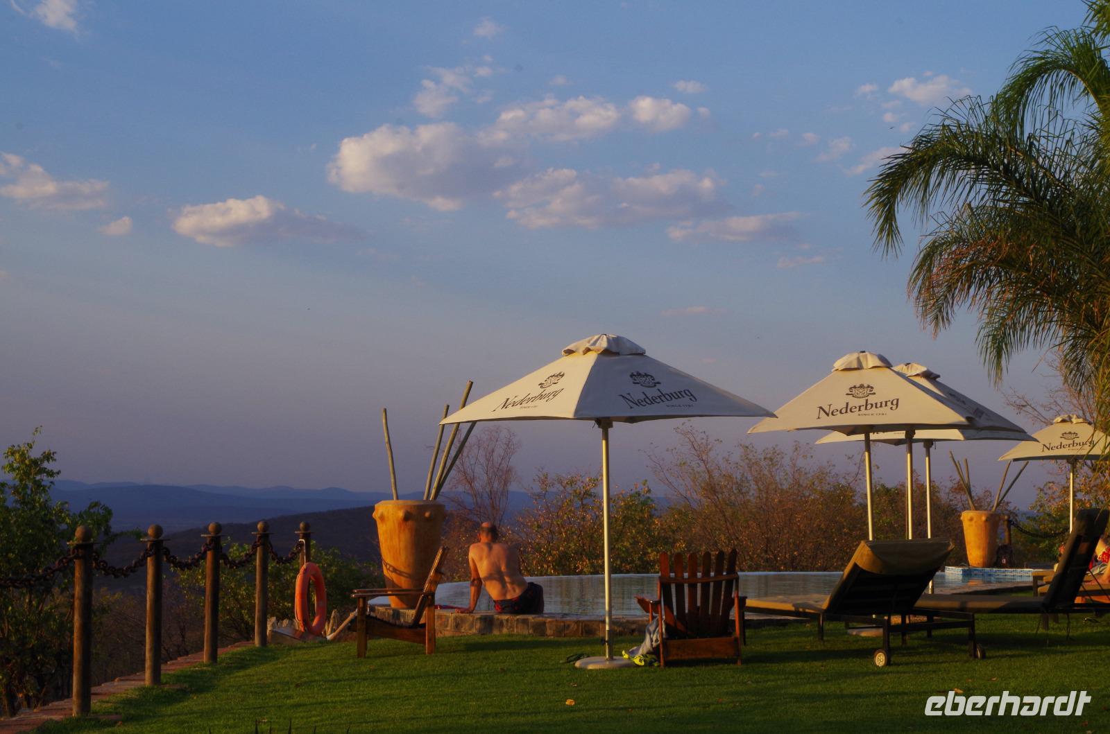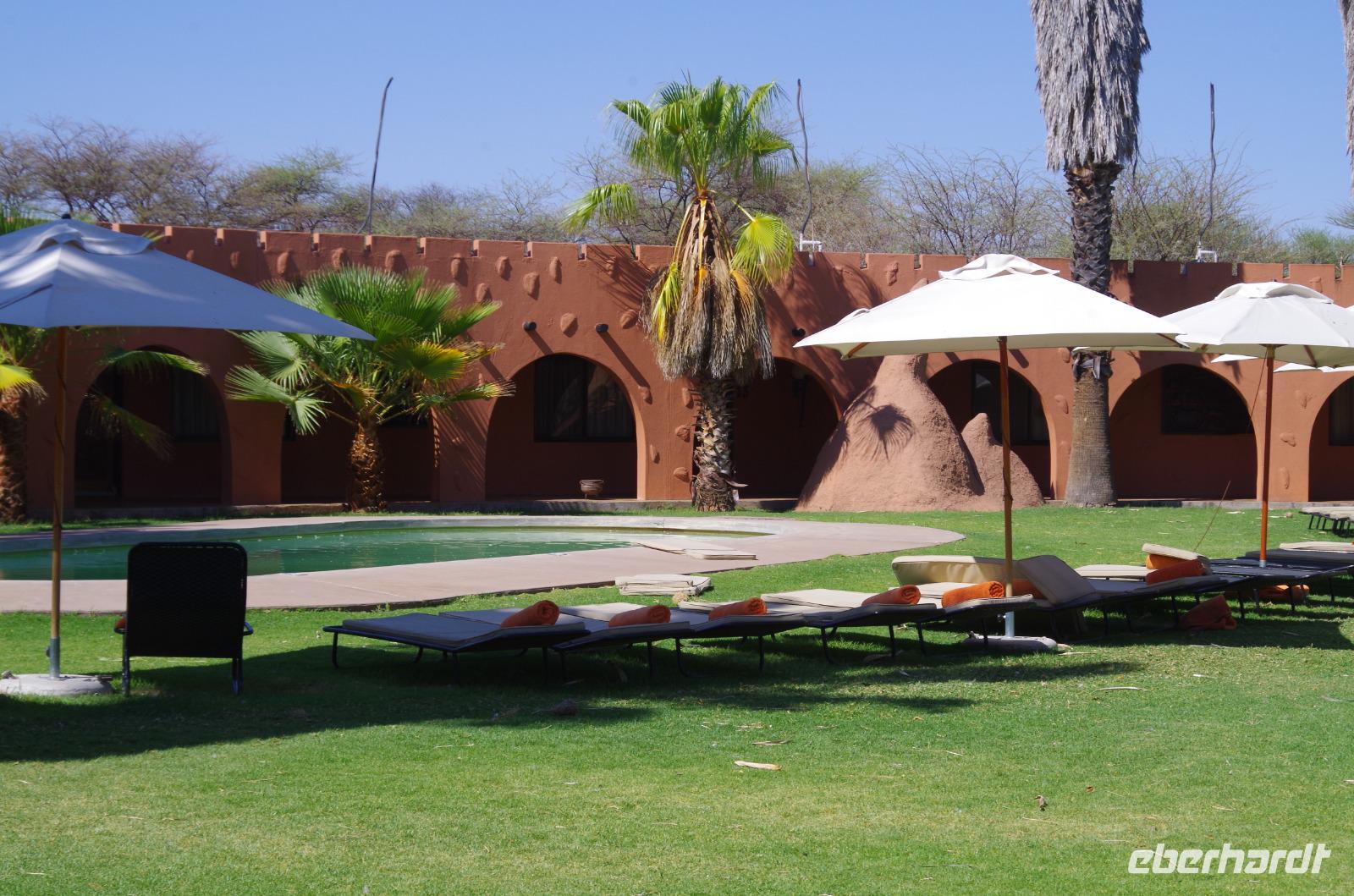 Nach dem Frühstück fuhren wir wieder in südliche Richtung. Wir passierten wir den Veterinärzaun, der sich wie eine rote Linie quer durch Namibia, Botswana und Simbabwe zieht. Eine freundliche Beamtin kontrollierte unsere Vorräte, den der Transport von Fleisch und anderen tierrischen Produkten ist verboten. Via Kamanjab truckten wir wiederum durch Farmgebiet, bis wir das Eoaacha Game Reserve erreichten. Hier wurden wir zugleich von Giraffen begrüßt. Von weiten sahen wir bereits die Eagle Tented Lodge, deren Zelt-Chaltes sich entlang der Bergkette schlängeln. Die Zelte waren komfortabel ausgestattet: Eigene Terrasse mit Ausblick (einige mit Außen-Badewanne), Himmelbett mit Moskitonetz sowie Bad en-suite. An diesem Tag war es wieder ungewöhnlich heiß, über 45 °C und kein Windchen, obwohl wir ober auf dem Berg waren. Entsprechend kuschlig war es in unseren Zelten. Warmes Wasser hatten wir auch ausreichend?? Eine Abkühlung versprach nur das Pool am Hauptgebäude der Lodge, dass einem Dornröschenschloss ähnelte. Auf der Gartenterrasse wurde Kaffee und Kuchen serviert. Abends traf man sich auf einen Sundowner und Giraffen waren auch zu Gast. Denn direkt davor, war eine Wasserstelle, die von den Tieren in dieser Dürre gern genutzt wurde. Ja, Giraffen oder besser Schiraffen gab es hier unzählige. Sie spazierten einfach durch das Gelände, vor unseren Augen. Tagesetappe: 450 km