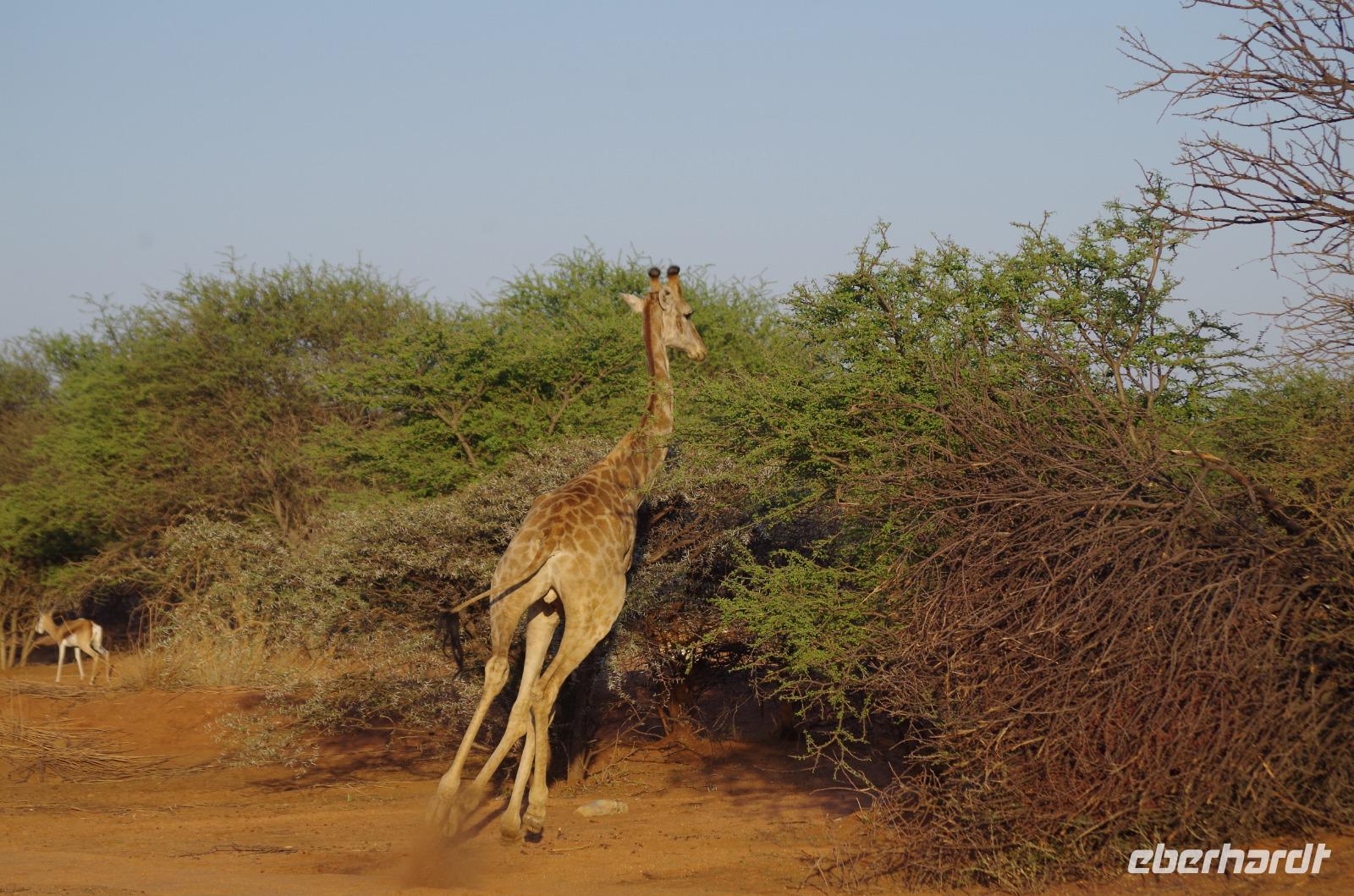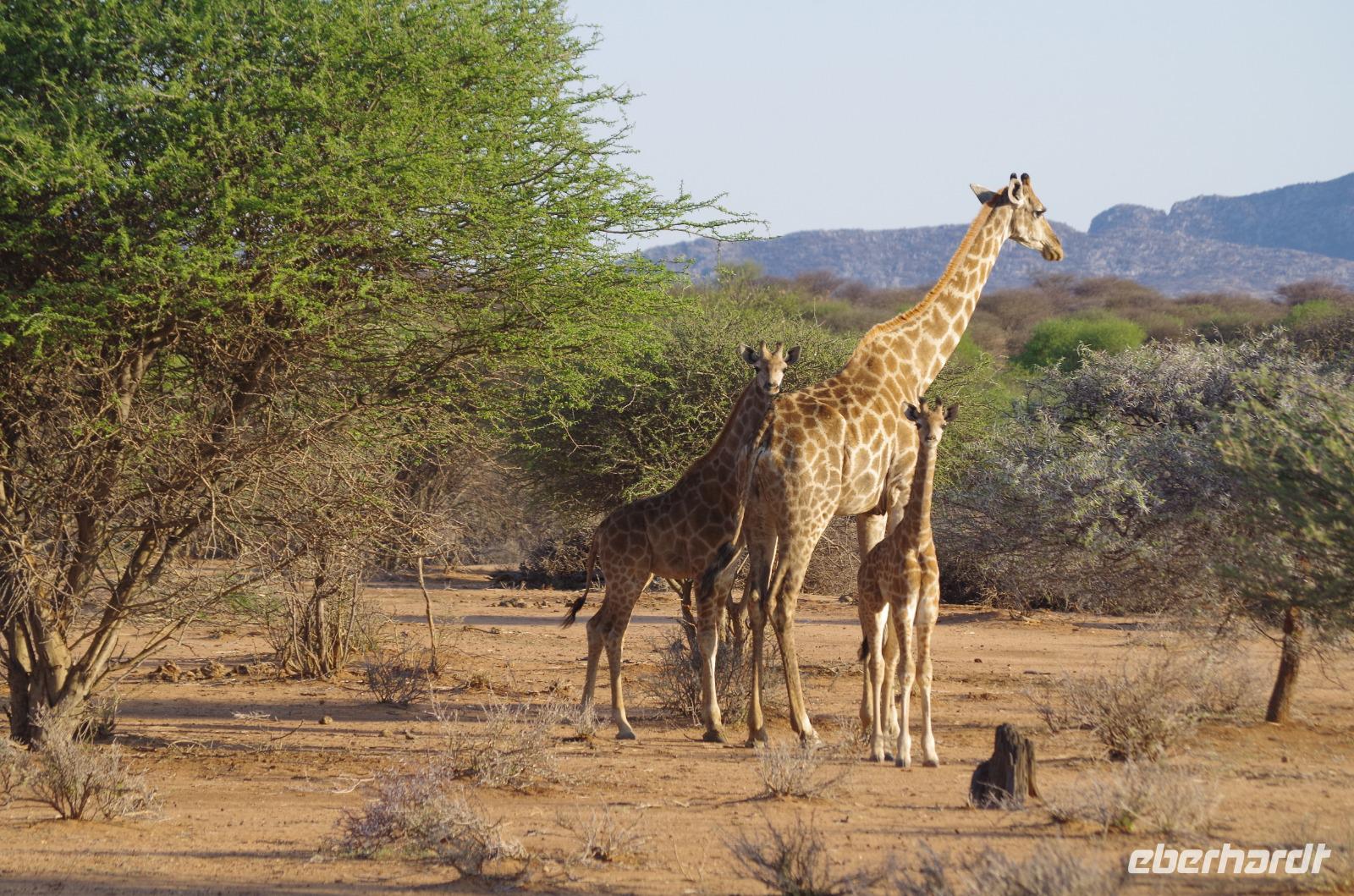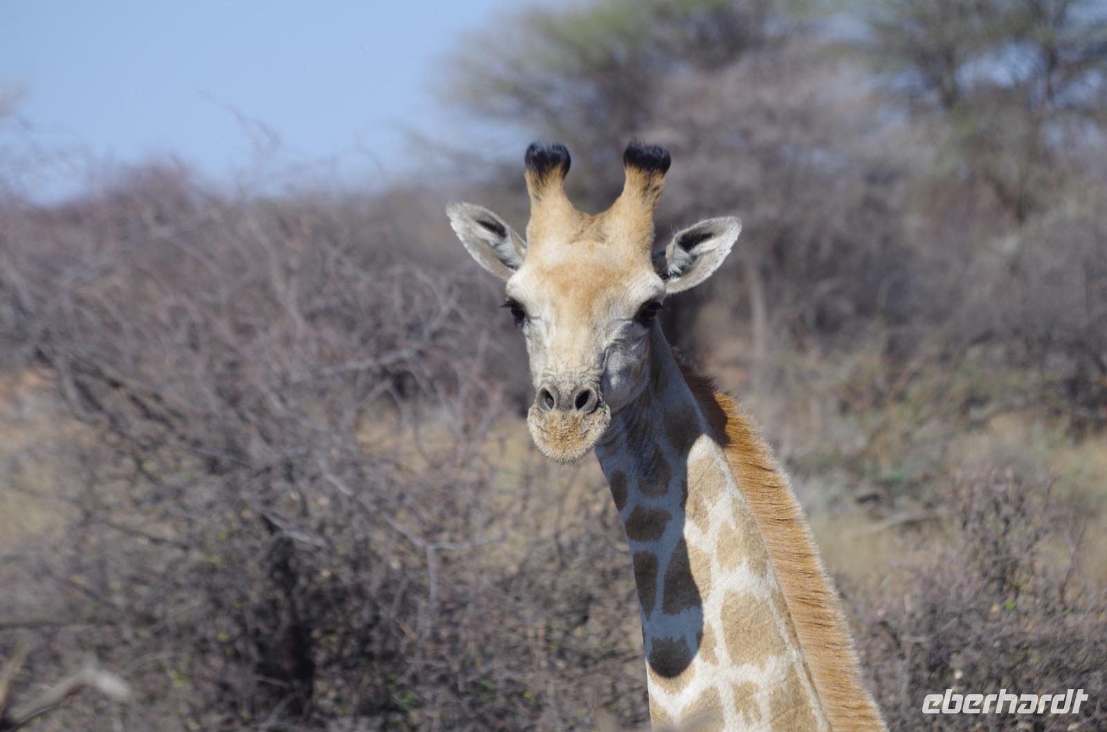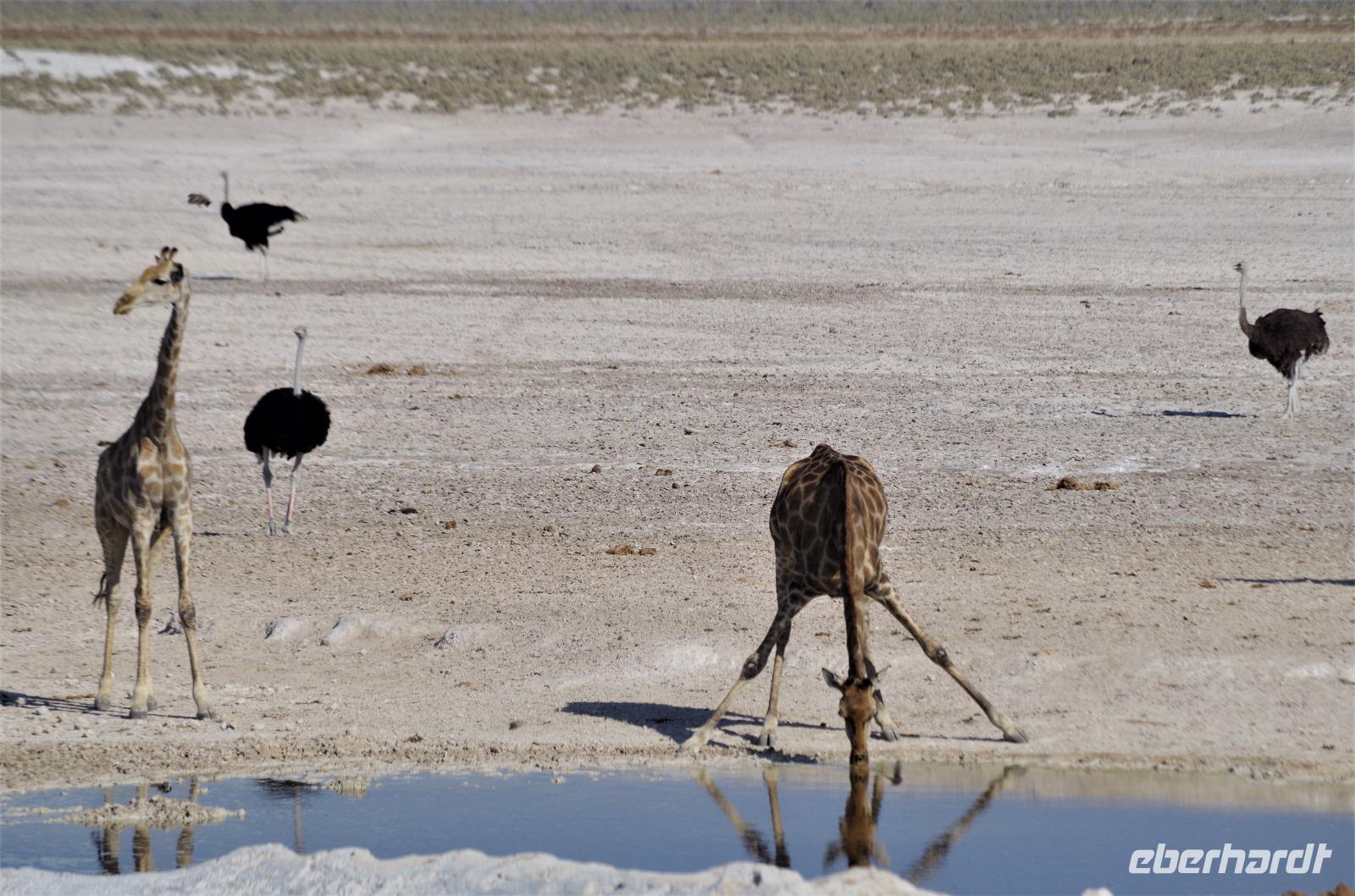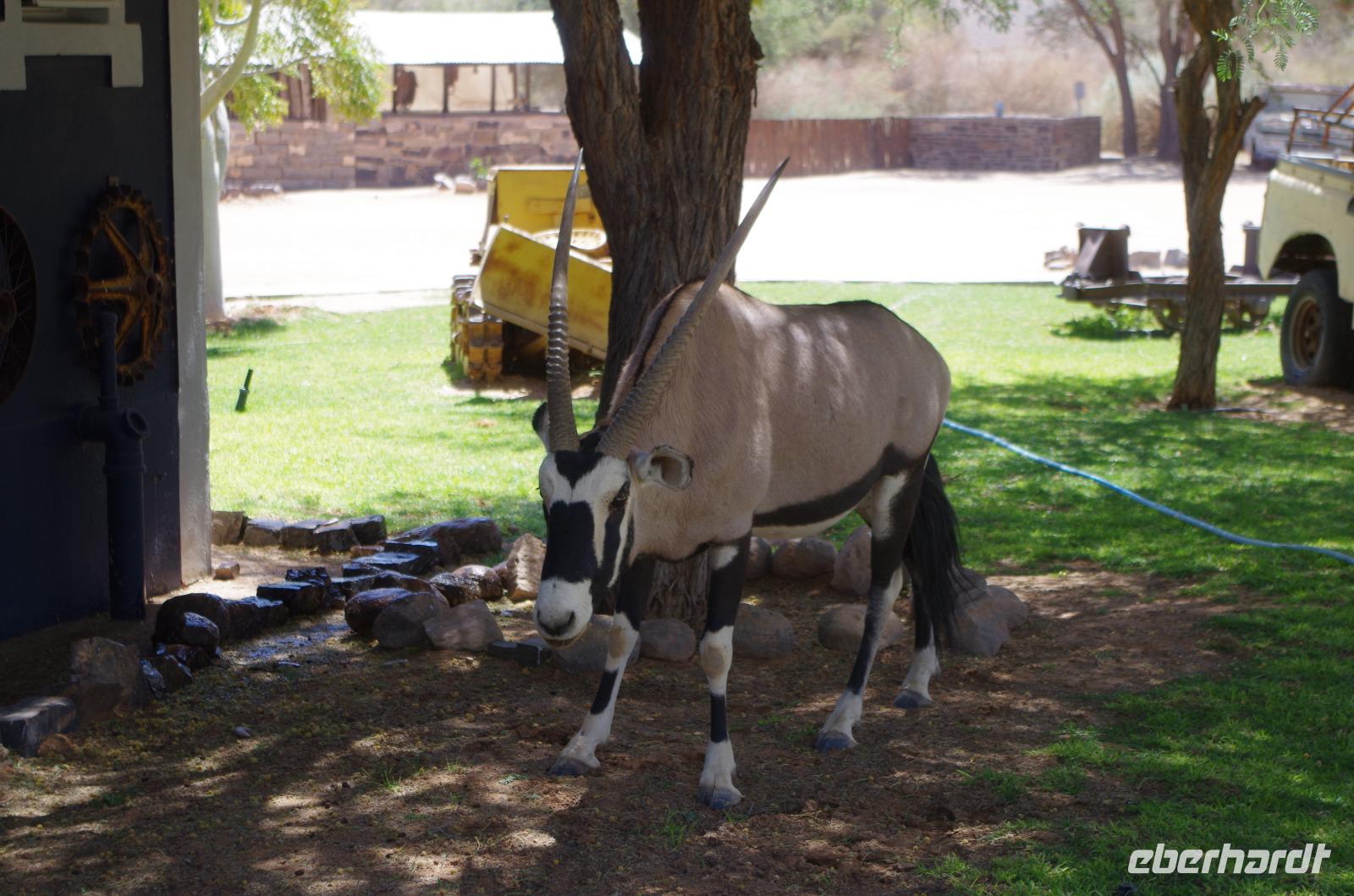 Nach dem Frühstück fuhren wir wieder in südliche Richtung. Wir passierten wir den Veterinärzaun, der sich wie eine rote Linie quer durch Namibia, Botswana und Simbabwe zieht. Eine freundliche Beamtin kontrollierte unsere Vorräte, den der Transport von Fleisch und anderen tierrischen Produkten ist verboten. Via Kamanjab truckten wir wiederum durch Farmgebiet, bis wir das Eoaacha Game Reserve erreichten. Hier wurden wir zugleich von Giraffen begrüßt. Von weiten sahen wir bereits die Eagle Tented Lodge, deren Zelt-Chaltes sich entlang der Bergkette schlängeln. Die Zelte waren komfortabel ausgestattet: Eigene Terrasse mit Ausblick (einige mit Außen-Badewanne), Himmelbett mit Moskitonetz sowie Bad en-suite. An diesem Tag war es wieder ungewöhnlich heiß, über 45 °C und kein Windchen, obwohl wir ober auf dem Berg waren. Entsprechend kuschlig war es in unseren Zelten. Warmes Wasser hatten wir auch ausreichend?? Eine Abkühlung versprach nur das Pool am Hauptgebäude der Lodge, dass einem Dornröschenschloss ähnelte. Auf der Gartenterrasse wurde Kaffee und Kuchen serviert. Abends traf man sich auf einen Sundowner und Giraffen waren auch zu Gast. Denn direkt davor, war eine Wasserstelle, die von den Tieren in dieser Dürre gern genutzt wurde. Ja, Giraffen oder besser Schiraffen gab es hier unzählige. Sie spazierten einfach durch das Gelände, vor unseren Augen. Tagesetappe: 450 km