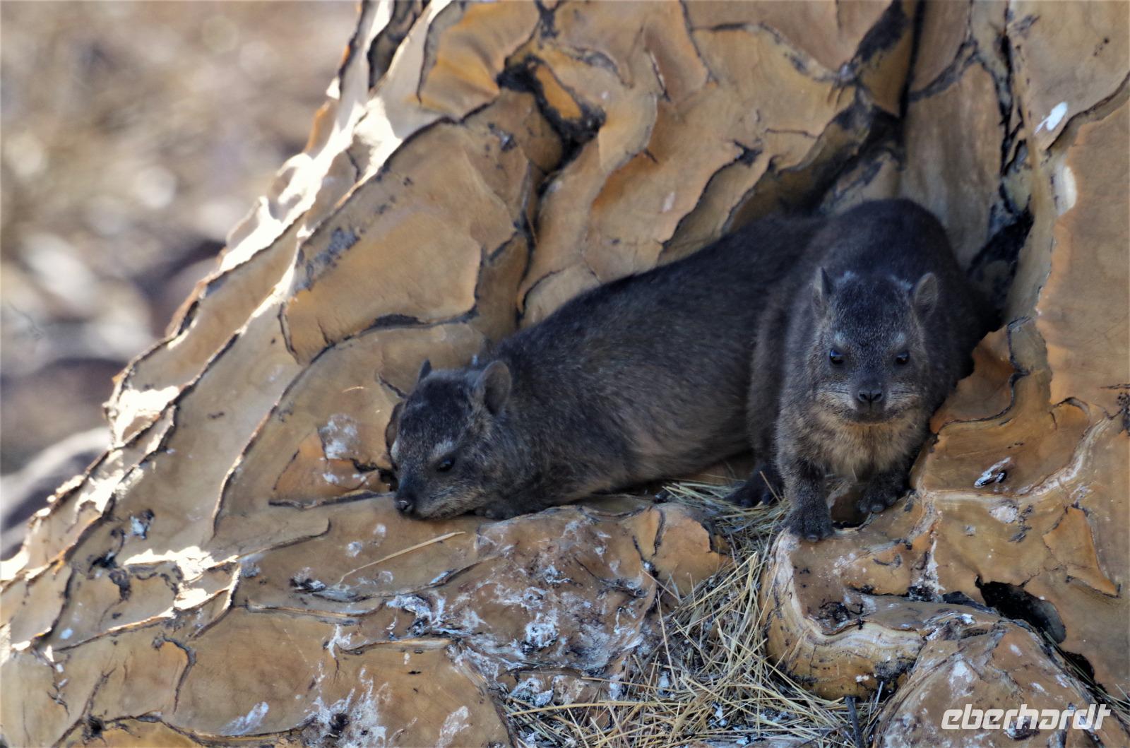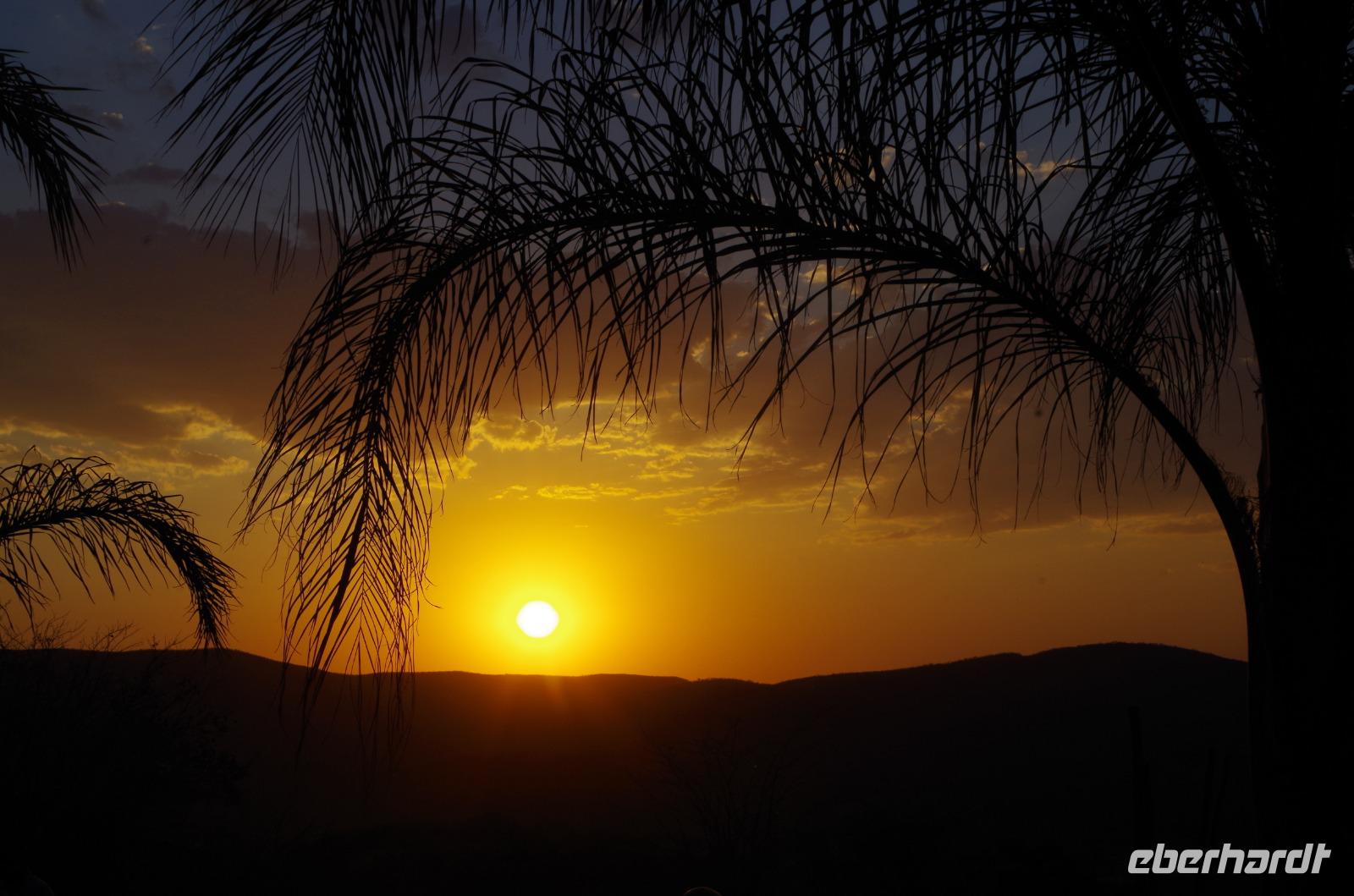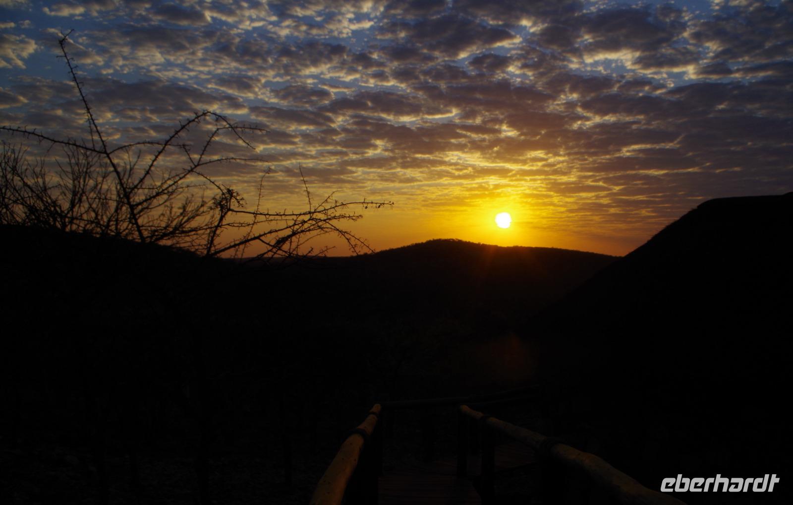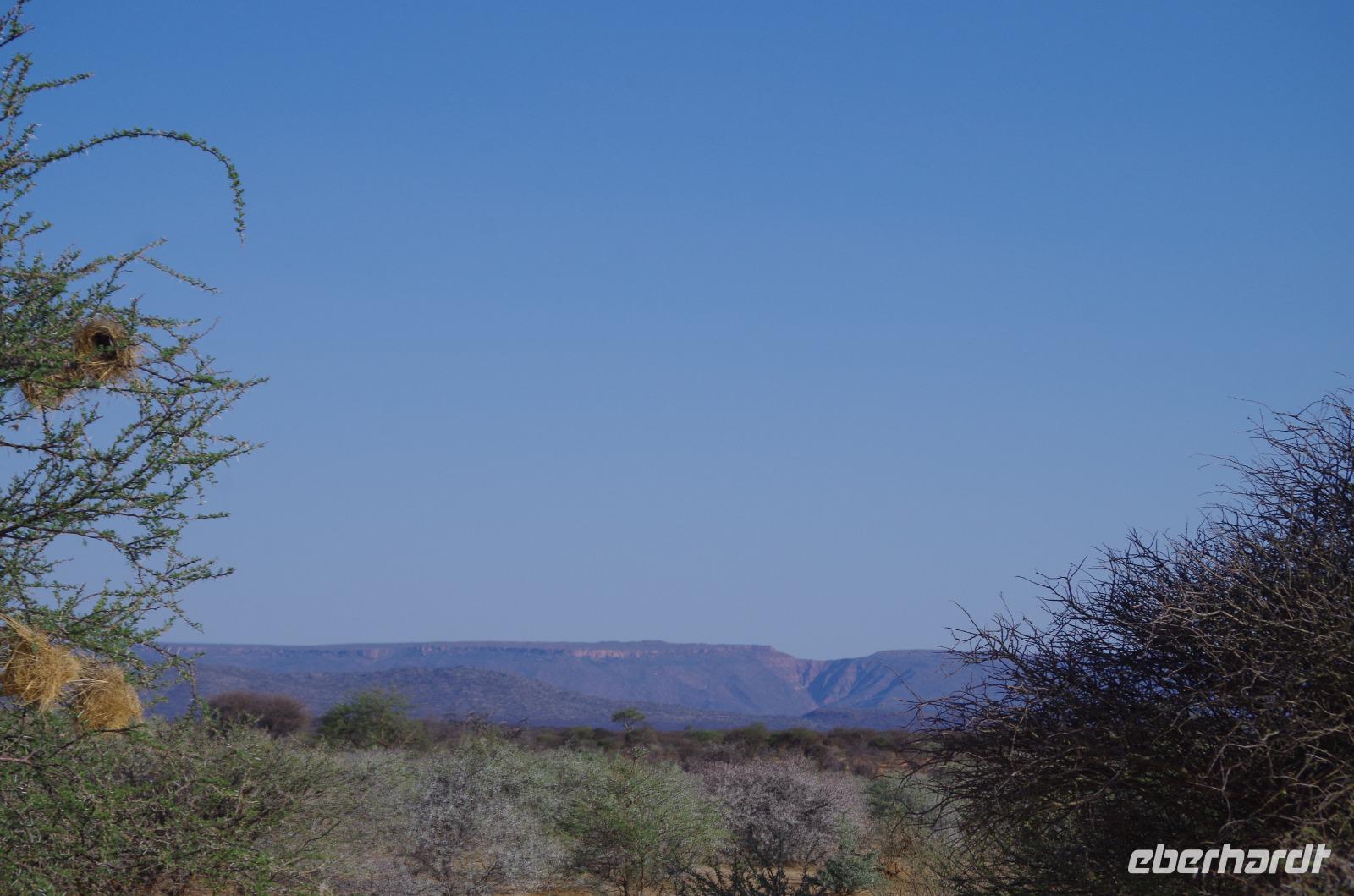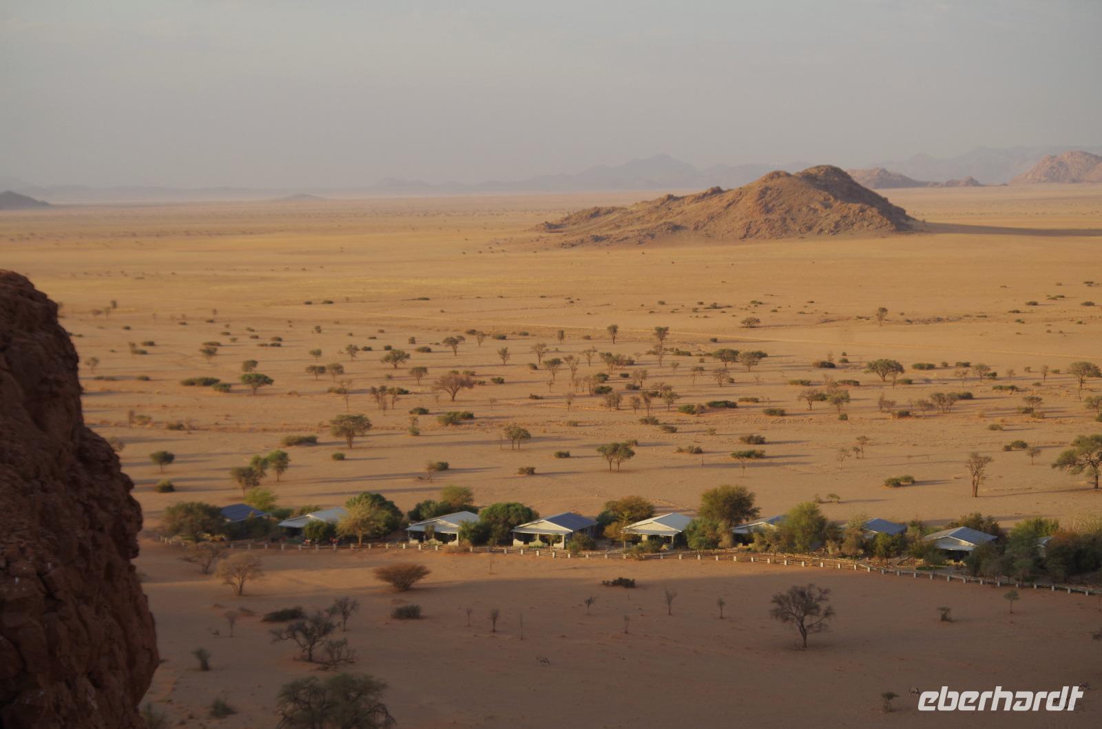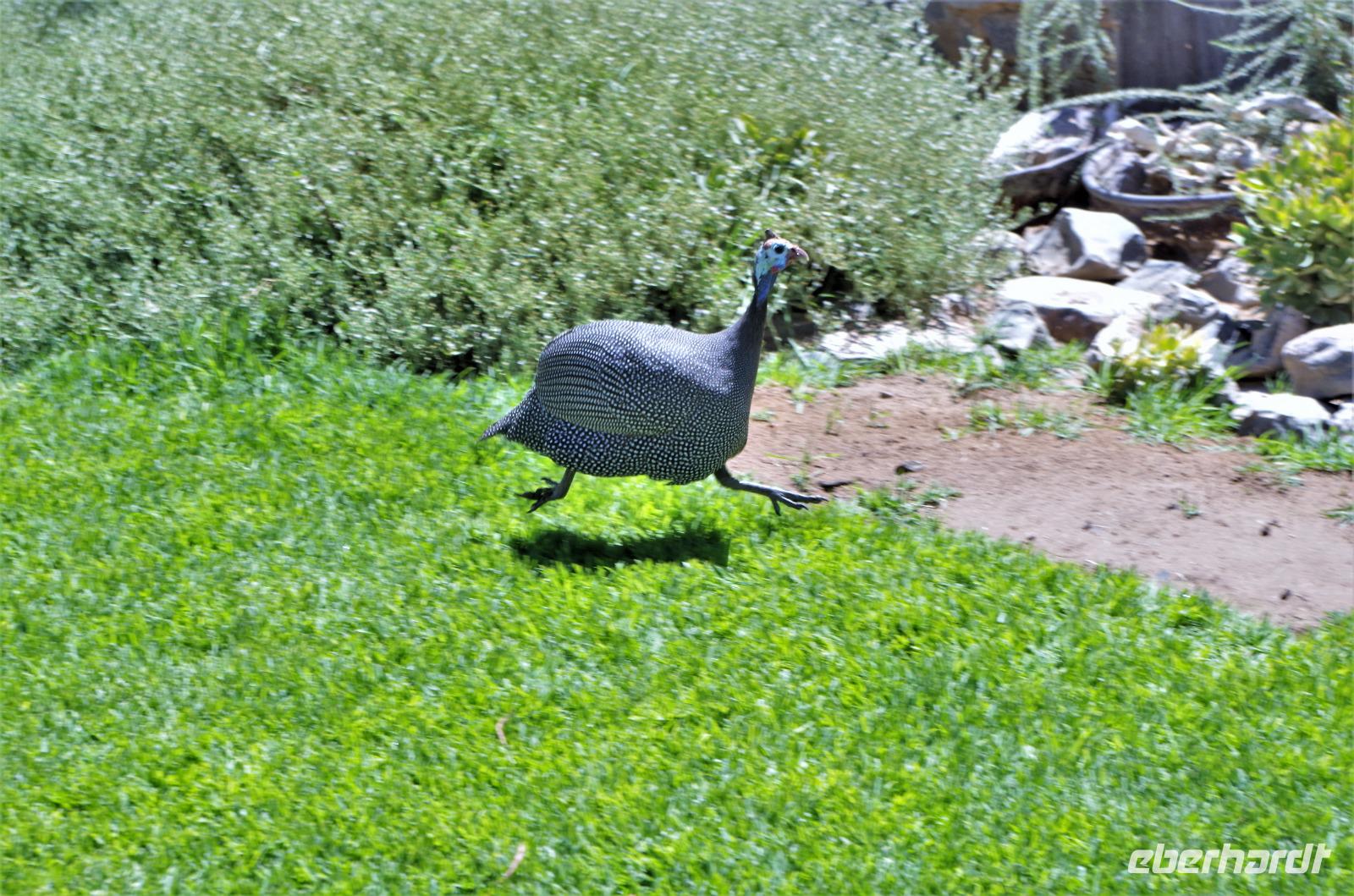 Nach dem Frühstück fuhren wir wieder in südliche Richtung. Wir passierten wir den Veterinärzaun, der sich wie eine rote Linie quer durch Namibia, Botswana und Simbabwe zieht. Eine freundliche Beamtin kontrollierte unsere Vorräte, den der Transport von Fleisch und anderen tierrischen Produkten ist verboten. Via Kamanjab truckten wir wiederum durch Farmgebiet, bis wir das Eoaacha Game Reserve erreichten. Hier wurden wir zugleich von Giraffen begrüßt. Von weiten sahen wir bereits die Eagle Tented Lodge, deren Zelt-Chaltes sich entlang der Bergkette schlängeln. Die Zelte waren komfortabel ausgestattet: Eigene Terrasse mit Ausblick (einige mit Außen-Badewanne), Himmelbett mit Moskitonetz sowie Bad en-suite. An diesem Tag war es wieder ungewöhnlich heiß, über 45 °C und kein Windchen, obwohl wir ober auf dem Berg waren. Entsprechend kuschlig war es in unseren Zelten. Warmes Wasser hatten wir auch ausreichend?? Eine Abkühlung versprach nur das Pool am Hauptgebäude der Lodge, dass einem Dornröschenschloss ähnelte. Auf der Gartenterrasse wurde Kaffee und Kuchen serviert. Abends traf man sich auf einen Sundowner und Giraffen waren auch zu Gast. Denn direkt davor, war eine Wasserstelle, die von den Tieren in dieser Dürre gern genutzt wurde. Ja, Giraffen oder besser Schiraffen gab es hier unzählige. Sie spazierten einfach durch das Gelände, vor unseren Augen. Tagesetappe: 450 km