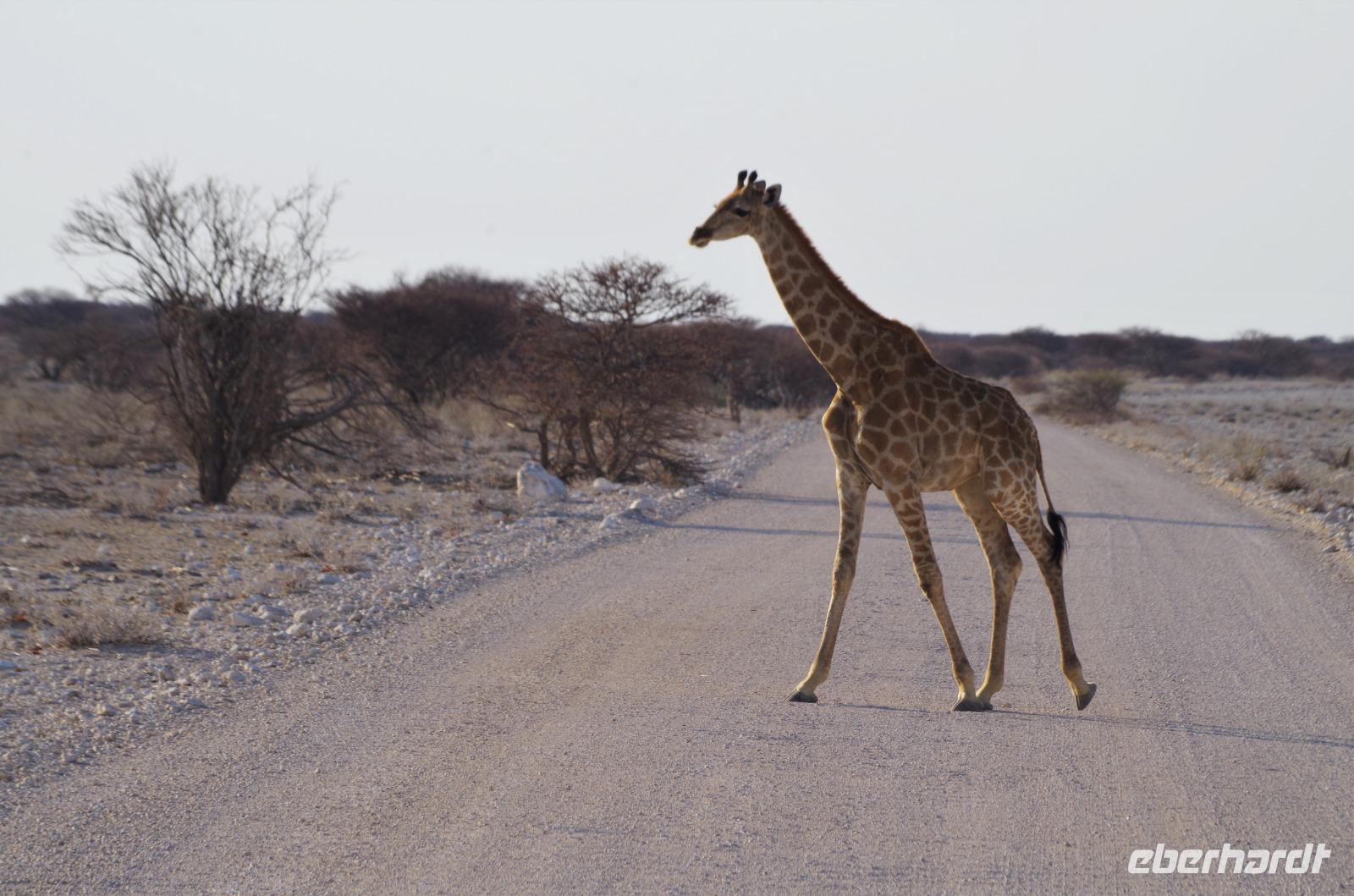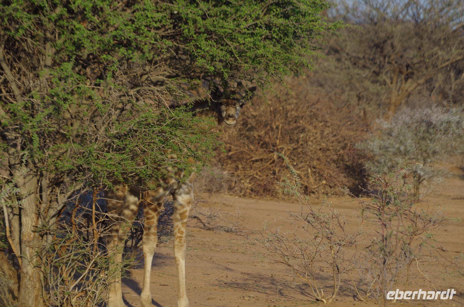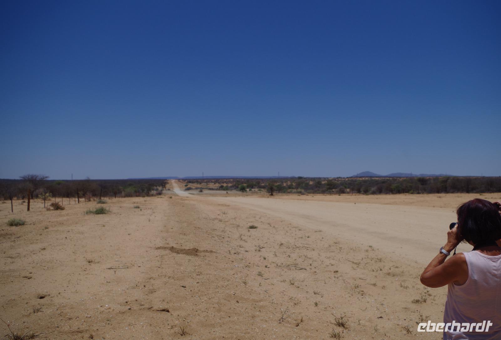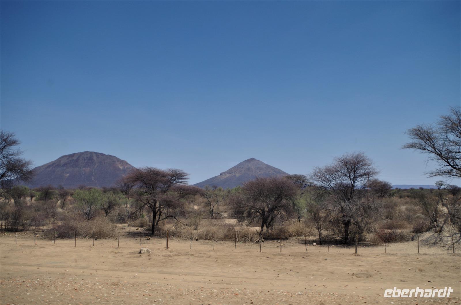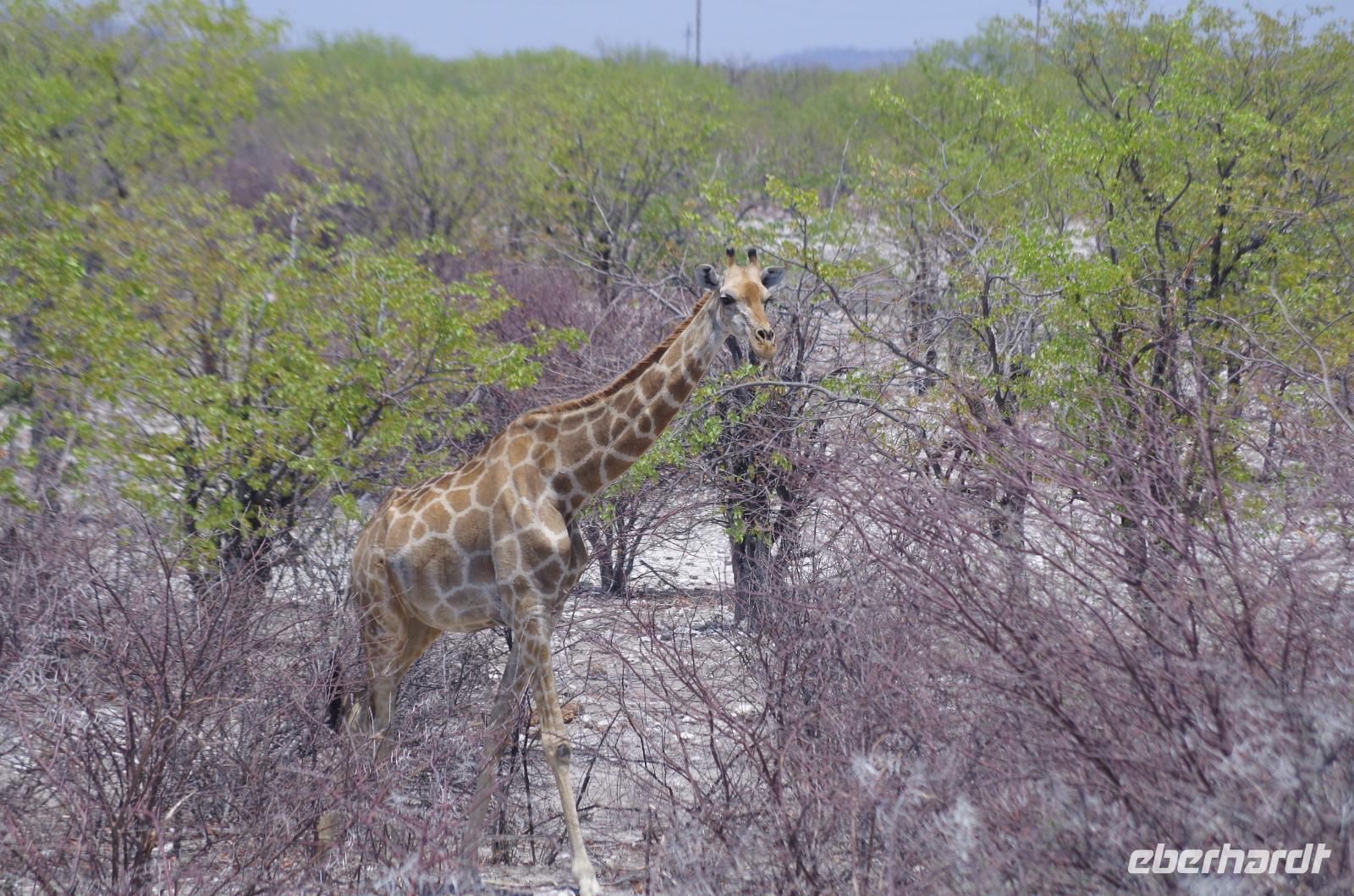 Nach dem Frühstück fuhren wir wieder in südliche Richtung. Wir passierten wir den Veterinärzaun, der sich wie eine rote Linie quer durch Namibia, Botswana und Simbabwe zieht. Eine freundliche Beamtin kontrollierte unsere Vorräte, den der Transport von Fleisch und anderen tierrischen Produkten ist verboten. Via Kamanjab truckten wir wiederum durch Farmgebiet, bis wir das Eoaacha Game Reserve erreichten. Hier wurden wir zugleich von Giraffen begrüßt. Von weiten sahen wir bereits die Eagle Tented Lodge, deren Zelt-Chaltes sich entlang der Bergkette schlängeln. Die Zelte waren komfortabel ausgestattet: Eigene Terrasse mit Ausblick (einige mit Außen-Badewanne), Himmelbett mit Moskitonetz sowie Bad en-suite. An diesem Tag war es wieder ungewöhnlich heiß, über 45 °C und kein Windchen, obwohl wir ober auf dem Berg waren. Entsprechend kuschlig war es in unseren Zelten. Warmes Wasser hatten wir auch ausreichend?? Eine Abkühlung versprach nur das Pool am Hauptgebäude der Lodge, dass einem Dornröschenschloss ähnelte. Auf der Gartenterrasse wurde Kaffee und Kuchen serviert. Abends traf man sich auf einen Sundowner und Giraffen waren auch zu Gast. Denn direkt davor, war eine Wasserstelle, die von den Tieren in dieser Dürre gern genutzt wurde. Ja, Giraffen oder besser Schiraffen gab es hier unzählige. Sie spazierten einfach durch das Gelände, vor unseren Augen. Tagesetappe: 450 km