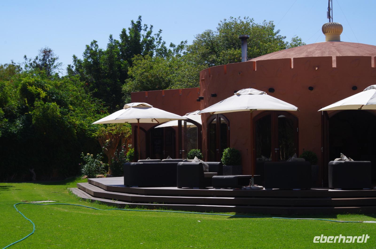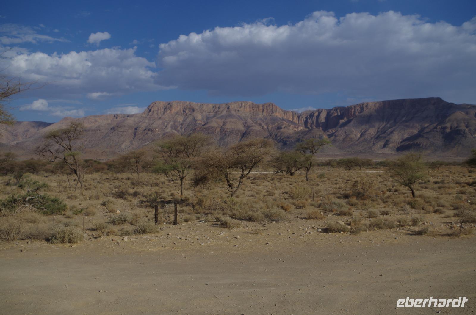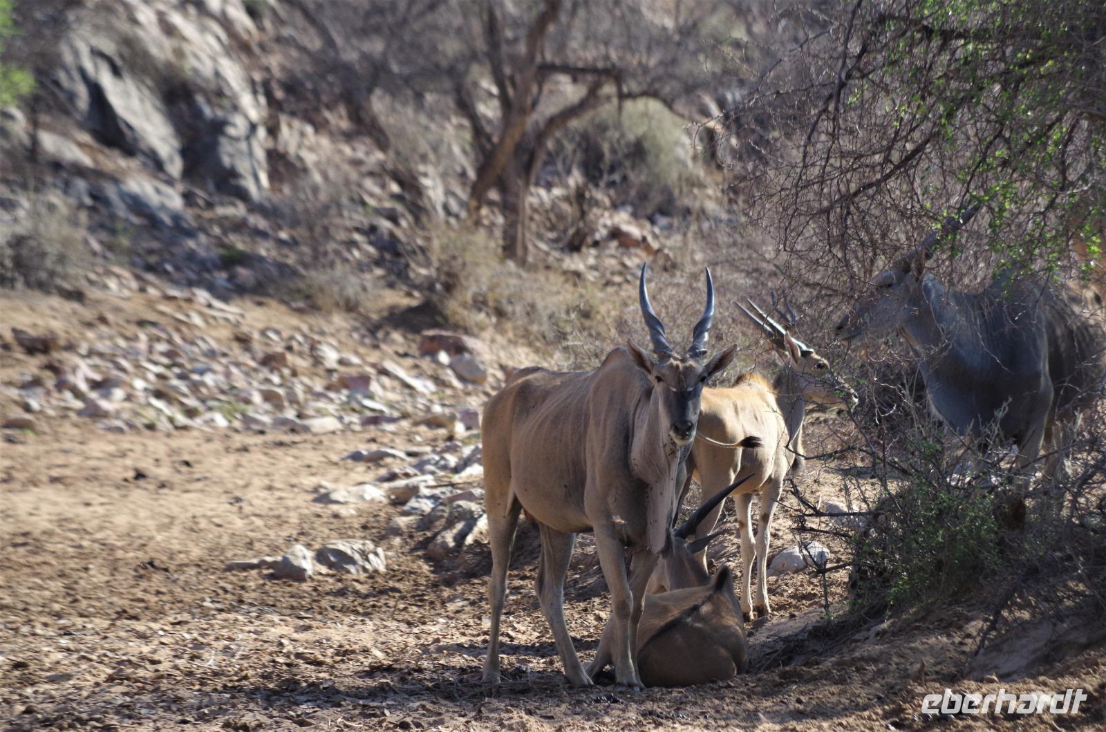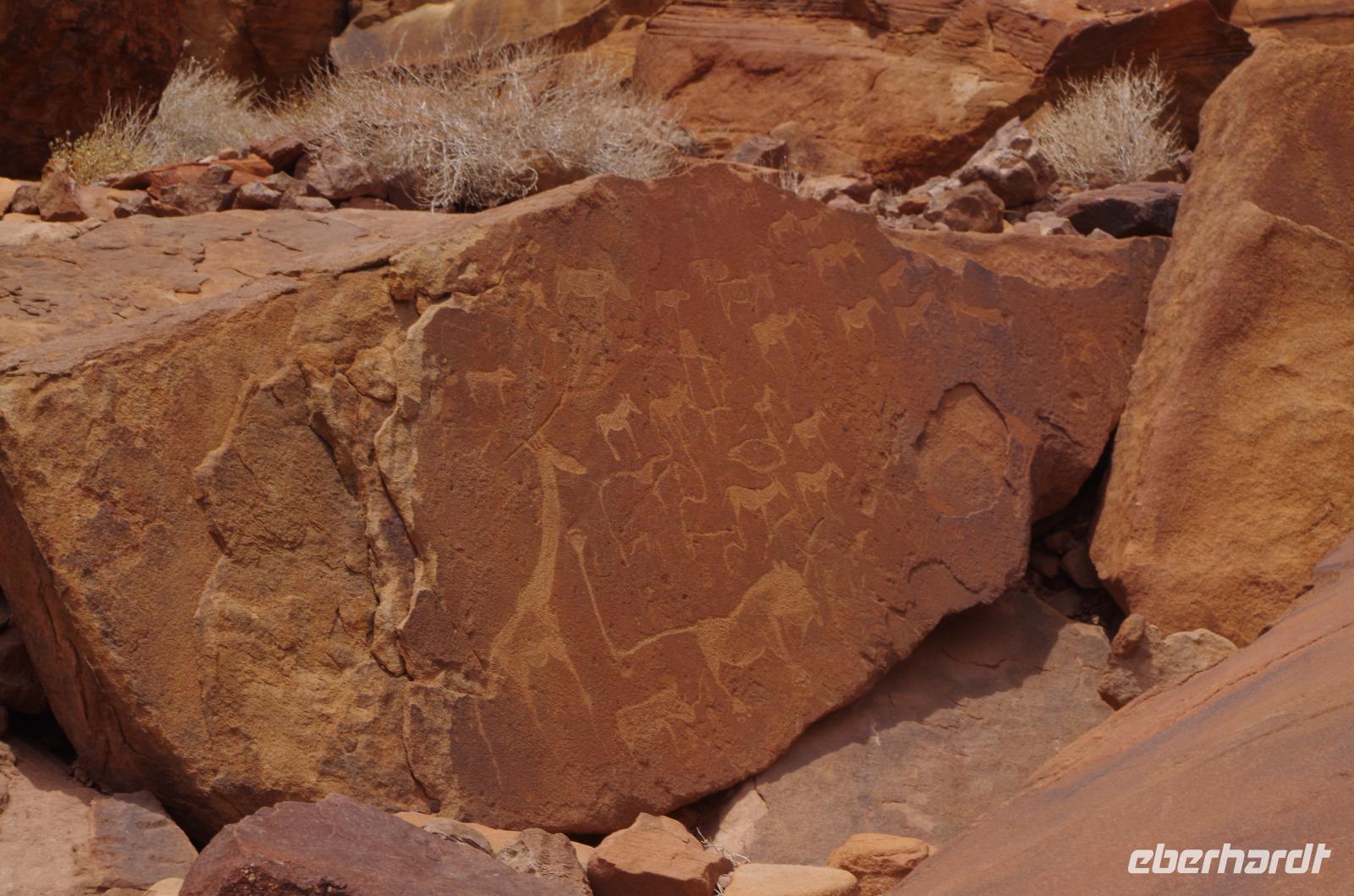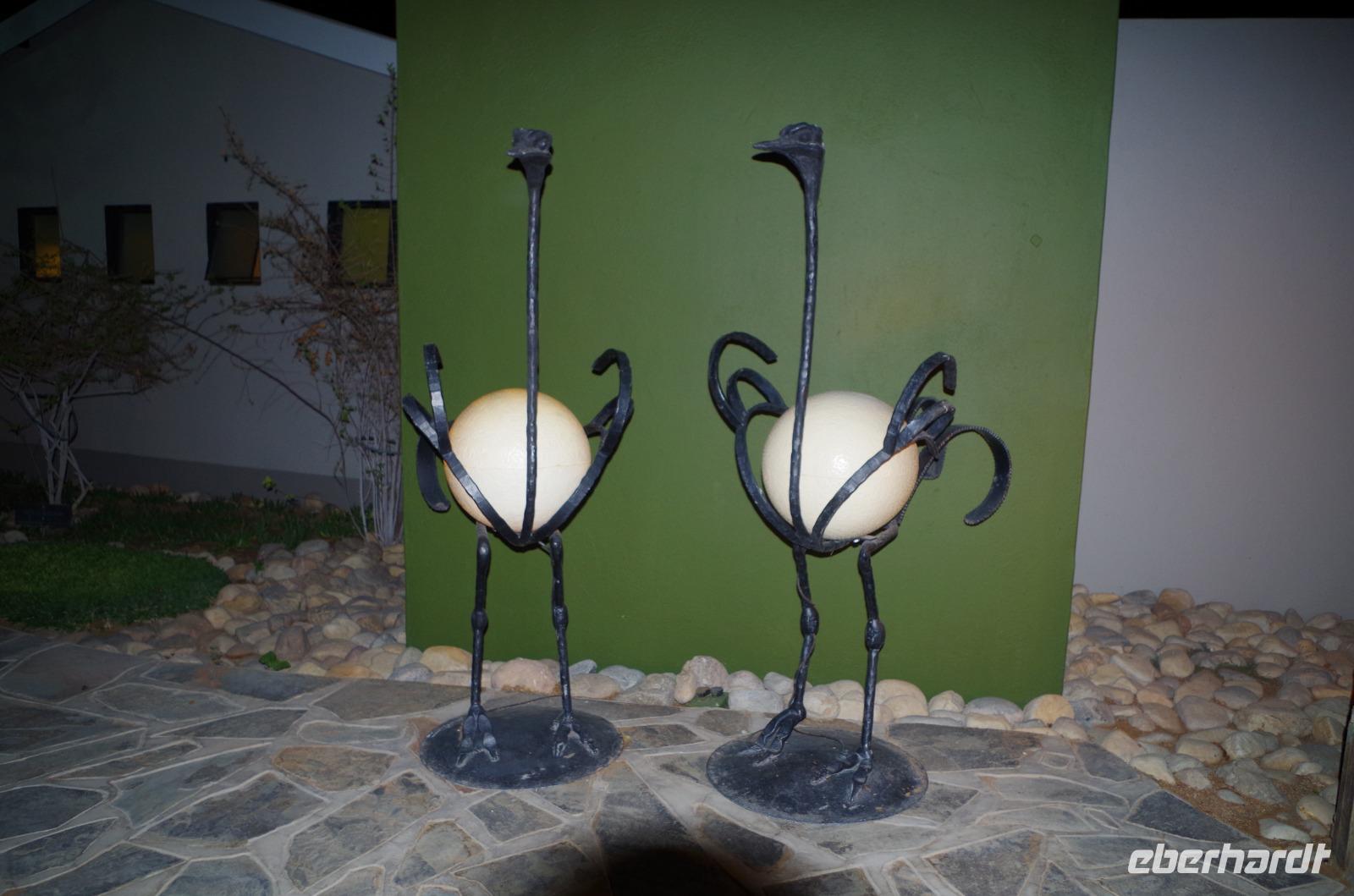 Nach dem Frühstück fuhren wir wieder in südliche Richtung. Wir passierten wir den Veterinärzaun, der sich wie eine rote Linie quer durch Namibia, Botswana und Simbabwe zieht. Eine freundliche Beamtin kontrollierte unsere Vorräte, den der Transport von Fleisch und anderen tierrischen Produkten ist verboten. Via Kamanjab truckten wir wiederum durch Farmgebiet, bis wir das Eoaacha Game Reserve erreichten. Hier wurden wir zugleich von Giraffen begrüßt. Von weiten sahen wir bereits die Eagle Tented Lodge, deren Zelt-Chaltes sich entlang der Bergkette schlängeln. Die Zelte waren komfortabel ausgestattet: Eigene Terrasse mit Ausblick (einige mit Außen-Badewanne), Himmelbett mit Moskitonetz sowie Bad en-suite. An diesem Tag war es wieder ungewöhnlich heiß, über 45 °C und kein Windchen, obwohl wir ober auf dem Berg waren. Entsprechend kuschlig war es in unseren Zelten. Warmes Wasser hatten wir auch ausreichend?? Eine Abkühlung versprach nur das Pool am Hauptgebäude der Lodge, dass einem Dornröschenschloss ähnelte. Auf der Gartenterrasse wurde Kaffee und Kuchen serviert. Abends traf man sich auf einen Sundowner und Giraffen waren auch zu Gast. Denn direkt davor, war eine Wasserstelle, die von den Tieren in dieser Dürre gern genutzt wurde. Ja, Giraffen oder besser Schiraffen gab es hier unzählige. Sie spazierten einfach durch das Gelände, vor unseren Augen. Tagesetappe: 450 km