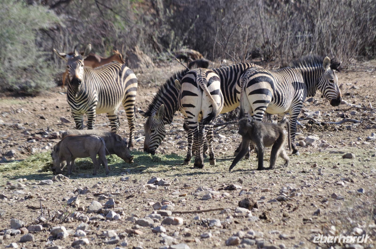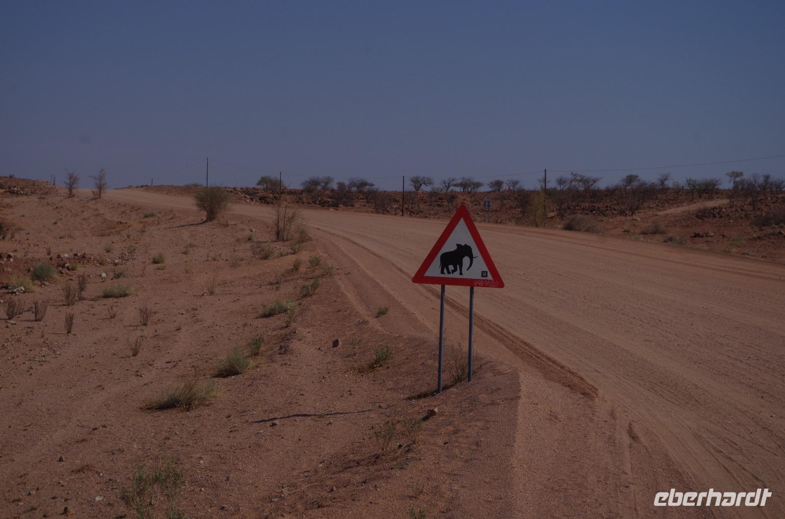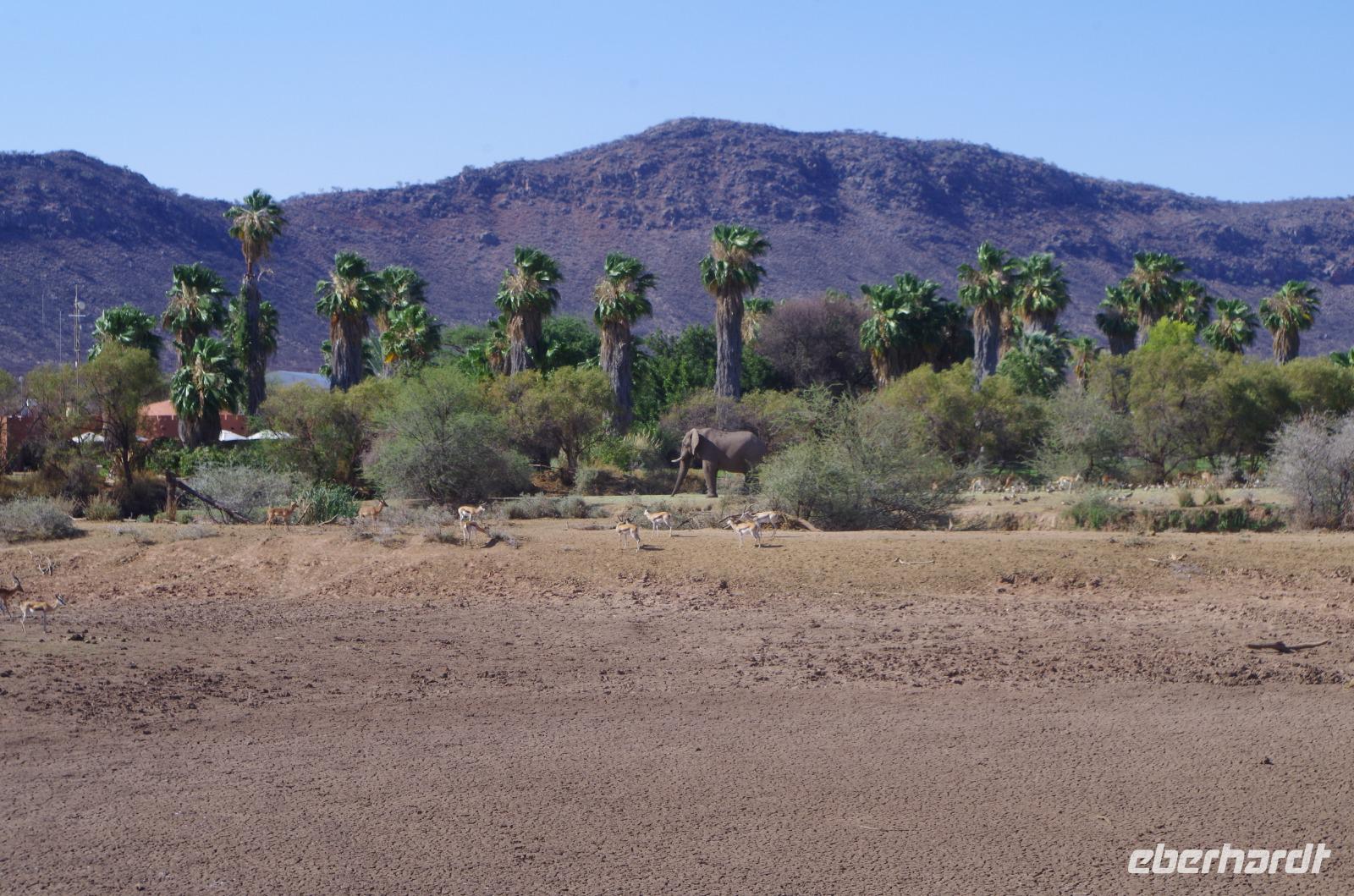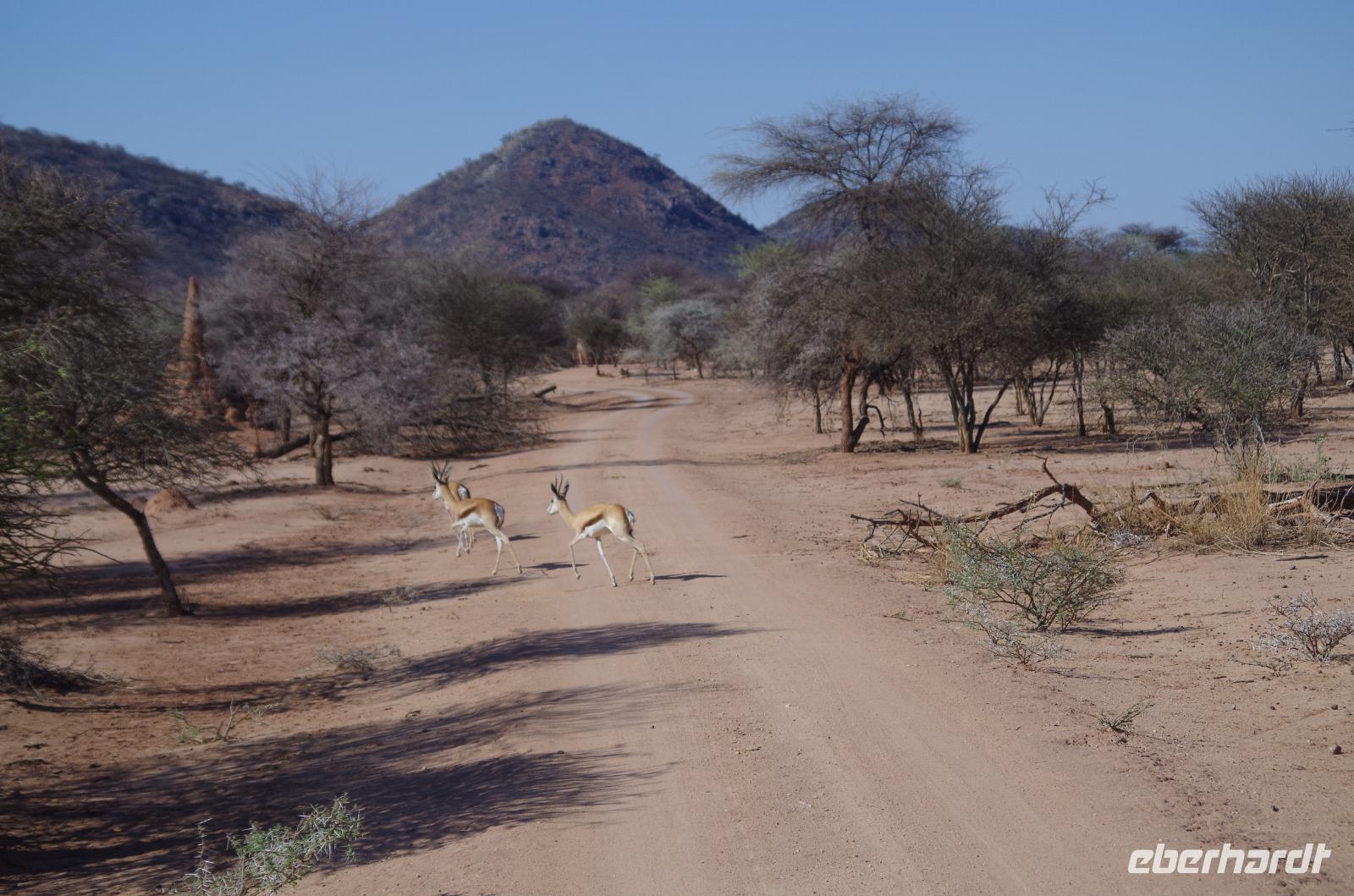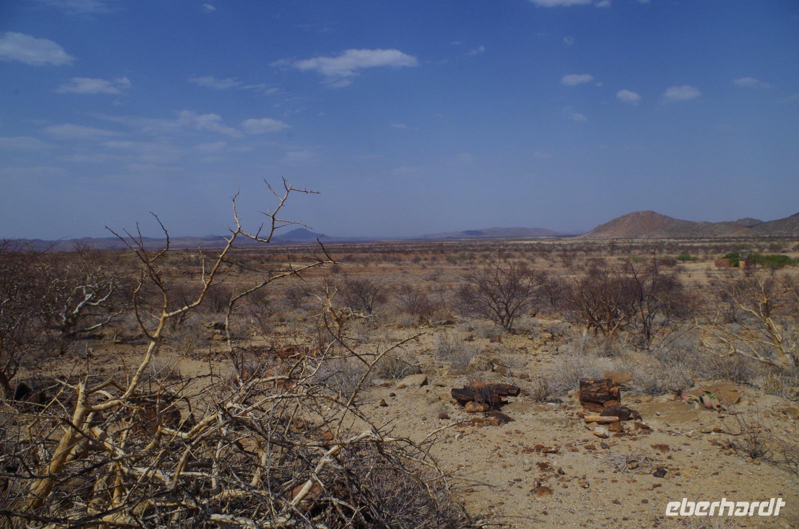 Nach dem Frühstück fuhren wir wieder in südliche Richtung. Wir passierten wir den Veterinärzaun, der sich wie eine rote Linie quer durch Namibia, Botswana und Simbabwe zieht. Eine freundliche Beamtin kontrollierte unsere Vorräte, den der Transport von Fleisch und anderen tierrischen Produkten ist verboten. Via Kamanjab truckten wir wiederum durch Farmgebiet, bis wir das Eoaacha Game Reserve erreichten. Hier wurden wir zugleich von Giraffen begrüßt. Von weiten sahen wir bereits die Eagle Tented Lodge, deren Zelt-Chaltes sich entlang der Bergkette schlängeln. Die Zelte waren komfortabel ausgestattet: Eigene Terrasse mit Ausblick (einige mit Außen-Badewanne), Himmelbett mit Moskitonetz sowie Bad en-suite. An diesem Tag war es wieder ungewöhnlich heiß, über 45 °C und kein Windchen, obwohl wir ober auf dem Berg waren. Entsprechend kuschlig war es in unseren Zelten. Warmes Wasser hatten wir auch ausreichend?? Eine Abkühlung versprach nur das Pool am Hauptgebäude der Lodge, dass einem Dornröschenschloss ähnelte. Auf der Gartenterrasse wurde Kaffee und Kuchen serviert. Abends traf man sich auf einen Sundowner und Giraffen waren auch zu Gast. Denn direkt davor, war eine Wasserstelle, die von den Tieren in dieser Dürre gern genutzt wurde. Ja, Giraffen oder besser Schiraffen gab es hier unzählige. Sie spazierten einfach durch das Gelände, vor unseren Augen. Tagesetappe: 450 km