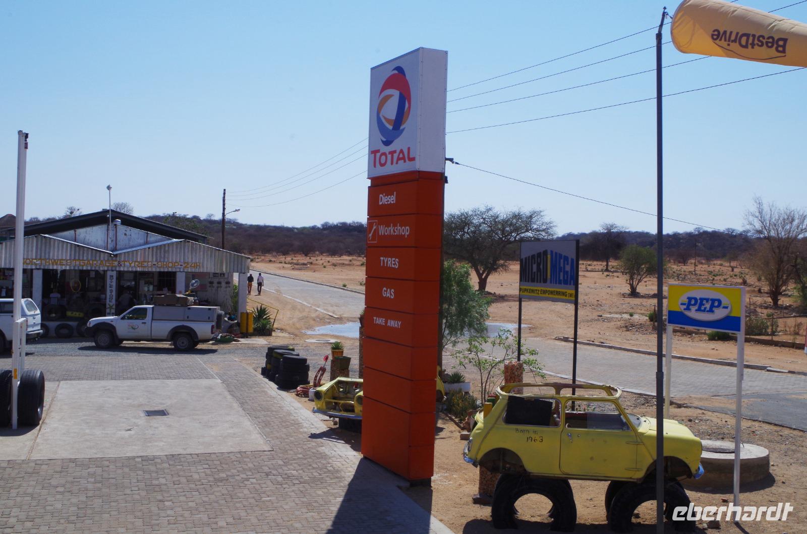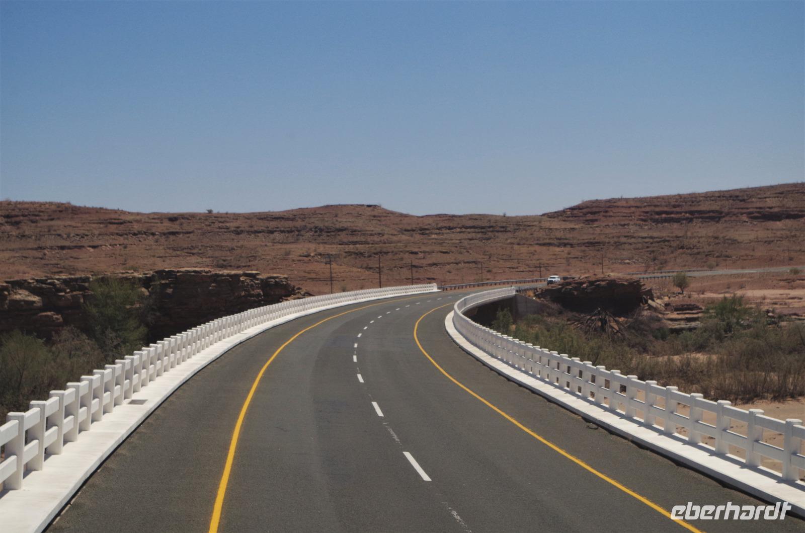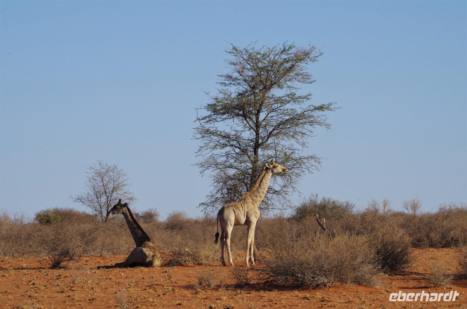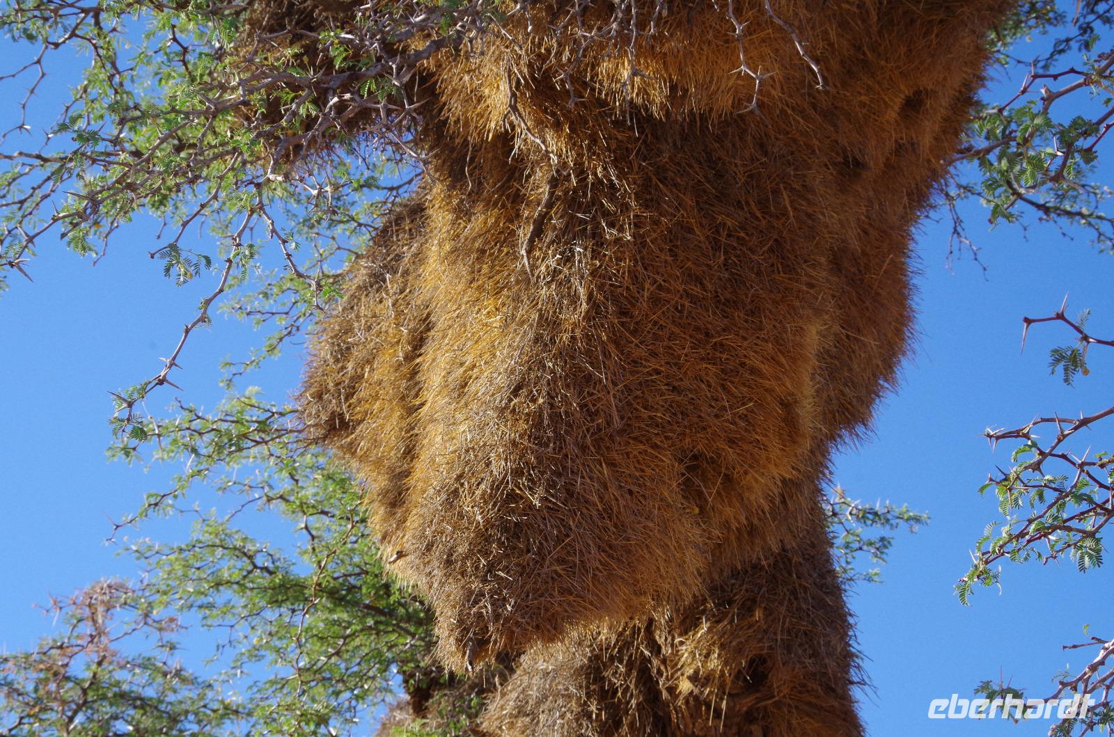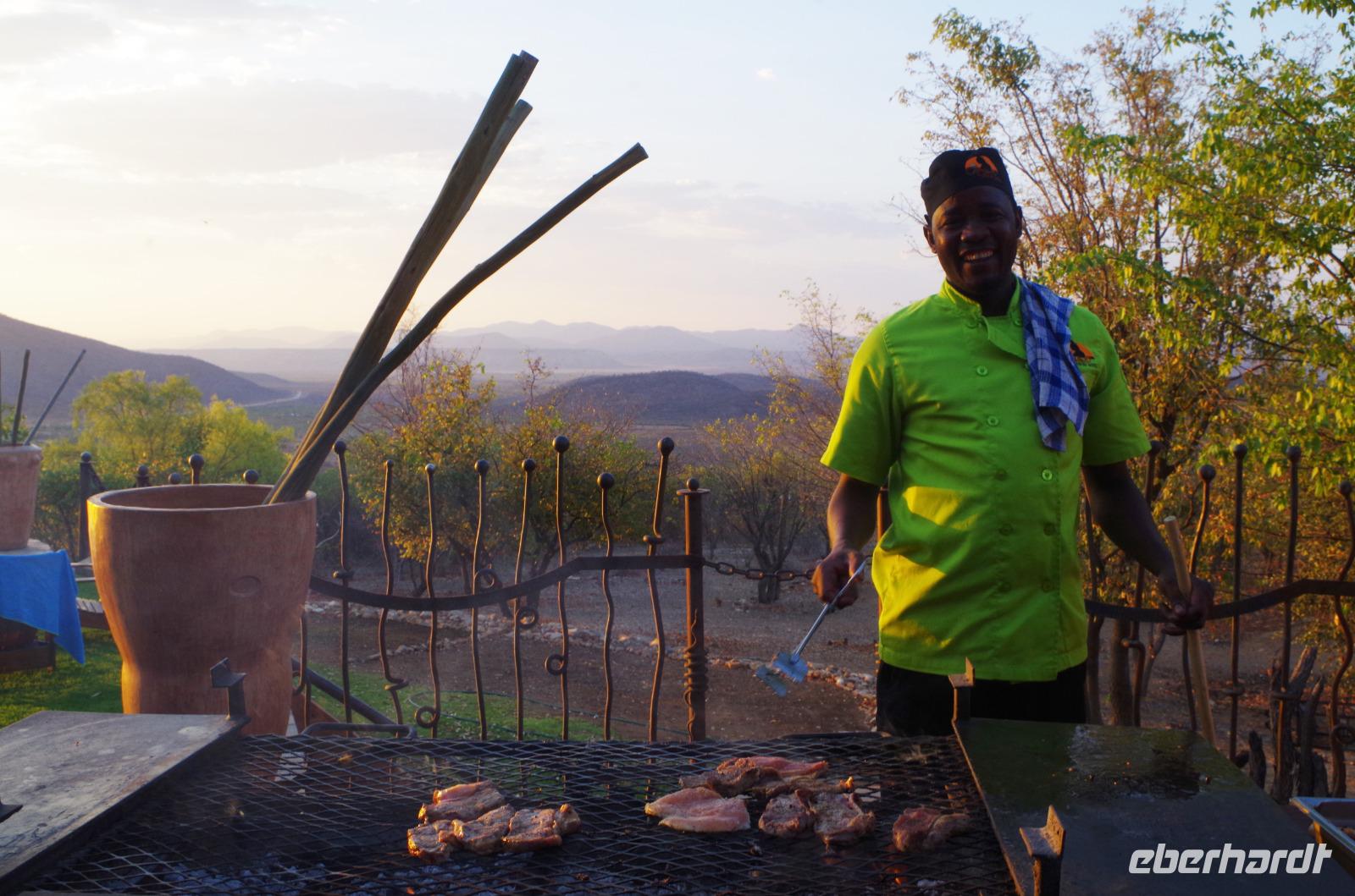 Nach dem Frühstück fuhren wir wieder in südliche Richtung. Wir passierten wir den Veterinärzaun, der sich wie eine rote Linie quer durch Namibia, Botswana und Simbabwe zieht. Eine freundliche Beamtin kontrollierte unsere Vorräte, den der Transport von Fleisch und anderen tierrischen Produkten ist verboten. Via Kamanjab truckten wir wiederum durch Farmgebiet, bis wir das Eoaacha Game Reserve erreichten. Hier wurden wir zugleich von Giraffen begrüßt. Von weiten sahen wir bereits die Eagle Tented Lodge, deren Zelt-Chaltes sich entlang der Bergkette schlängeln. Die Zelte waren komfortabel ausgestattet: Eigene Terrasse mit Ausblick (einige mit Außen-Badewanne), Himmelbett mit Moskitonetz sowie Bad en-suite. An diesem Tag war es wieder ungewöhnlich heiß, über 45 °C und kein Windchen, obwohl wir ober auf dem Berg waren. Entsprechend kuschlig war es in unseren Zelten. Warmes Wasser hatten wir auch ausreichend?? Eine Abkühlung versprach nur das Pool am Hauptgebäude der Lodge, dass einem Dornröschenschloss ähnelte. Auf der Gartenterrasse wurde Kaffee und Kuchen serviert. Abends traf man sich auf einen Sundowner und Giraffen waren auch zu Gast. Denn direkt davor, war eine Wasserstelle, die von den Tieren in dieser Dürre gern genutzt wurde. Ja, Giraffen oder besser Schiraffen gab es hier unzählige. Sie spazierten einfach durch das Gelände, vor unseren Augen. Tagesetappe: 450 km