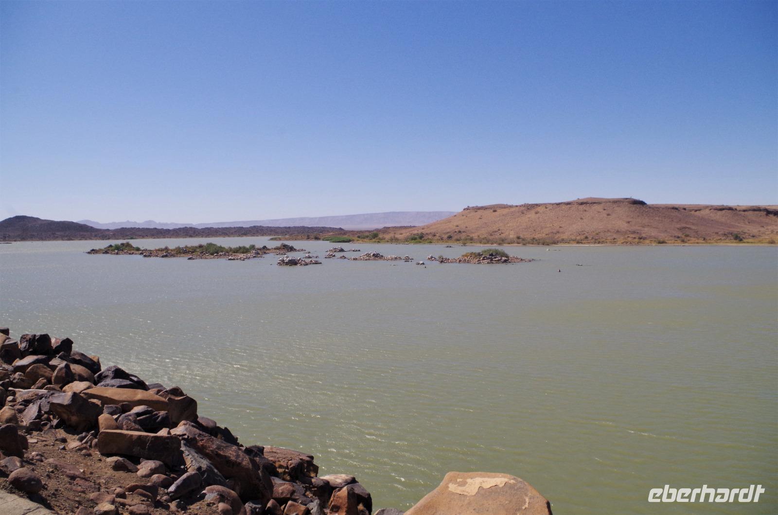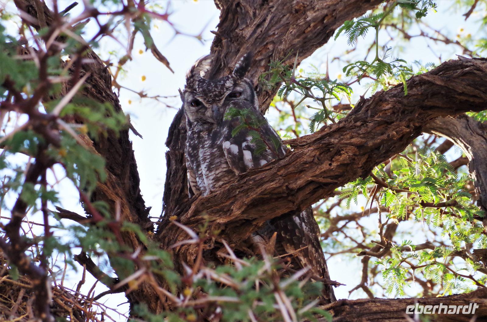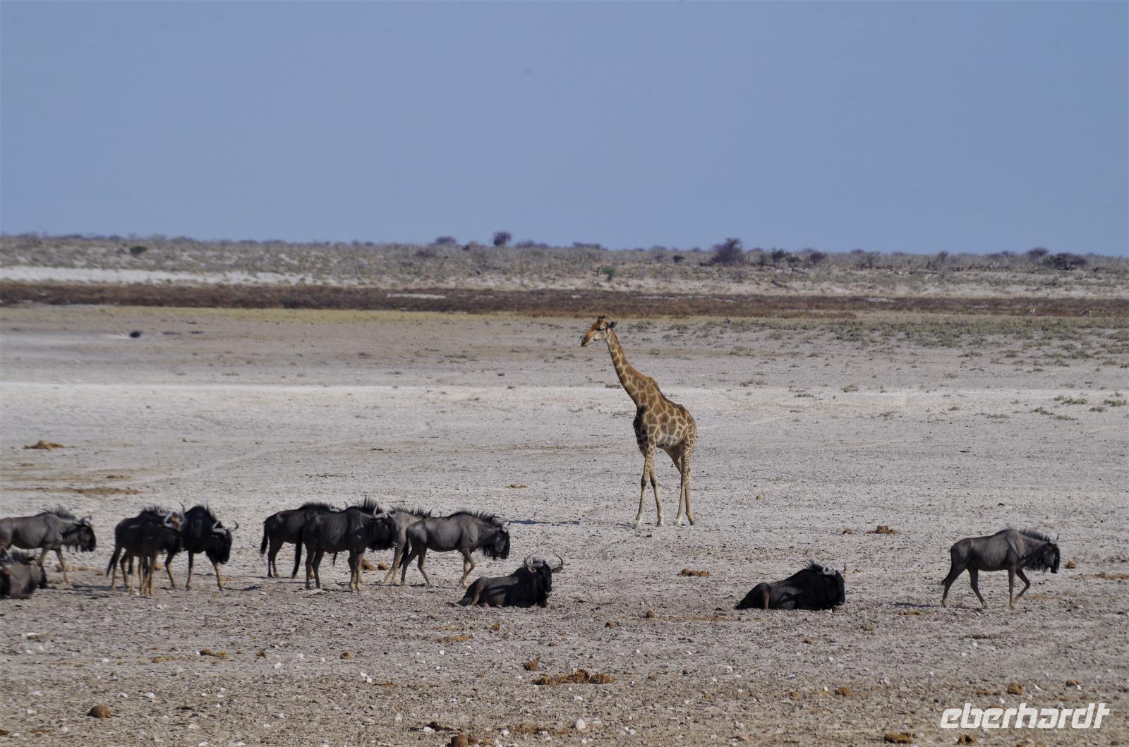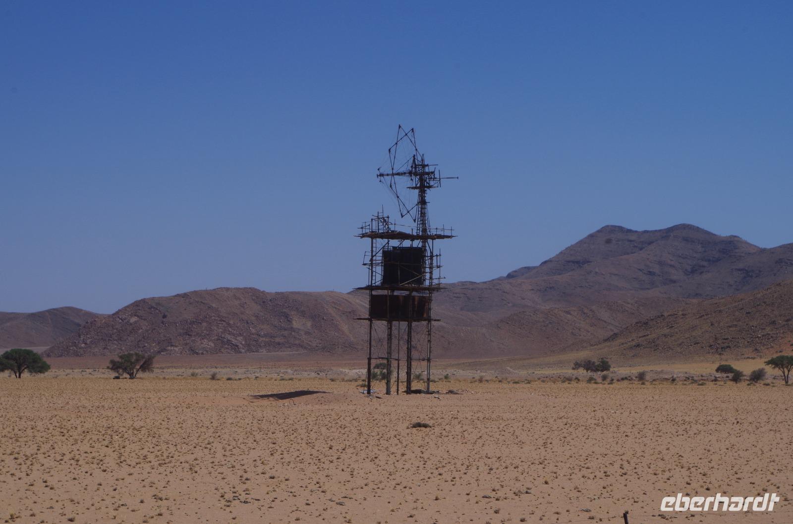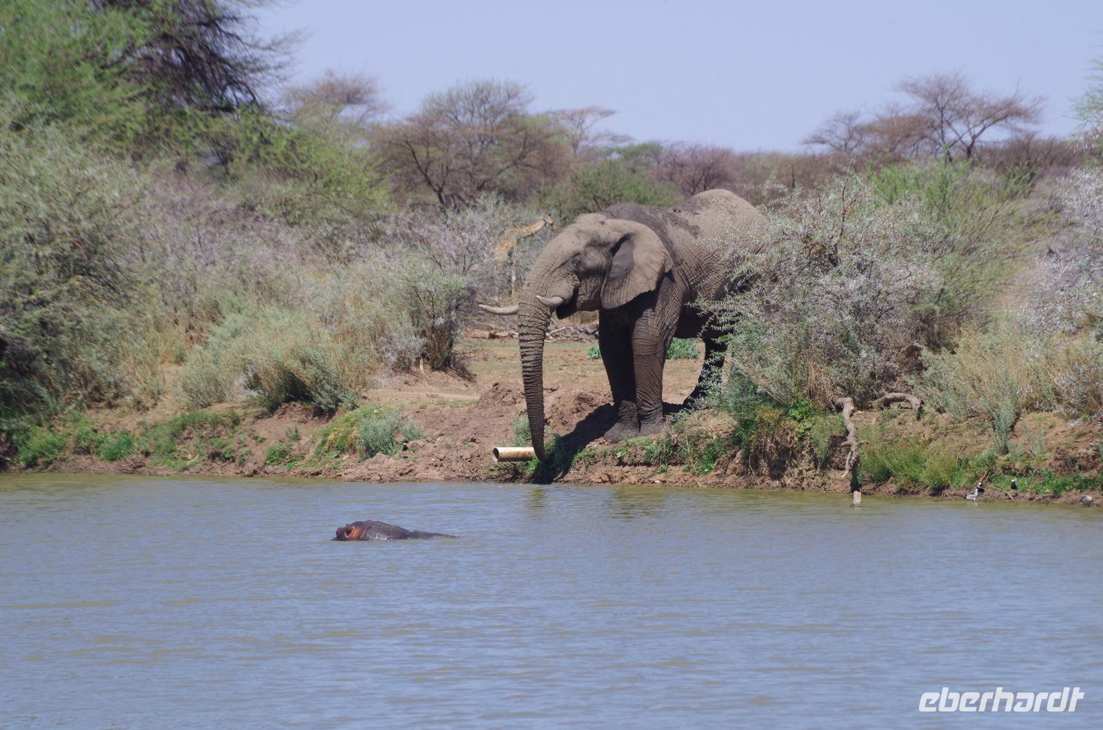 Nach dem Frühstück fuhren wir wieder in südliche Richtung. Wir passierten wir den Veterinärzaun, der sich wie eine rote Linie quer durch Namibia, Botswana und Simbabwe zieht. Eine freundliche Beamtin kontrollierte unsere Vorräte, den der Transport von Fleisch und anderen tierrischen Produkten ist verboten. Via Kamanjab truckten wir wiederum durch Farmgebiet, bis wir das Eoaacha Game Reserve erreichten. Hier wurden wir zugleich von Giraffen begrüßt. Von weiten sahen wir bereits die Eagle Tented Lodge, deren Zelt-Chaltes sich entlang der Bergkette schlängeln. Die Zelte waren komfortabel ausgestattet: Eigene Terrasse mit Ausblick (einige mit Außen-Badewanne), Himmelbett mit Moskitonetz sowie Bad en-suite. An diesem Tag war es wieder ungewöhnlich heiß, über 45 °C und kein Windchen, obwohl wir ober auf dem Berg waren. Entsprechend kuschlig war es in unseren Zelten. Warmes Wasser hatten wir auch ausreichend?? Eine Abkühlung versprach nur das Pool am Hauptgebäude der Lodge, dass einem Dornröschenschloss ähnelte. Auf der Gartenterrasse wurde Kaffee und Kuchen serviert. Abends traf man sich auf einen Sundowner und Giraffen waren auch zu Gast. Denn direkt davor, war eine Wasserstelle, die von den Tieren in dieser Dürre gern genutzt wurde. Ja, Giraffen oder besser Schiraffen gab es hier unzählige. Sie spazierten einfach durch das Gelände, vor unseren Augen. Tagesetappe: 450 km